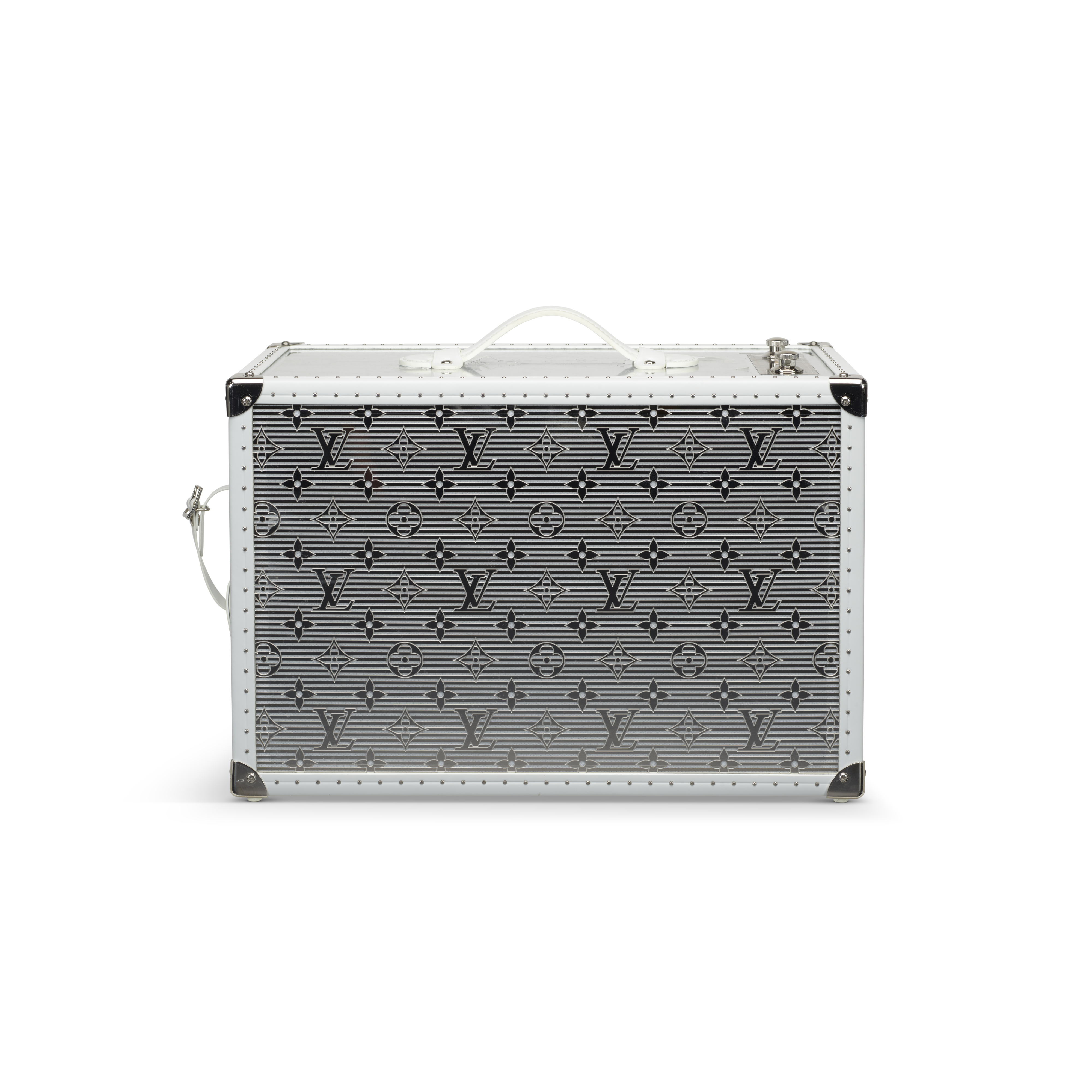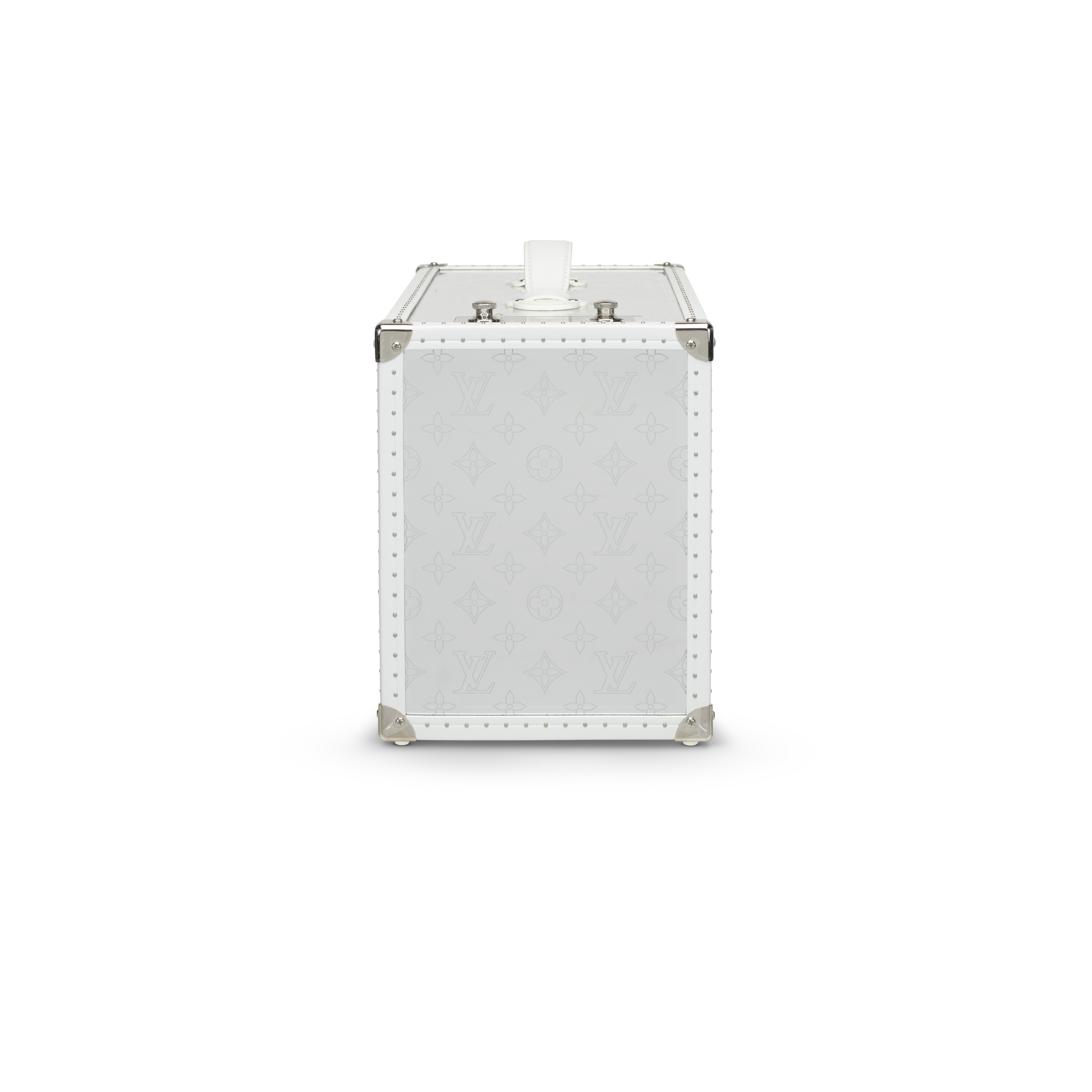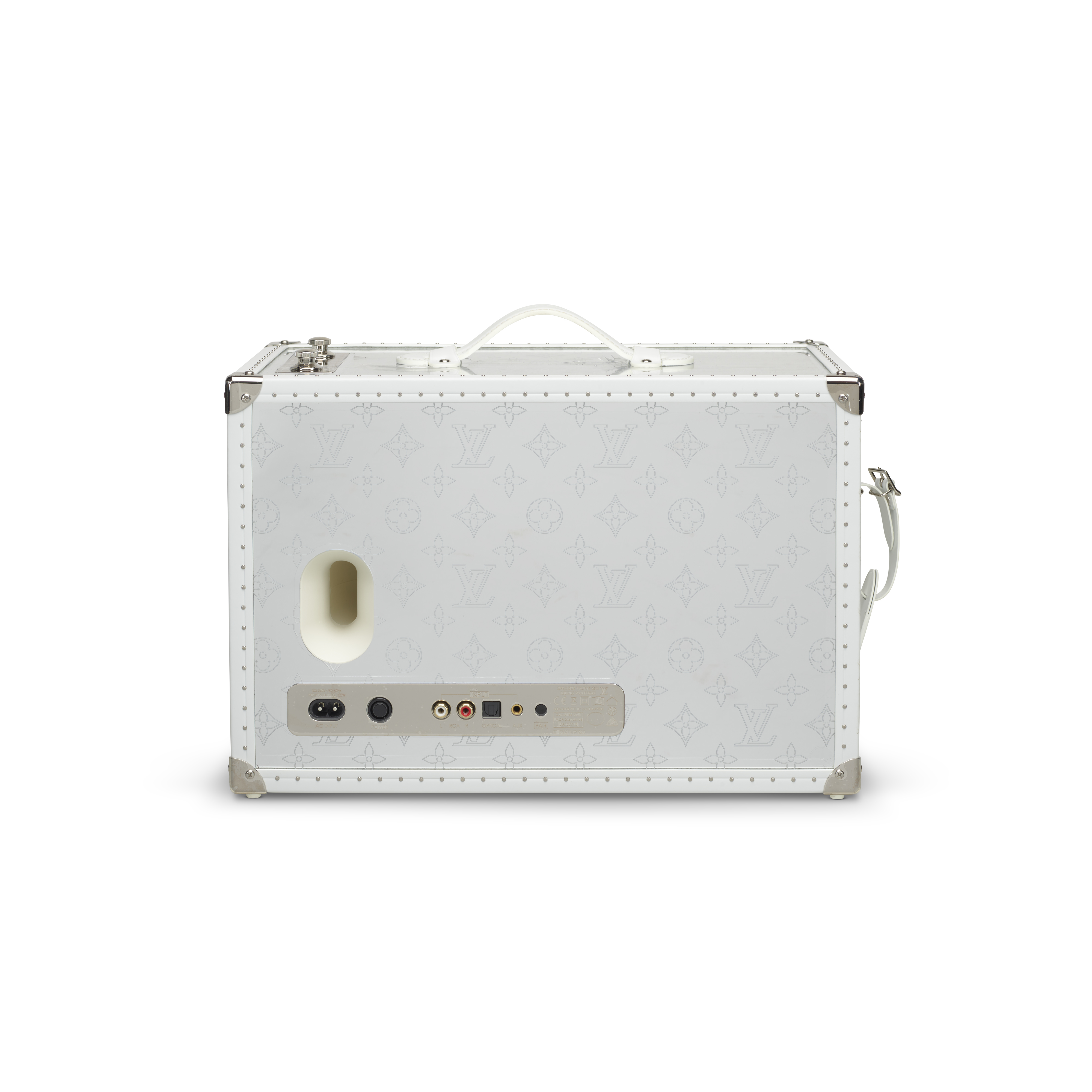 A striking fusion of luxury craftsmanship and technology, the Louis Vuitton Speaker Trunk GM presents the Maison’s iconic trunk in a bold contemporary form. Designed with a gleaming silver-toned mirrored exterior, the piece reflects light with a sculptural brilliance, transforming a functional speaker into an objet d’art. Signature reinforced corners, white leather trim and handle, and classic hardware reference Louis Vuitton’s historic travel trunks, while the integrated audio system delivers immersive sound. Both visually arresting and finely engineered, this exceptional design piece stands as a testament to the house’s commitment to innovation, artistry, and high craftsmanship.