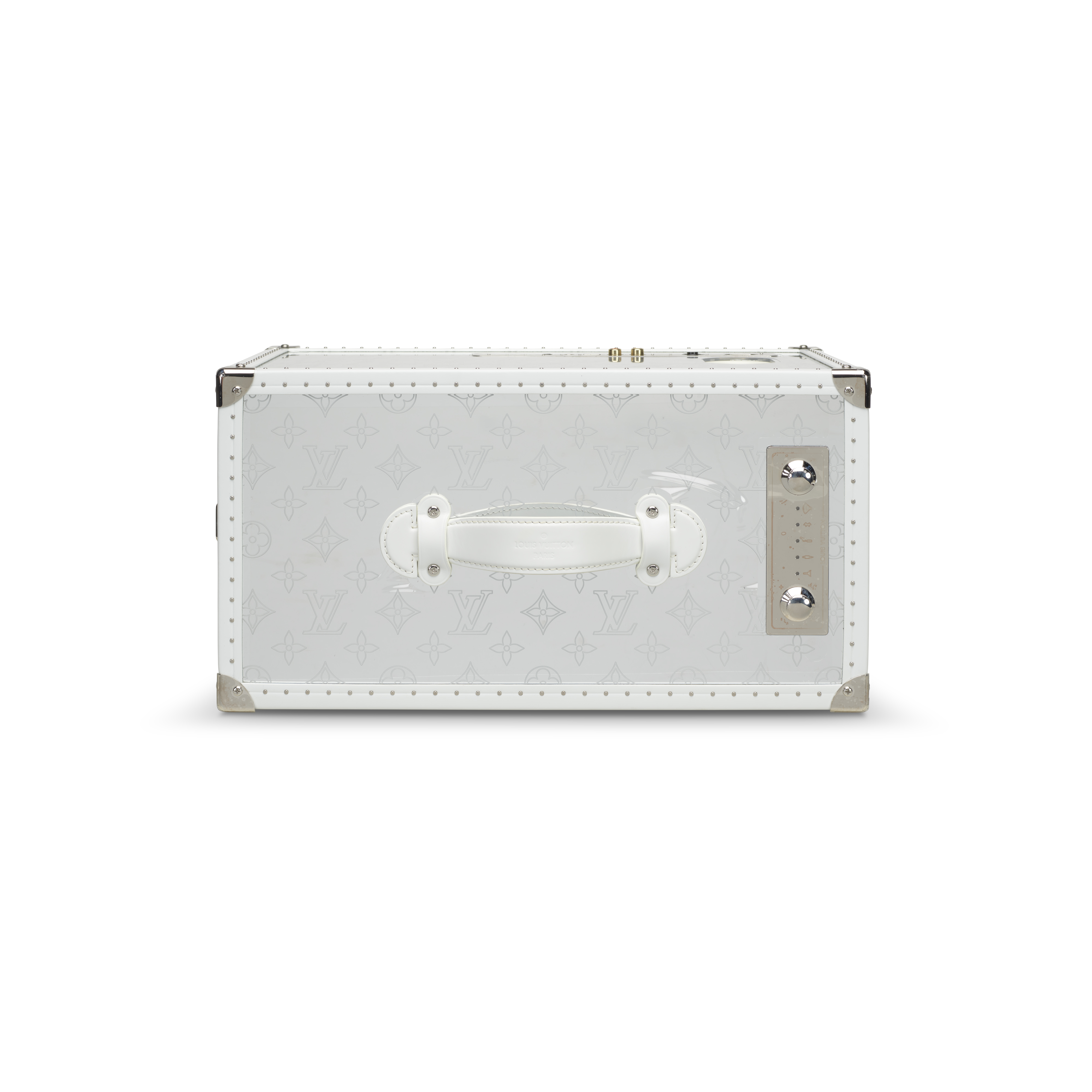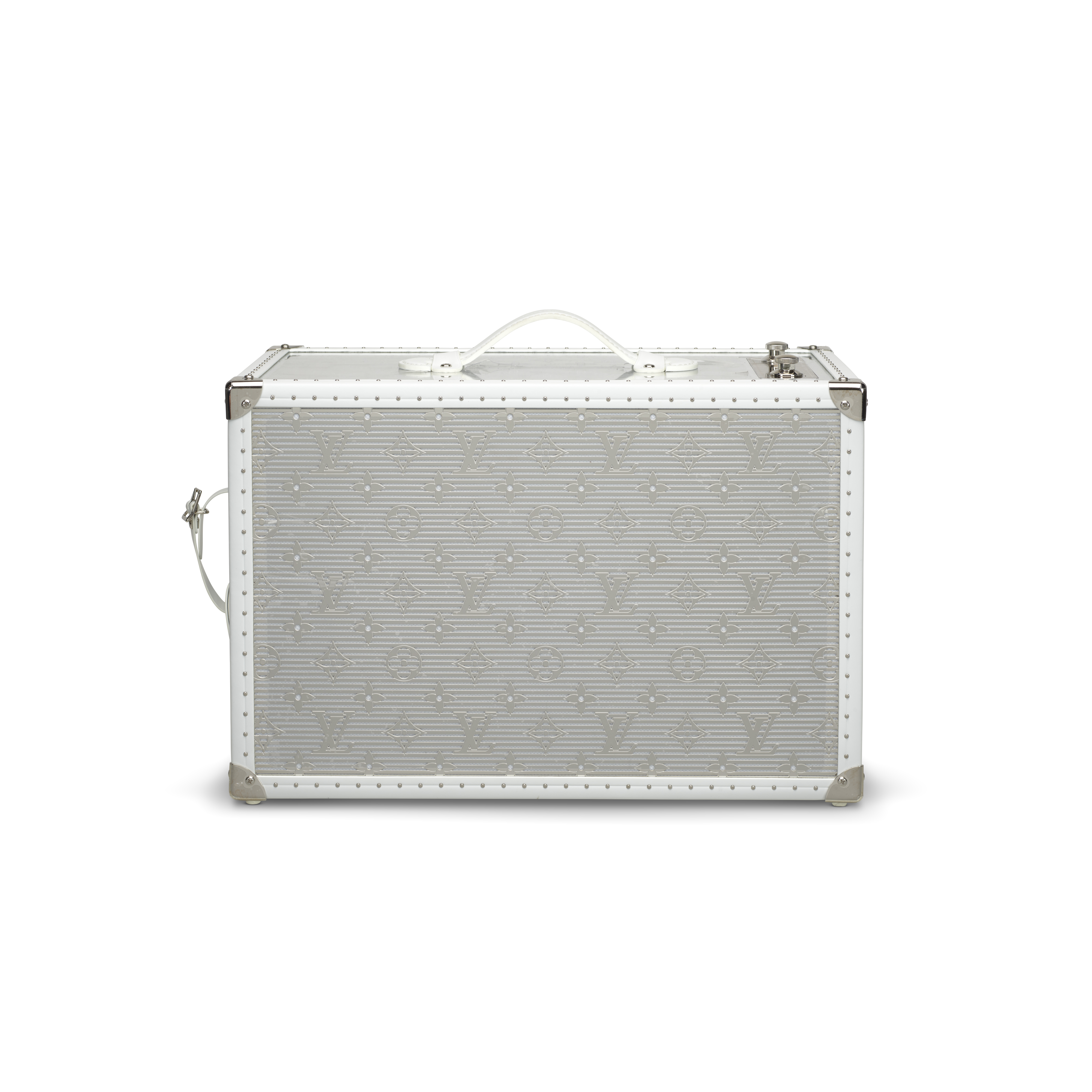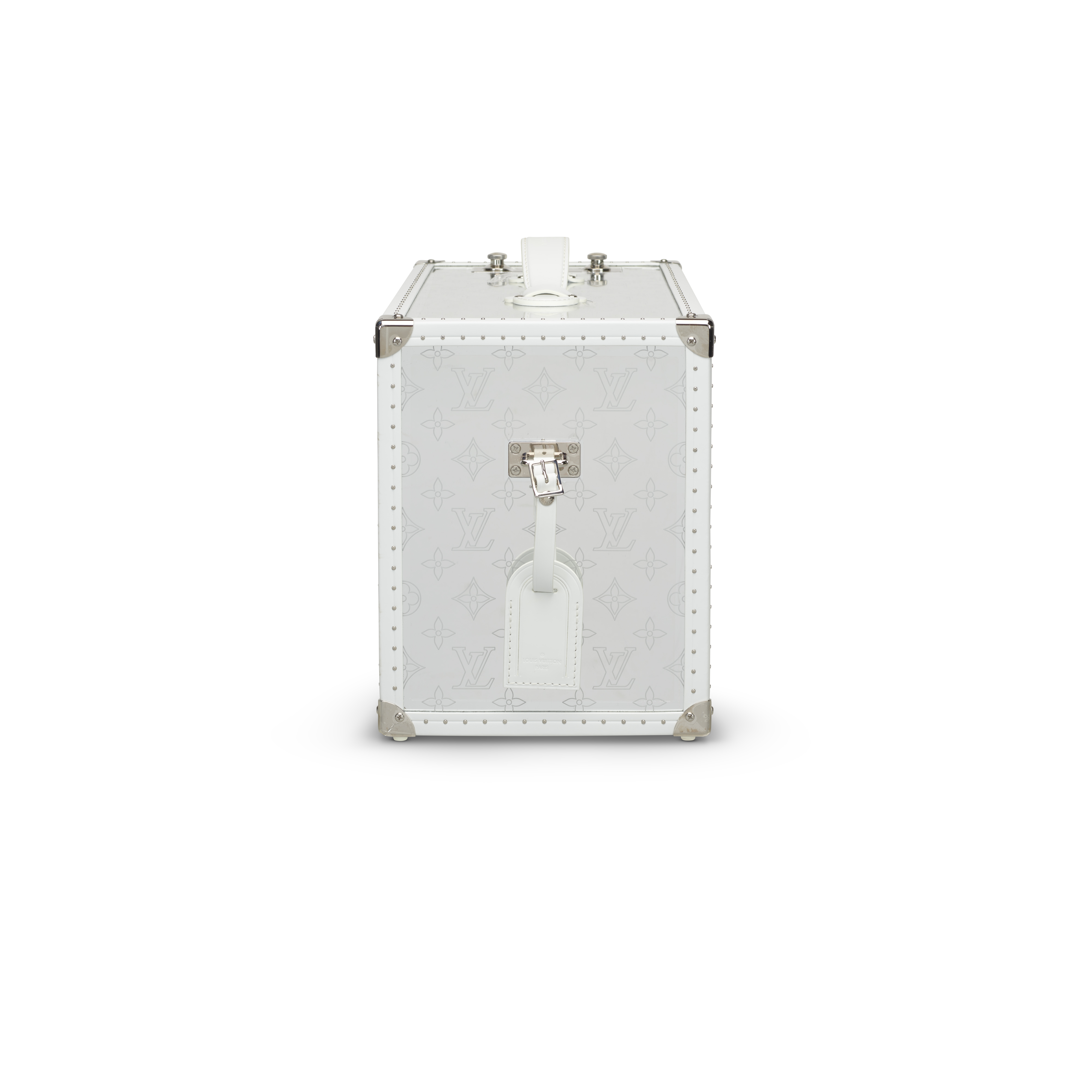 A striking fusion of luxury craftsmanship and technology, the Louis Vuitton Speaker Trunk GM presents the Maison’s iconic trunk in a bold contemporary form. Designed with a gleaming silver-toned mirrored exterior, the piece reflects light with a sculptural brilliance, transforming a functional speaker into an objet d’art. Signature reinforced corners, white leather trim and handle, and classic hardware reference Louis Vuitton’s historic travel trunks, while the integrated audio system delivers immersive sound. Both visually arresting and finely engineered, this exceptional design piece stands as a testament to the house’s commitment to innovation, artistry, and high craftsmanship.