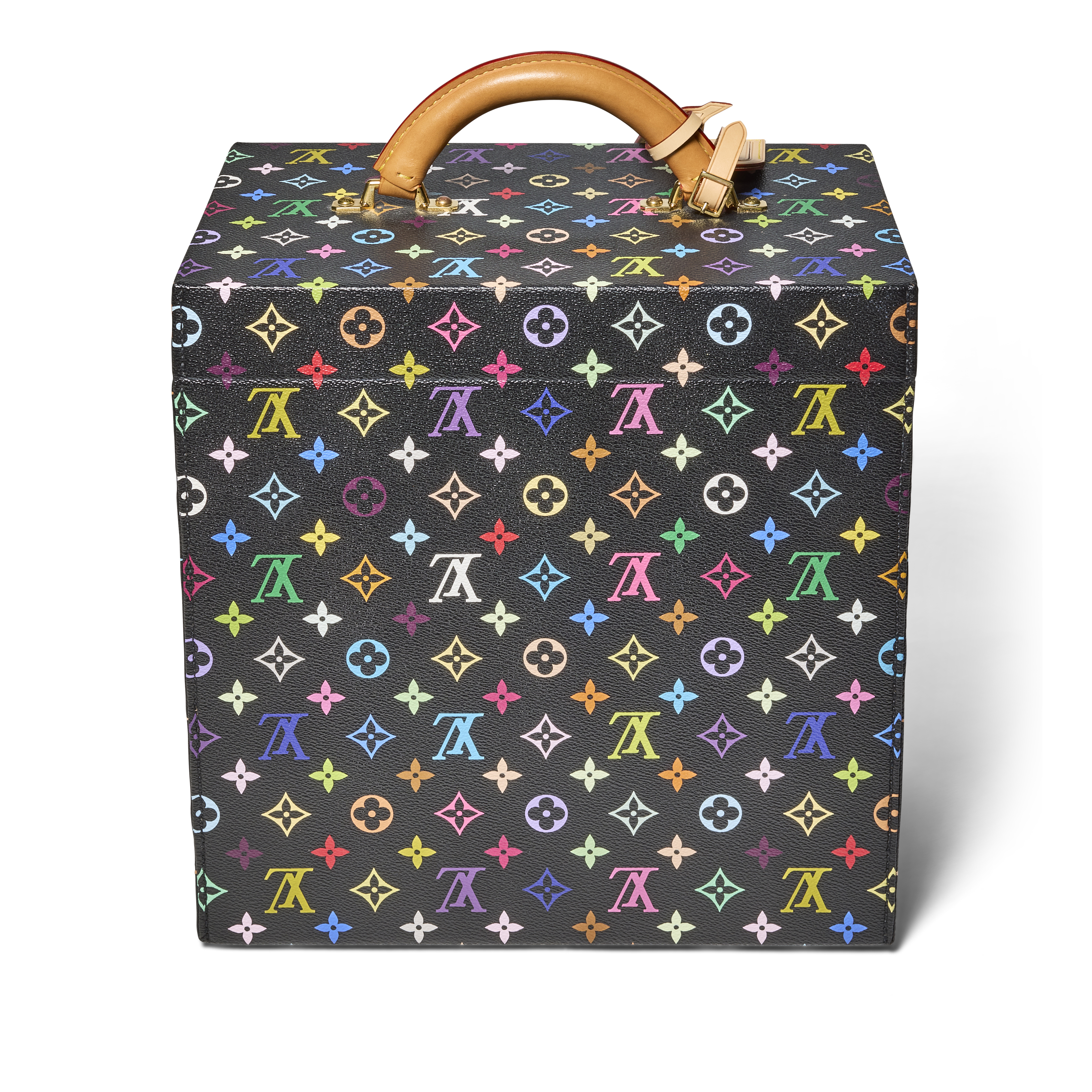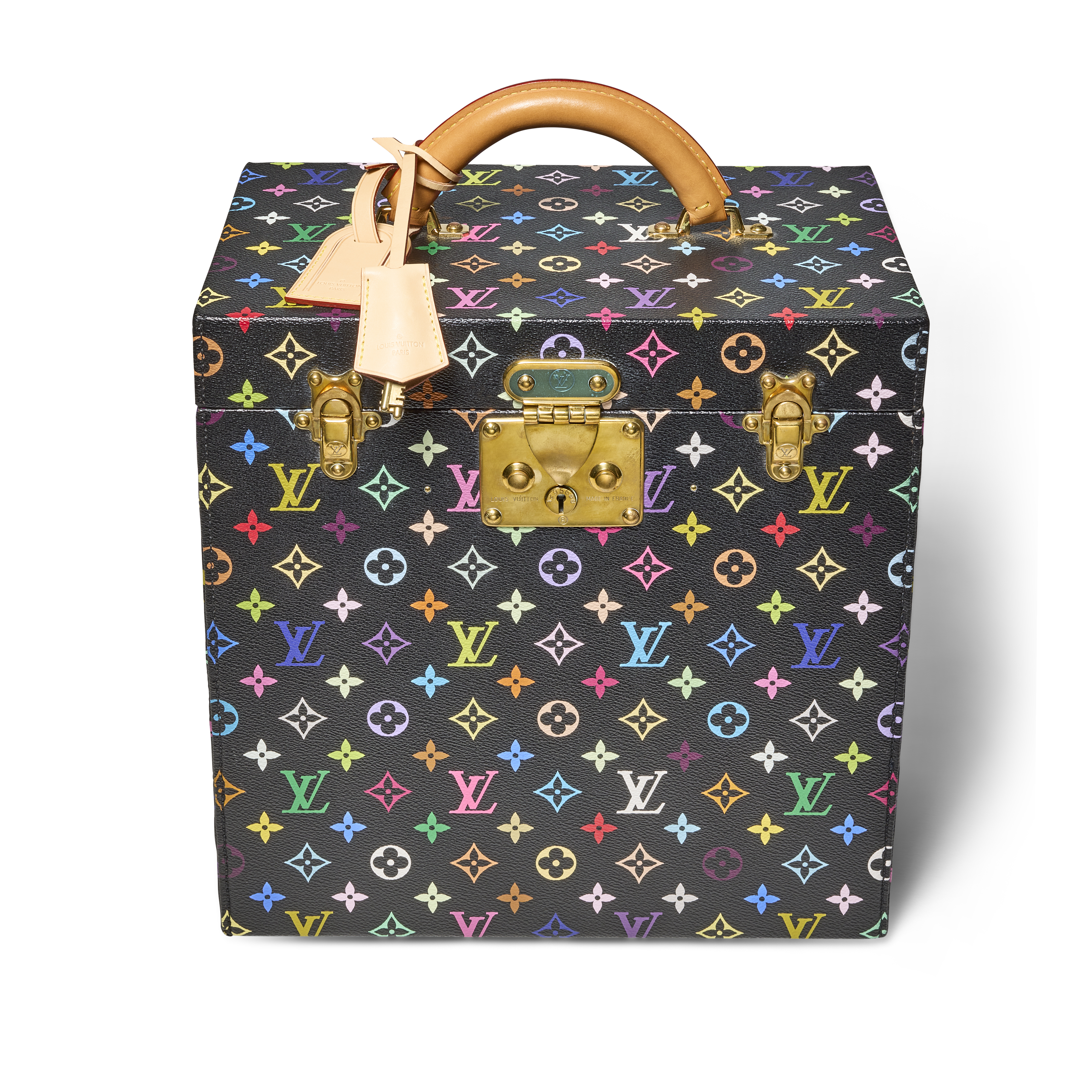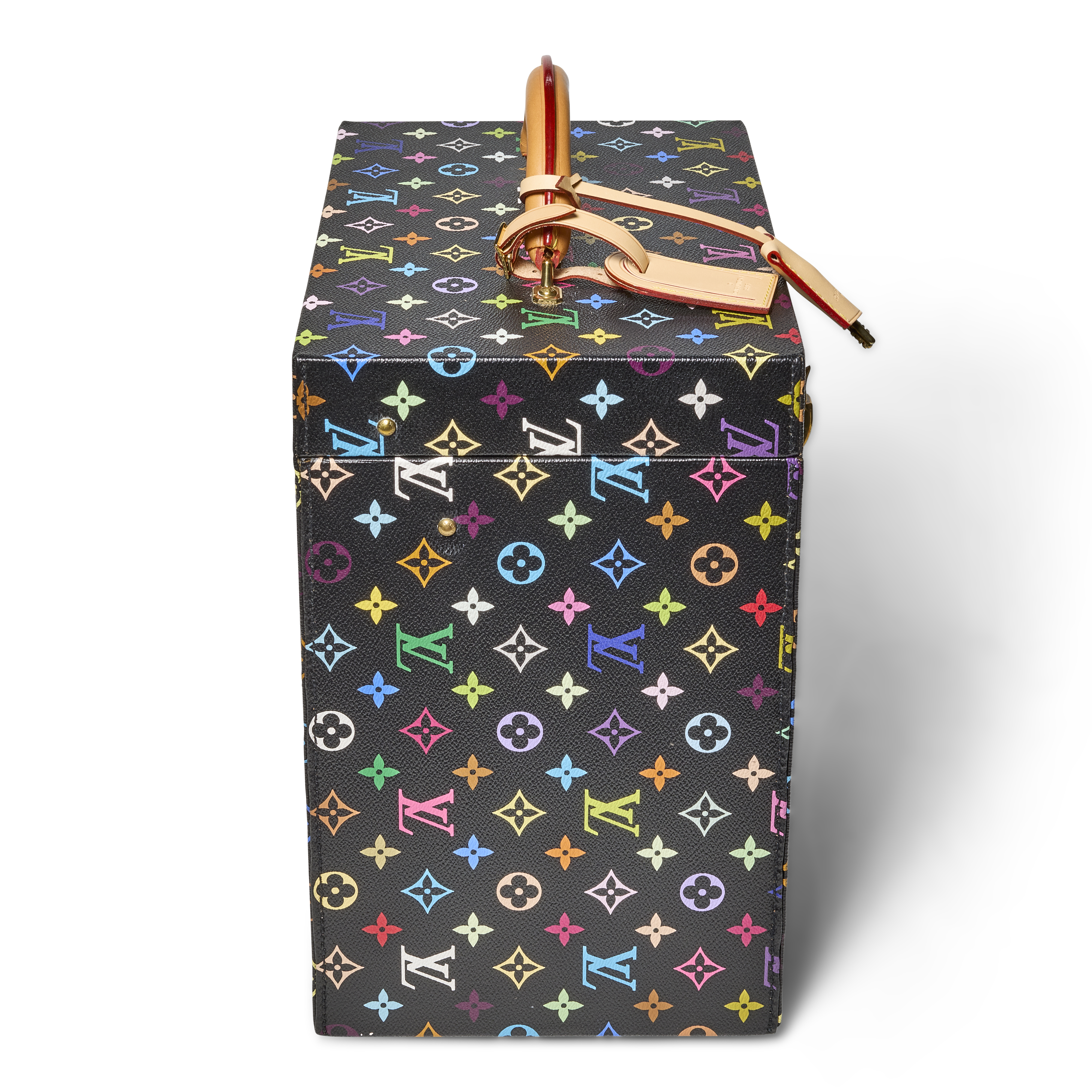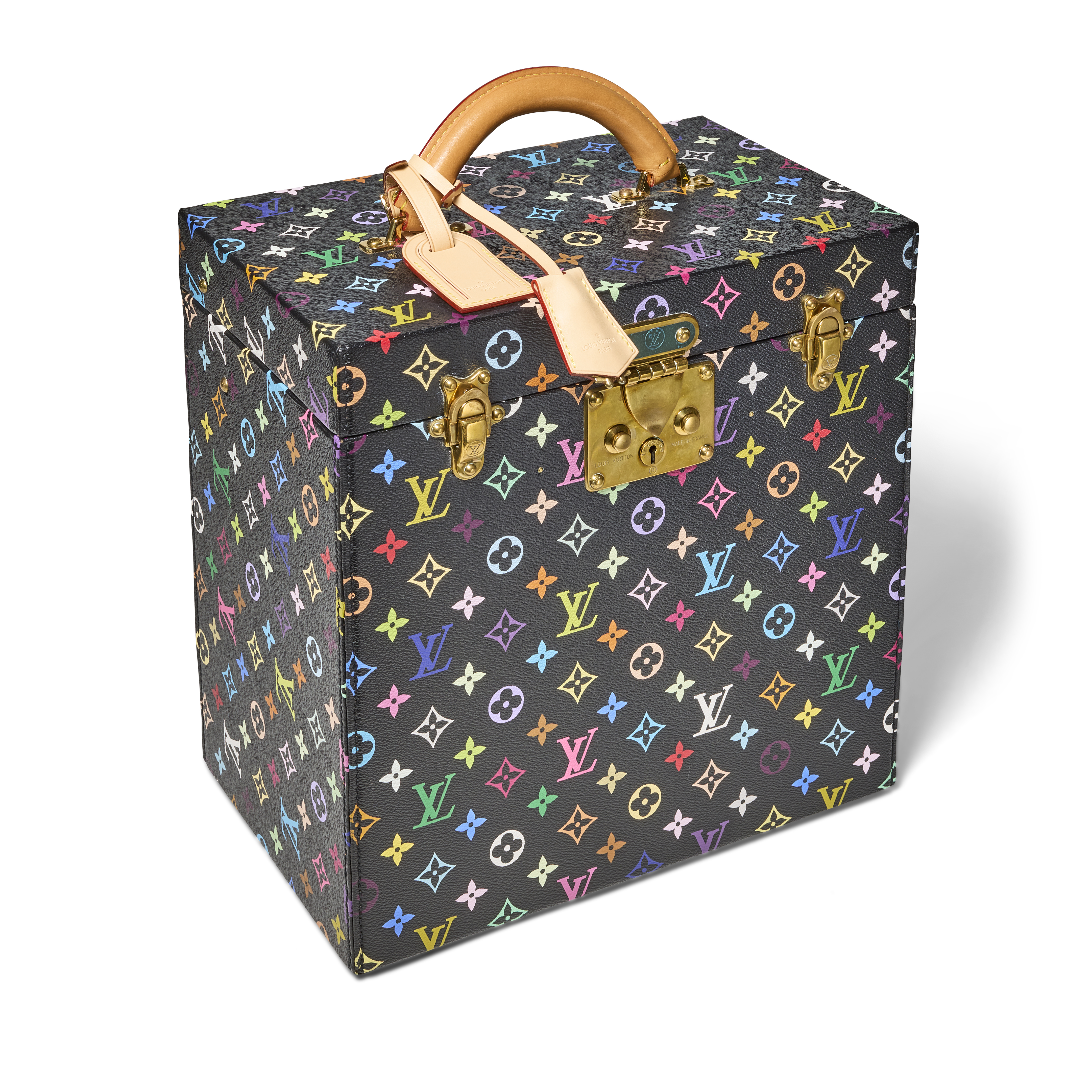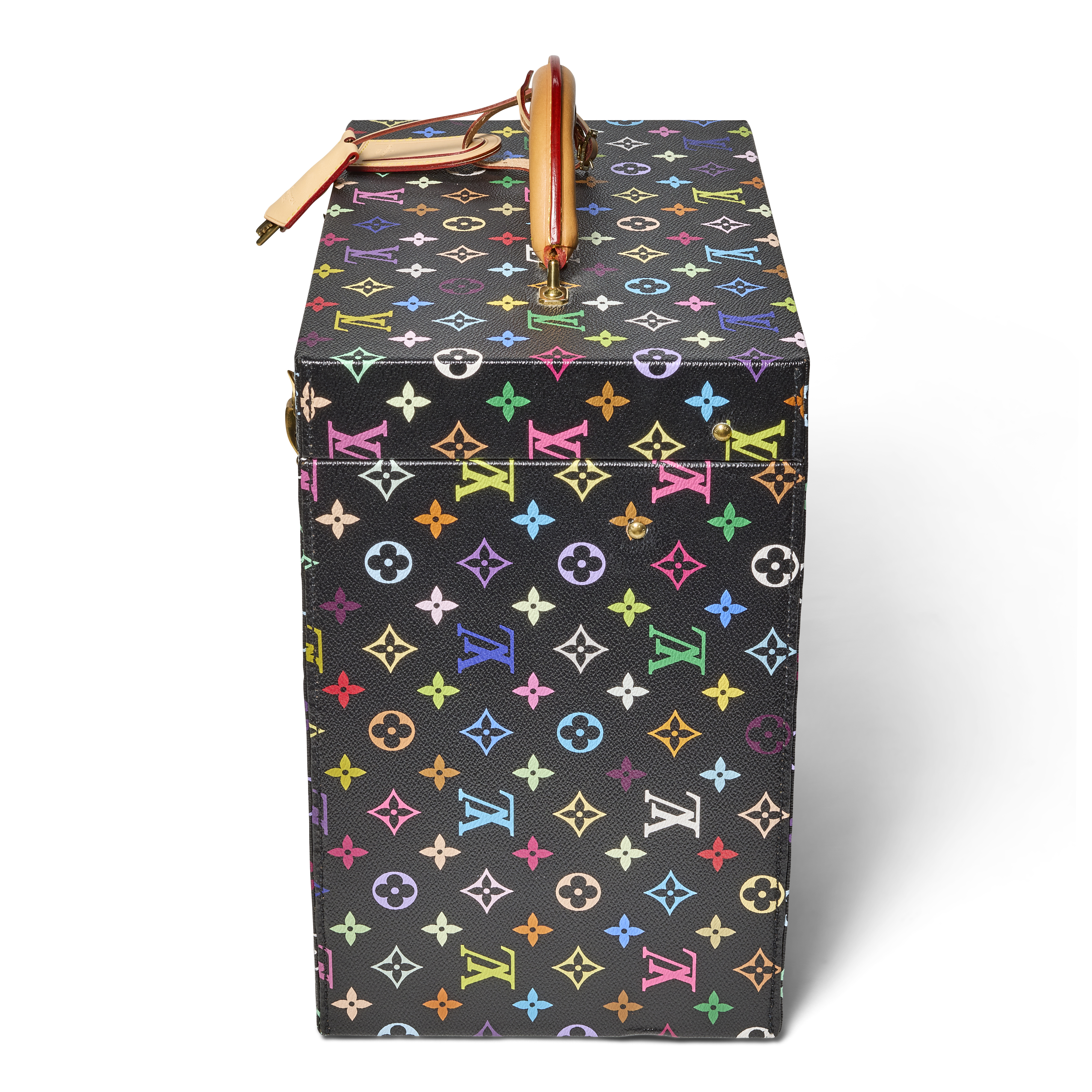 The Louis Vuitton x Takashi Murakami Special Order Black Multicolor Monogram Pharmacie Trunk is a rare and exceptional creation from one of the most celebrated artist collaborations in the brand’s history. First introduced in 2003 under Marc Jacobs, the partnership with Murakami reimagined the classic Monogram with bold color and playful iconography, redefining the intersection of luxury and contemporary art. This bespoke trunk showcases the striking black Multicolor Monogram exterior and opens to reveal a very rare pink interior lining, elevating its charm and collectability. The exterior is completed with a rounded natural leather handle, and a lock reinforced by two additional latches. Both functional and highly artistic, it stands as a remarkable testament to the enduring impact of the Murakami and Louis Vuitton collaboration.