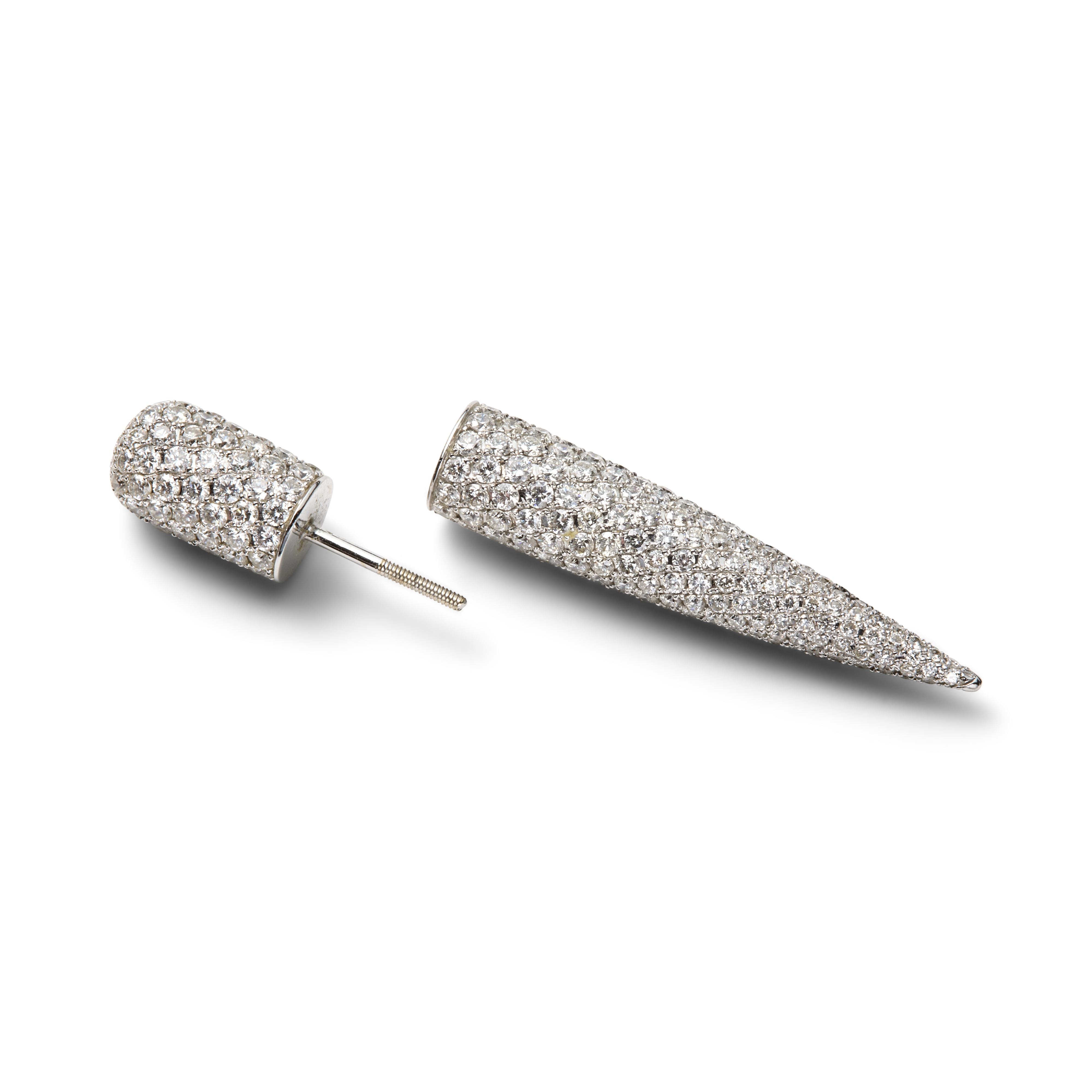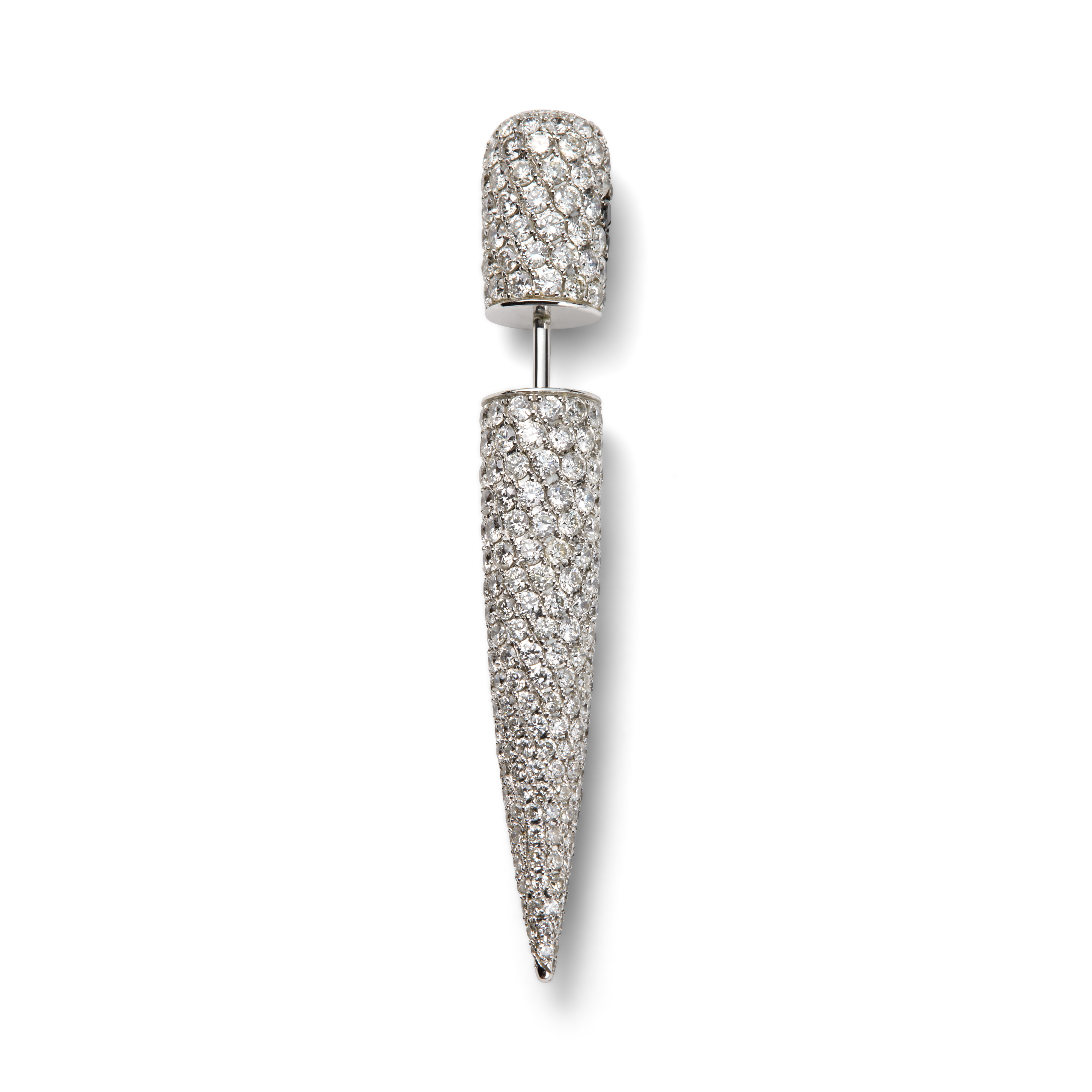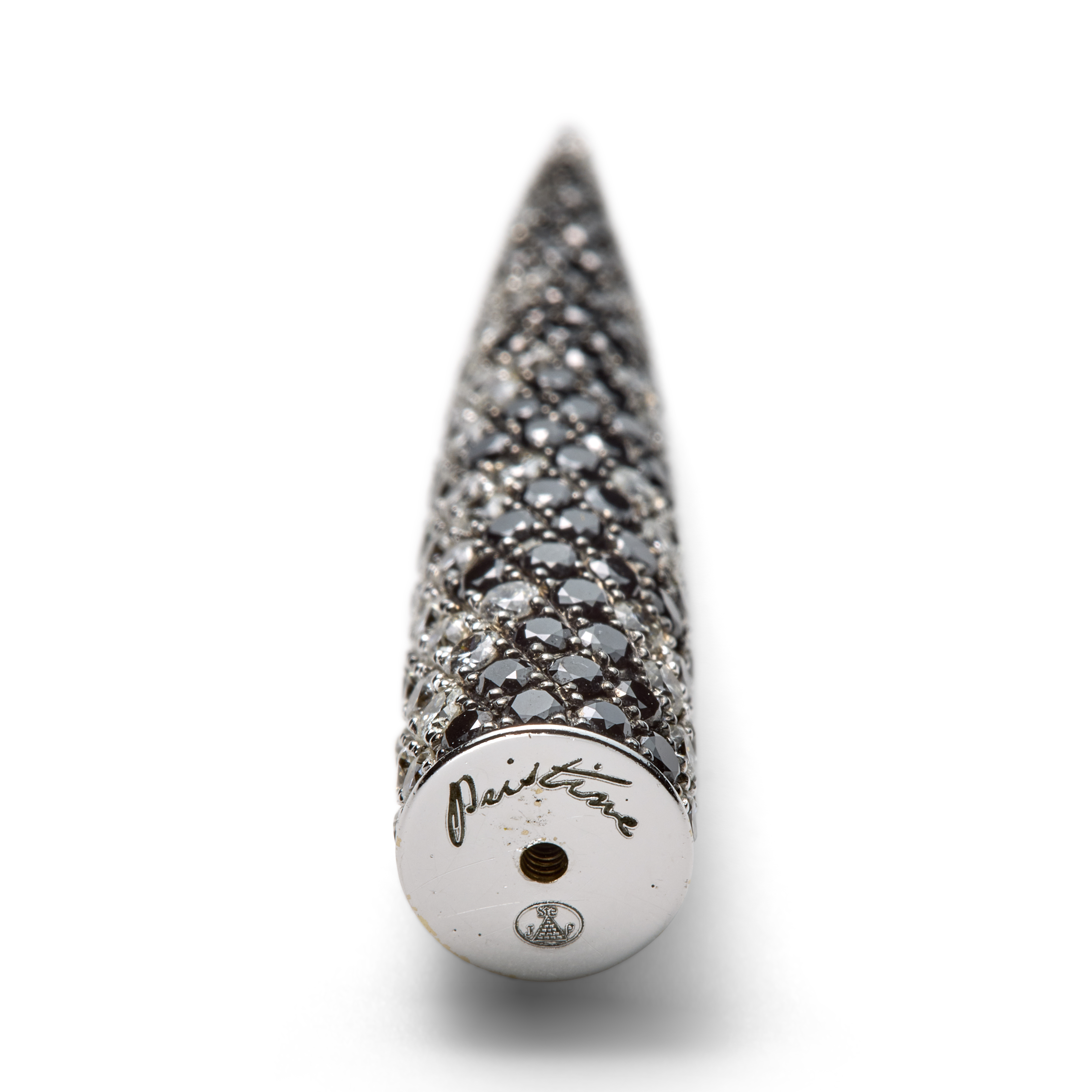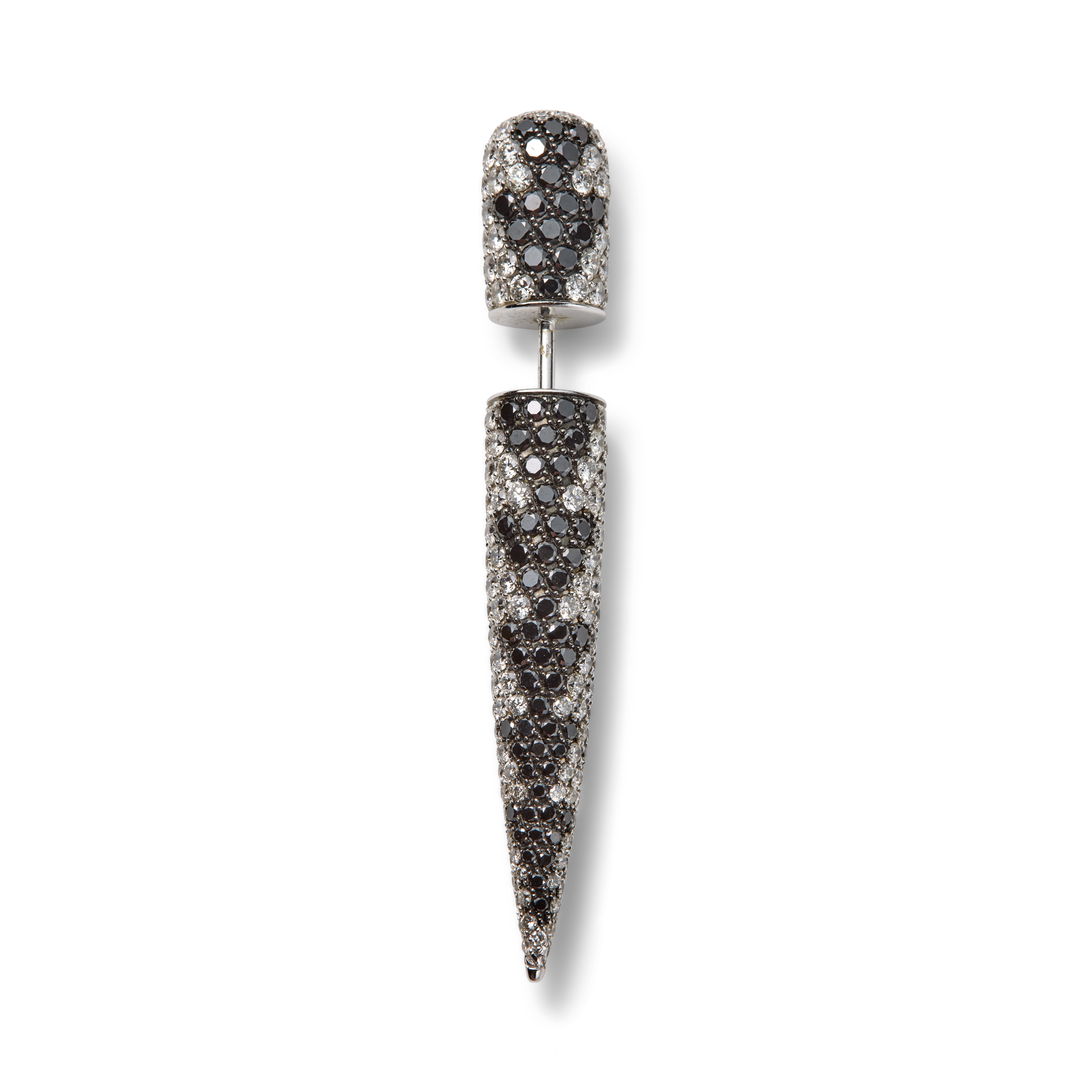 This “Pristine” ear cone by Lauren Rubinski is crafted in 18K white gold and fully pavé-set with a dynamic mix of white and black diamonds. The conical form curves elegantly along the ear, its surface shimmering with approximately 320 white diamonds of G–I color and VS–I clarity, complemented by 67 black diamonds arranged in a graduated triangular motif that adds depth and dramatic contrast. A contemporary jewel that blends precision, boldness and exceptional craftsmanship, this ear cone stands as a distinctive statement piece within Lauren Rubinski’s modern, sculptural design universe.