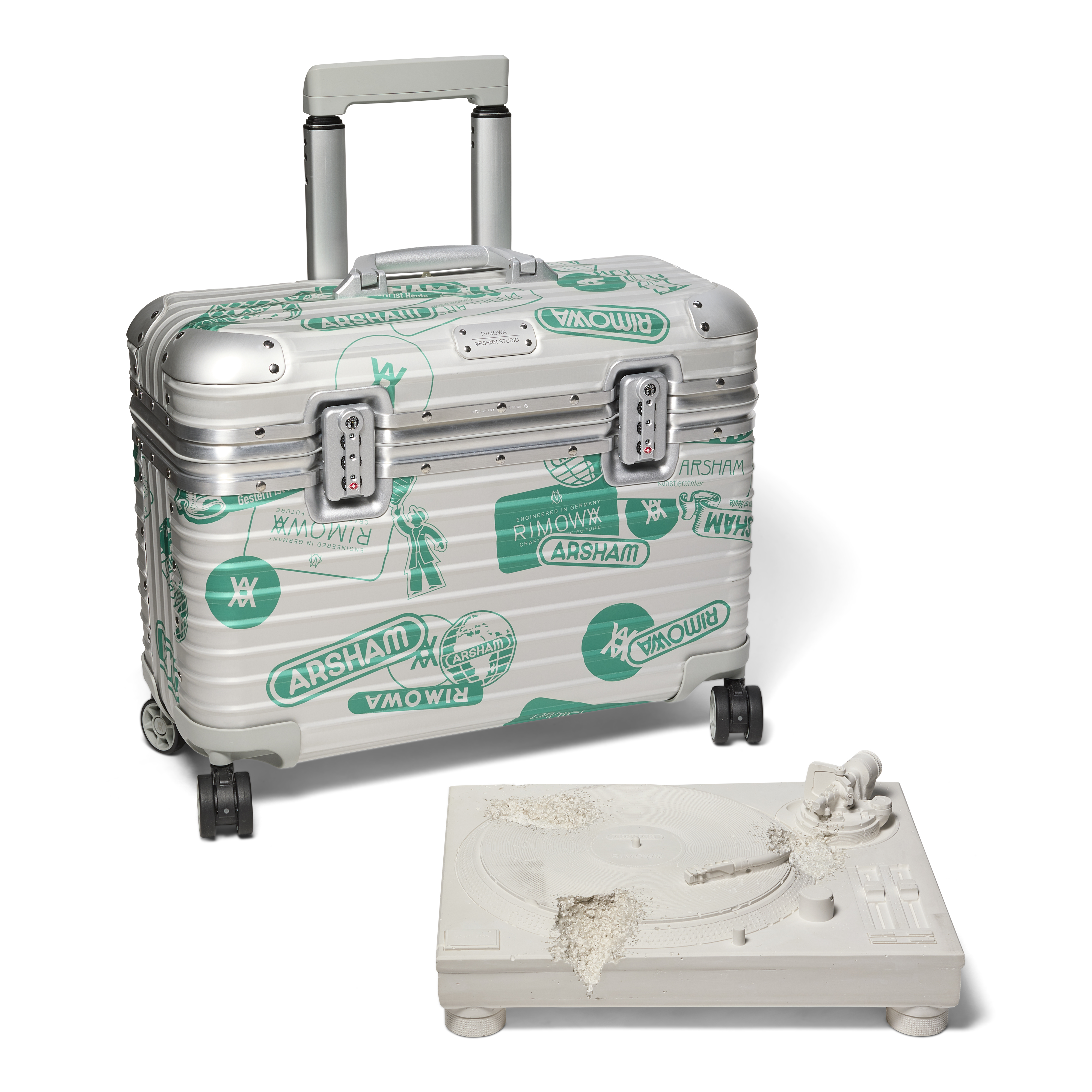The RIMOWA x Daniel Arsham Eroded White Turntable & Silver Pilot Case is a striking fusion of archival design and contemporary sculpture. Encased within RIMOWA’s newly re-released aluminum Pilot Case—originally engineered in 1994 to nest perfectly between a captain and co-pilot—the piece is reimagined with RIMOWA and Arsham labels and symbols printed in turquoise across the exterior. The collaboration reflects Arsham’s ongoing dialogue between past and future, first through the reinvention of a classic travel icon and again through the fictional archaeology embodied in the Eroded Turntable sculpture. Produced in a limited edition of 500, the set includes custom art-handling gloves and collaborative stickers. Together, the sculpture and case form a highly collectible object that merges luxury craftsmanship, cultural memory, and Arsham’s visionary aesthetic.