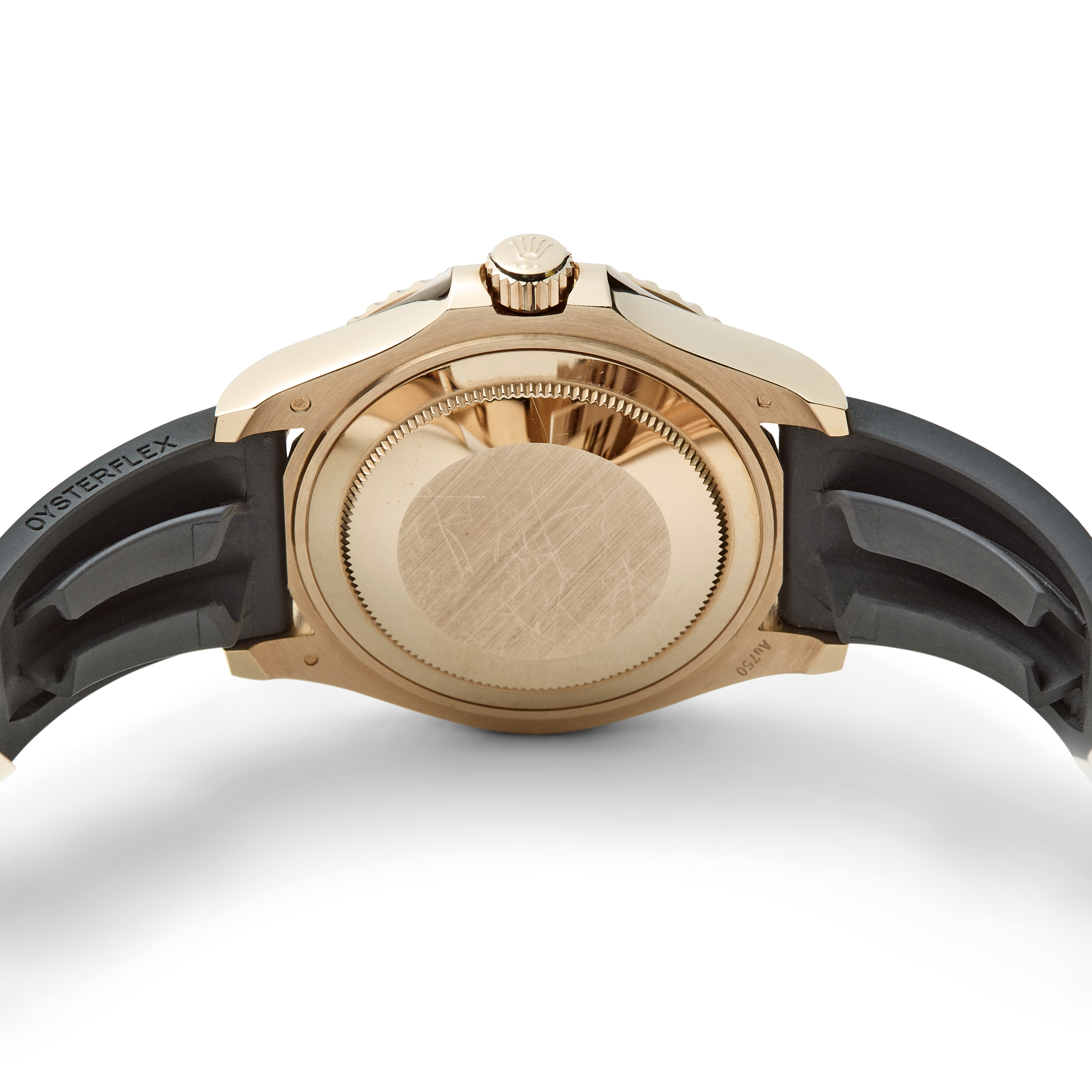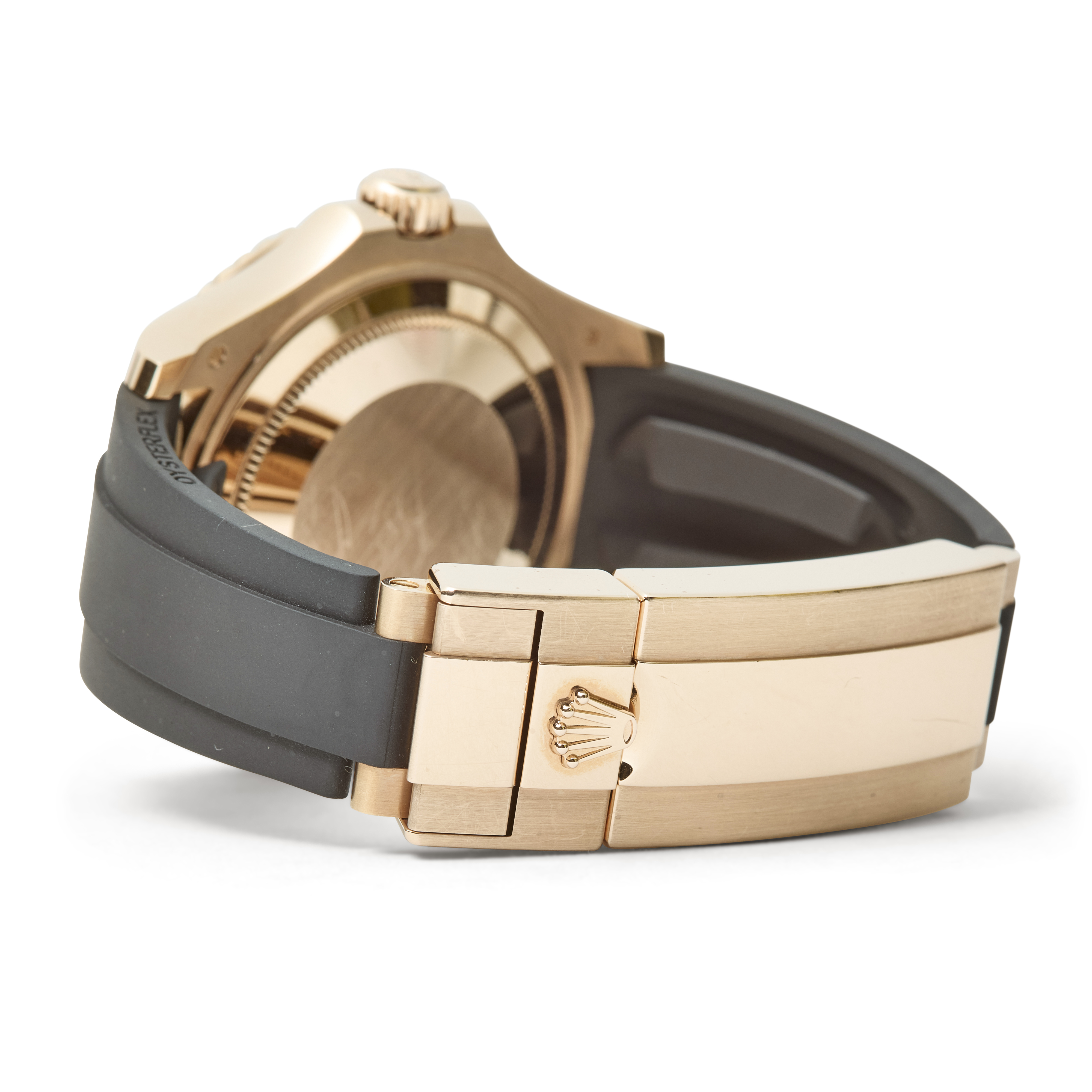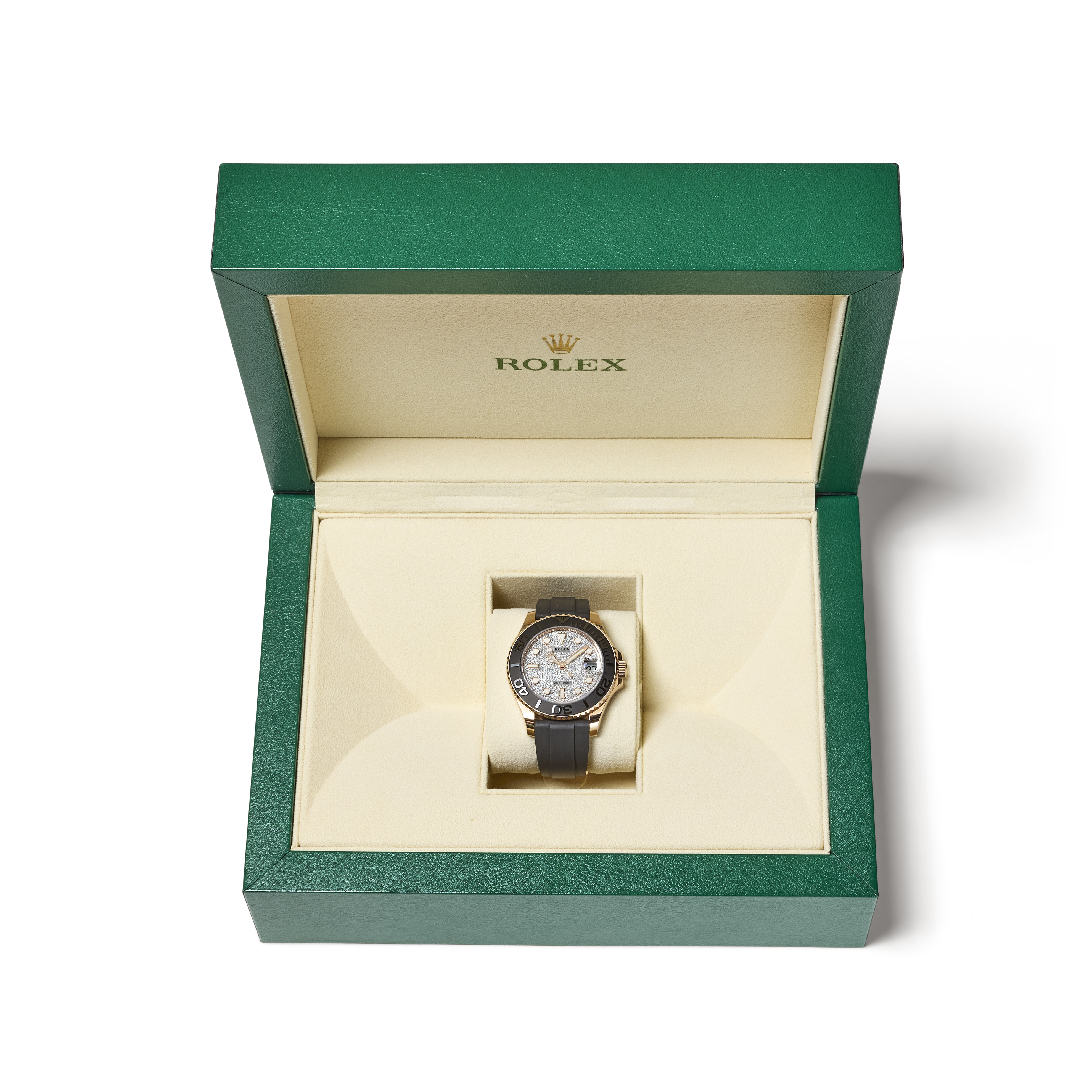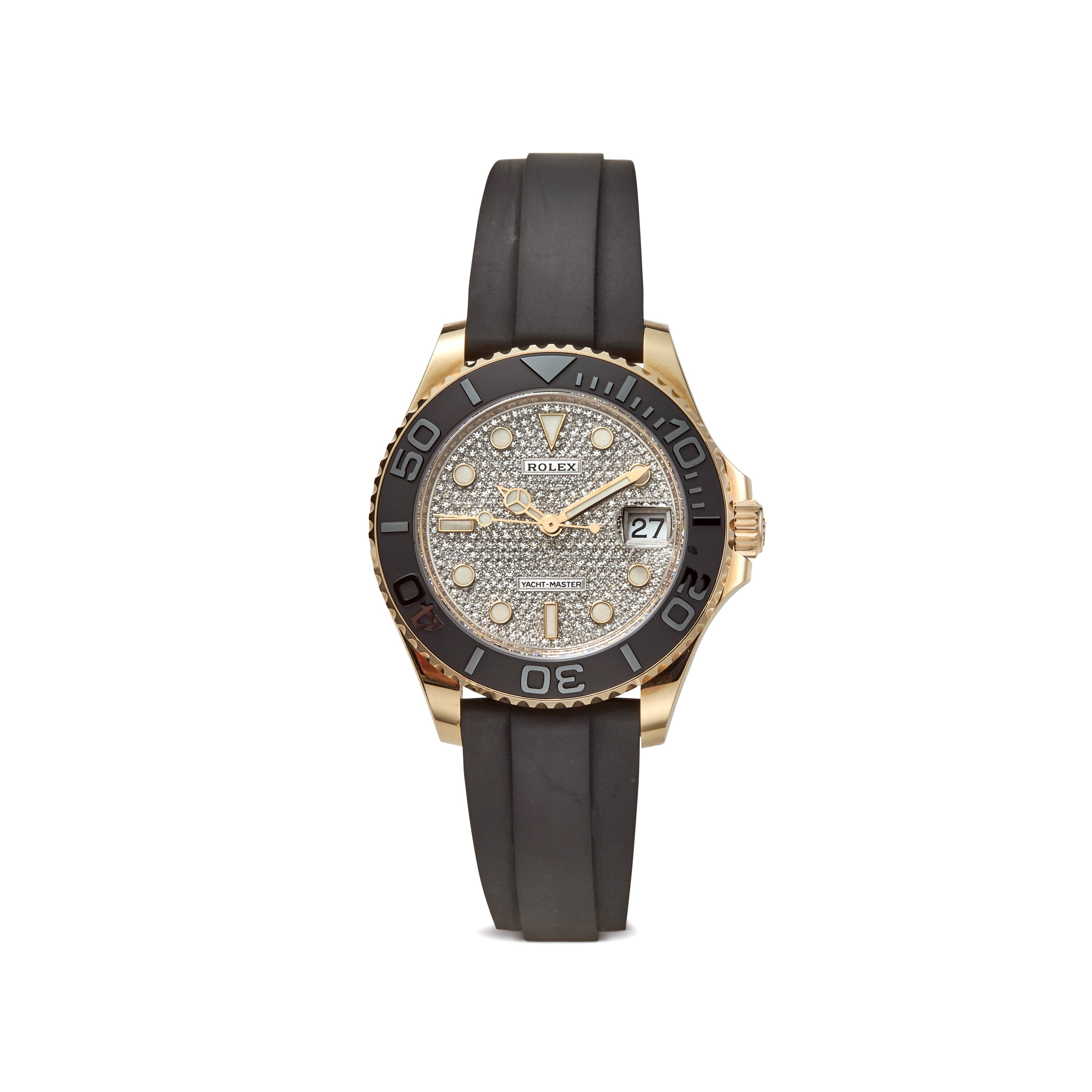This example features a stunning factory-set diamond pavé dial, offering exceptional brilliance and texture. It is paired with Rolex’s Oysterflex rubber bracelet and an Everose clasp, combining precious-metal elegance with modern, sporty comfort.