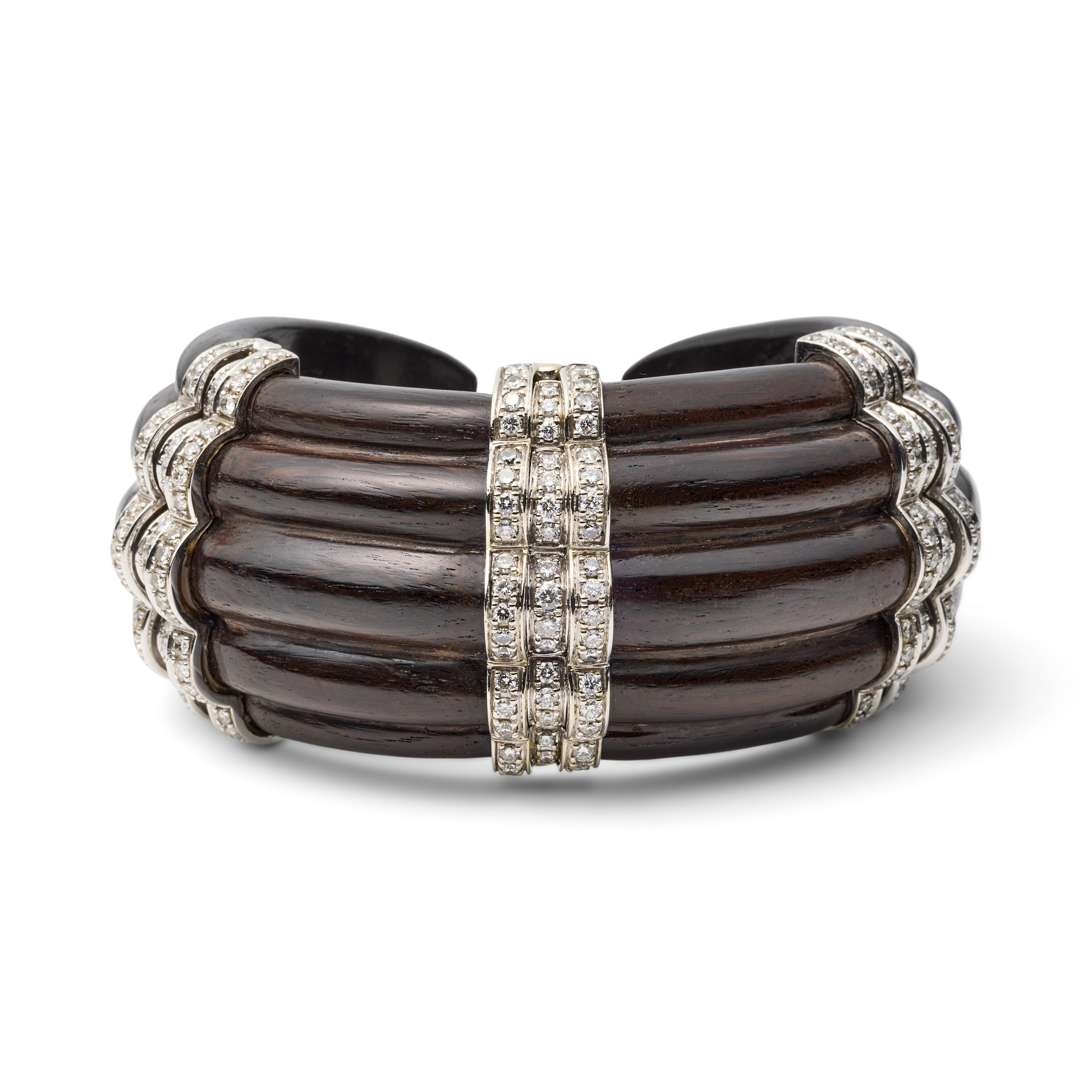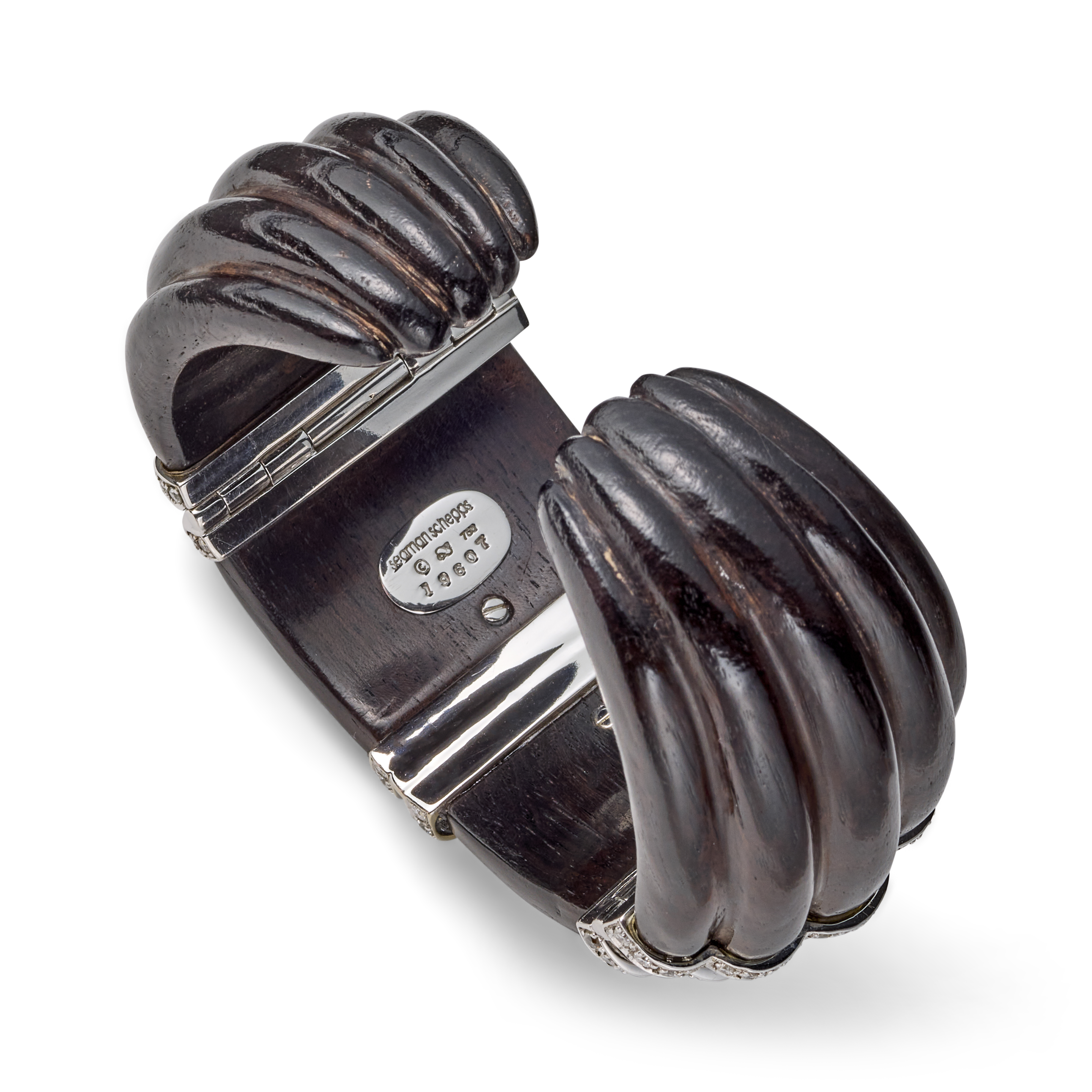 A striking example of Seaman Schepps’ bold and sculptural design language, the “Rigate” cuff pairs richly carved ebony with the luminous brilliance of diamonds set in 18K white gold. The slightly hinged, tapering form showcases the natural depth and smooth polish of the ebony, interrupted by three triple-row diamond stations that wrap the cuff with refined symmetry. These stations hold a total of 180 diamonds, weighing approximately 4.02 carats, graded F–G color and VS clarity, providing crisp, elegant contrast against the dark wood. The bracelet measures 35 mm wide, giving it a substantial yet fluid presence on the wrist. Sophisticated, tactile and instantly recognizable, this “Rigate” bracelet exemplifies the house’s famed ability to merge natural materials with high jewelry craftsmanship, resulting in a piece that is both timeless and unmistakably Schepps.
