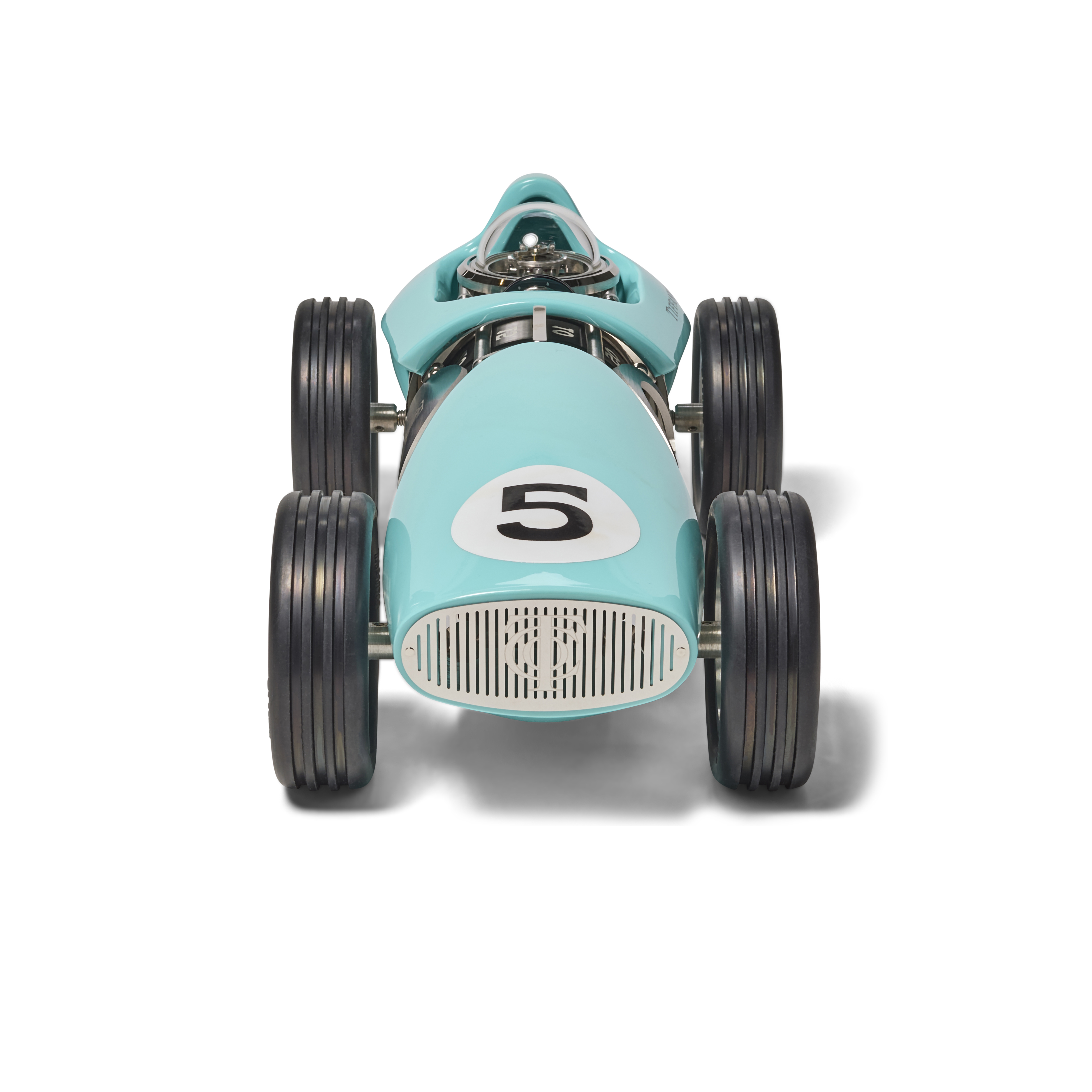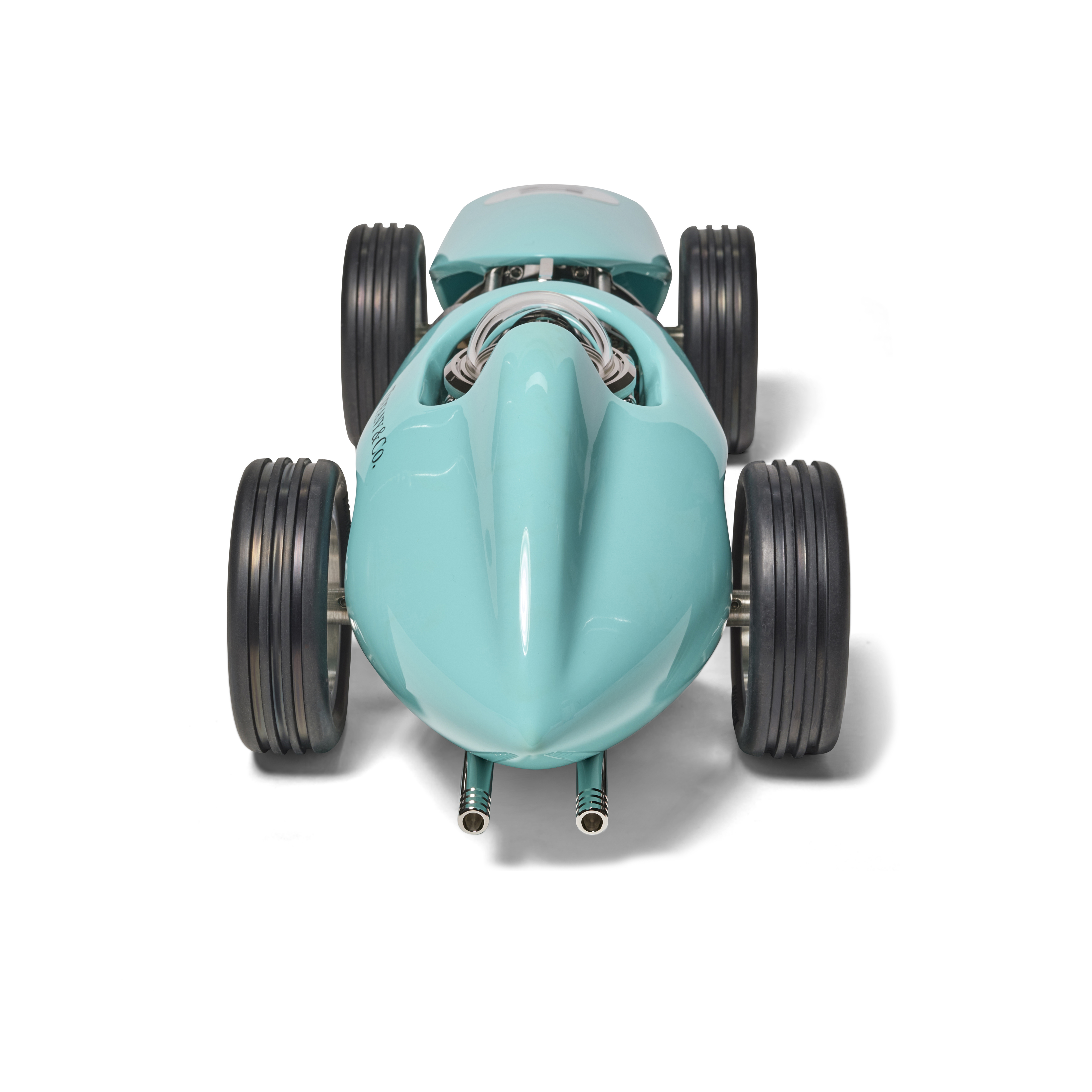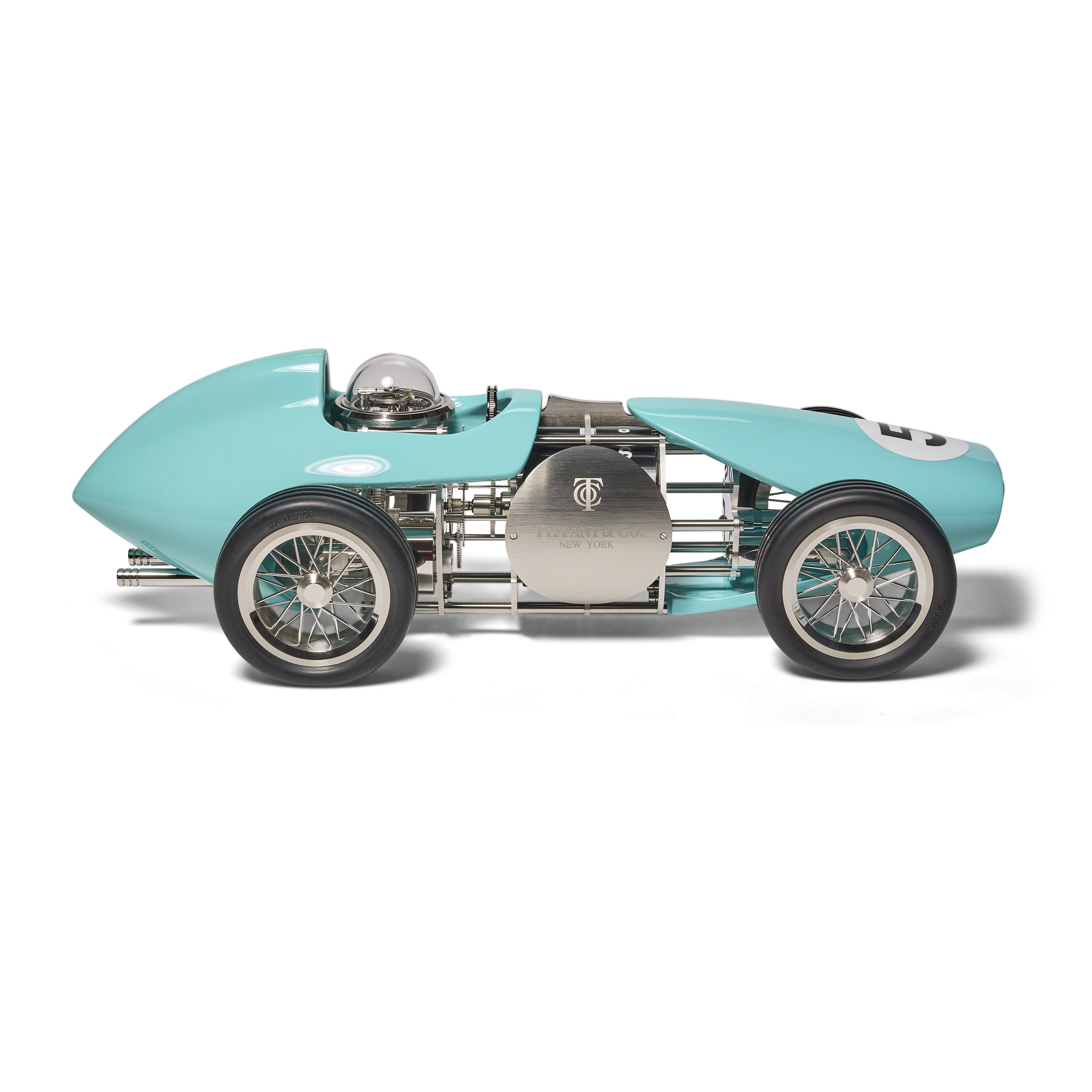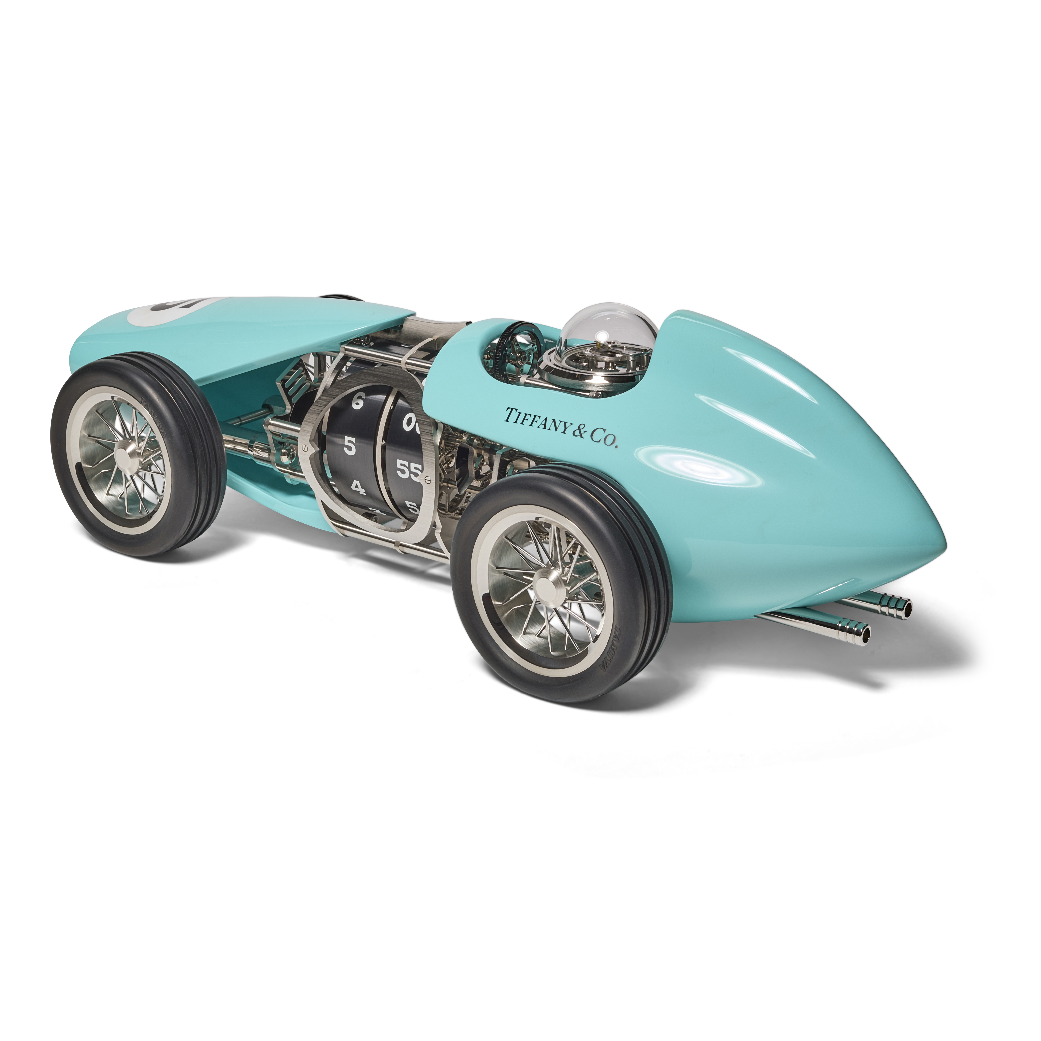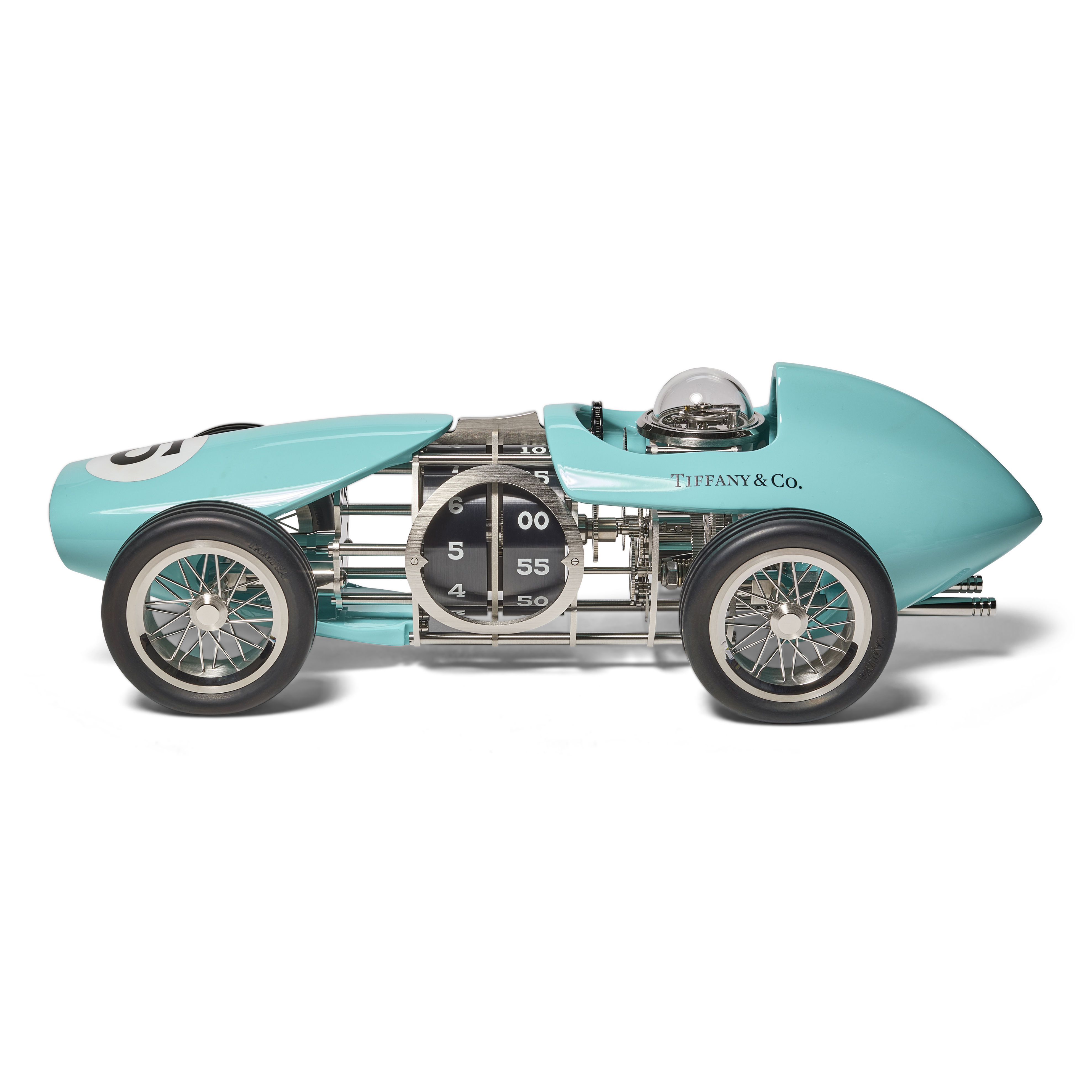 The Tiffany & Co. 'Time for Speed' Race Car Clock is a striking display of innovative design and masterful craftsmanship, inspired by the sleek nostalgia of vintage race cars. This Swiss-made sculptural timepiece weighs approximately 10 lbs. and features a self-winding mechanism activated by pulling the car backward, while the steering wheel cleverly serves as the time-setting control. Its gleaming, aerodynamic silhouette is rendered in aluminum finished with Tiffany Blue® automotive paint and complemented by stainless steel spokes and rims, hard-wearing rubber tires, and a glass dome elegantly encasing the driver’s seat. A meticulously engineered clock dial is seamlessly integrated into the left side of the car, transforming this whimsical object into a functional work of art.