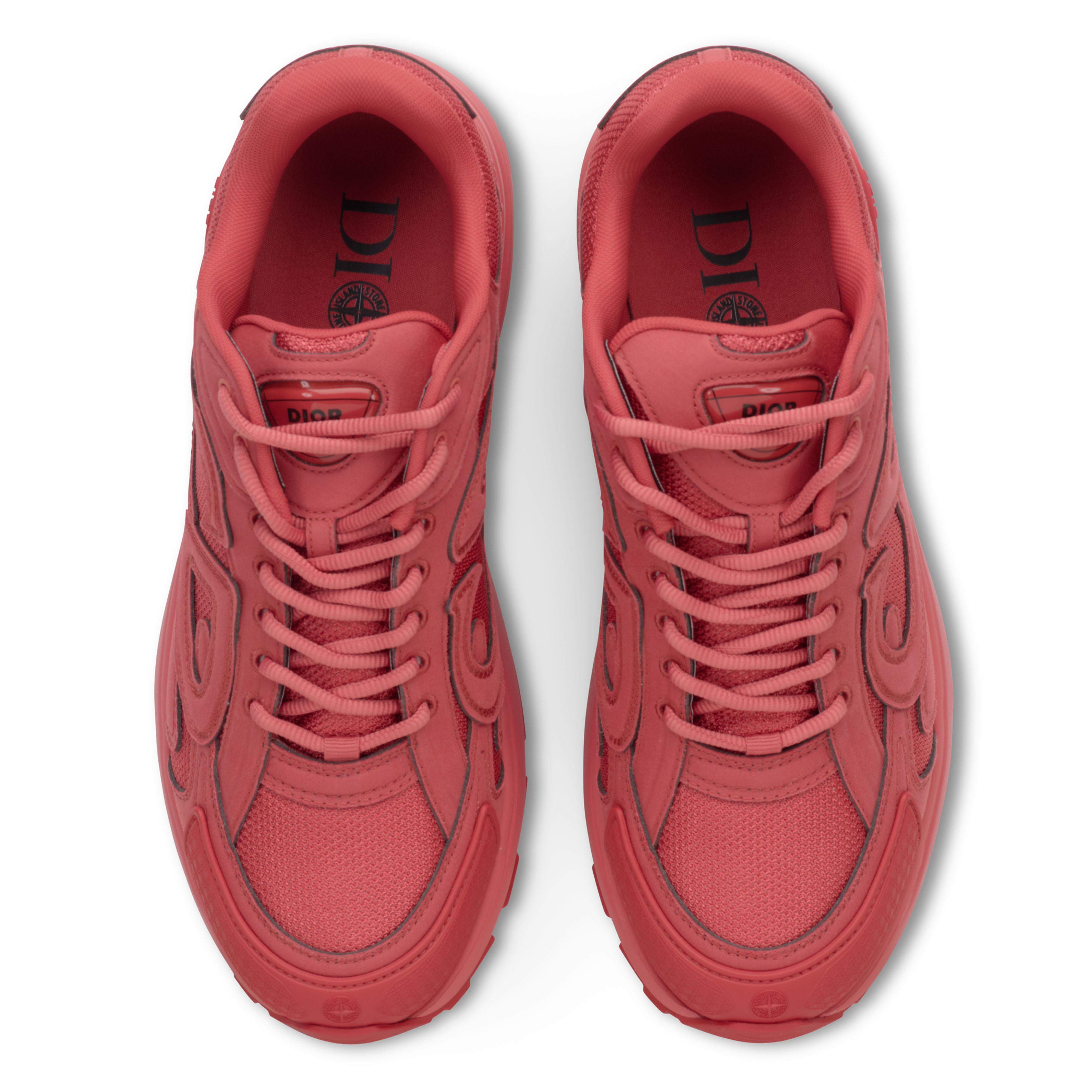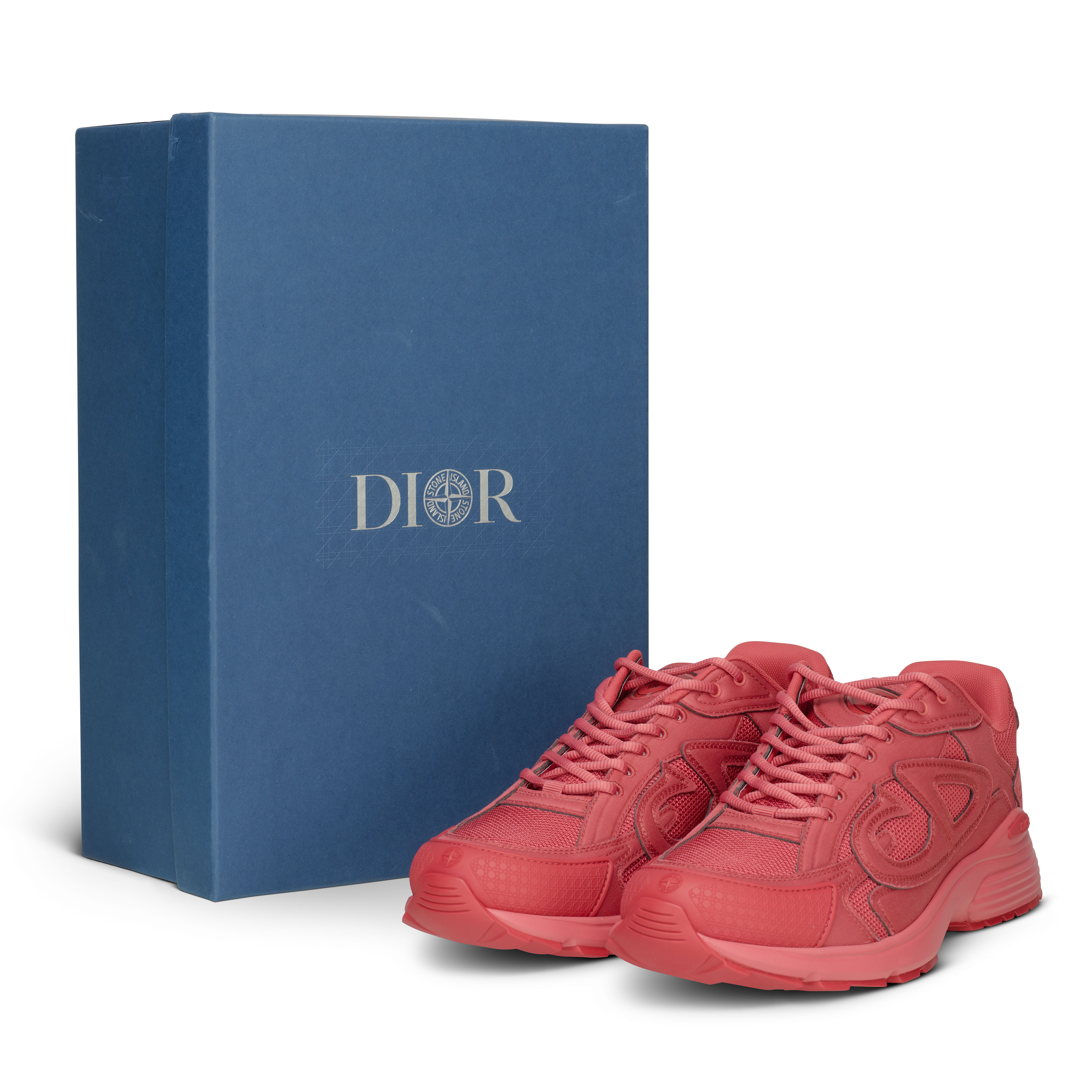 This limited edition B30 sneaker from the Dior x Stone Island Fall 2024 capsule showcases the vivid color alchemy that defined Kim Jones’ collaboration with the cult Italian technical-wear house. Rendered in a radiant dark pink tone, the pair reflects the collection’s transformative approach to color, where fabrics appear illuminated with shifting, saturated hues. The silhouette retains the B30’s streamlined athletic profile while incorporating Stone Island’s signature material innovation, resulting in a sneaker that feels both luxurious and performance-inspired. Numbered 030/470, this rare release stands as a highly collectible fusion of two design powerhouses, celebrated for its striking palette and cross-cultural fashion significance.