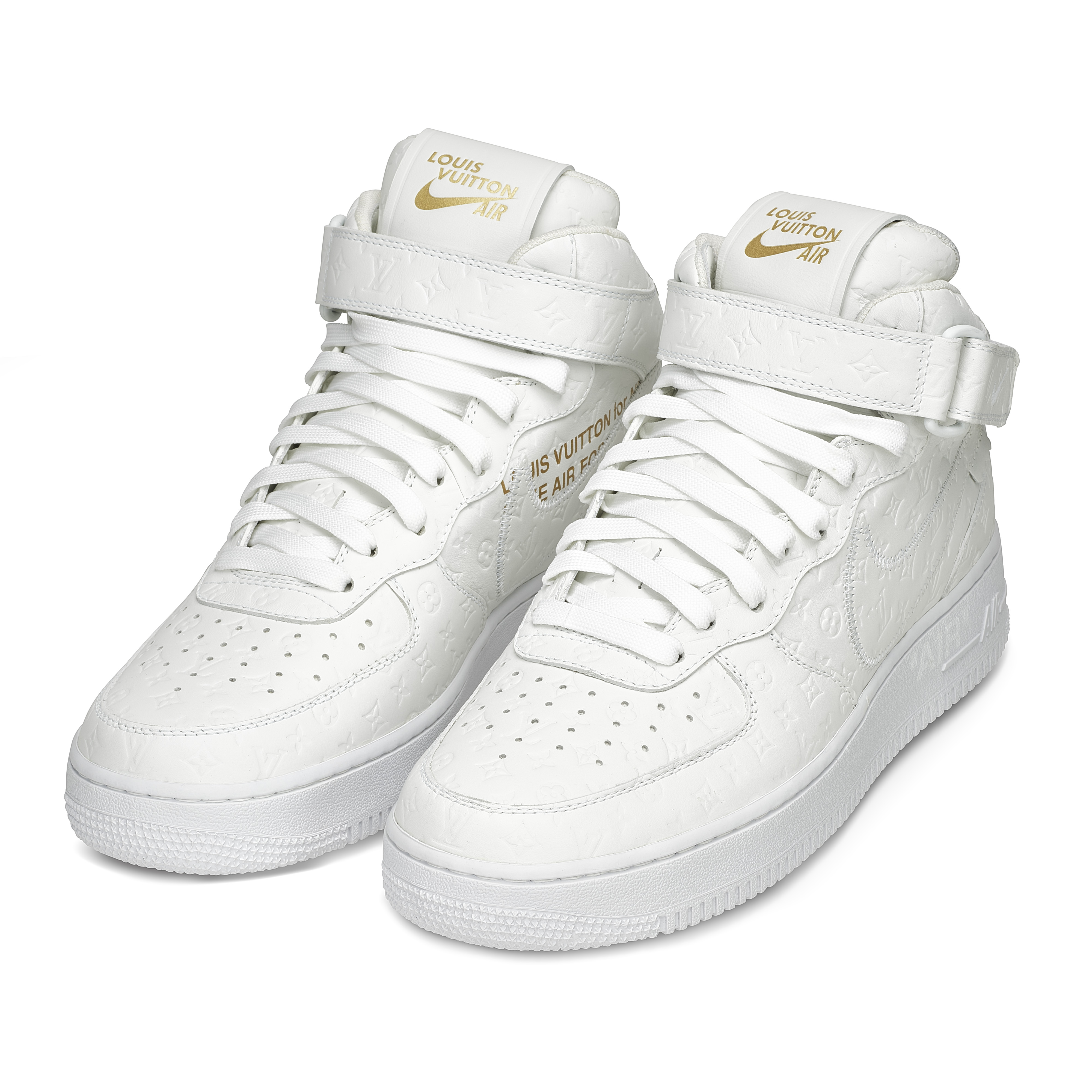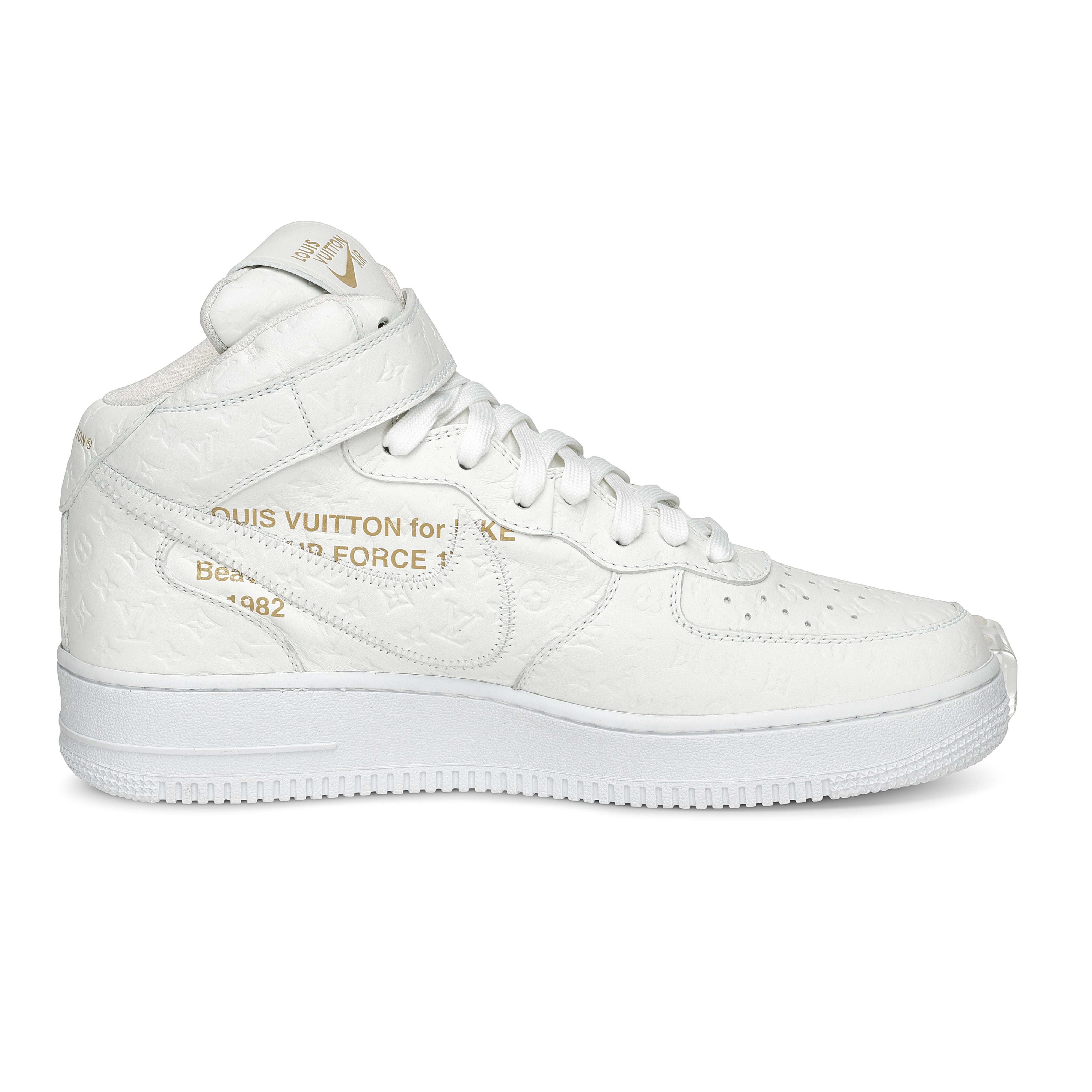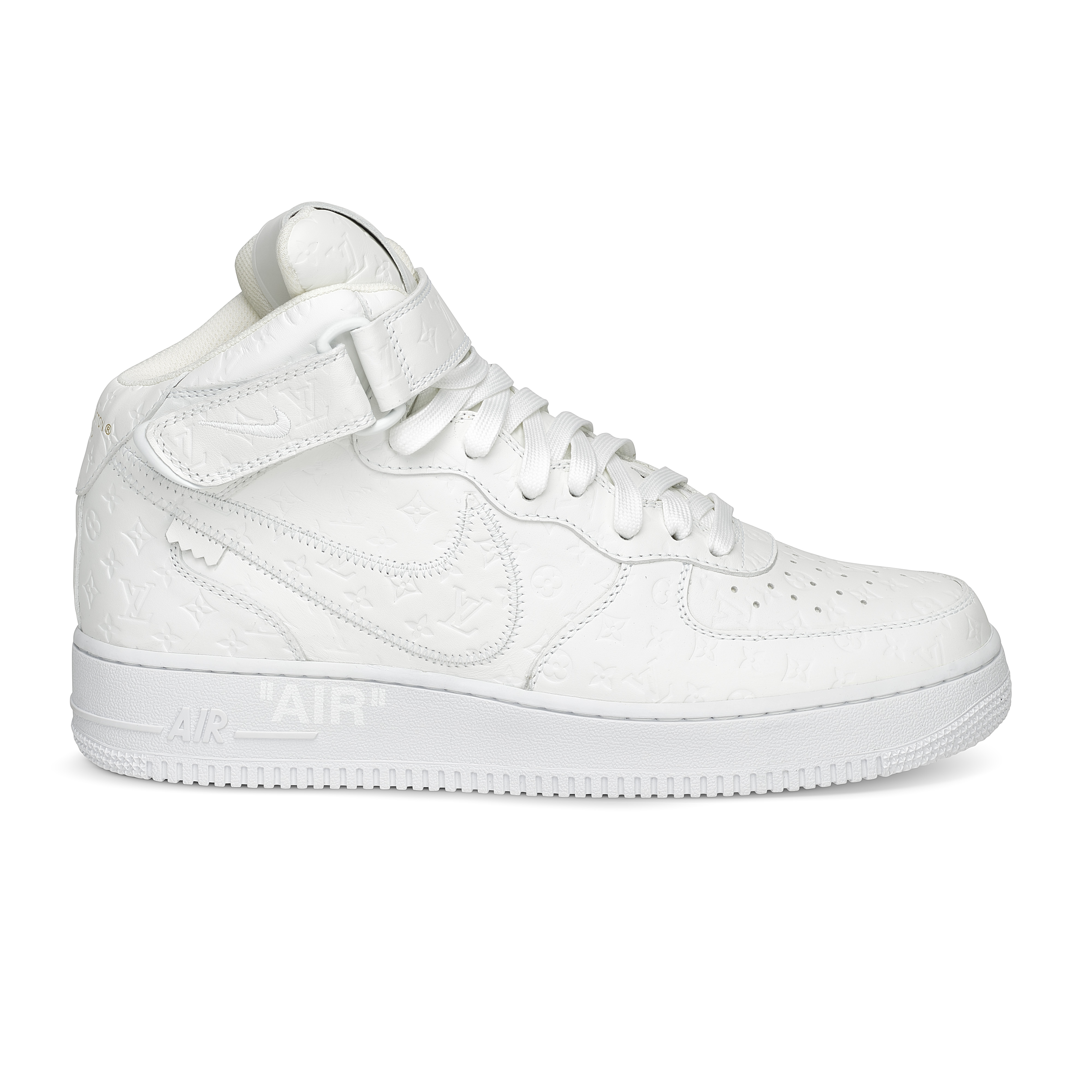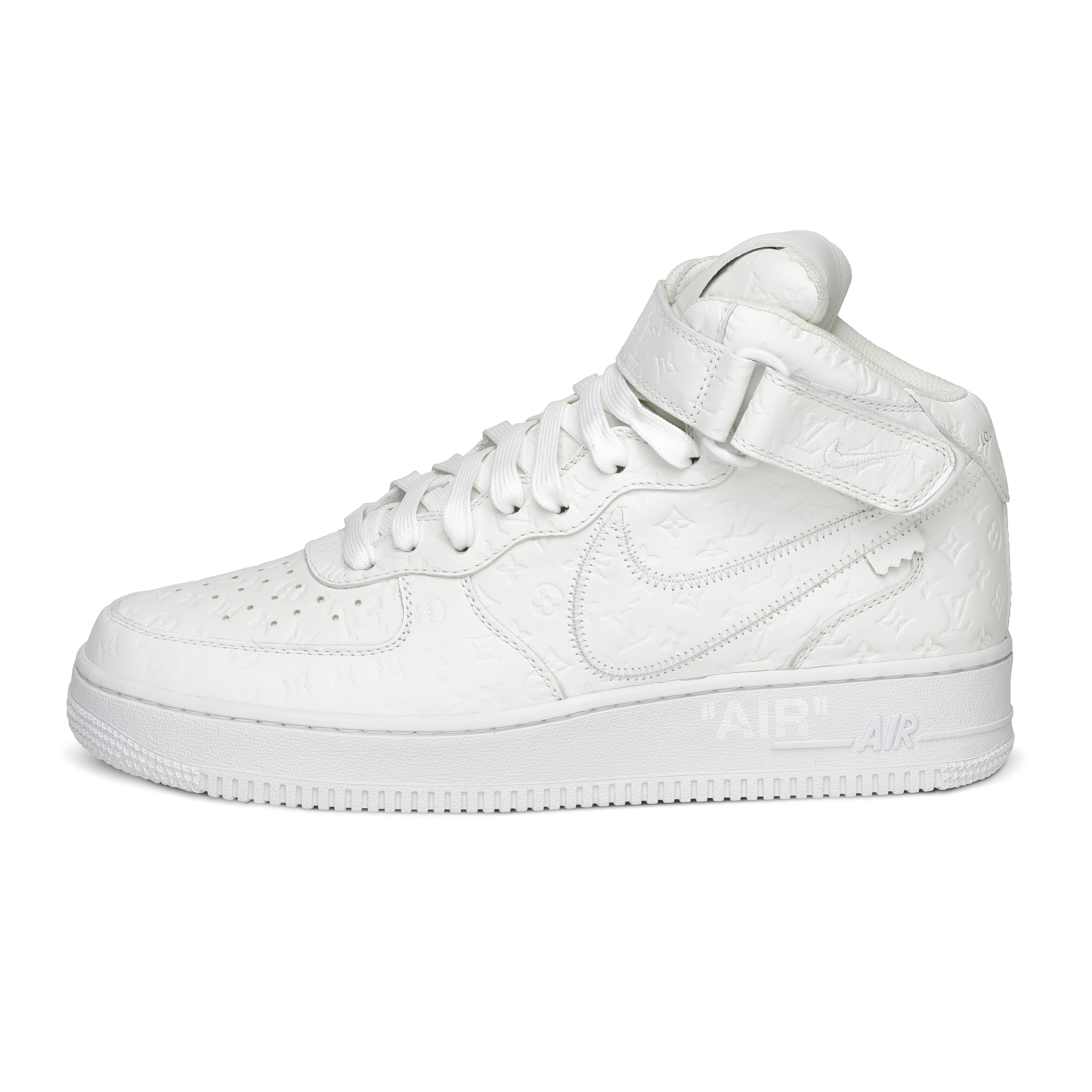 Designed under Virgil Abloh for Louis Vuitton’s Spring–Summer 2022 Men’s Collection, the Louis Vuitton x Nike Air Force 1 Mid in White is one of the most significant luxury–sneaker collaborations of the decade. Crafted in Louis Vuitton’s ateliers in Italy, the pair reimagines the classic Nike silhouette in premium white leather embossed with the Maison’s Monogram, merging couture craftsmanship with an icon of street culture. Signature LV details—including the Monogram-flower motifs, dual ankle straps, and Abloh’s hallmark quotation-mark text—elevate the sneaker into a sculptural design object. A historic fusion of two global design houses, this mid-top iteration remains one of the most sought-after expressions of Virgil Abloh’s pioneering vision.