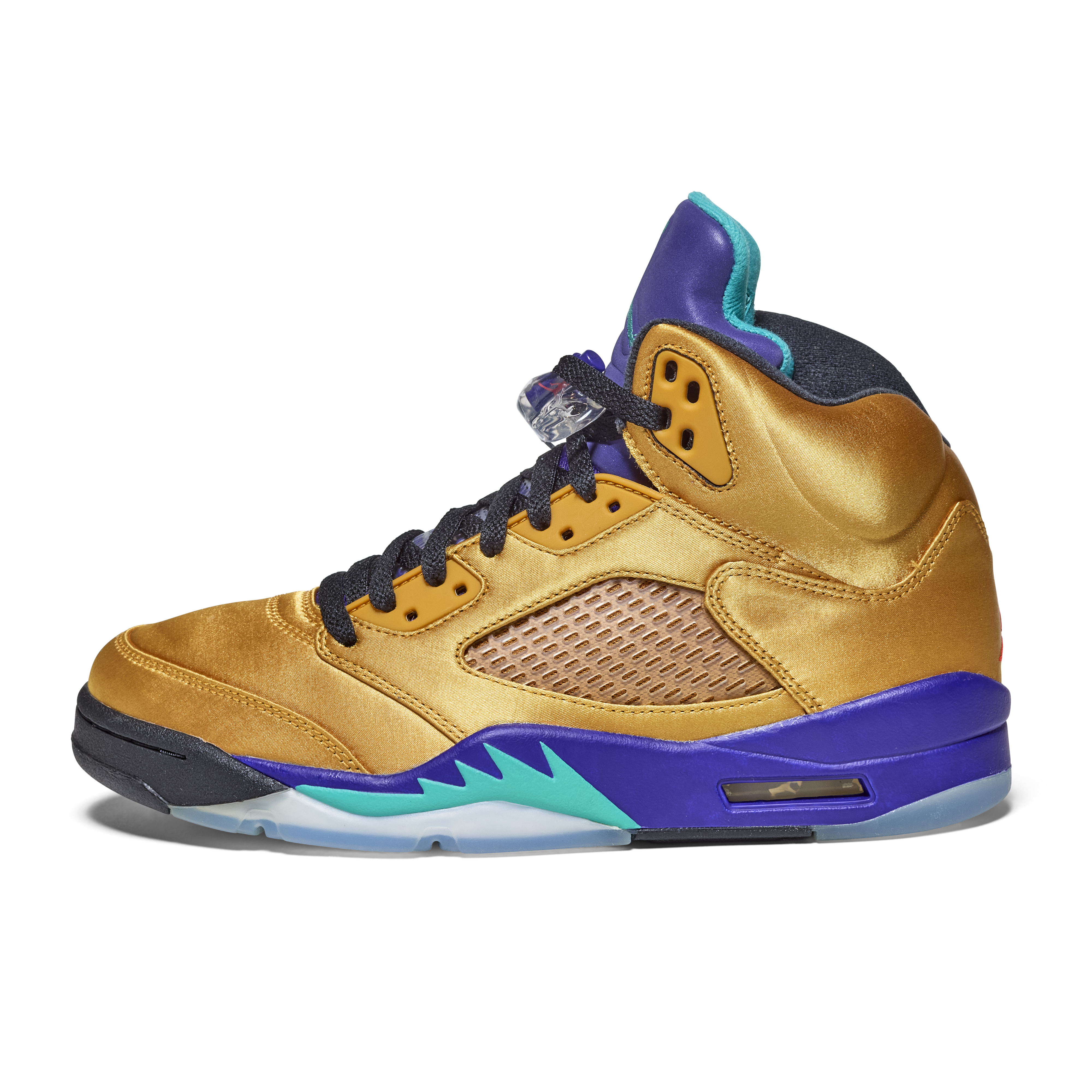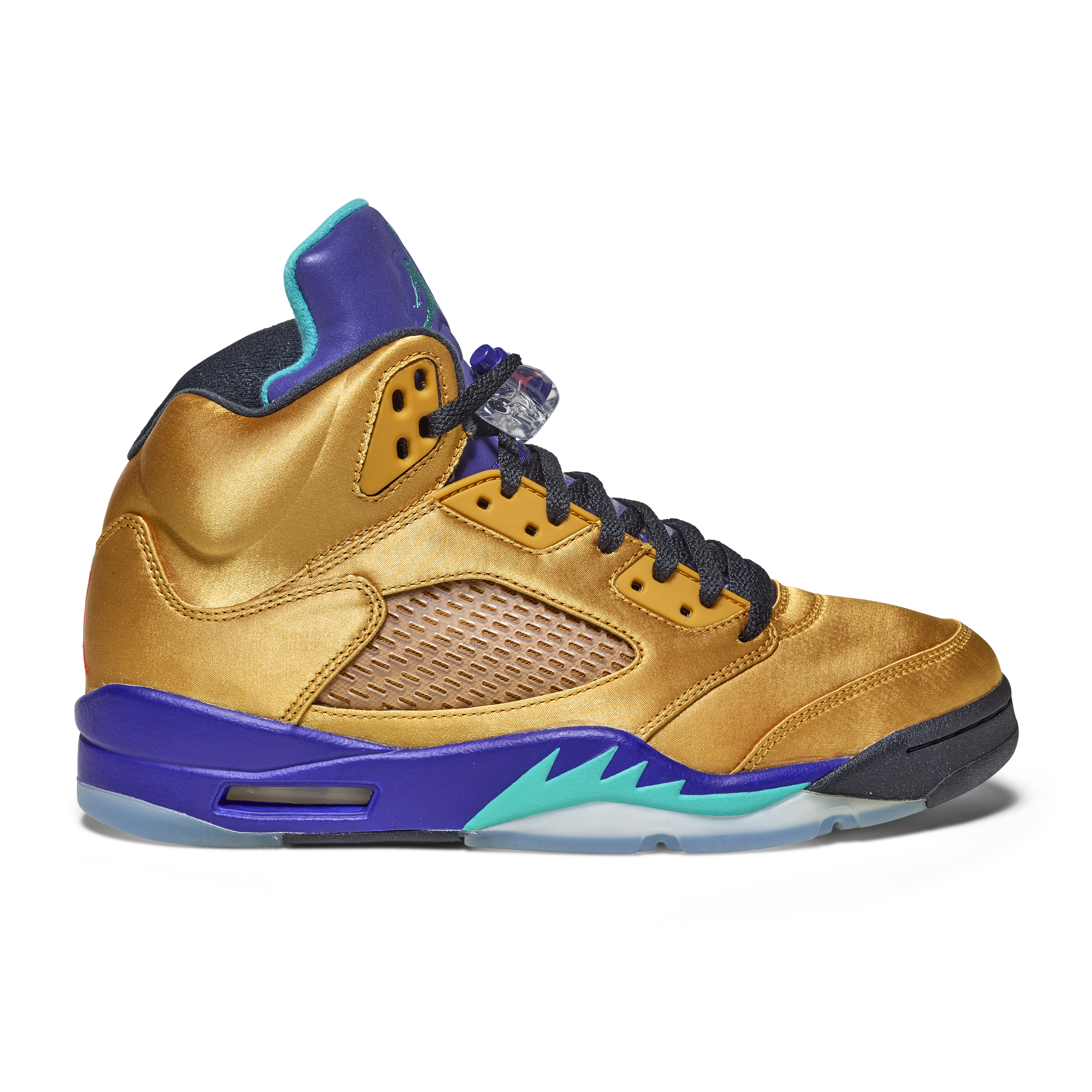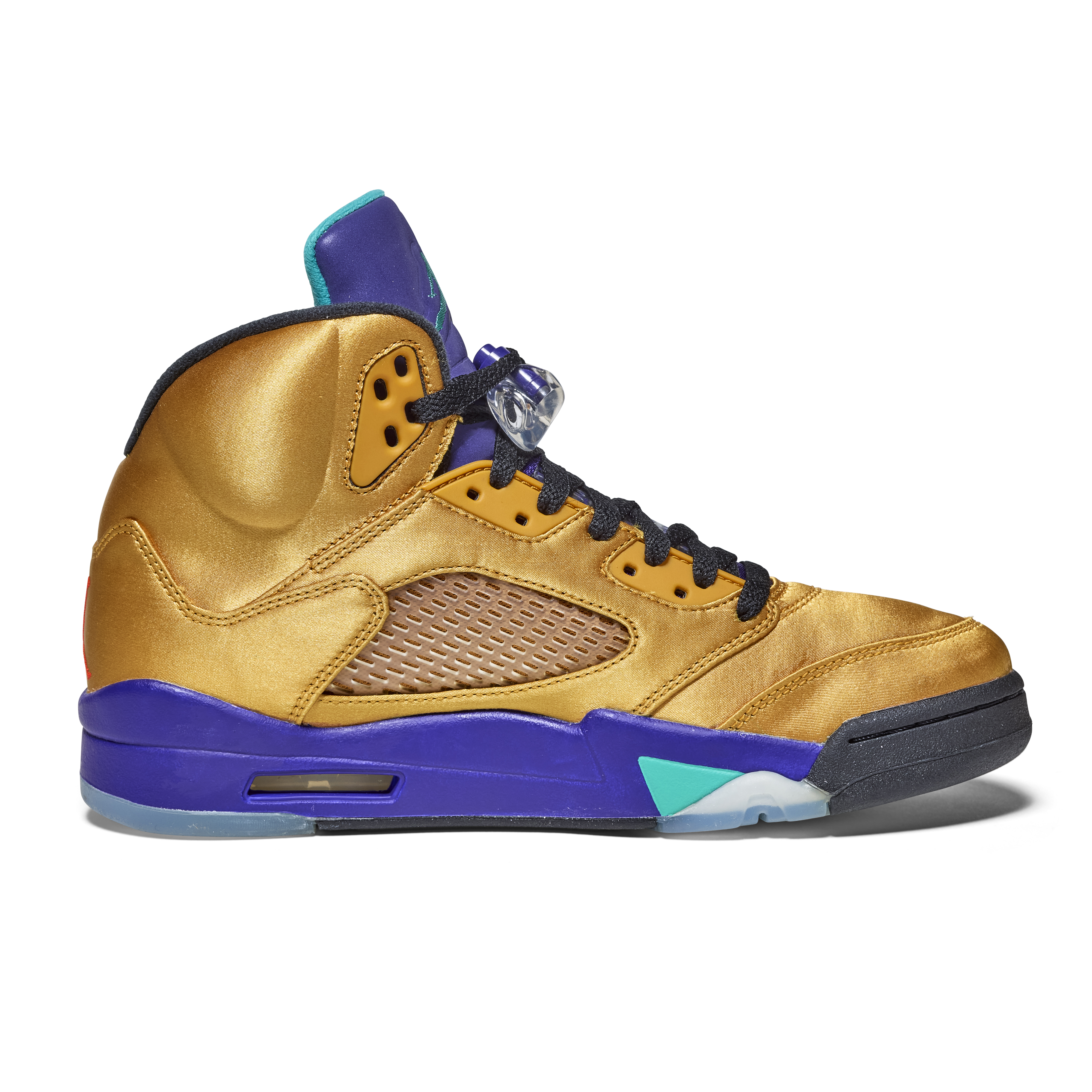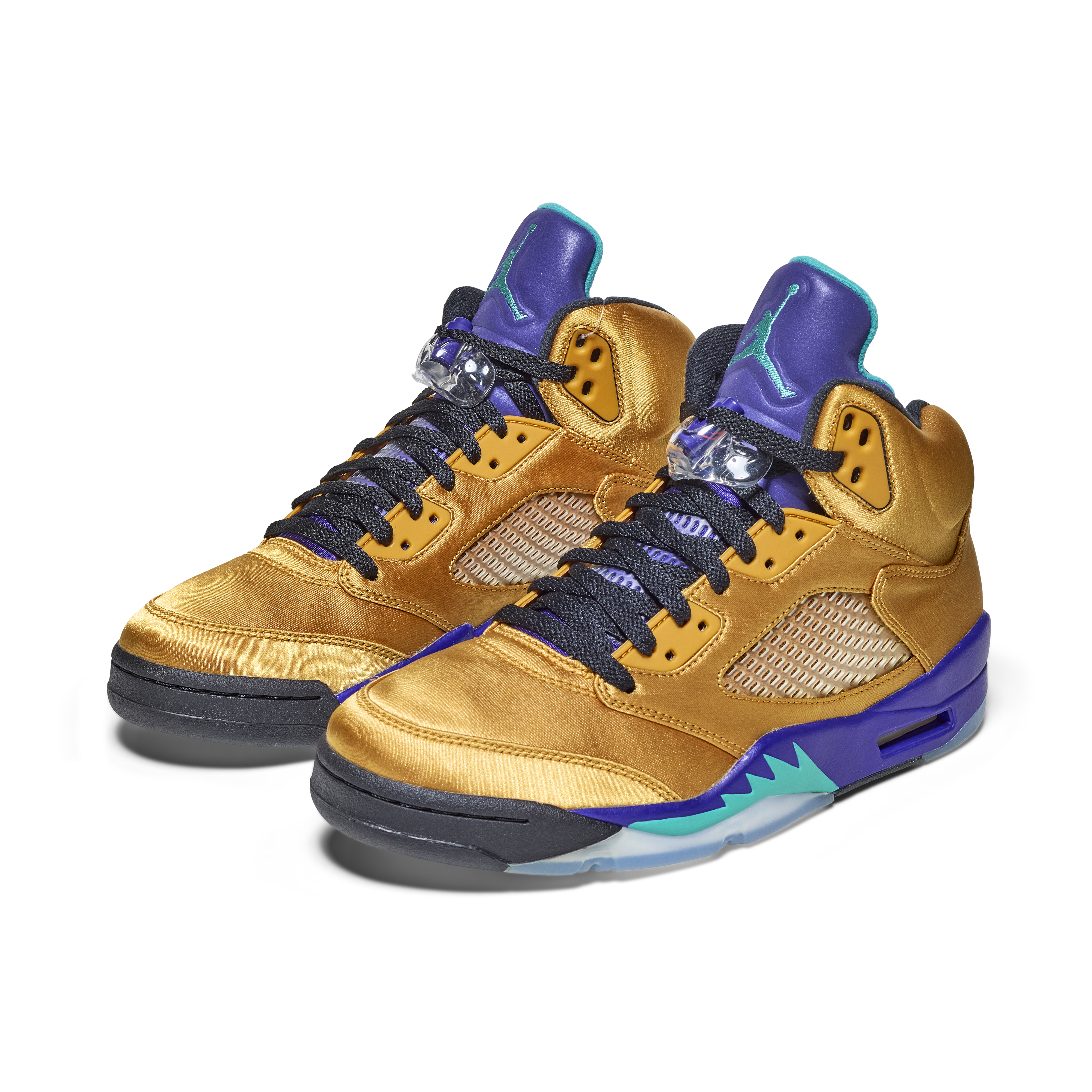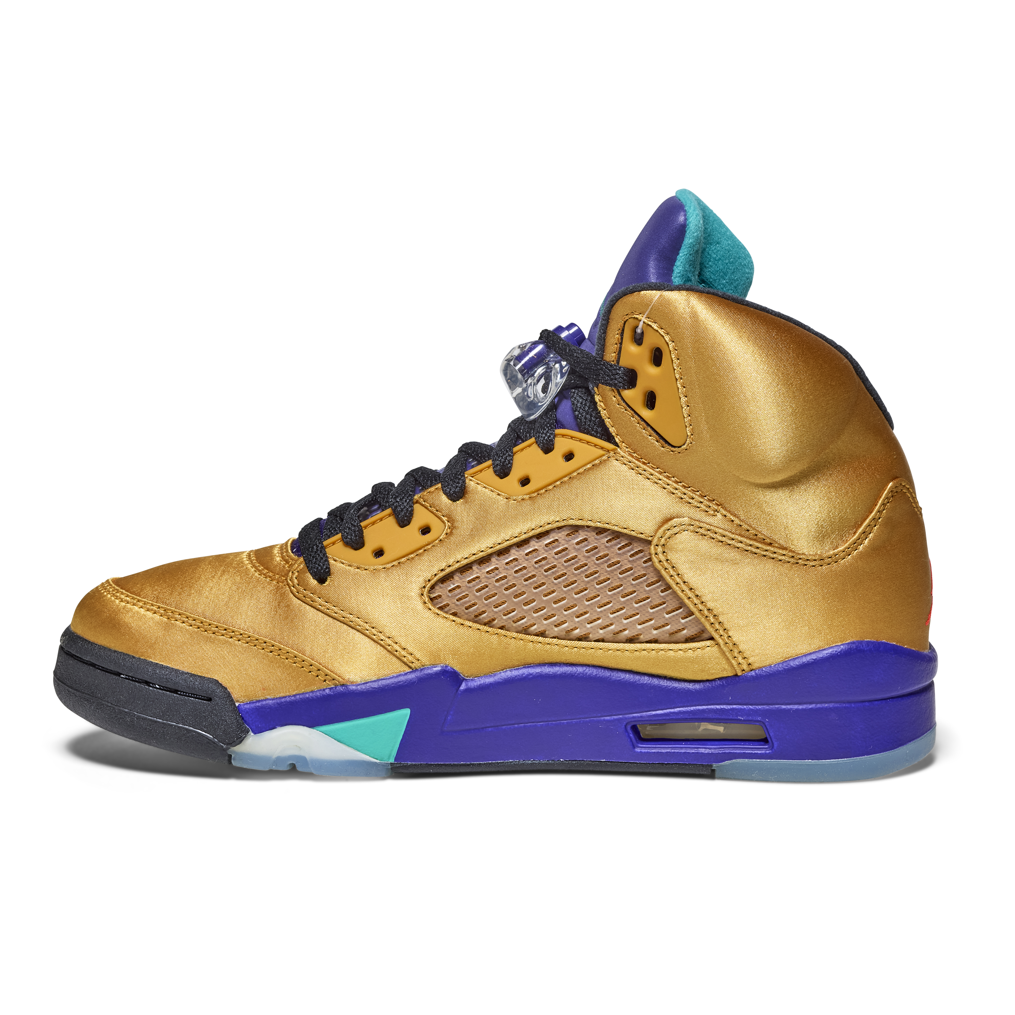 The pair features a metallic gold upper with purple and teal accents on the tongue and midsole—an homage to the original 1990 “Grape” Air Jordan 5. Black laces and clear lace locks complete the design. The Air Jordan 5 was the first model to introduce lace locks and icy outsoles, and was designed by Tinker Hatfield, drawing inspiration from World War II fighter jets, evident in the signature shark-tooth midsole detailing.