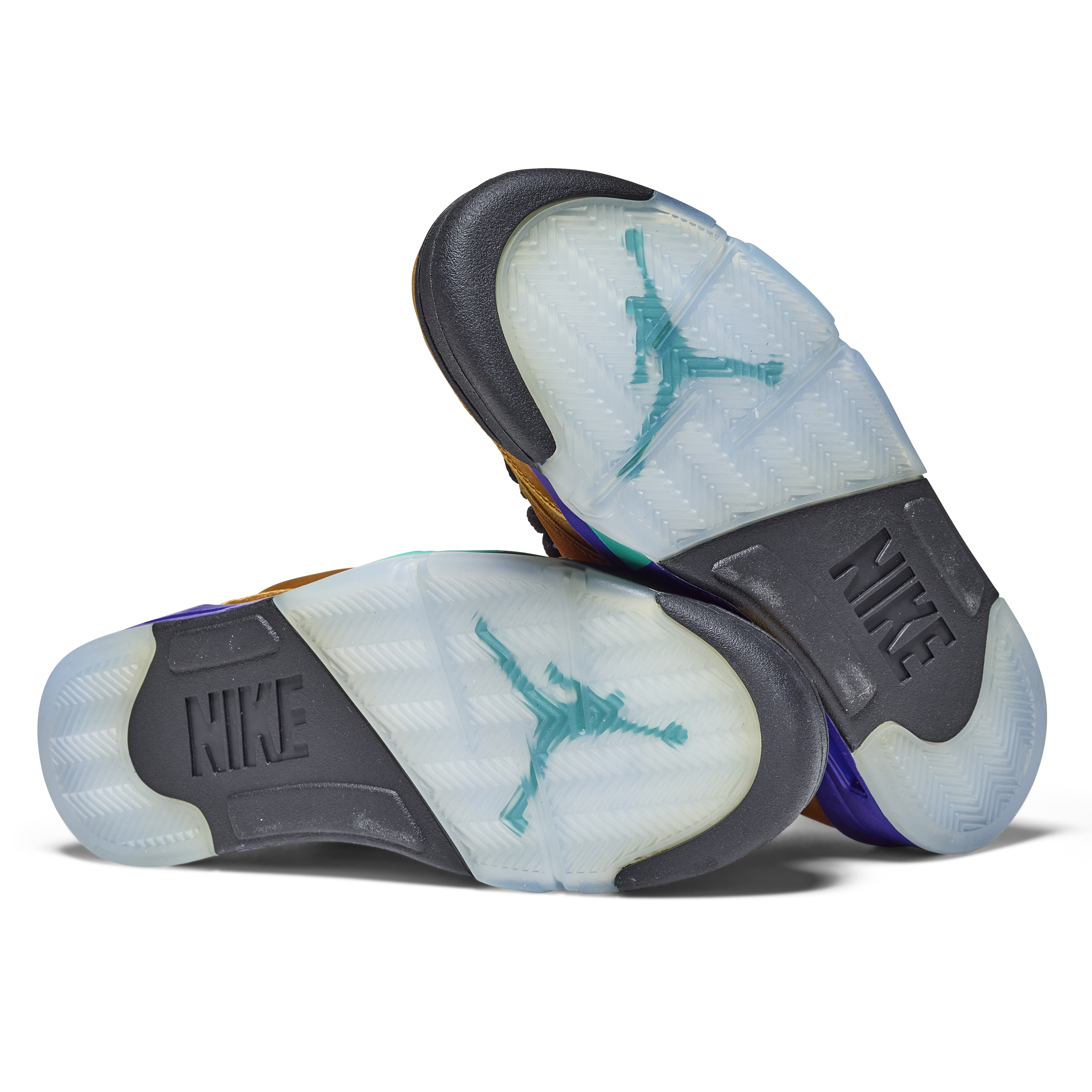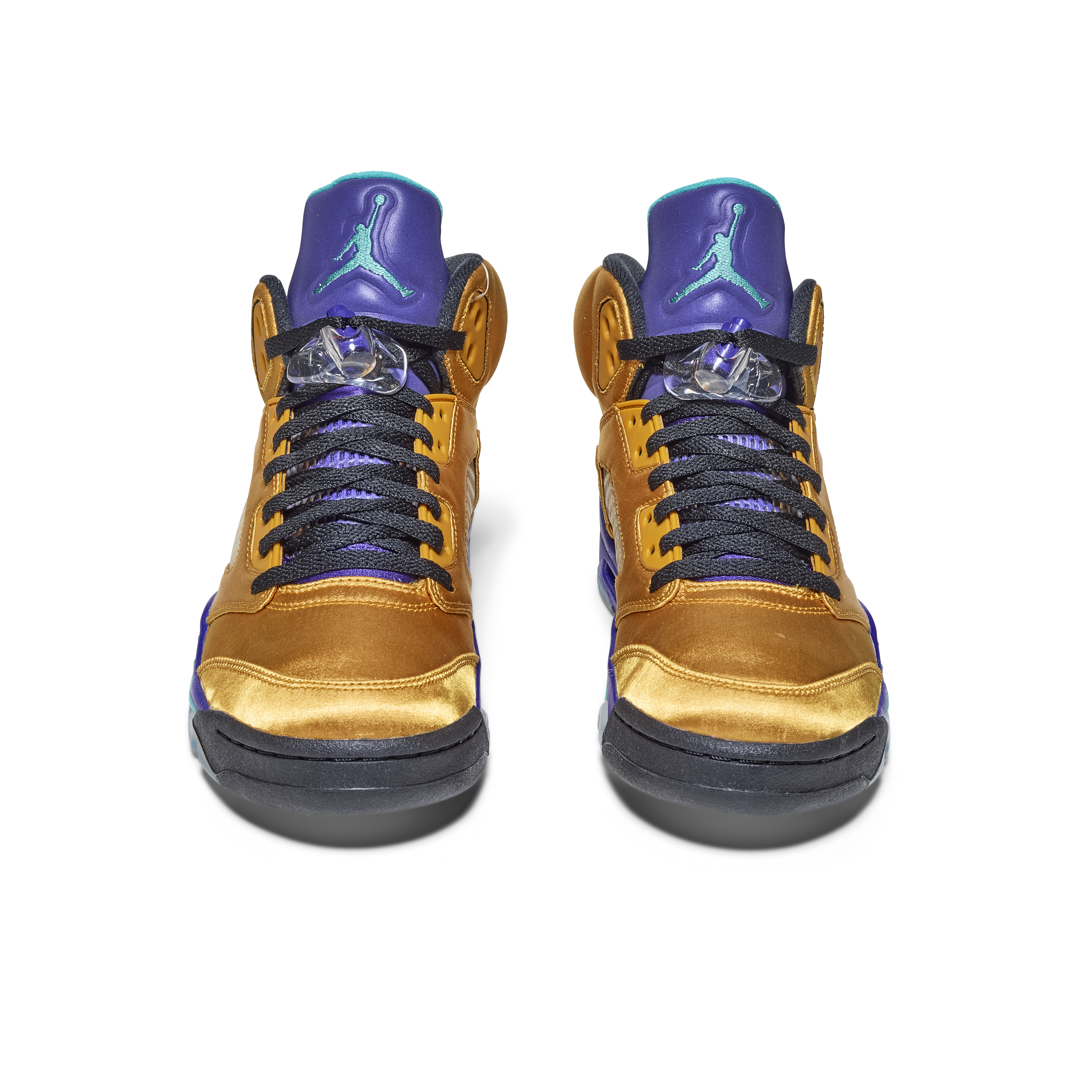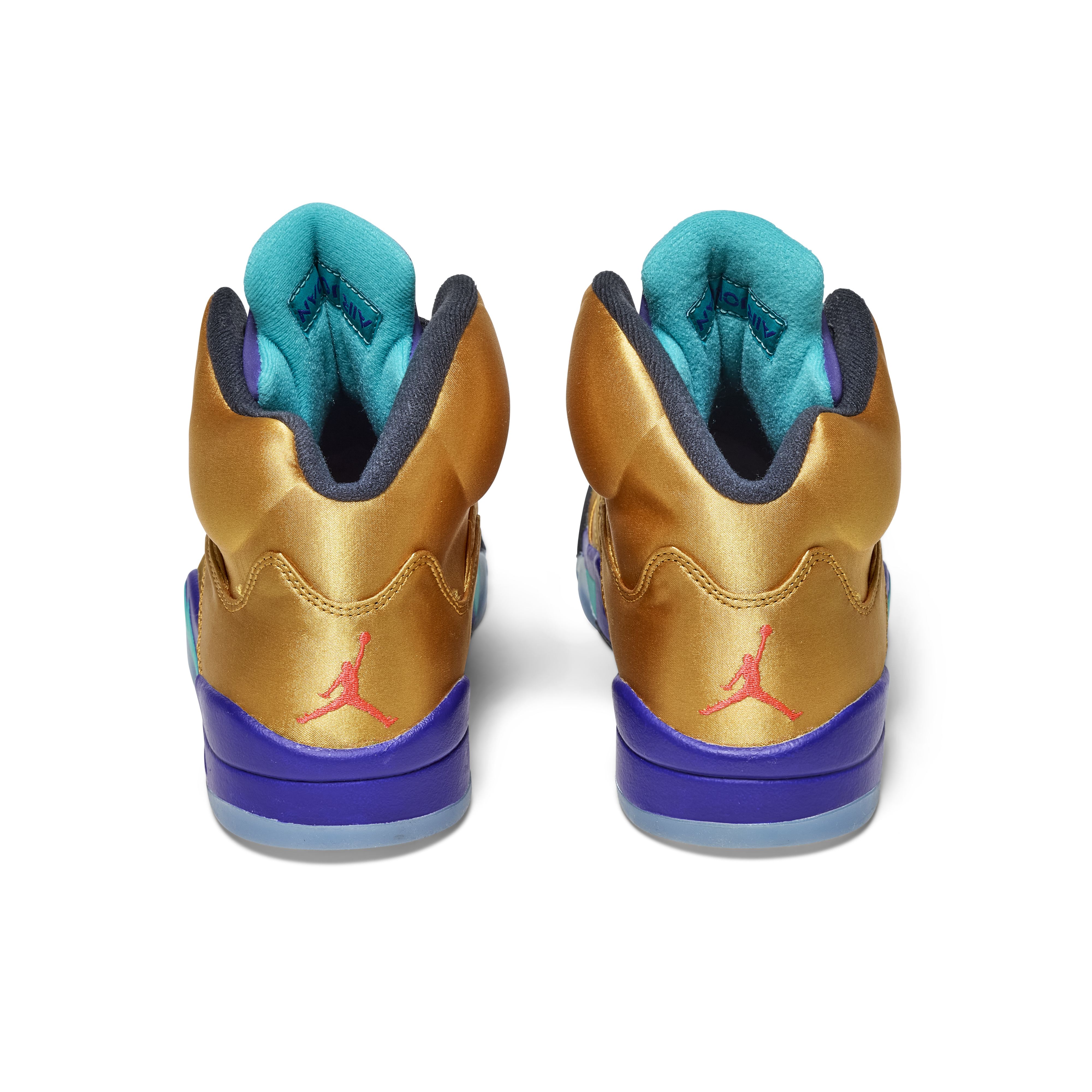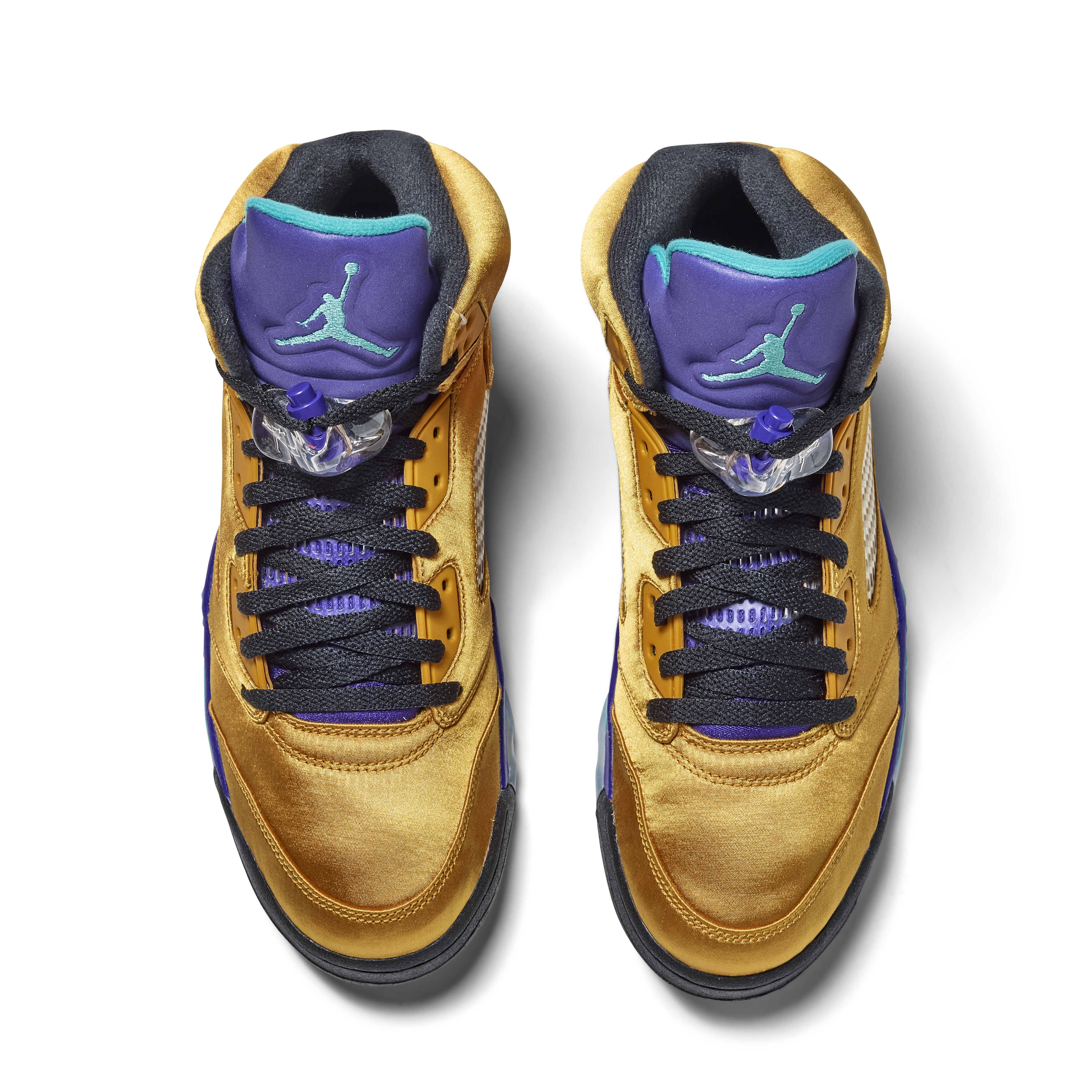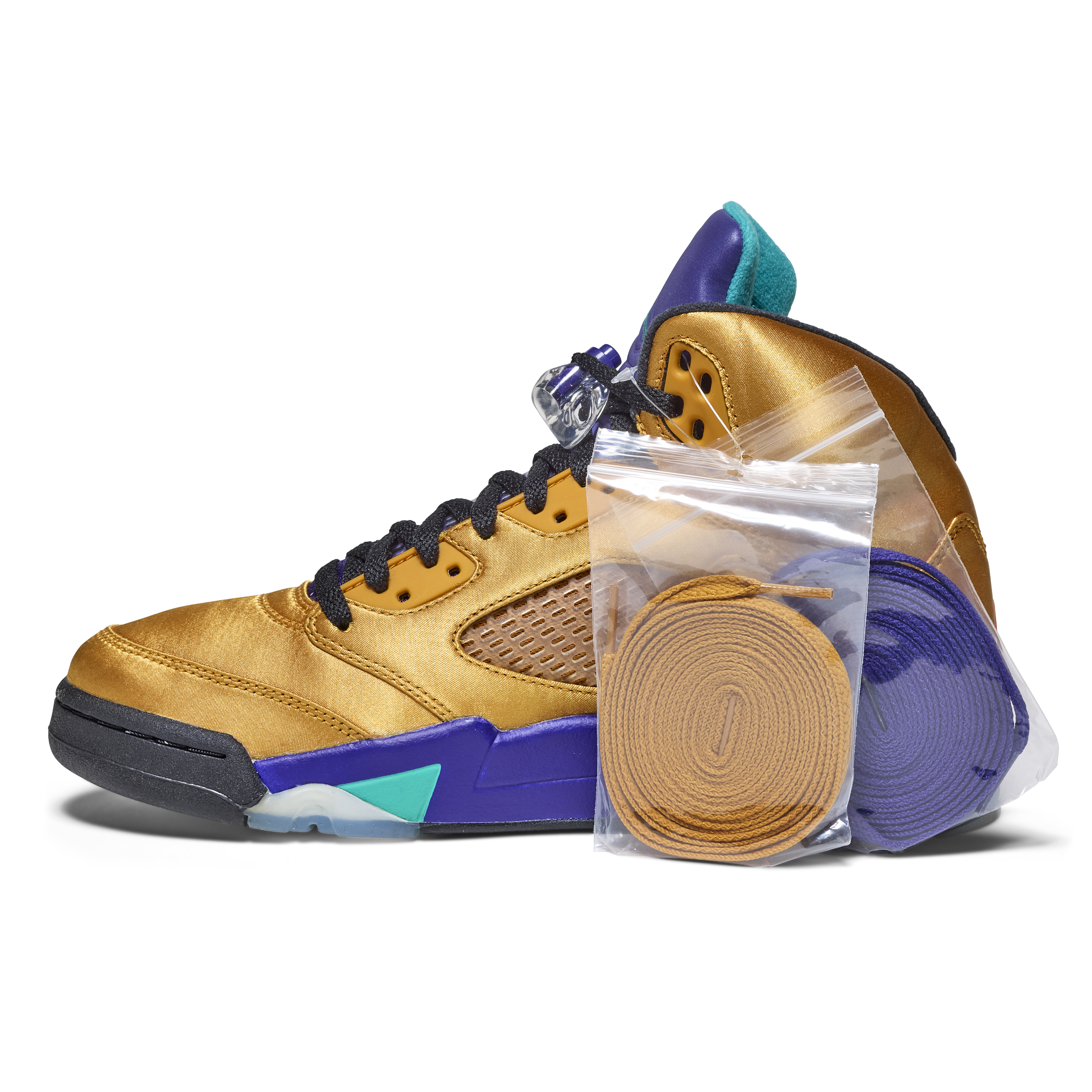 The pair features a metallic gold upper with purple and teal accents on the tongue and midsole—an homage to the original 1990 “Grape” Air Jordan 5. Black laces and clear lace locks complete the design. The Air Jordan 5 was the first model to introduce lace locks and icy outsoles, and was designed by Tinker Hatfield, drawing inspiration from World War II fighter jets, evident in the signature shark-tooth midsole detailing.