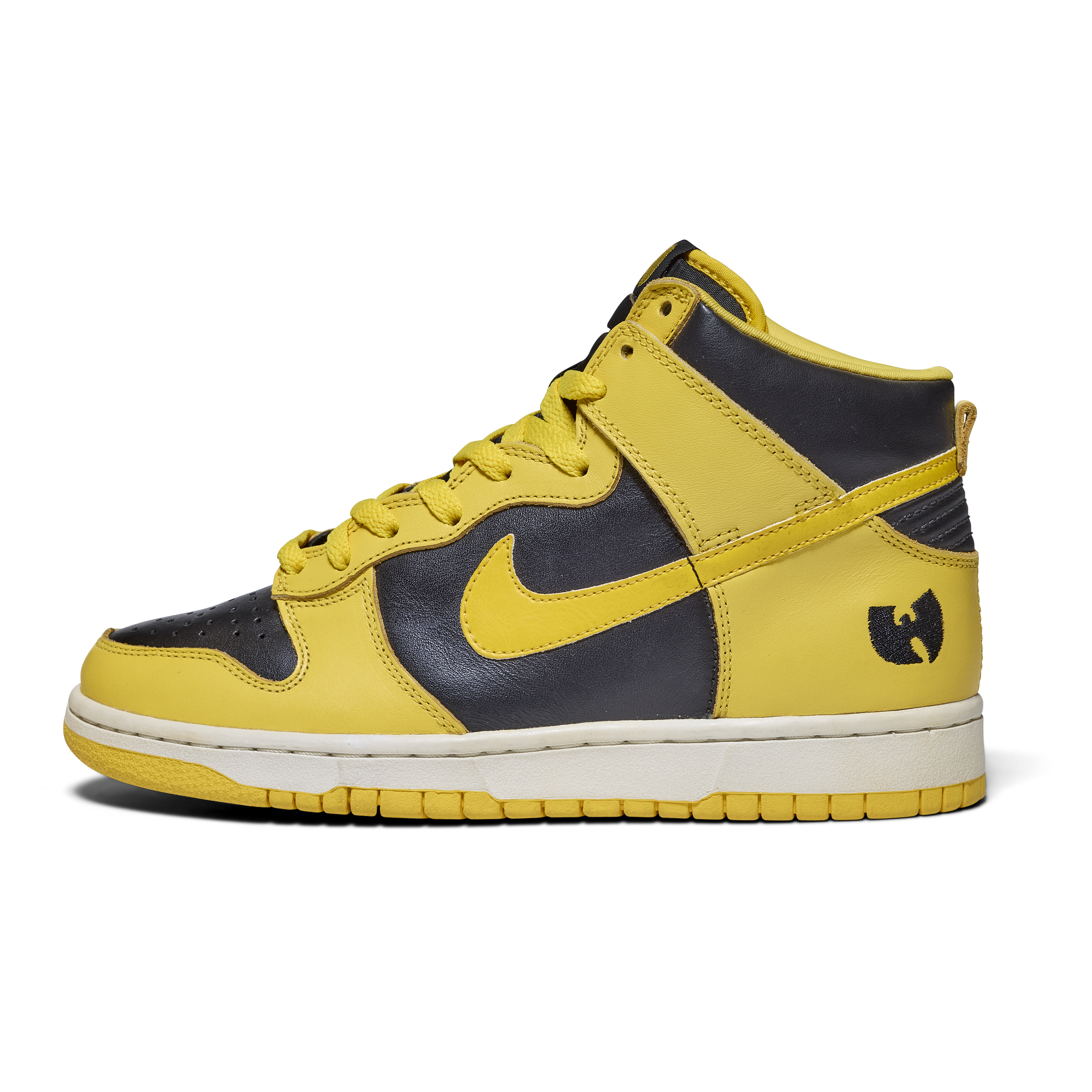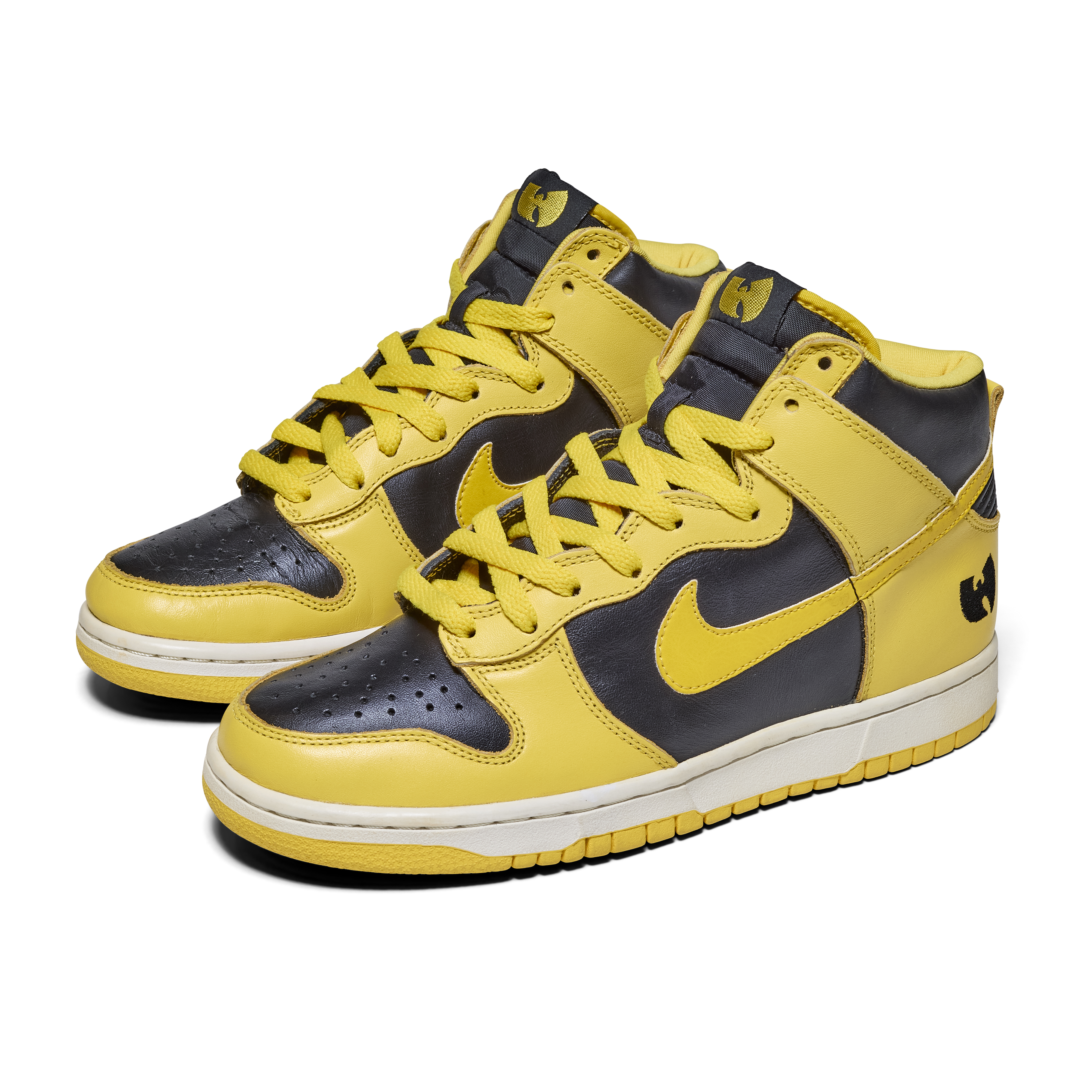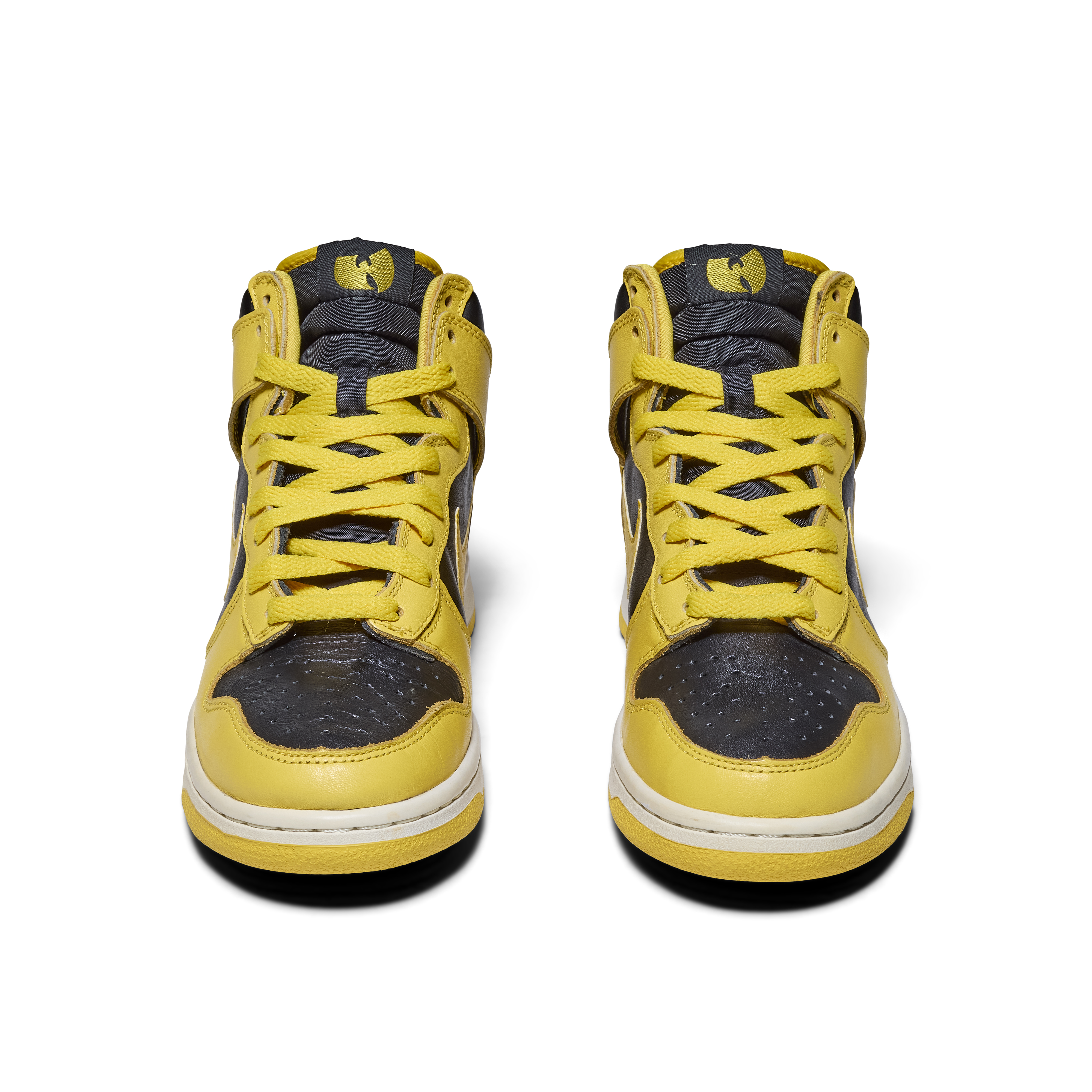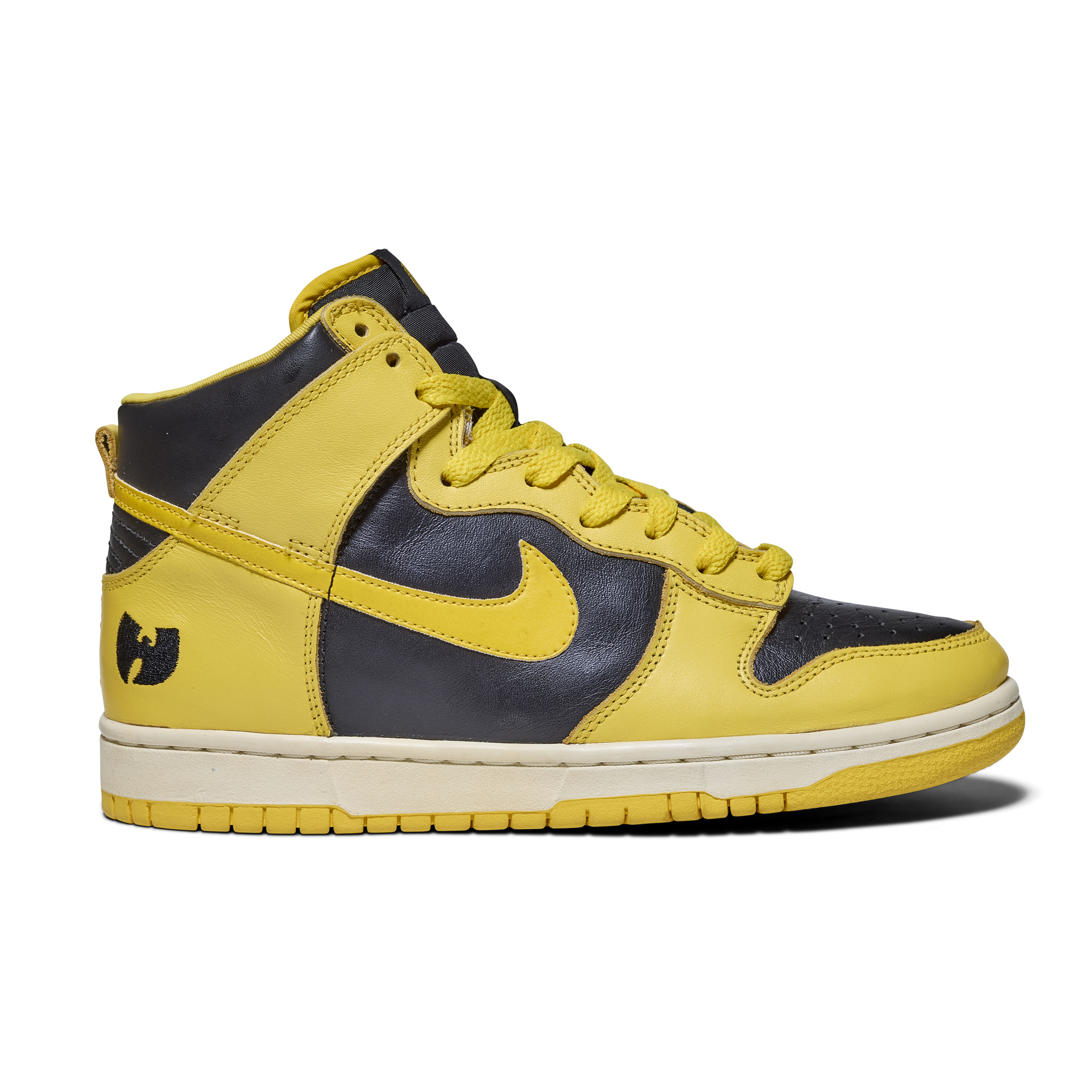 These Wu-Tang x Nike Dunk High sneakers are among the most coveted and elusive Dunks ever produced. Created in 1999 as an exclusive promotional item for the Wu-Tang Clan and their close friends and family, they were never made available to the public and remain exceptionally rare. Dressed in the group’s signature black and yellow (officially goldenrod) colorway—a nod to the Wu-Tang Clan’s “Killer Bees” moniker—the shoes feature premium color blocking with the iconic Wu-Tang “W” logo embroidered on the lateral heels and tongues. This pair is a men’s size 7.5 (also fitting a women’s size 9) and comes brand new in its original box, making it an extraordinary collector’s piece from one of the most legendary non-retail Nike releases of all time.