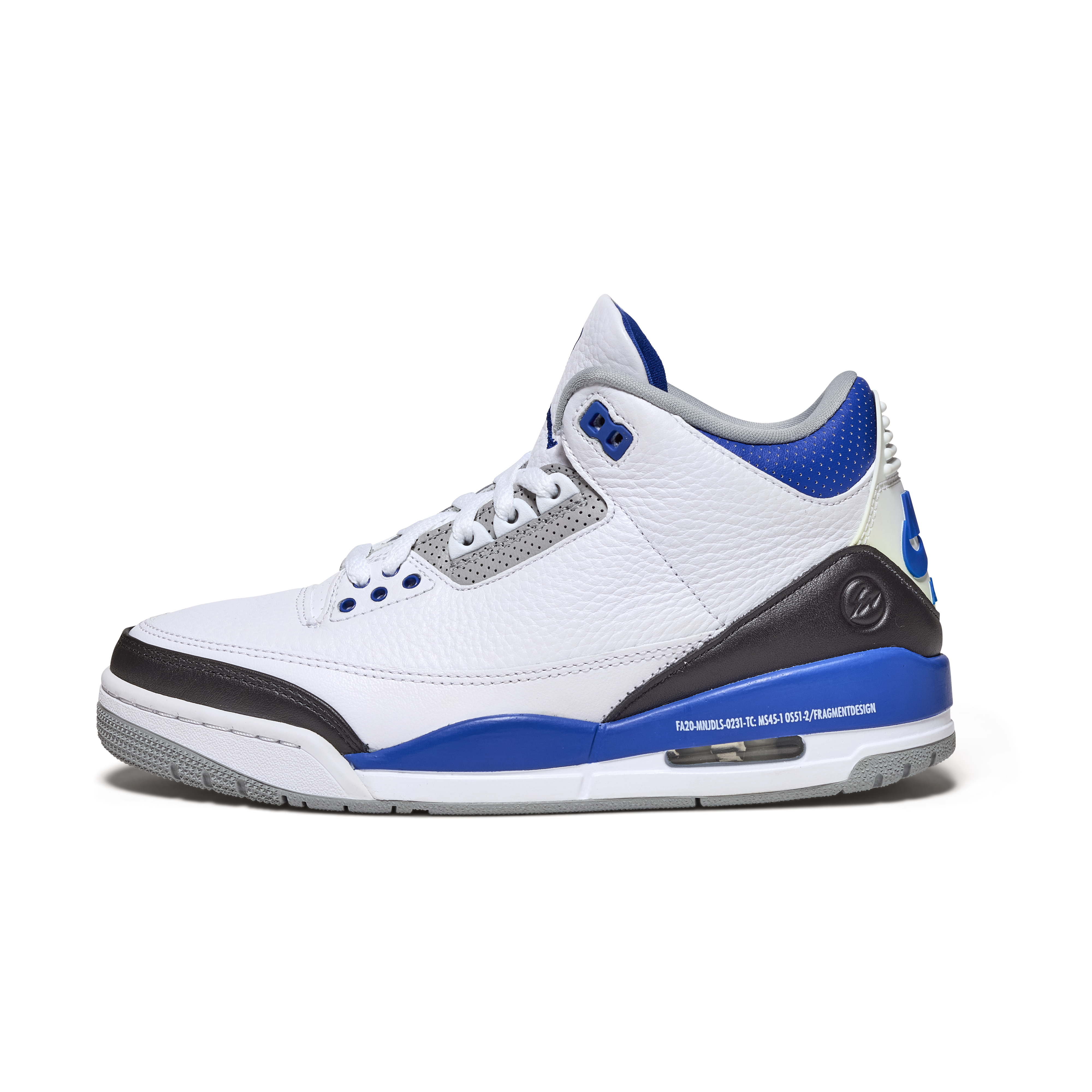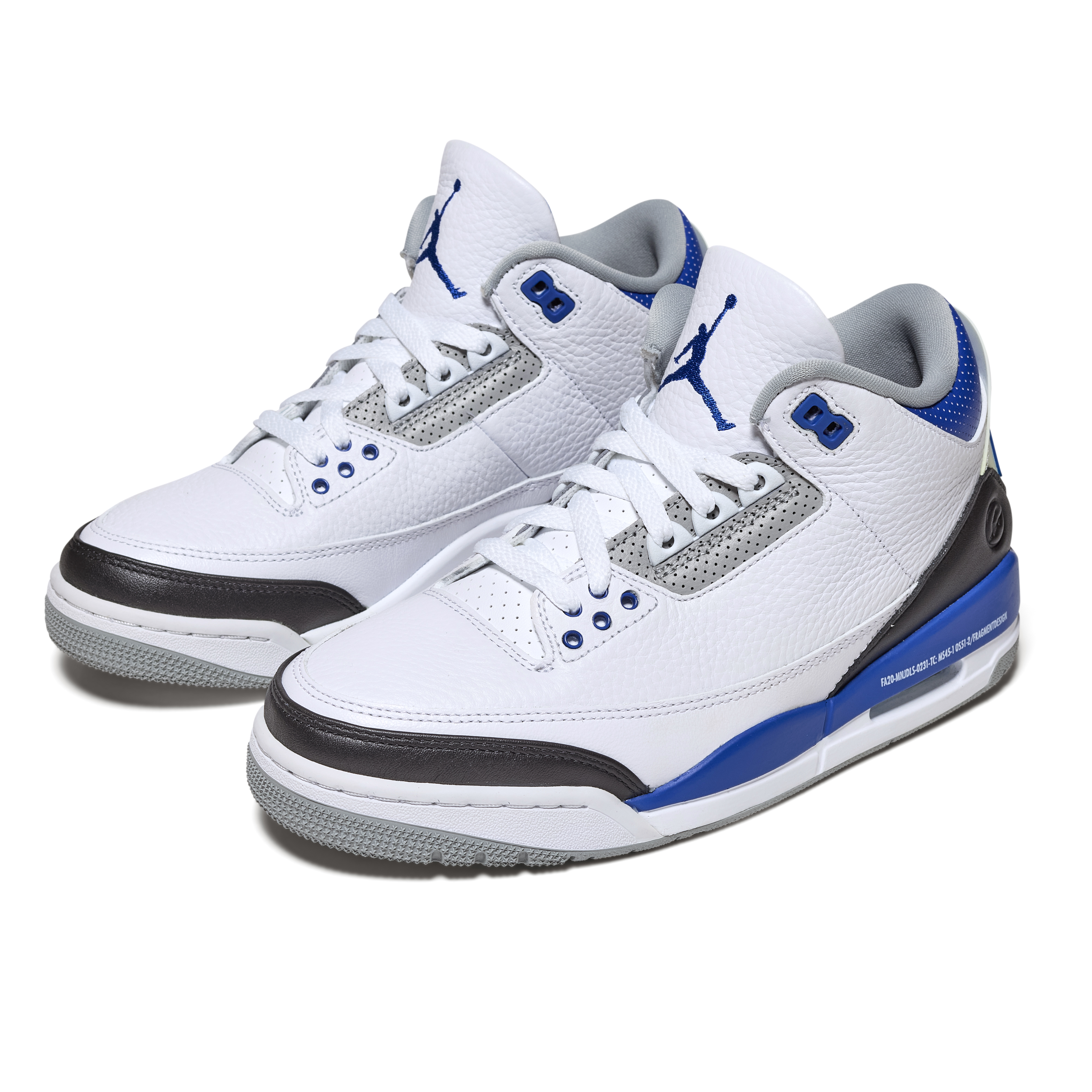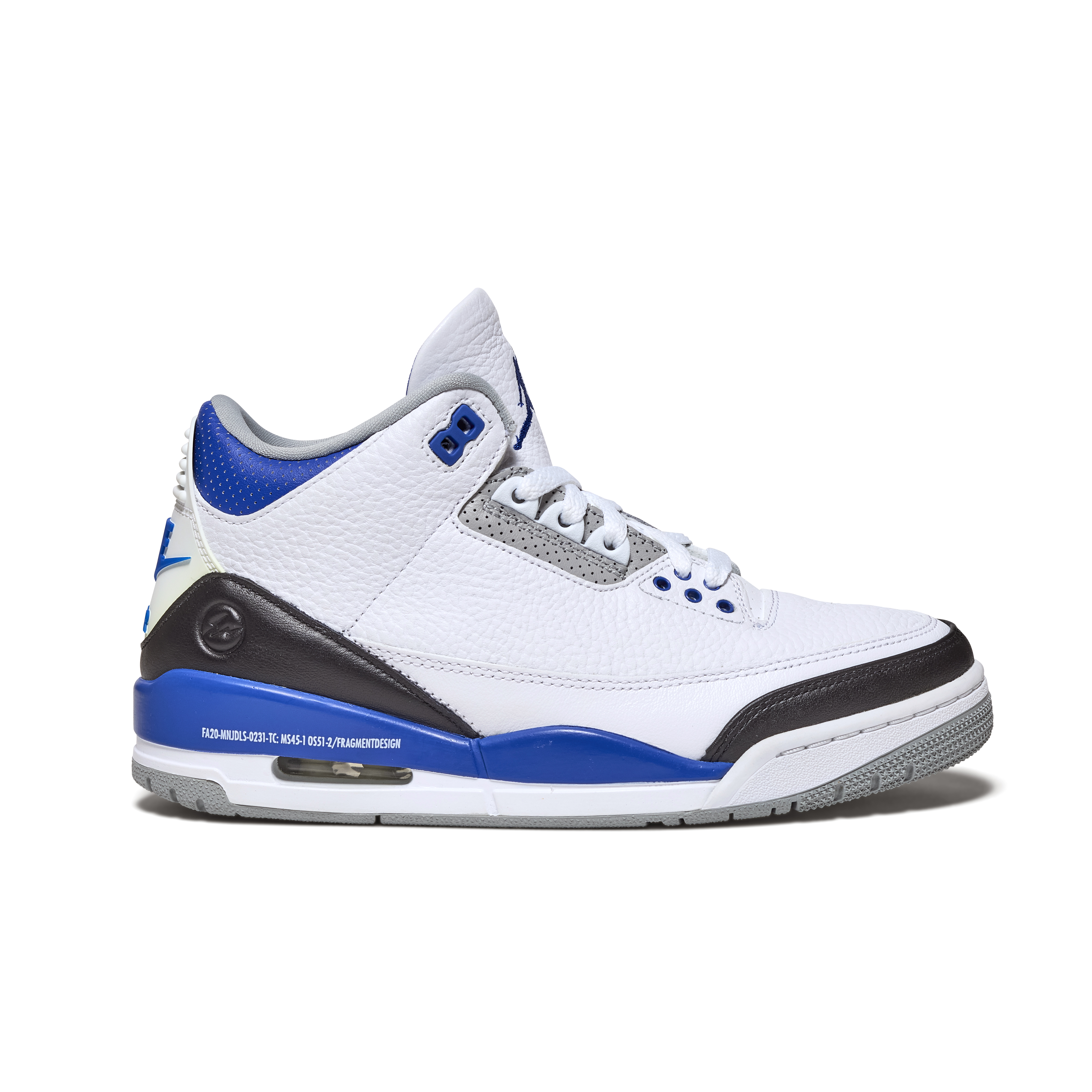 These Fragment x Air Jordan 3 sneakers are ultra-rare Promo Samples and Friends & Family exclusives, created as part of the collaboration between Jordan Brand and Hiroshi Fujiwara’s Fragment Design but never released to the public. Crafted with premium white leather uppers accented by black panels and sport royal blue detailing, the pair features Fragment’s iconic lightning bolt logo on the lateral heels. The style number, color code, and season are printed cleanly along the midsoles just above the visible Air bubbles—an homage to the technical precision behind the design. Air Jordan 3s were the first Air Jordan model designed by Tinker Hatfield and the first Air Jordan to showcase both the Jumpman logo and visible Air cushioning. This unreleased Fragment Sample stands as a highly coveted fusion of historic Jordan heritage and Fujiwara’s refined aesthetic.
