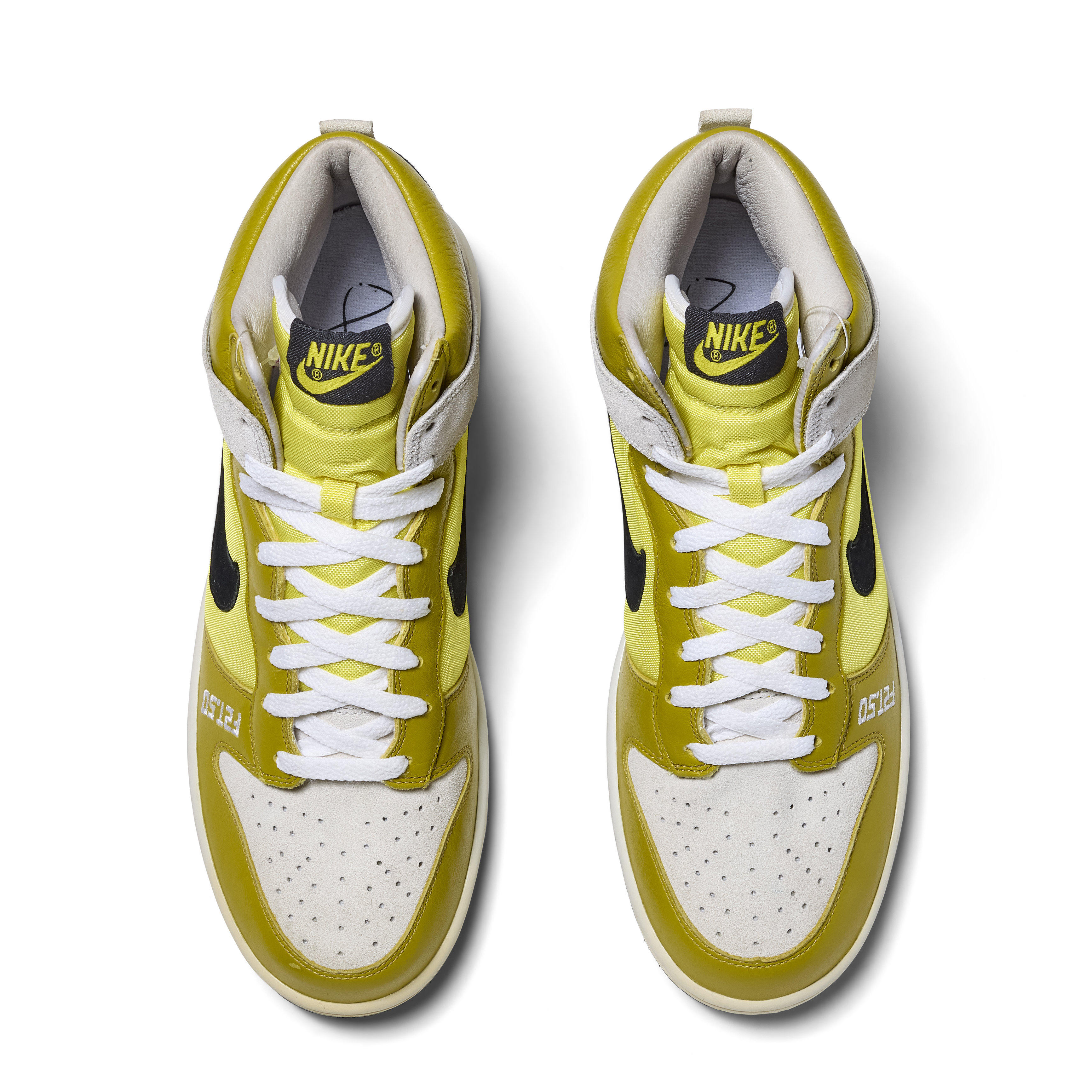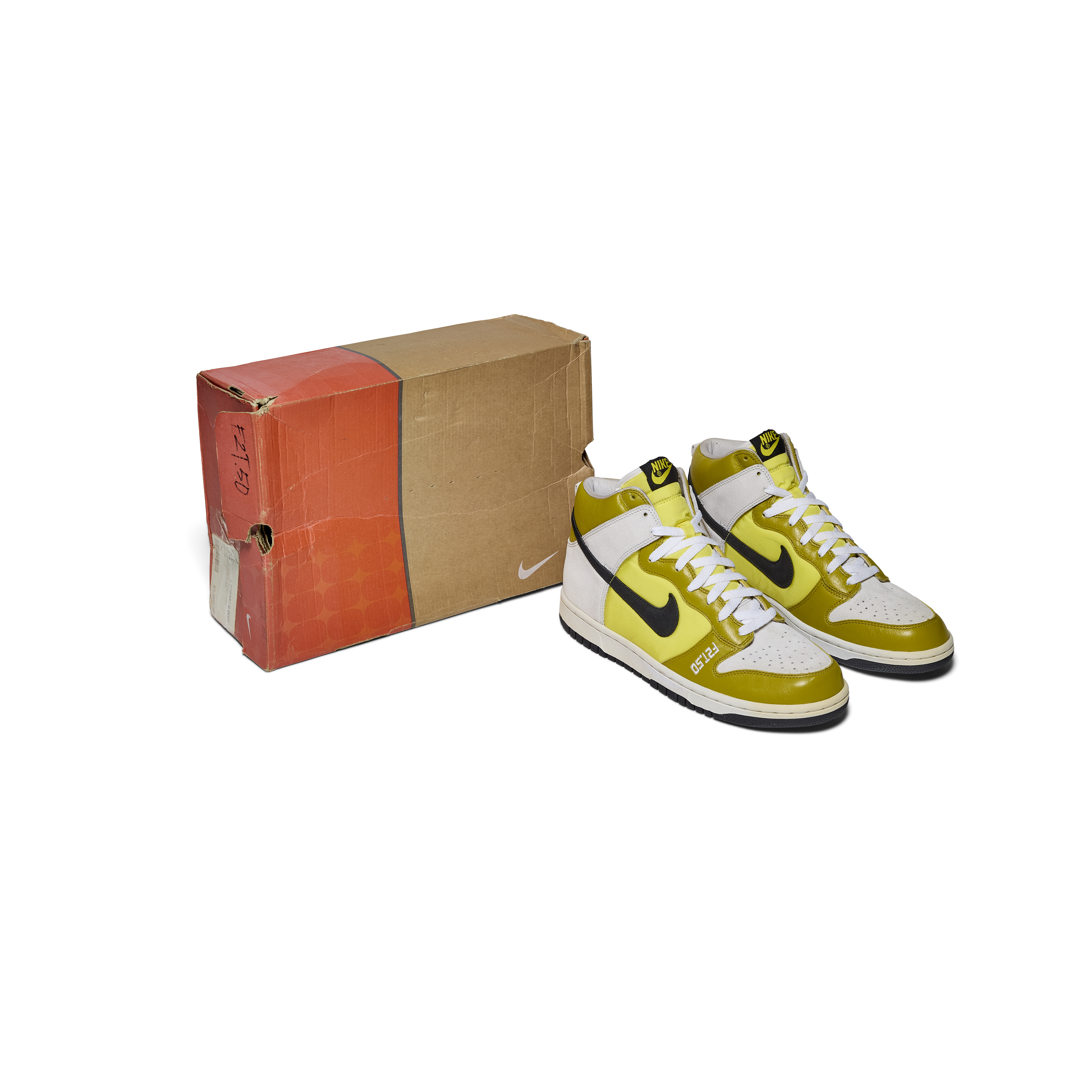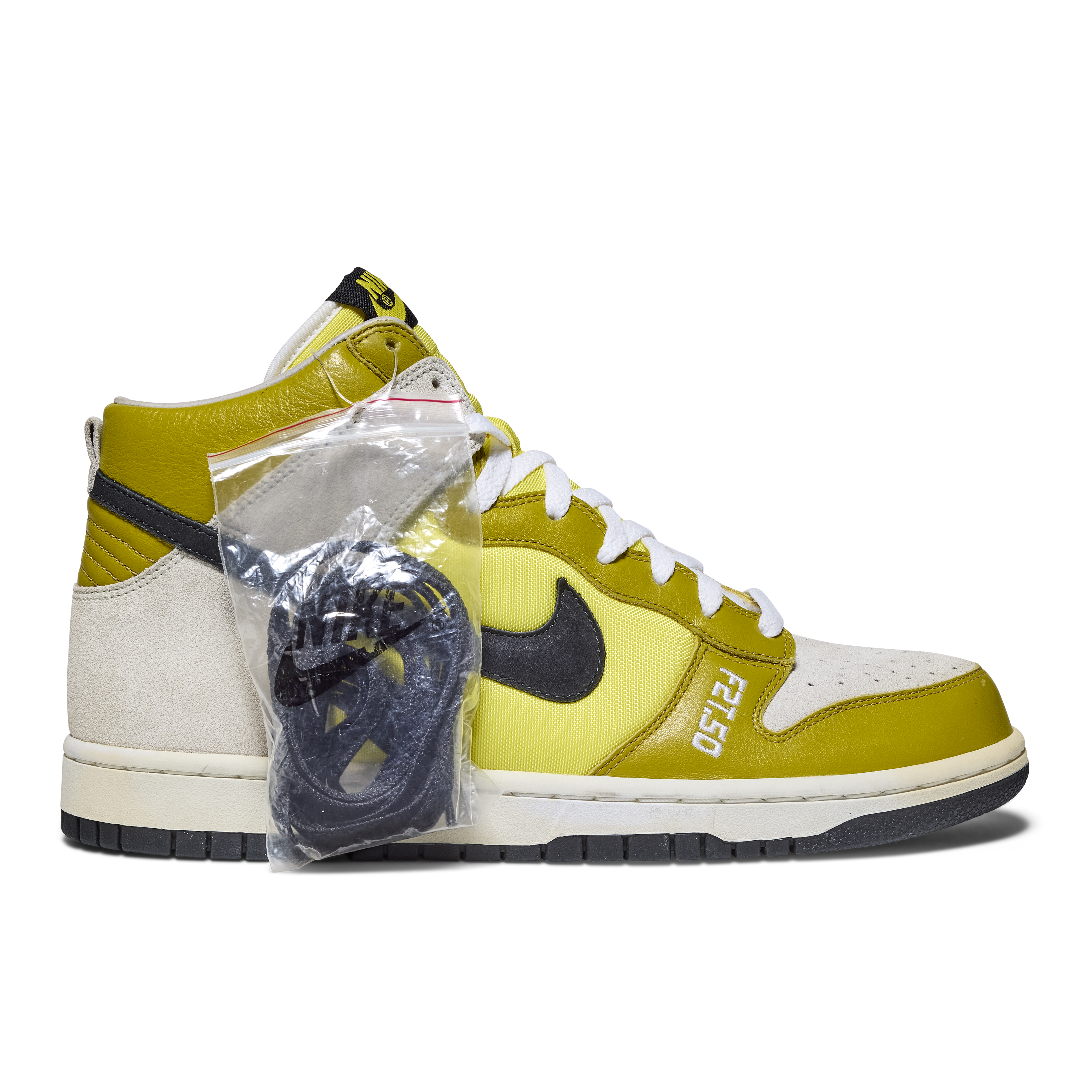 Created in 2006 to celebrate the 50th birthday of legendary graffiti artist Futura, the F2T-50 Dunk High Premium stands among the rarest Nike artist collaborations ever produced. Developed in partnership with both Futura and Stash, these Promo Confirmation Samples were never released to the public and were produced exclusively for internal use, this pair features sample tags and includes sample hangtags. The design features a white, black, and bright citron colorway executed in suede, leather, and mesh, with “F2T.50” embroidered across the uppers in tribute to Futura 2000 and his milestone year.