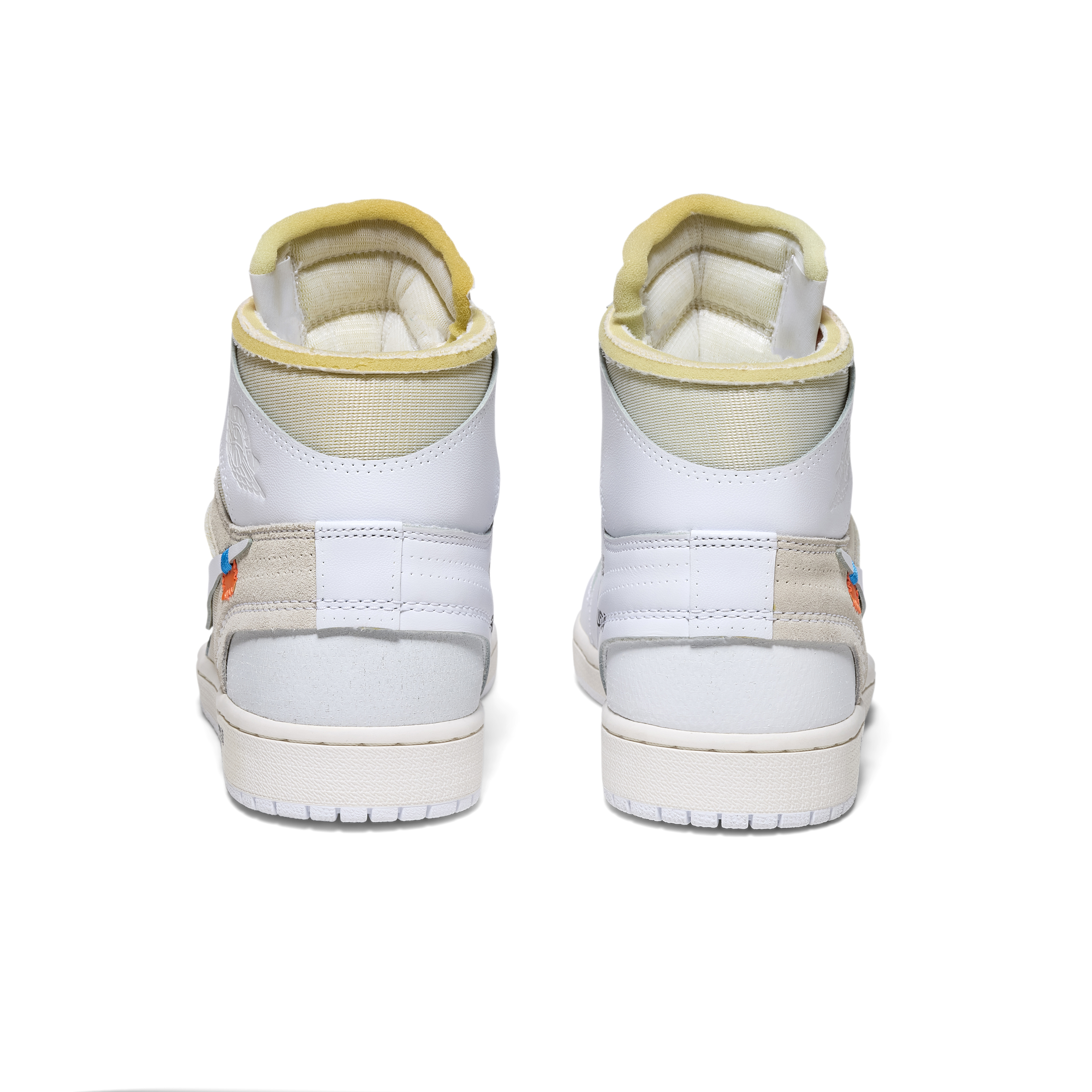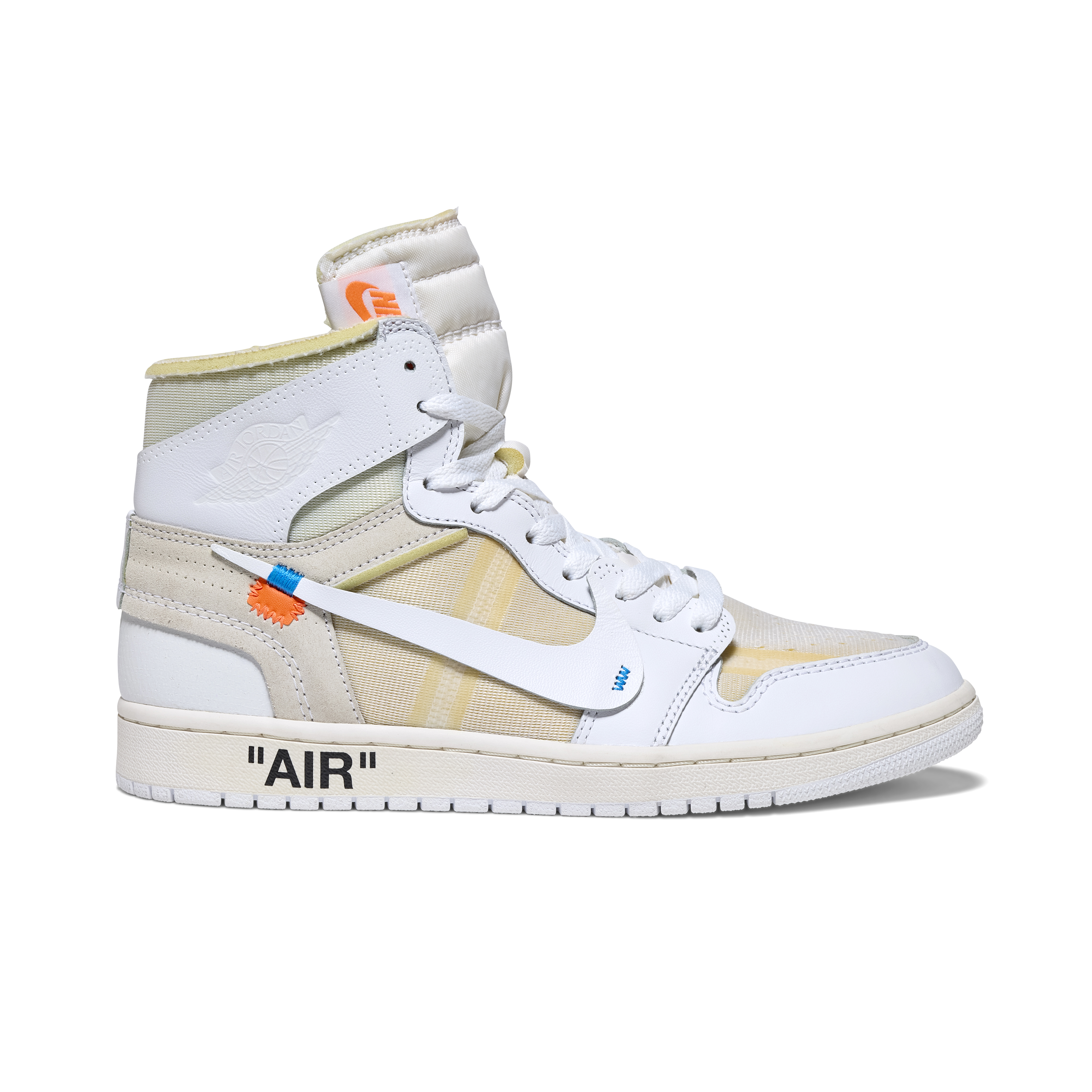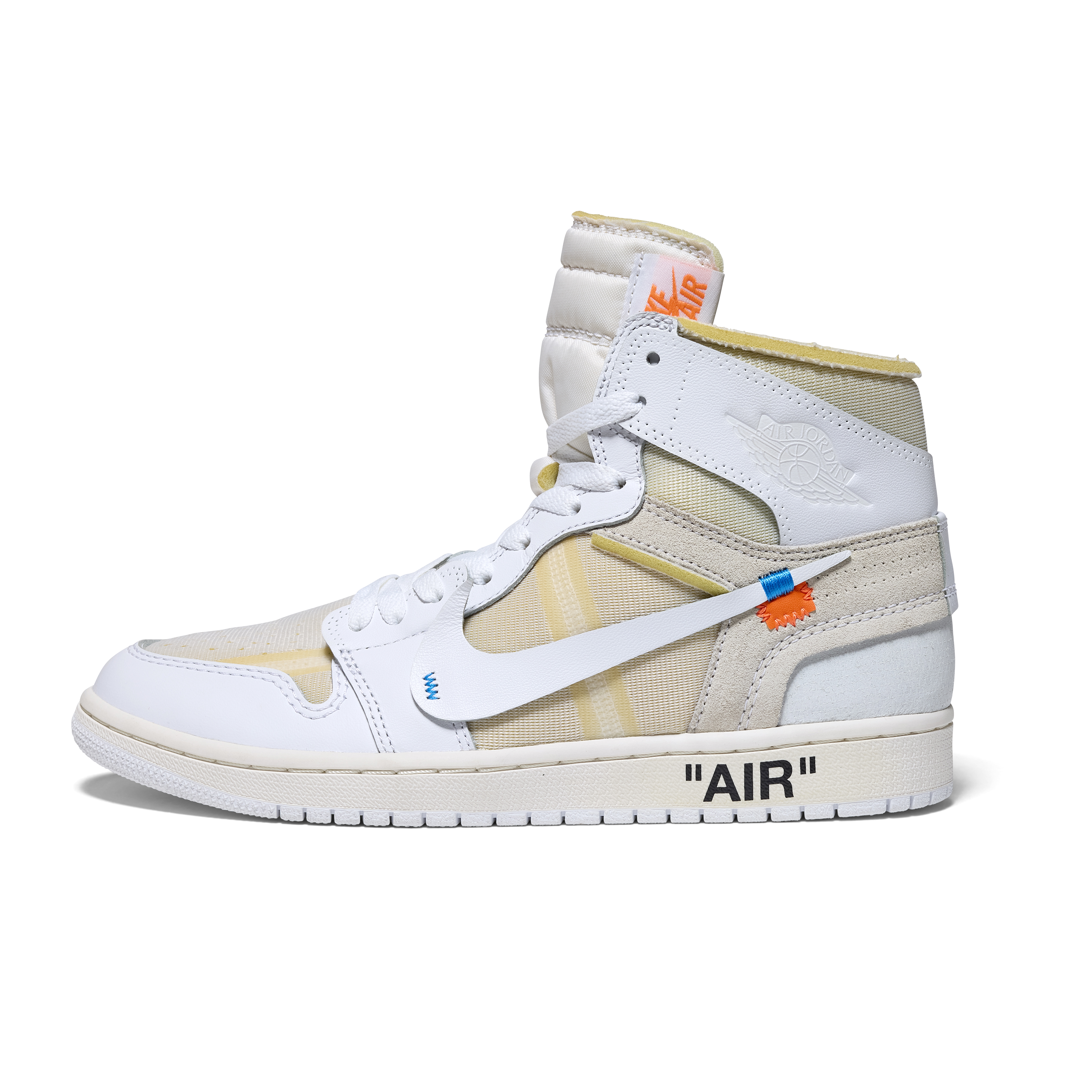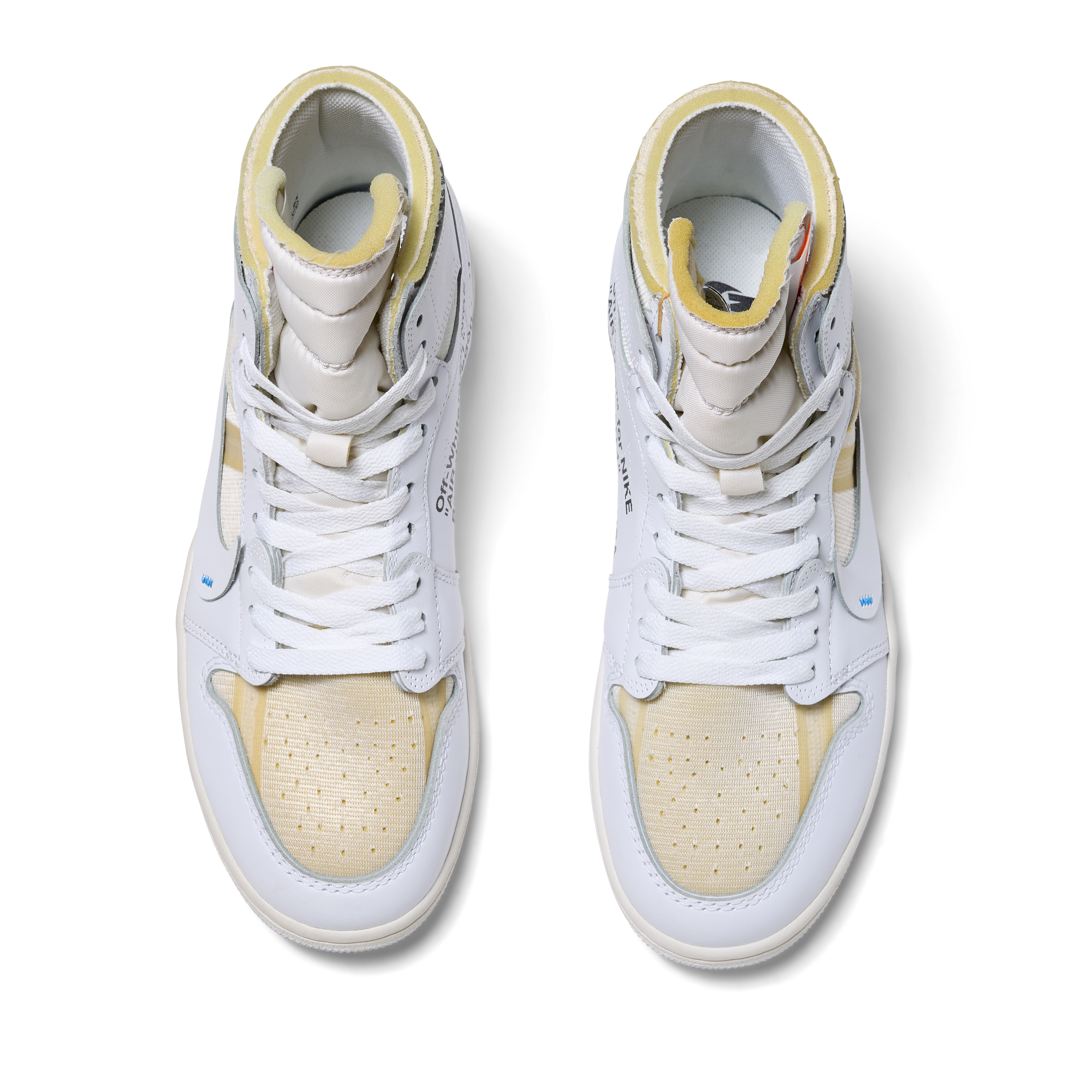 These Off-White x Air Jordan 1 NRG sneakers are highly sought-after Look See Samples from the collaboration between Nike’s Jordan Brand and Virgil Abloh’s Off-White. Predominantly white, the pair features translucent panels, exposed stitching and foam, and the signature Off-White zip-tie, all hallmarks of Abloh’s deconstructed design language. The uppers combine white leather and mesh with subtle blue and orange accents, complemented by classic Wings logos at the ankles and “AIR” printed along the midsoles.