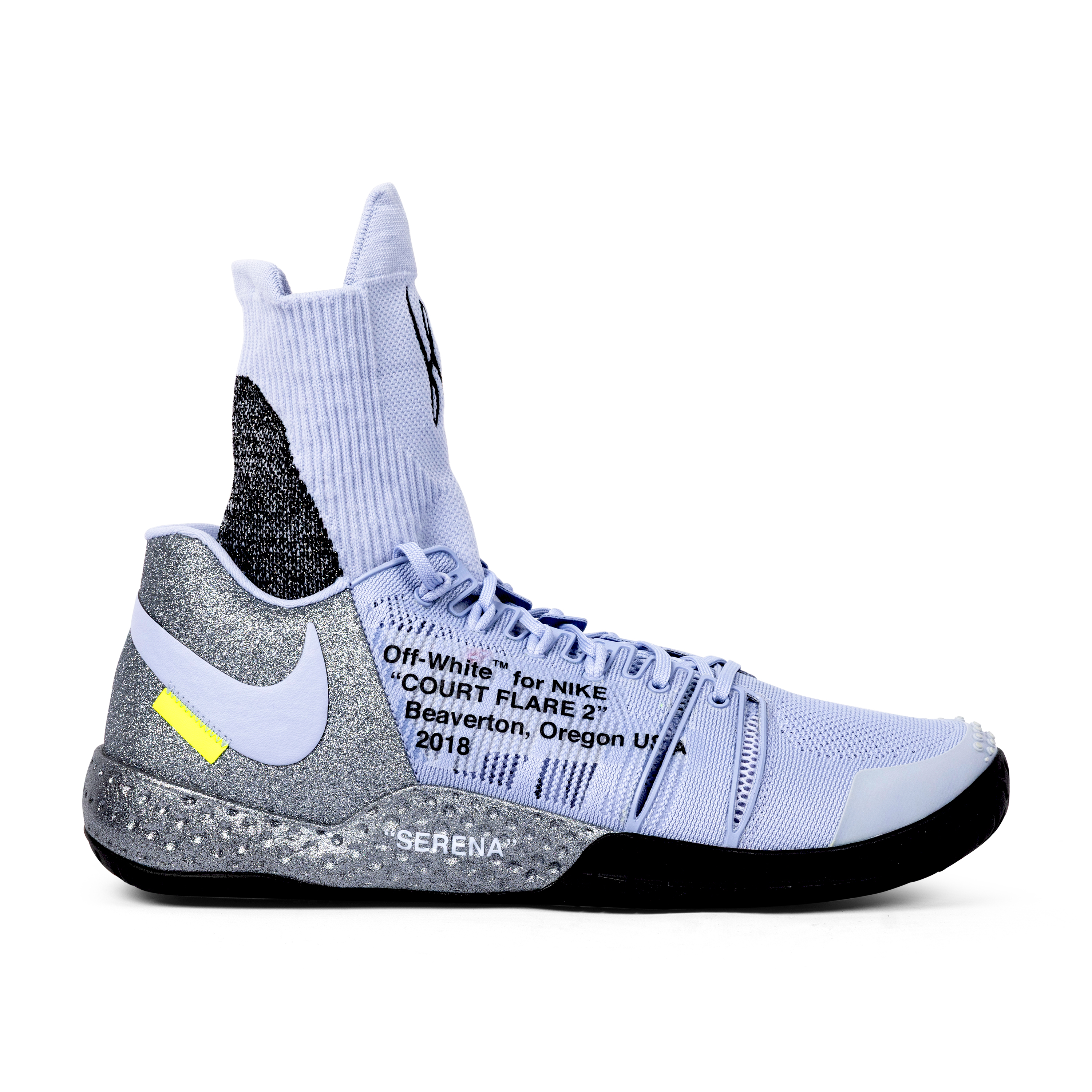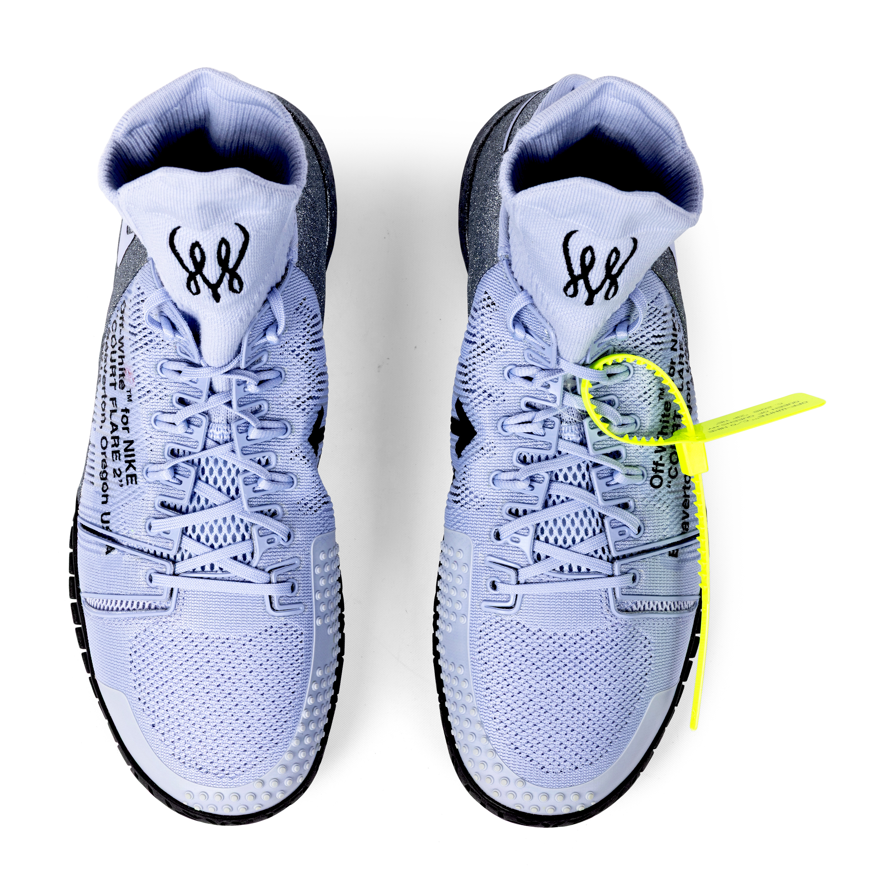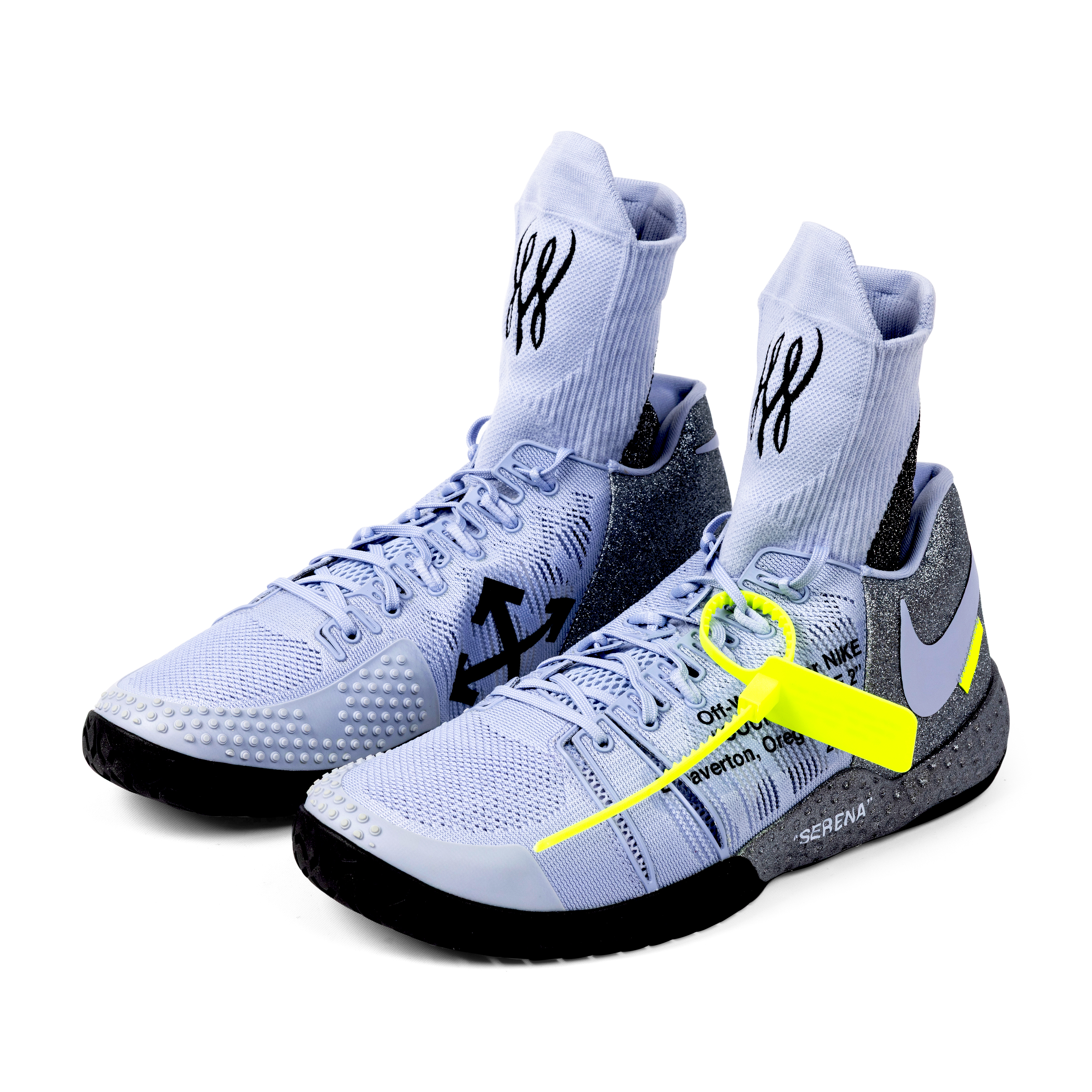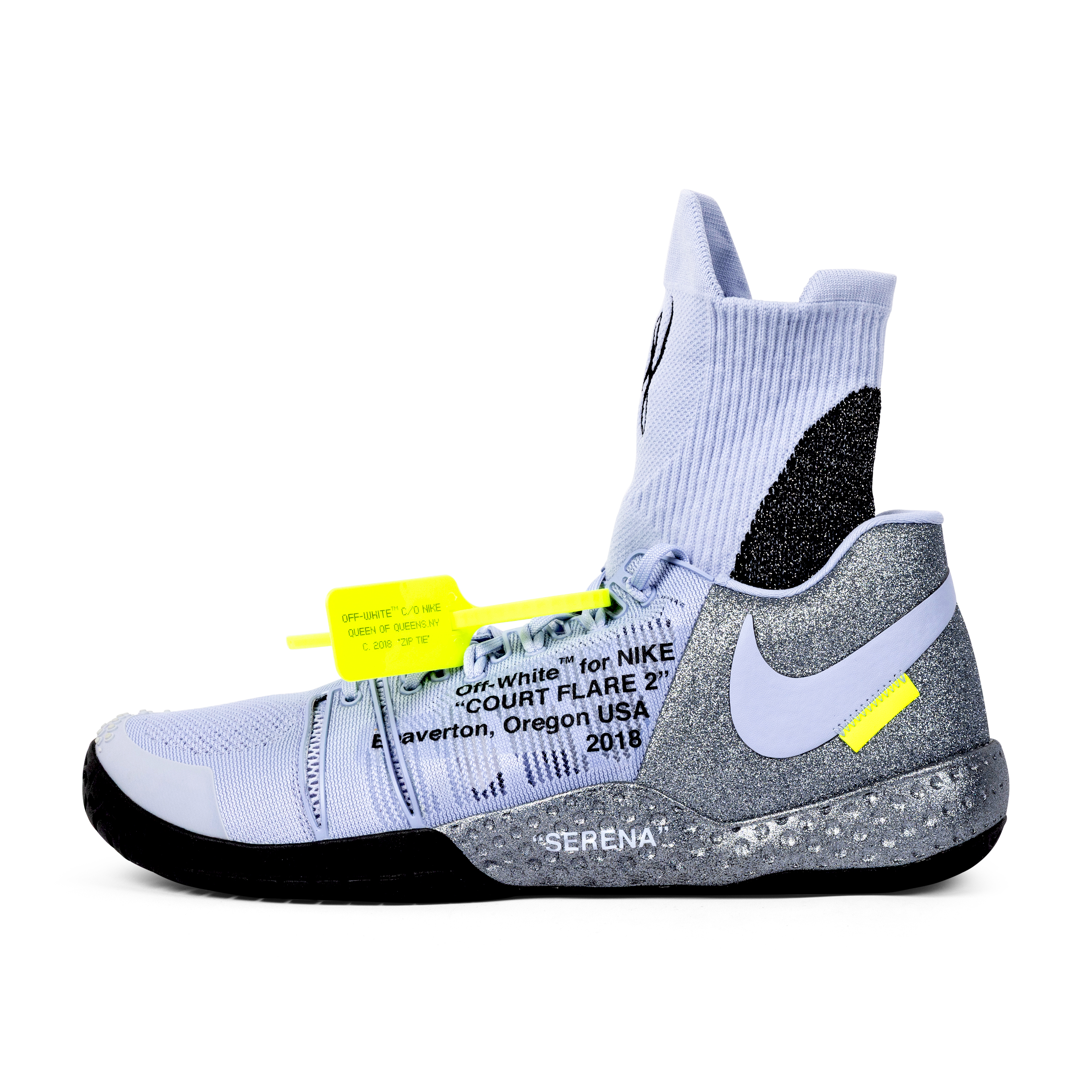 These Nike x Off-White Court Flare 2.0 shoes were created exclusively for Serena Williams as unreleased Promo Samples, produced only in her size (Women’s 11.5) and never made available to the public. Presented in grey, purple, black, and volt, the shoes feature integrated sock liners bearing Serena’s personal logos, midsoles reading “Queen” and “Serena,” and uppers marked with Off-White’s signature text: “Off-White for NIKE ‘COURT FLARE 2’ Beaverton, Oregon USA 2018.” They include the original volt Off-White zip-tie hangtag inscribed “OFF-WHITE C/O NIKE QUEEN OF QUEENS, NY C. 2018 ‘ZIP TIE’”. Exceptionally rare, this pair represents one of the most limited and elusive Off-White x Nike creations ever produced.