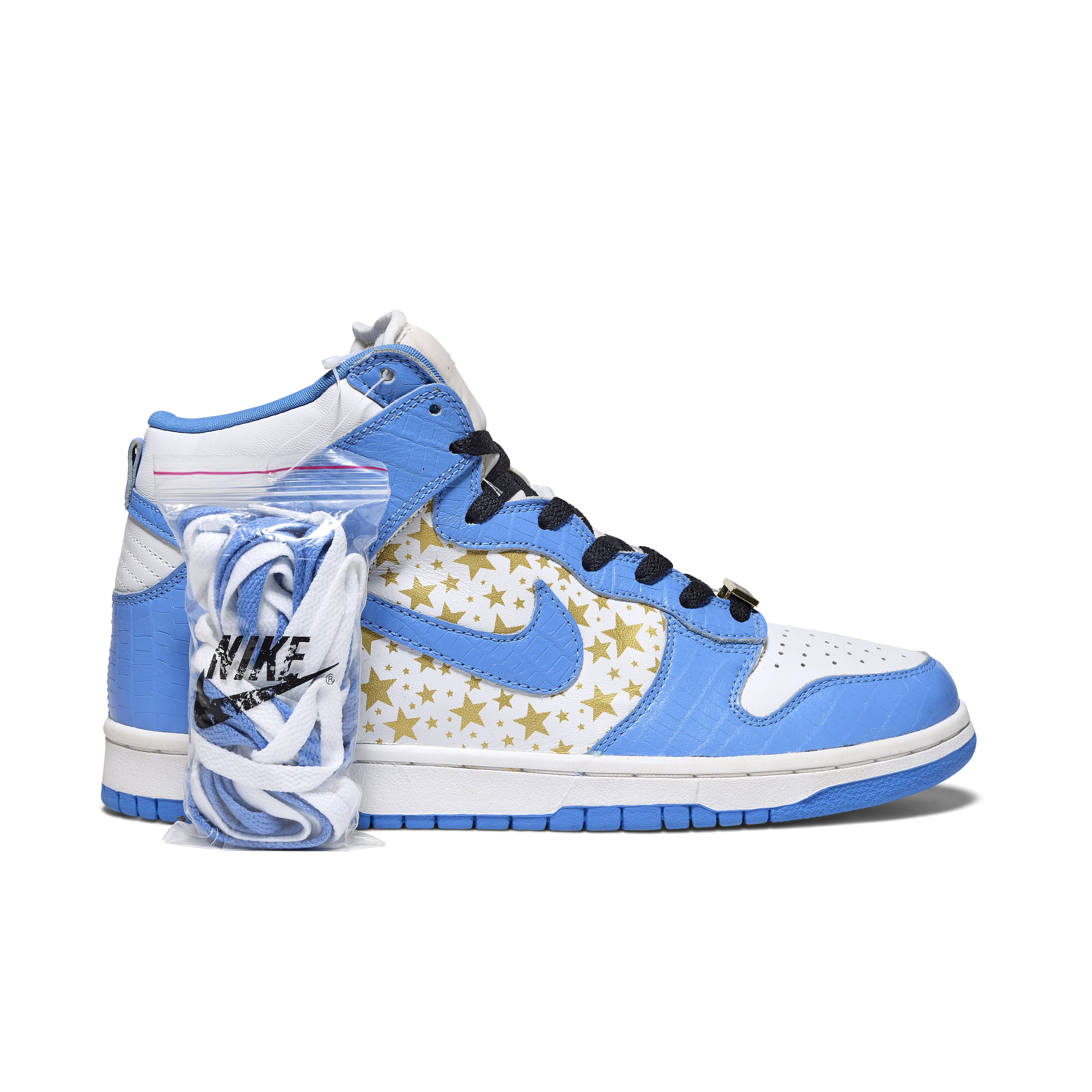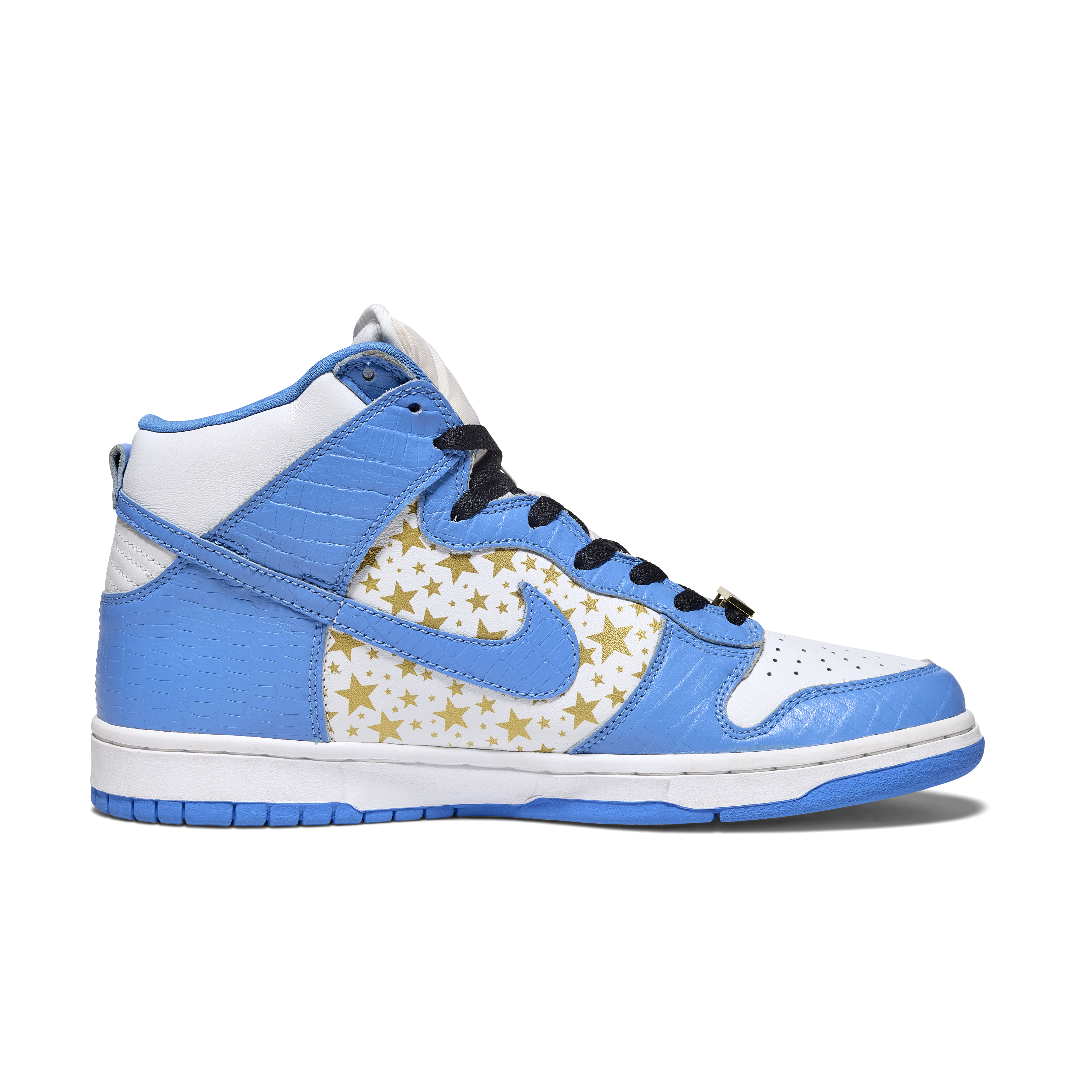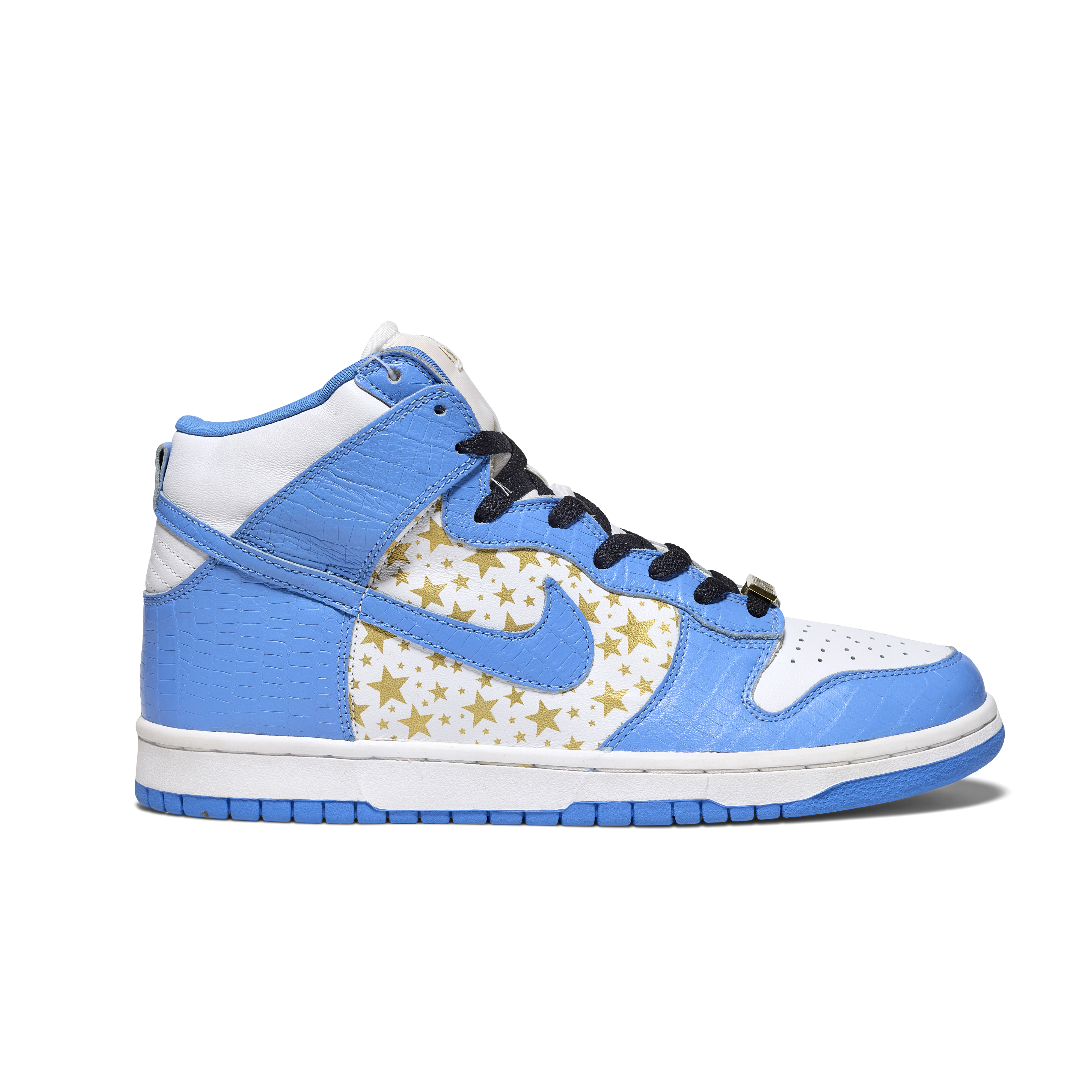 Released in 2003, these Nike Dunk High Pro SB 'Blue' were a result of a collaboration between Nike & Supreme. Released as part of a pack of three pairs of Nike Dunk High SBs (blue, orange, and red), their official colorway is White and University Blue. The Sneakers feature white uppers, with gold stars, blue faux croc overlays, and gold dubraes that say Supreme.