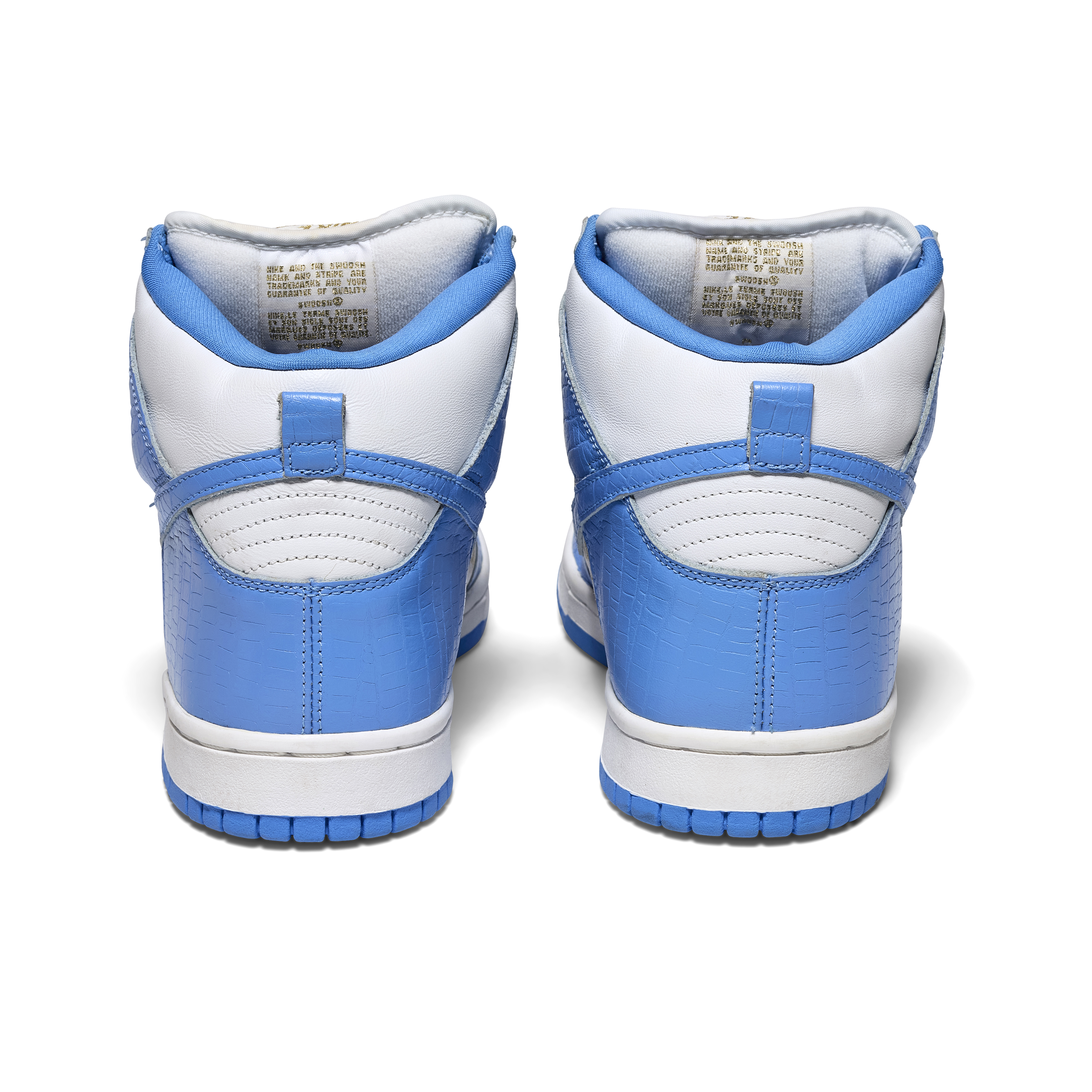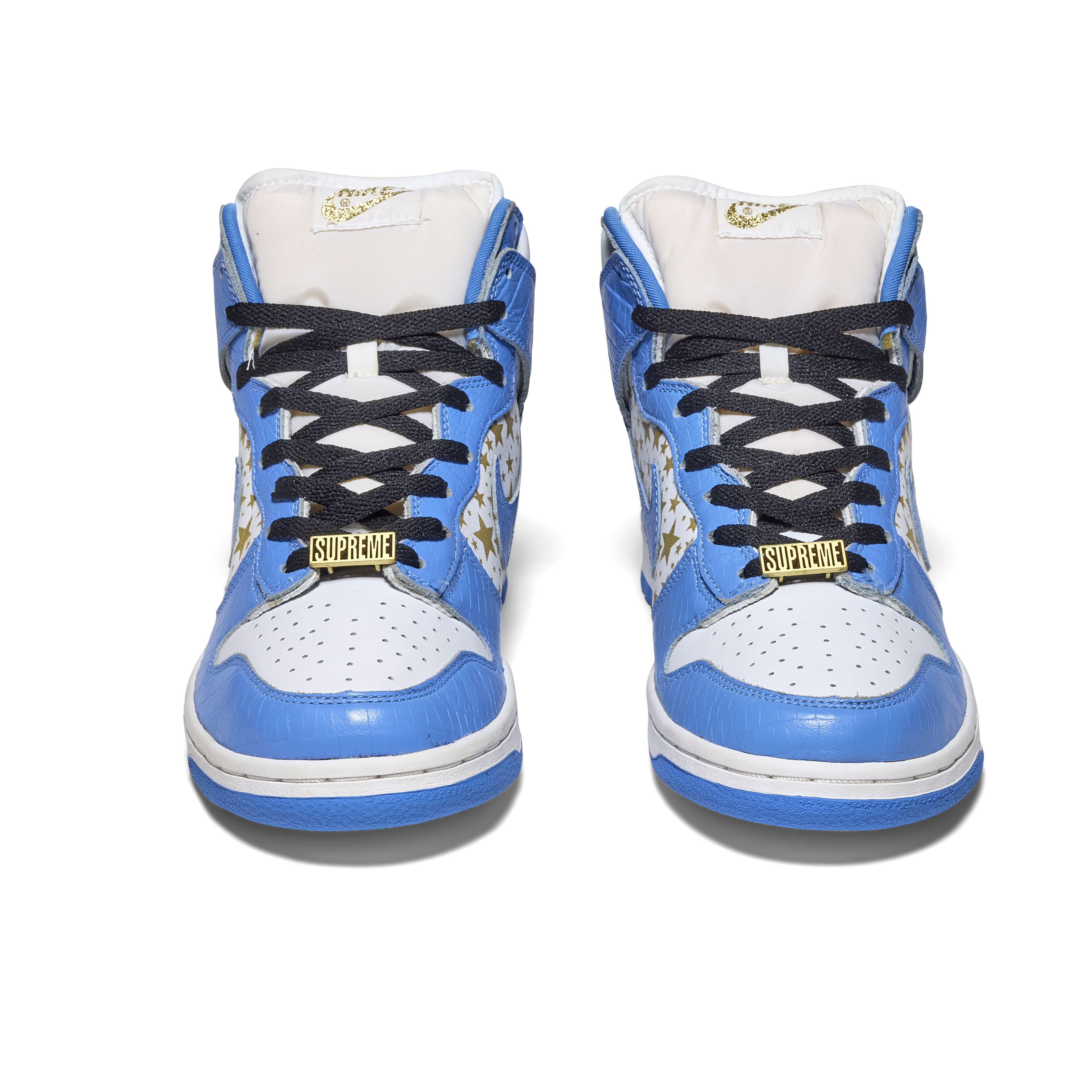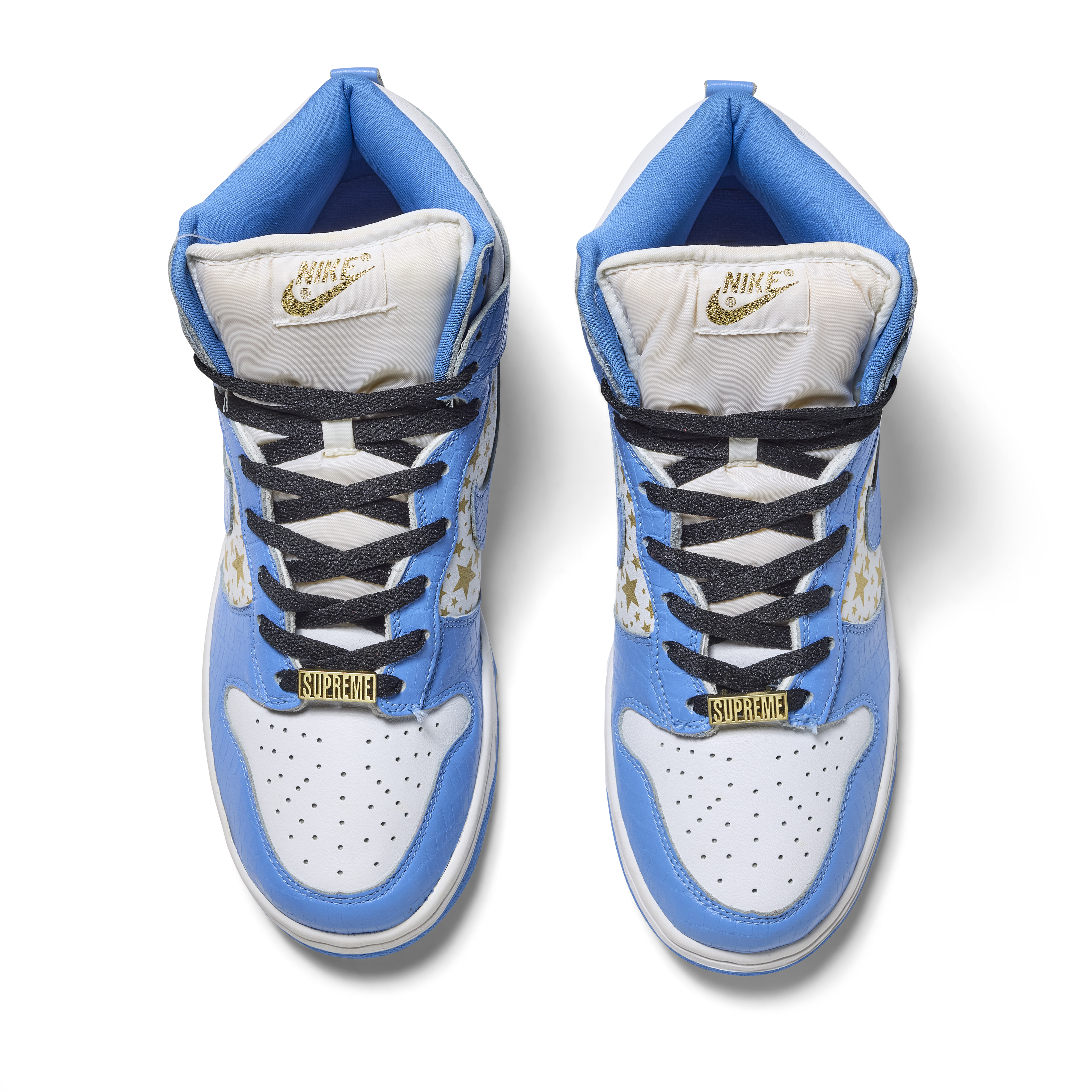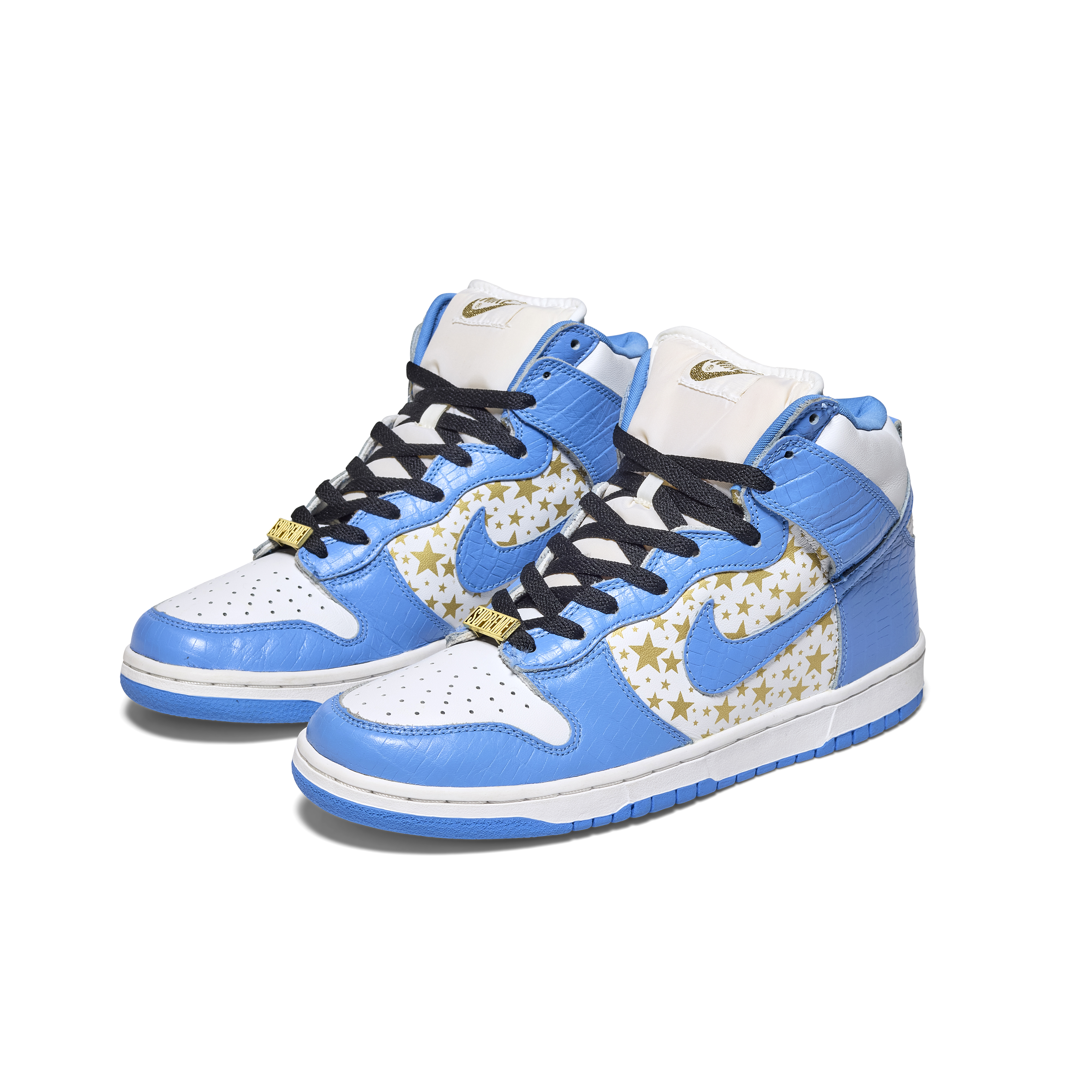 Released in 2003, these Nike Dunk High Pro SB 'Blue' were a result of a collaboration between Nike & Supreme. Released as part of a pack of three pairs of Nike Dunk High SBs (blue, orange, and red), their official colorway is White and University Blue. The Sneakers feature white uppers, with gold stars, blue faux croc overlays, and gold dubraes that say Supreme.