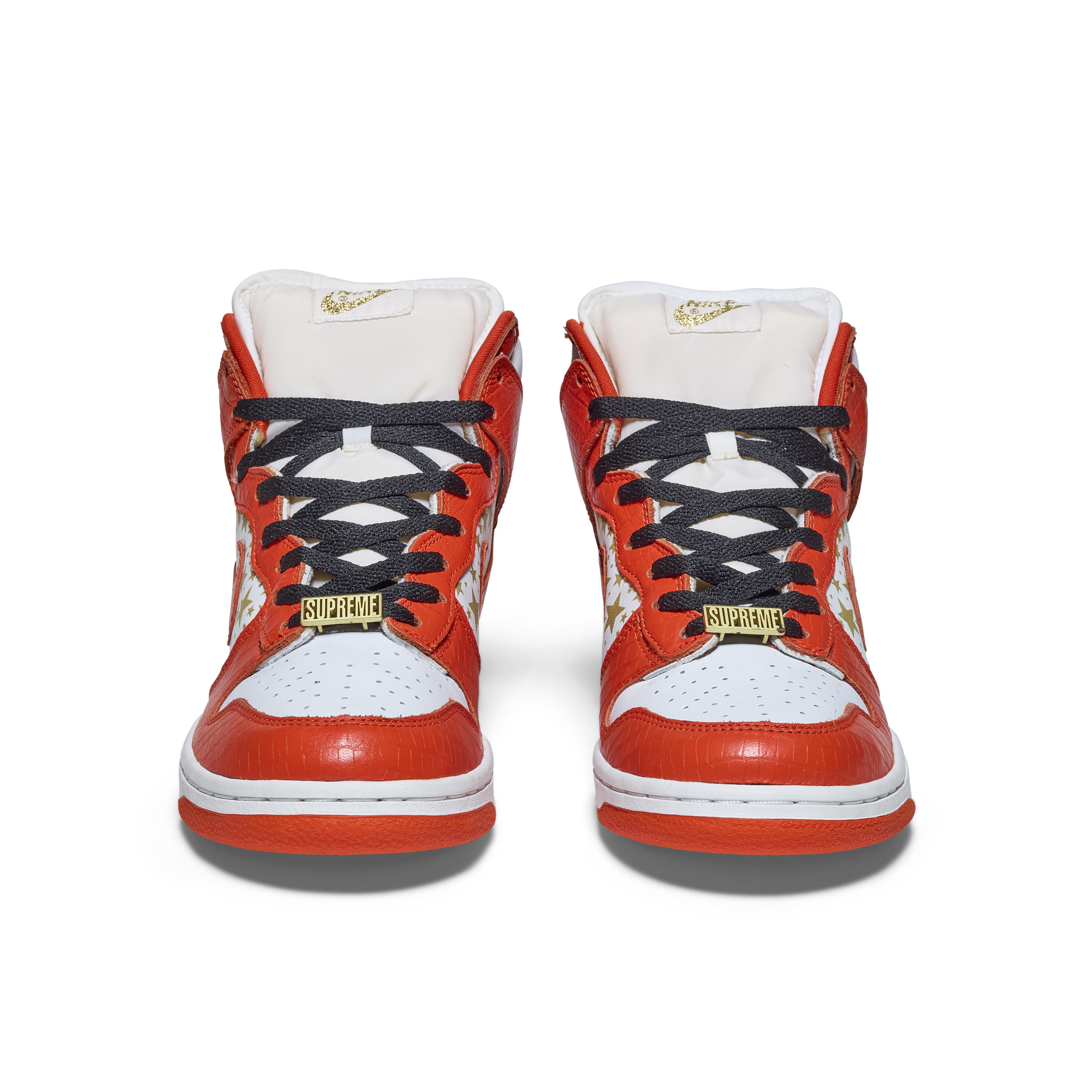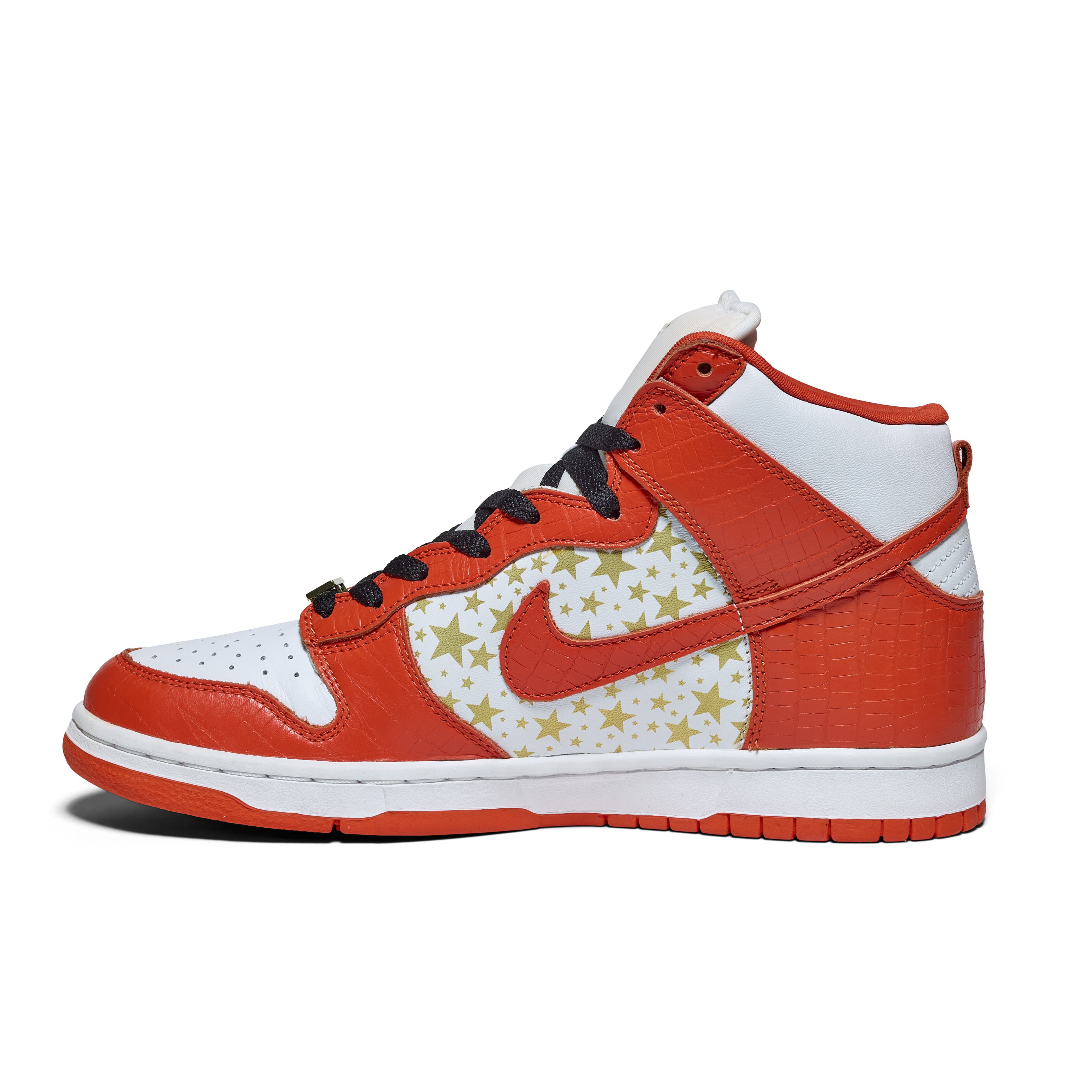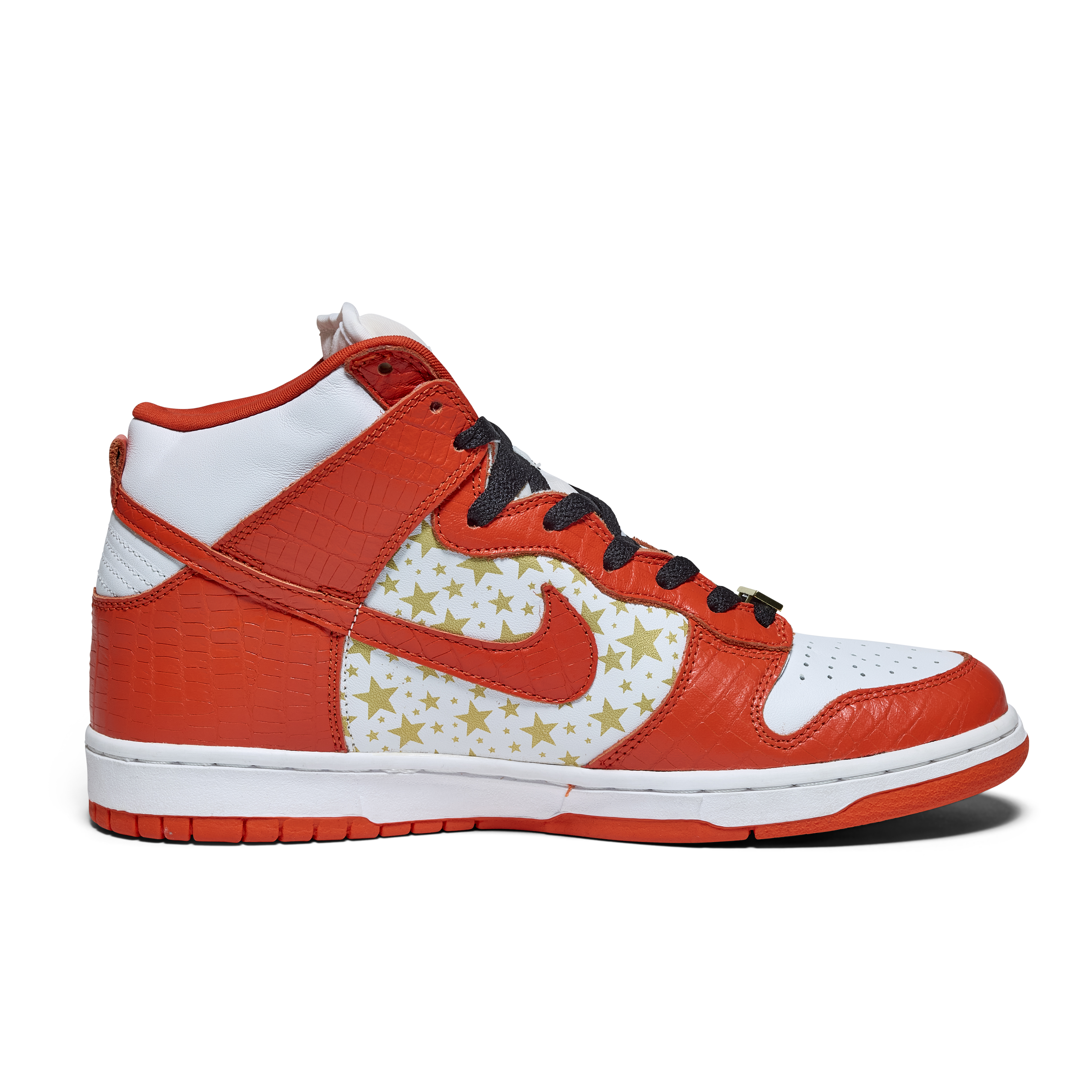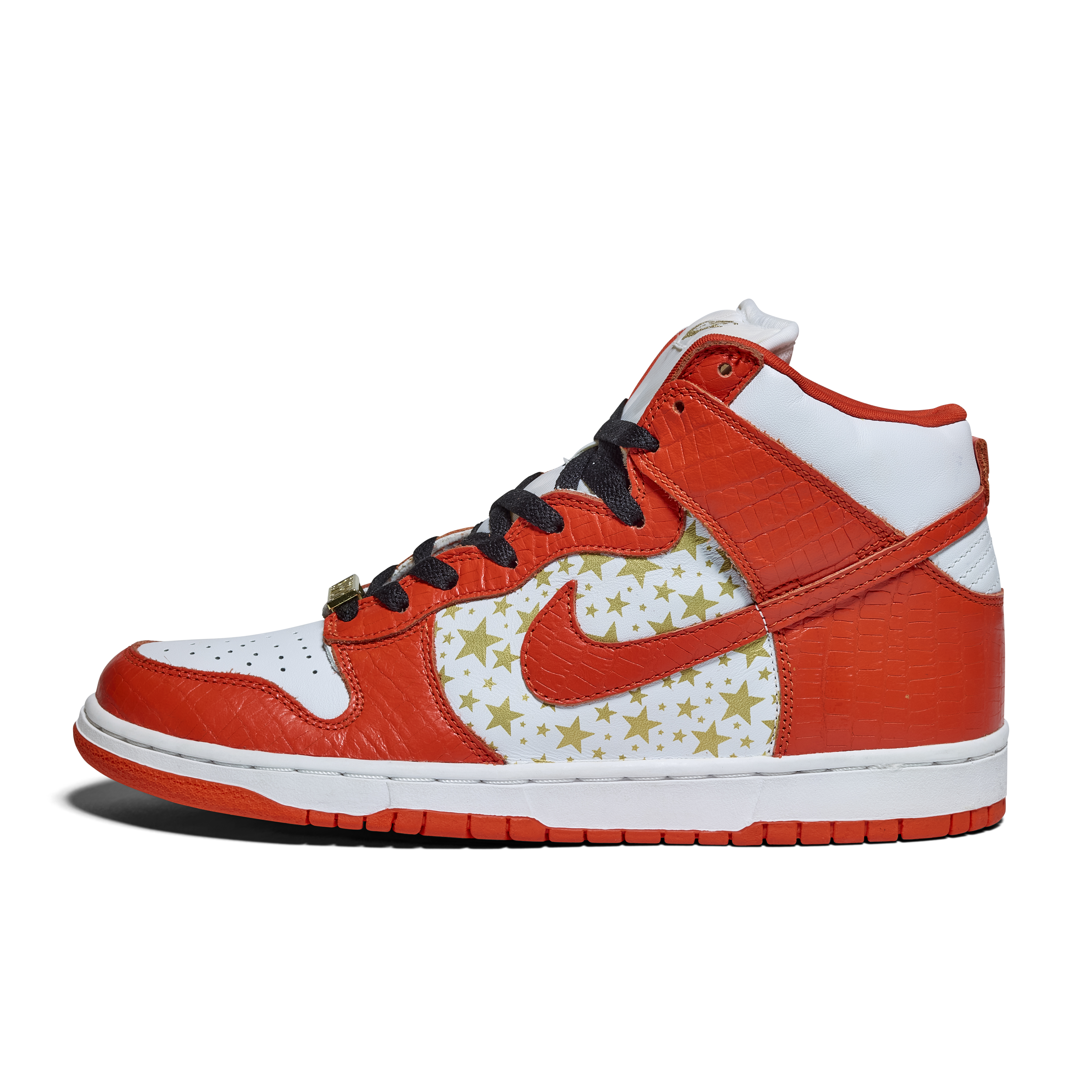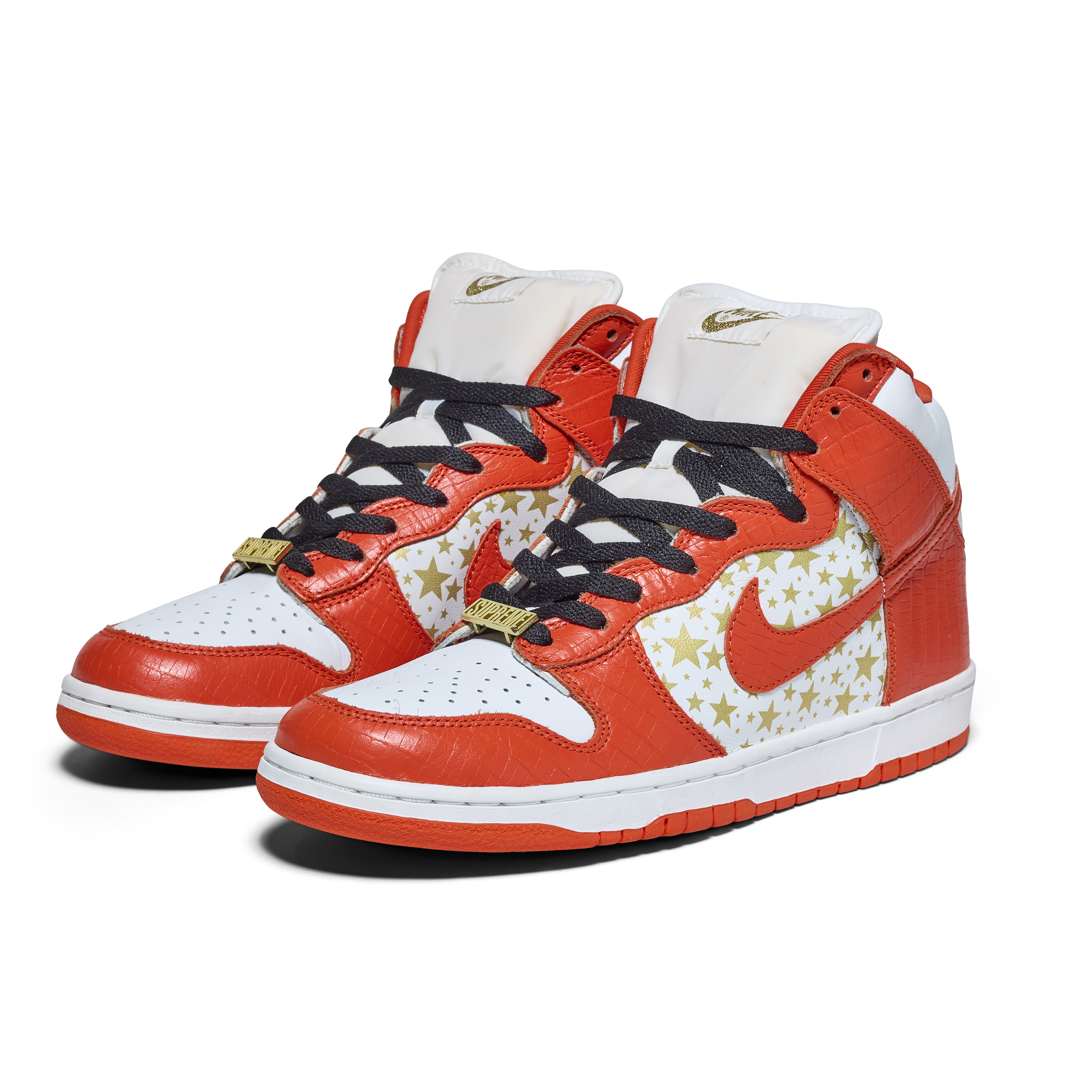 Released in 2003, these Nike Dunk High Pro SB 'Orange' were a result of a collaboration between Nike & Supreme. Released as part of a pack of three pairs of Nike Dunk High SBs (blue, orange, and red), their official colorway is White and College Orange. The Sneakers feature white uppers with gold stars, orange faux croc overlays, and gold dubraes that say Supreme.
