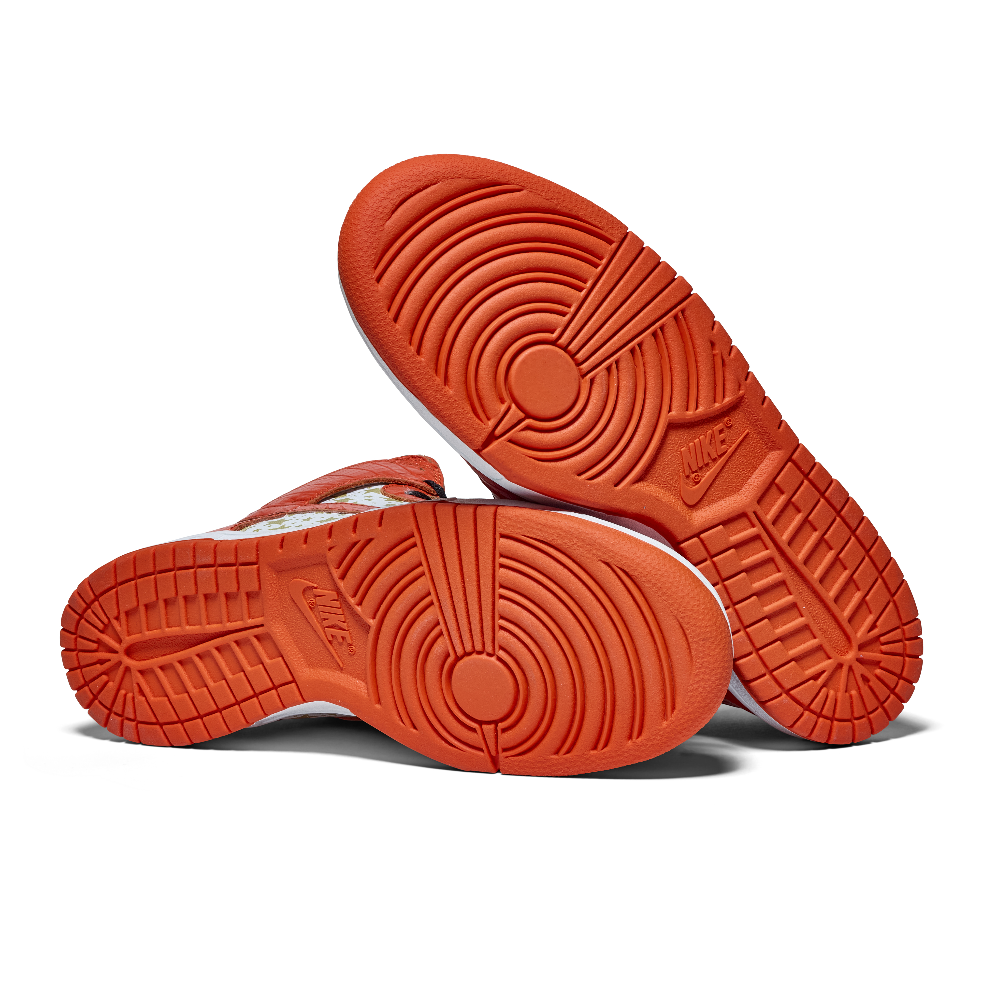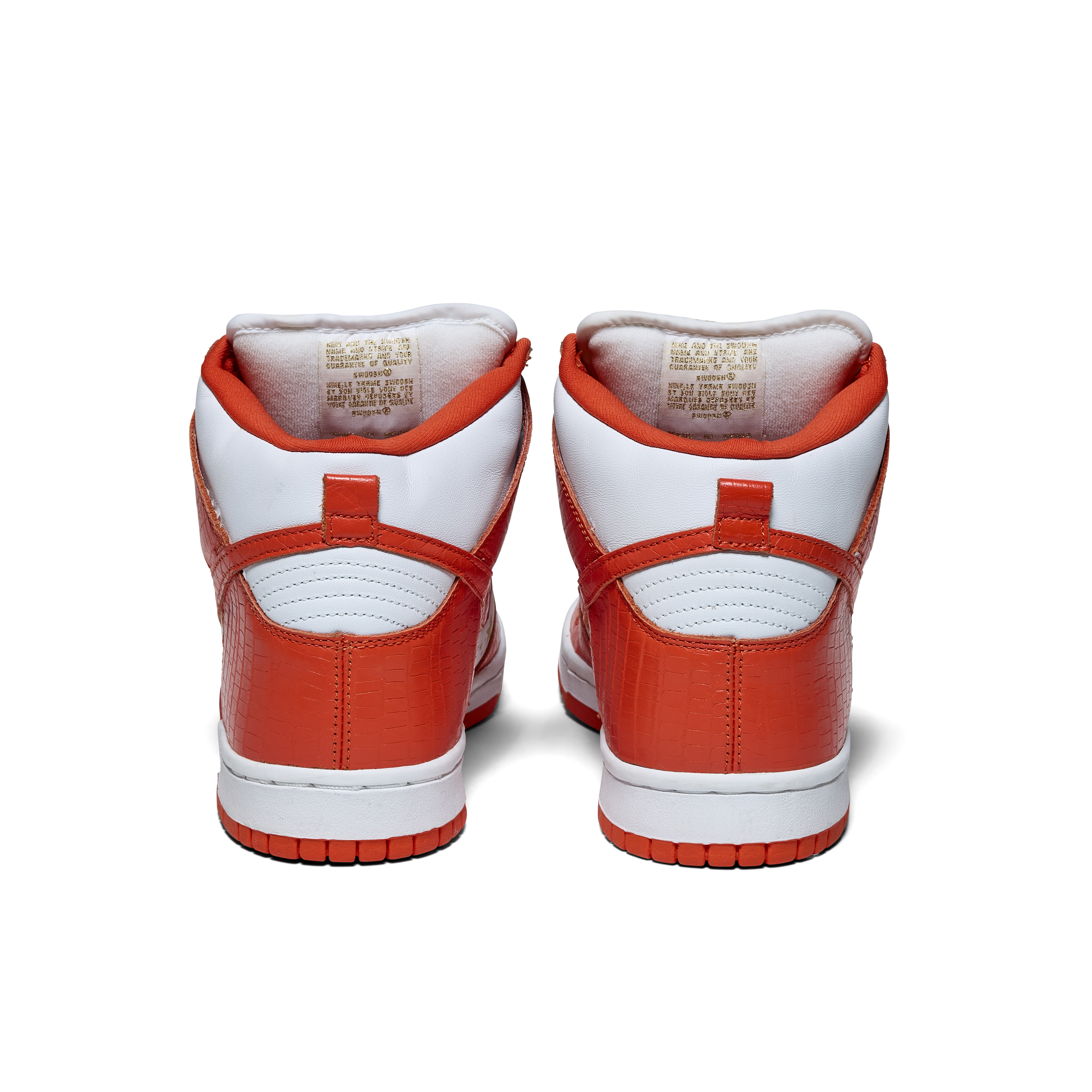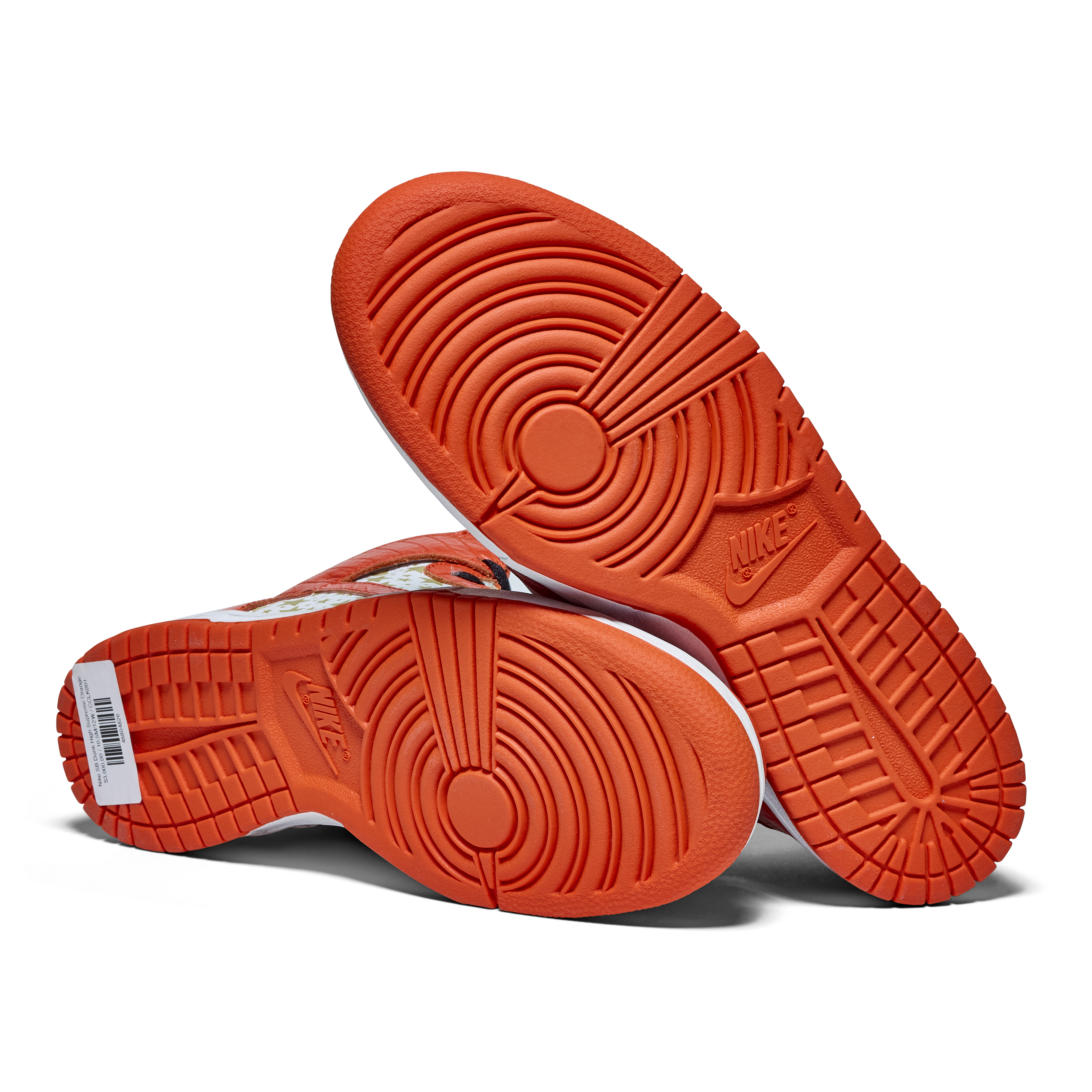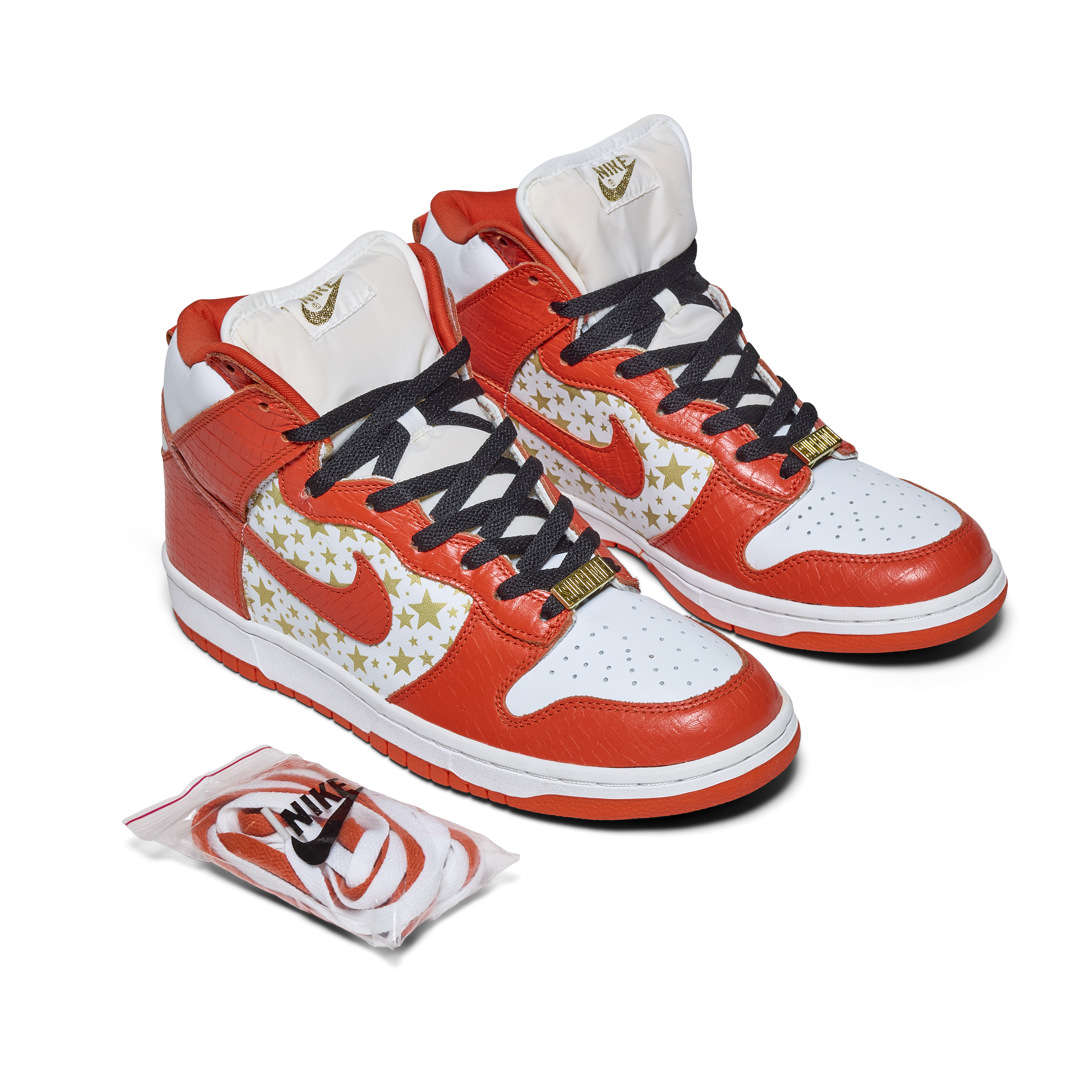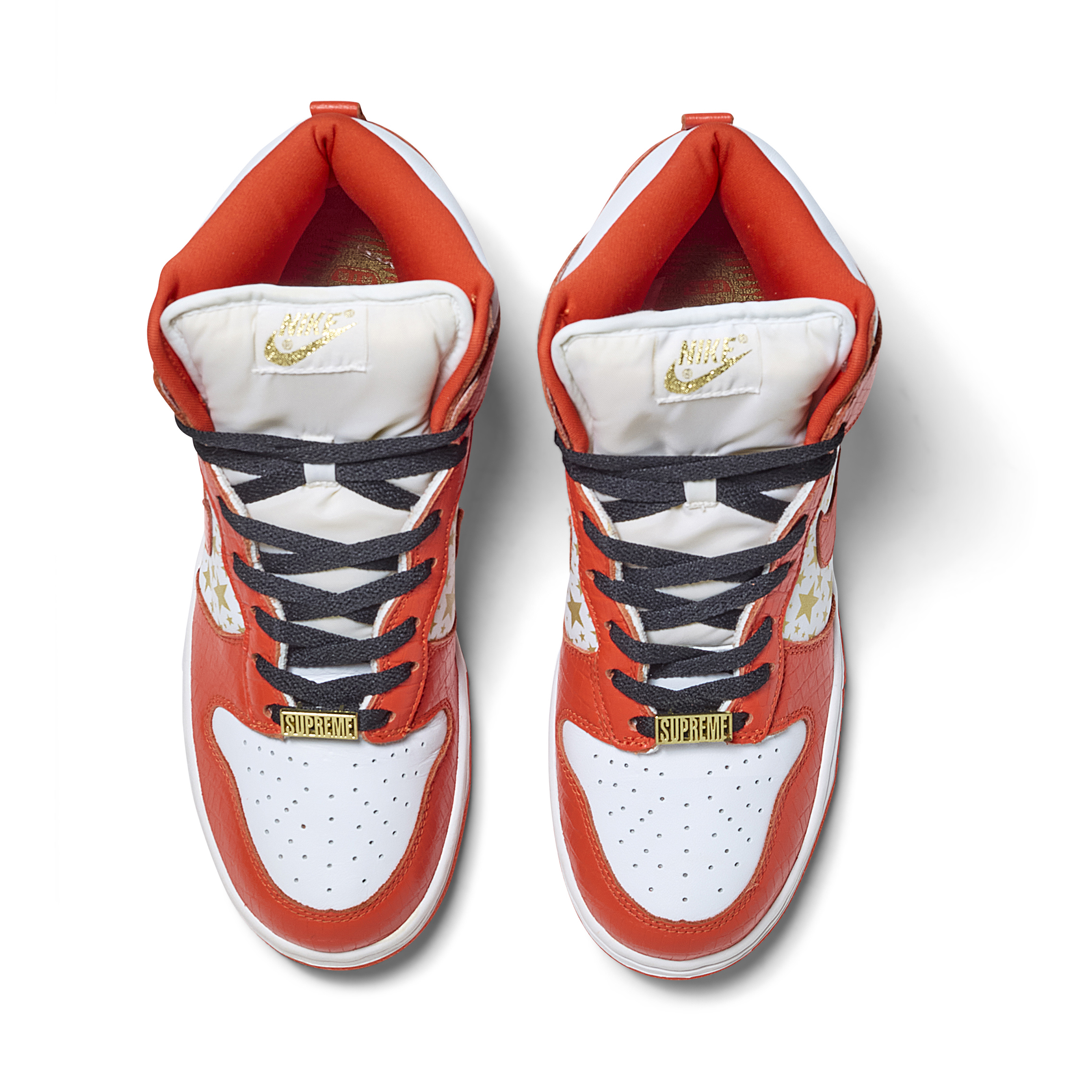 Released in 2003, these Nike Dunk High Pro SB 'Orange' were a result of a collaboration between Nike & Supreme. Released as part of a pack of three pairs of Nike Dunk High SBs (blue, orange, and red), their official colorway is White and College Orange. The Sneakers feature white uppers with gold stars, orange faux croc overlays, and gold dubraes that say Supreme.