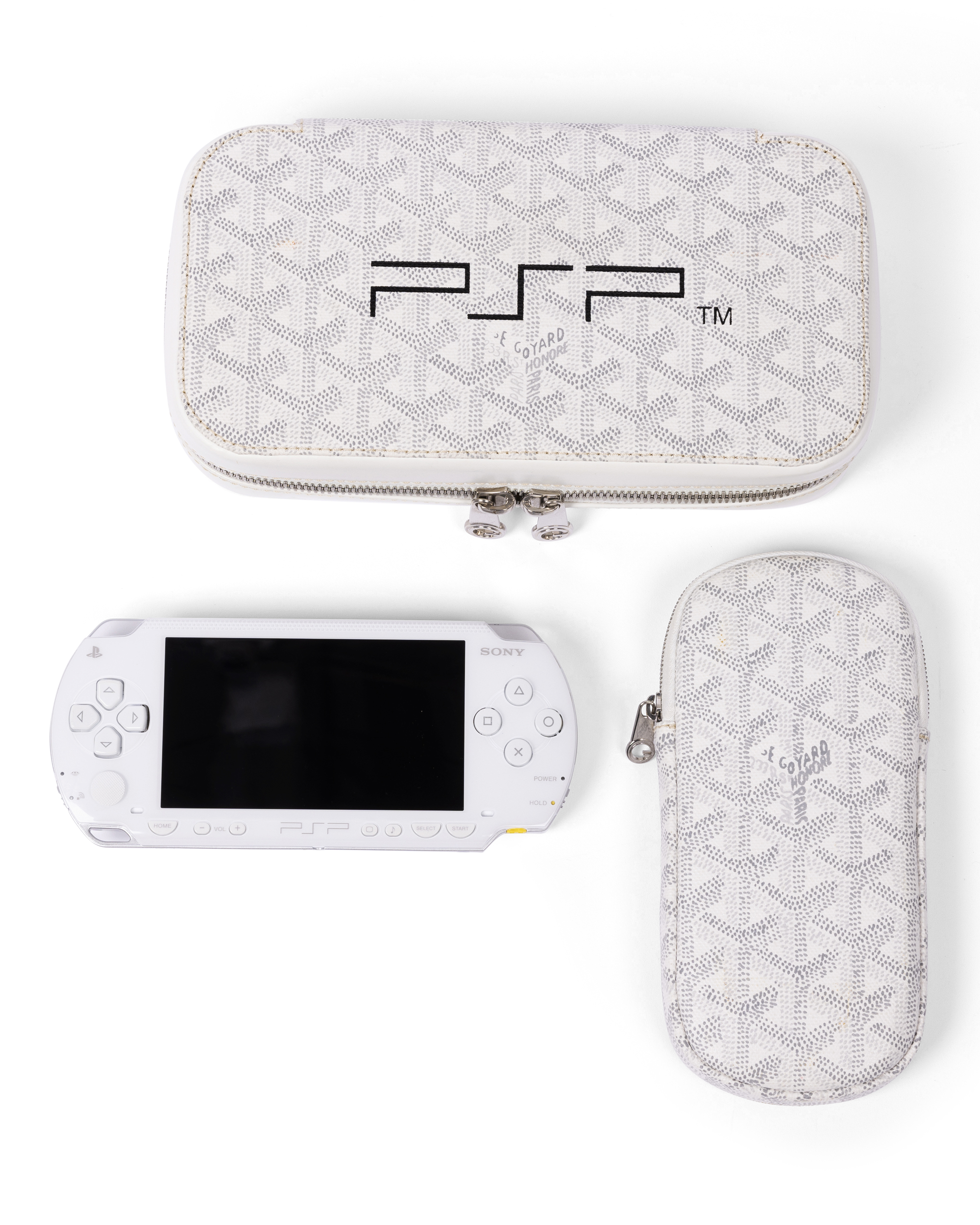 2000年代初頭のことだ。NIGOはラグジュアリーなものすべてに目を向け、その収集眼で、希少でユニーク、カスタマイズされたゴヤールの印象的なコレクションを集め始めた。 PSP用にカスタマイズされたこの白いゴヤールディン・ケースには、ケース内に小型のトラベルケース、Star Wars Battlefront IIのディスク、パンフレットが付属する。PSPにはバッテリーが含まれていない。 このユニークでラグジュアリーなケースは、サラ・アンデルマンが依頼し、パリのコレットで販売されたPSPケースの限定コレクションにインスパイアされ、カスタムオーダーされたものだ。