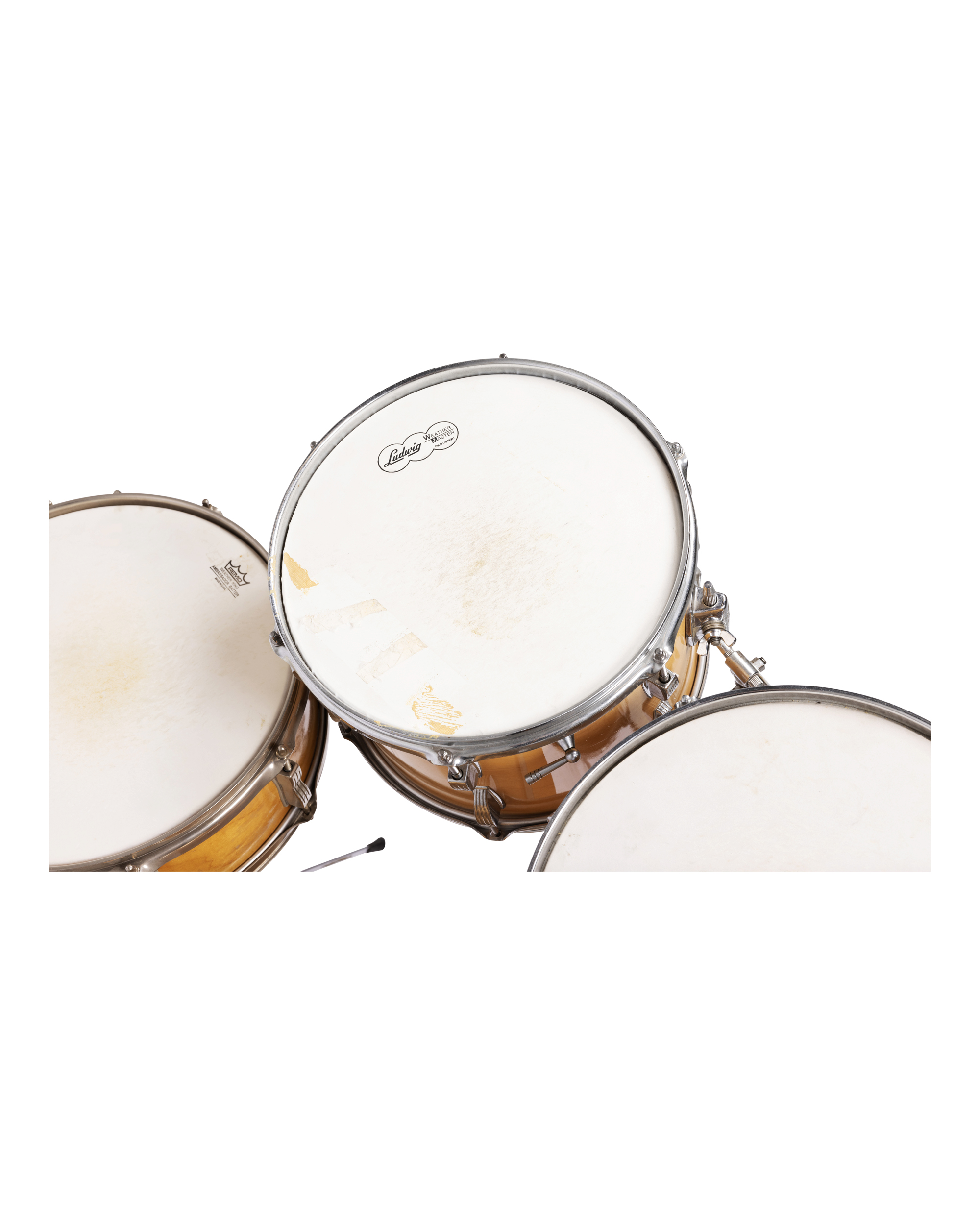このロットには、パールが日本で製作した各ドラムのカスタム・オリジナル・ケース、オリジナルのルートヴィヒ・スタンド、取り付け金具、ベース・ペダル、ドラム5台が付属する。