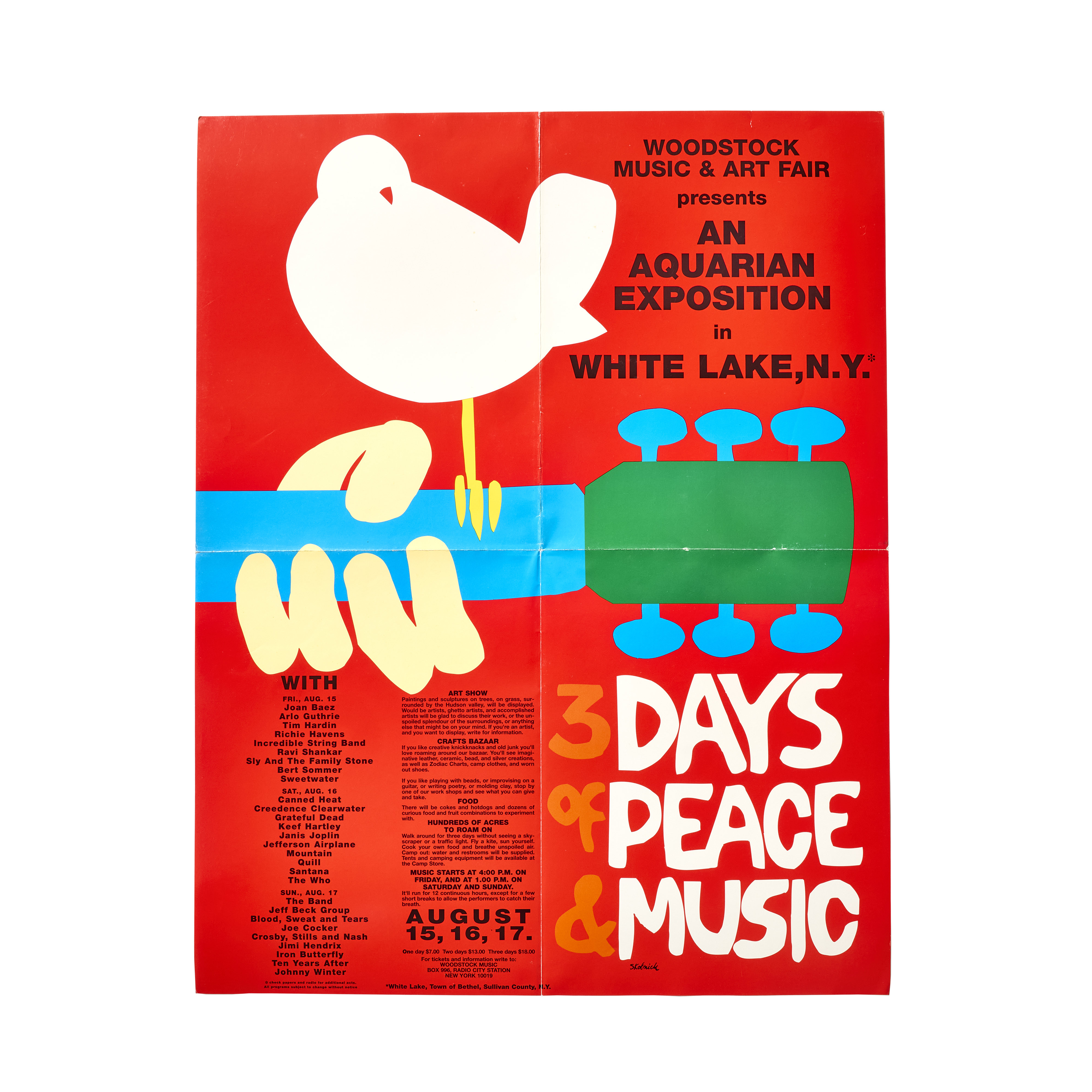 The poster’s design not only advertised the event but also relayed the spirit of the age with the bird on the guitar neck symbolising the power of peace and music.