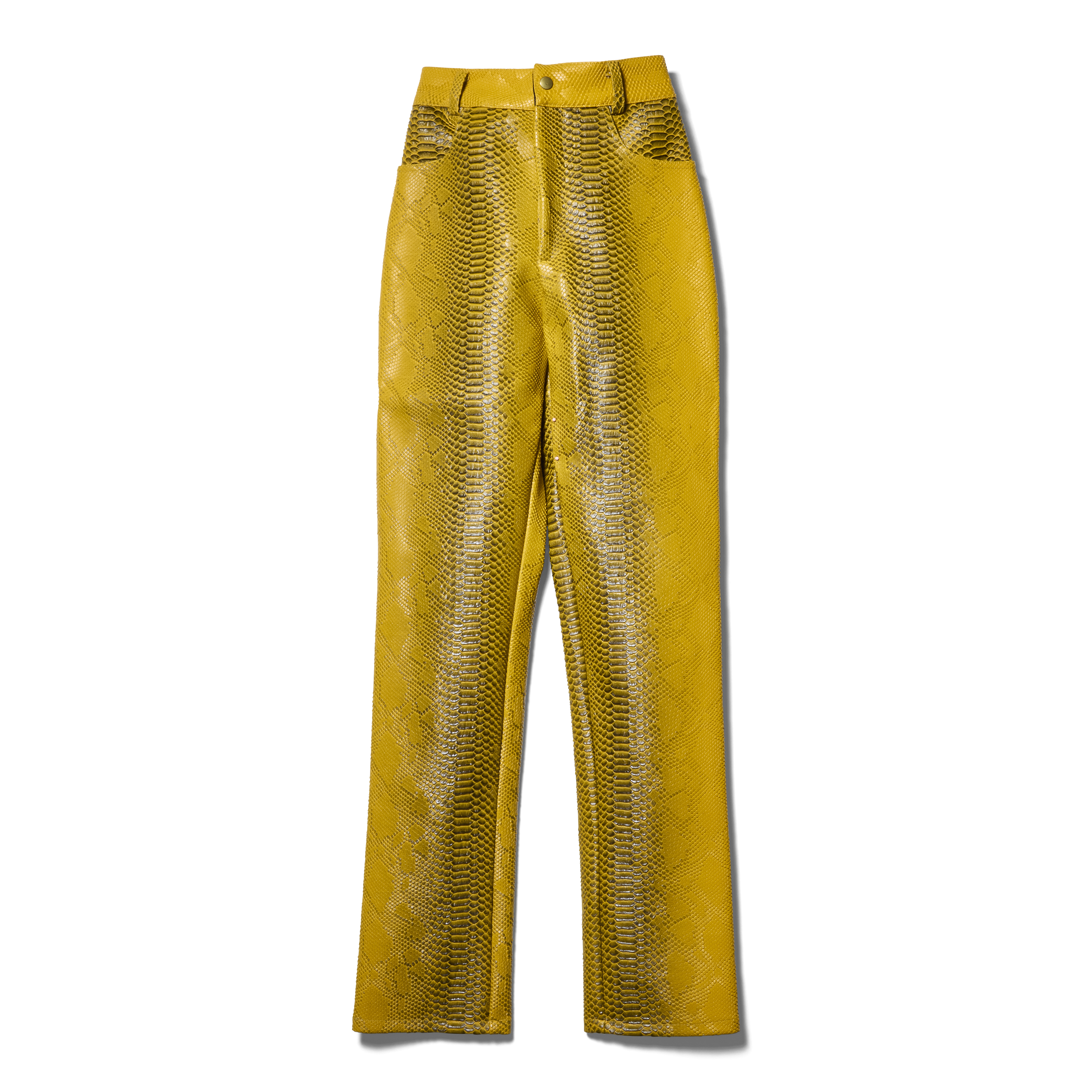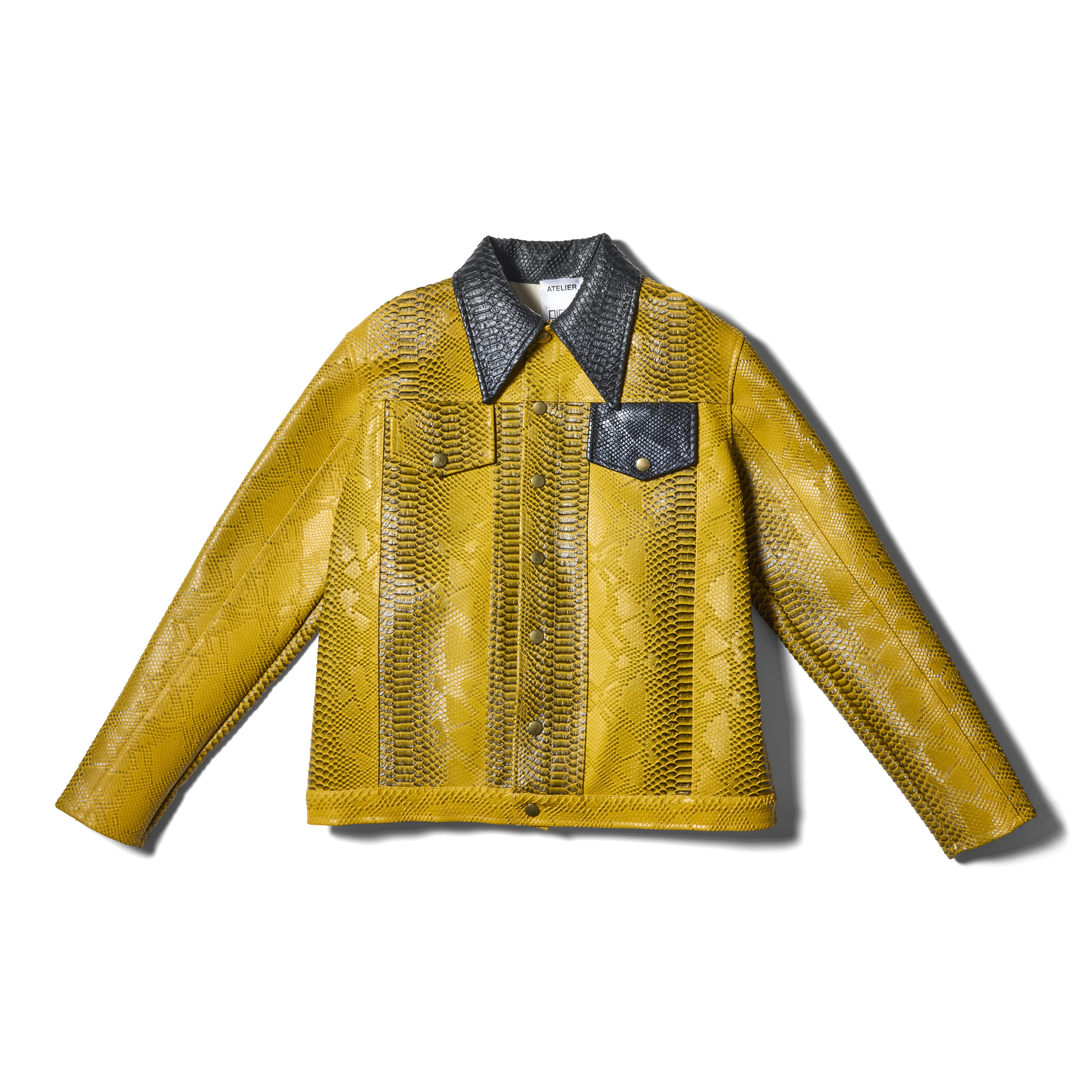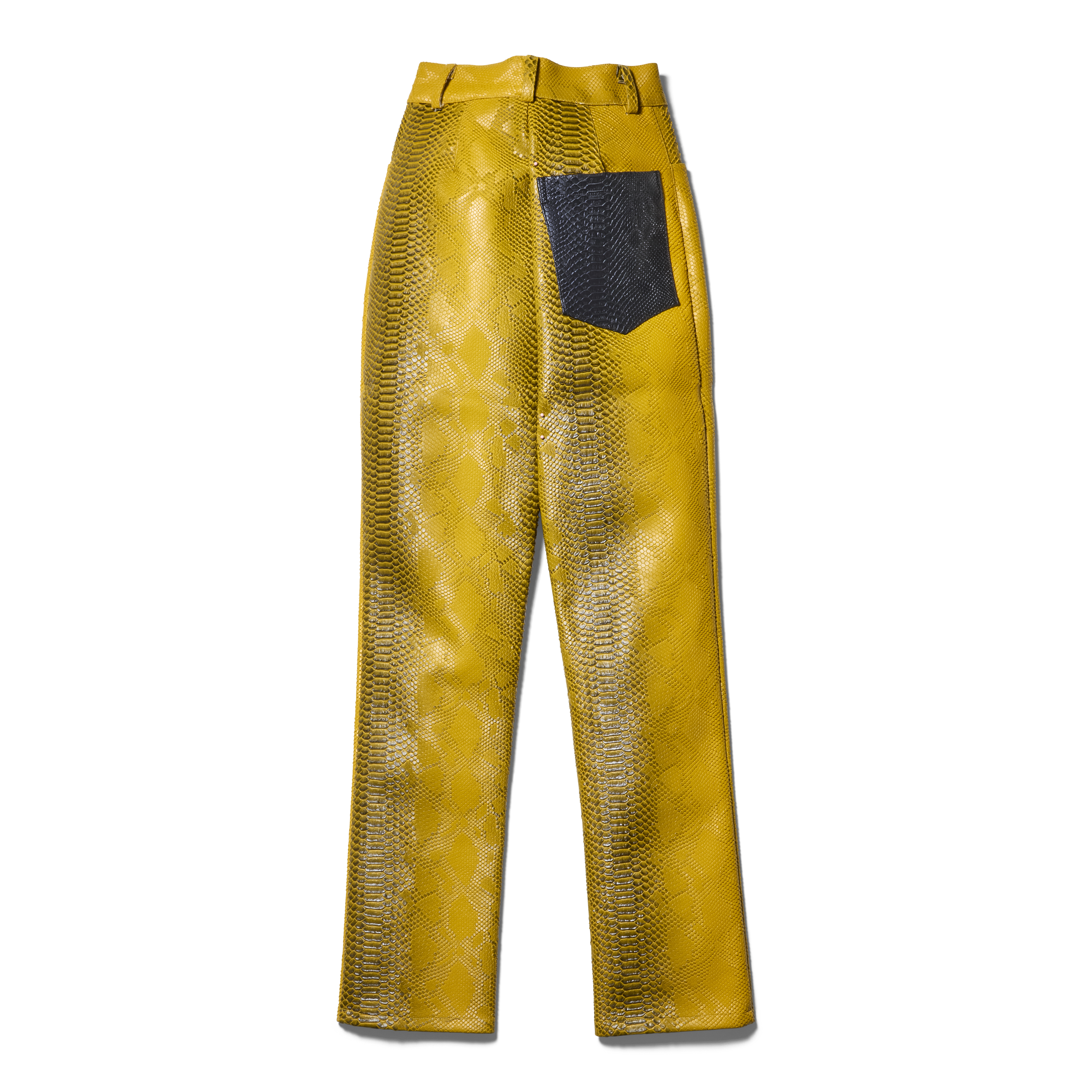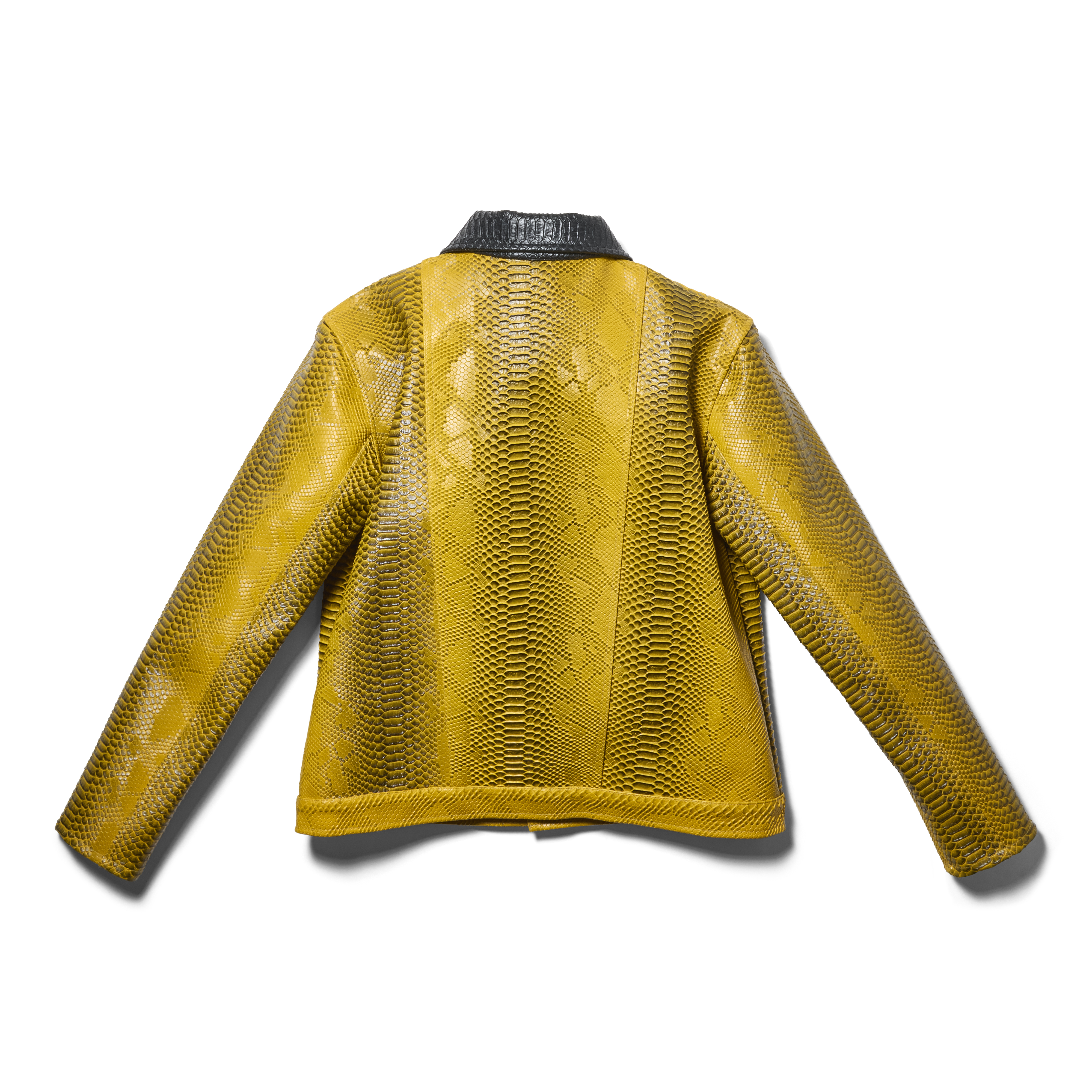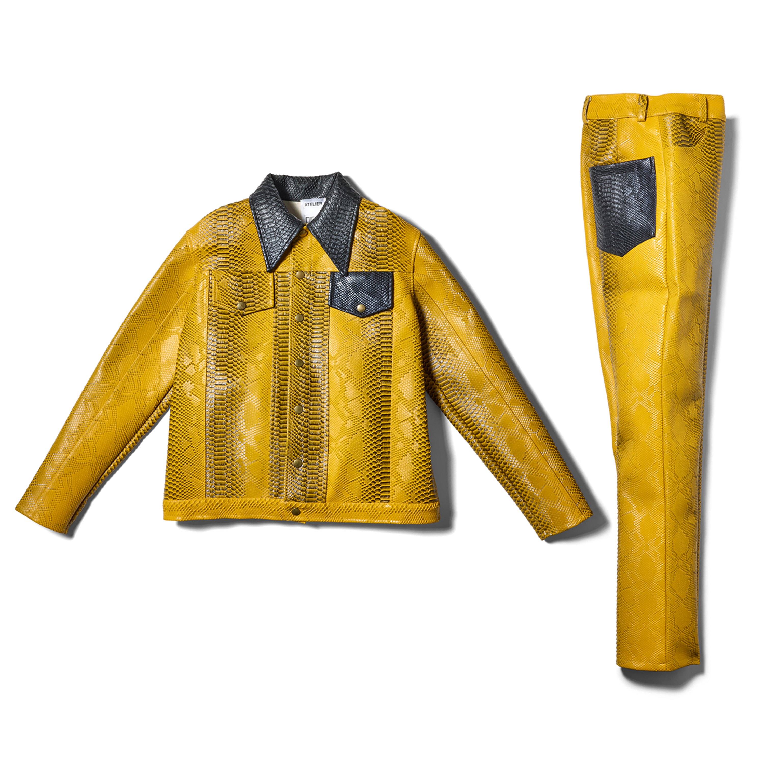 A striking yellow faux snakeskin suit, consisting of matching jacket and pants, worn by Lil Nas X during a photoshoot promoting his 2020 Grammy nominations for Record of the Year, Album of the Year, Best New Artist, and Best Pop Duo/Group Performance.