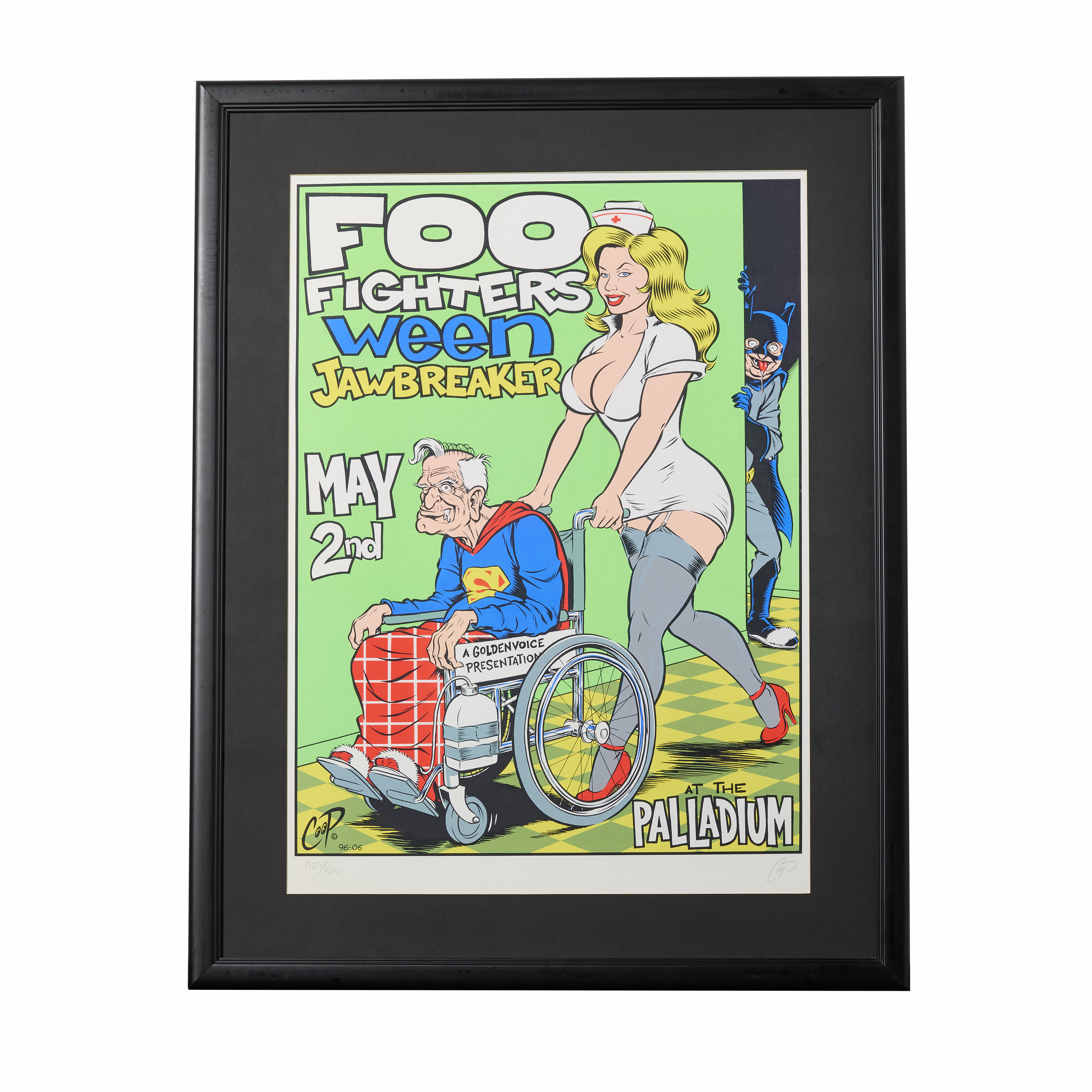 A vibrant silkscreen concert poster created by renowned artist Coop for the Foo Fighters’ May 2, 1996 performance at the Hollywood Palladium. The poster showcases Coop’s distinctive, high-impact graphic style that became a hallmark of 1990s alternative rock design.