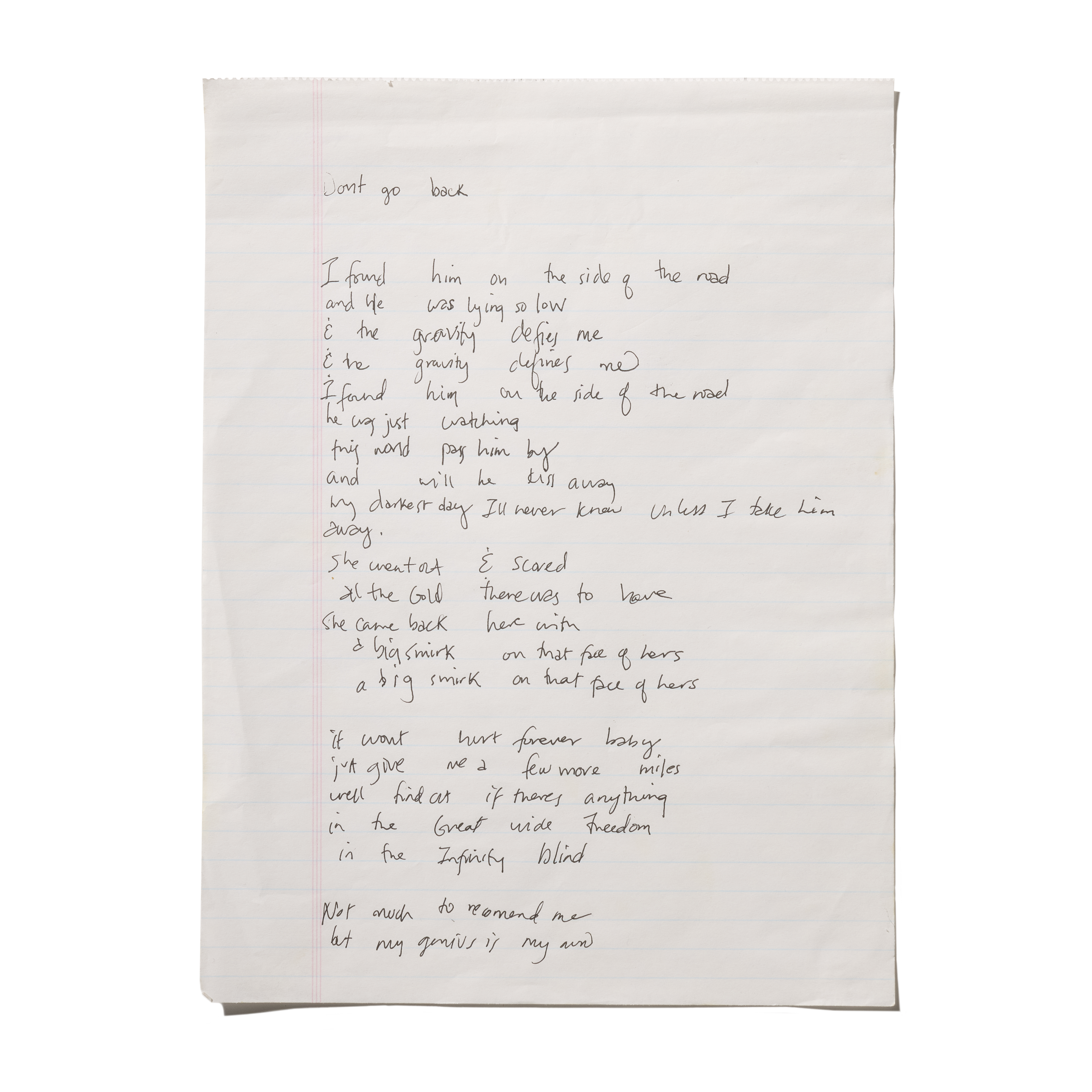 Original handwritten lyrics by Courtney Love for the unpublished song "Don't Go Back." The top edge retains its ripped perforation, emphasizing the raw, intimate nature of the manuscript.