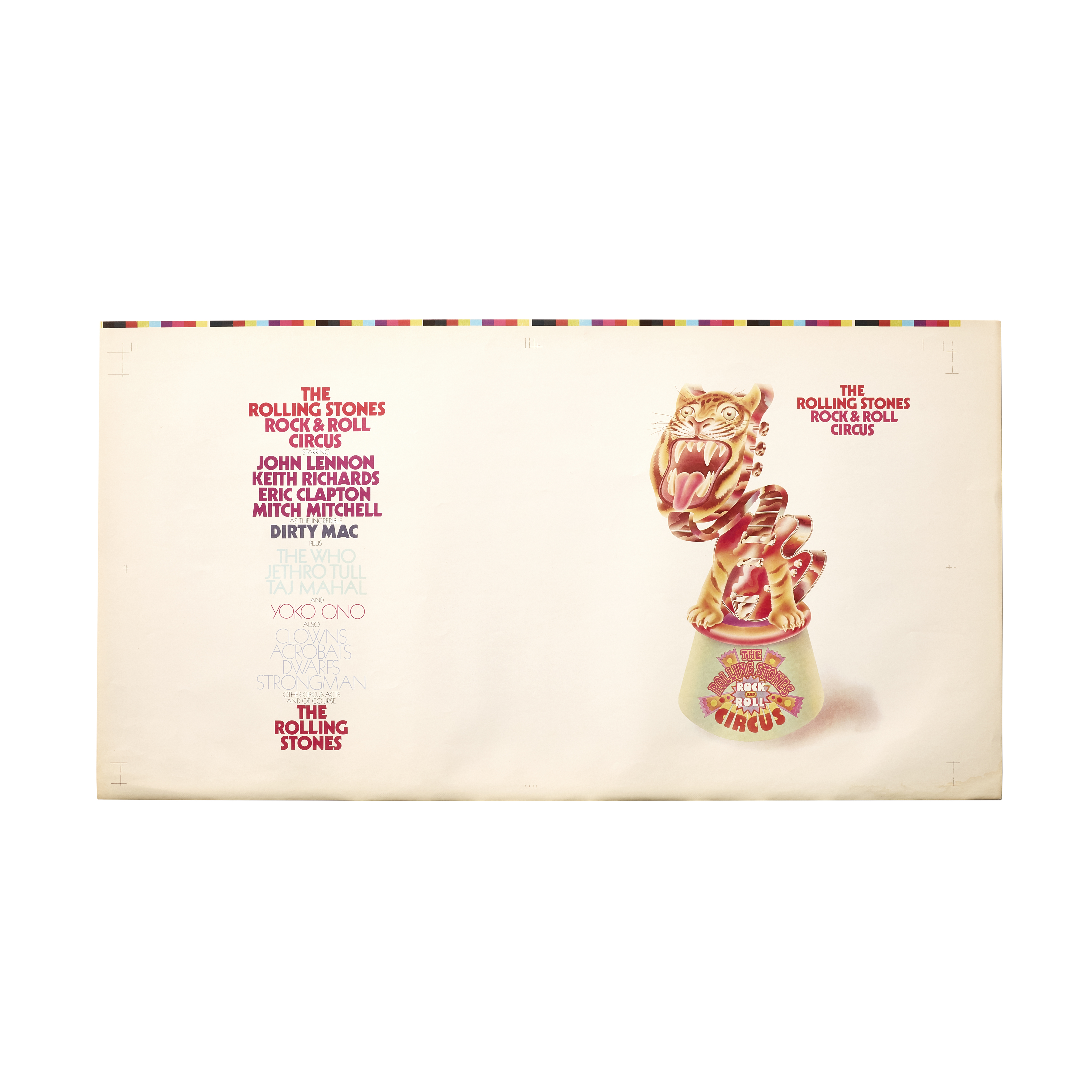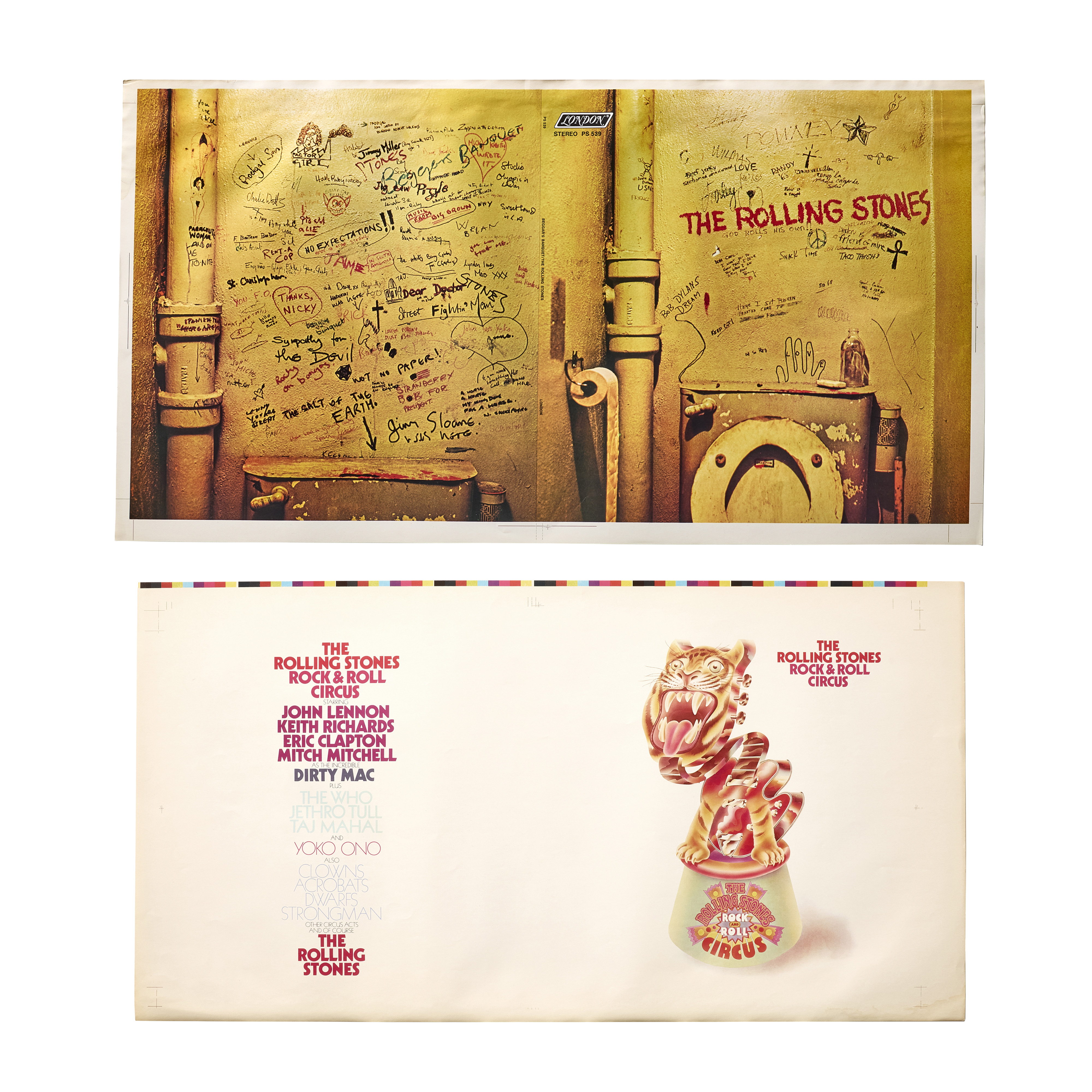 This lot features a rare pair of original printer’s proofs depicting proposed cover art for two landmark Rolling Stones projects: Beggars Banquet and Rock and Roll Circus.