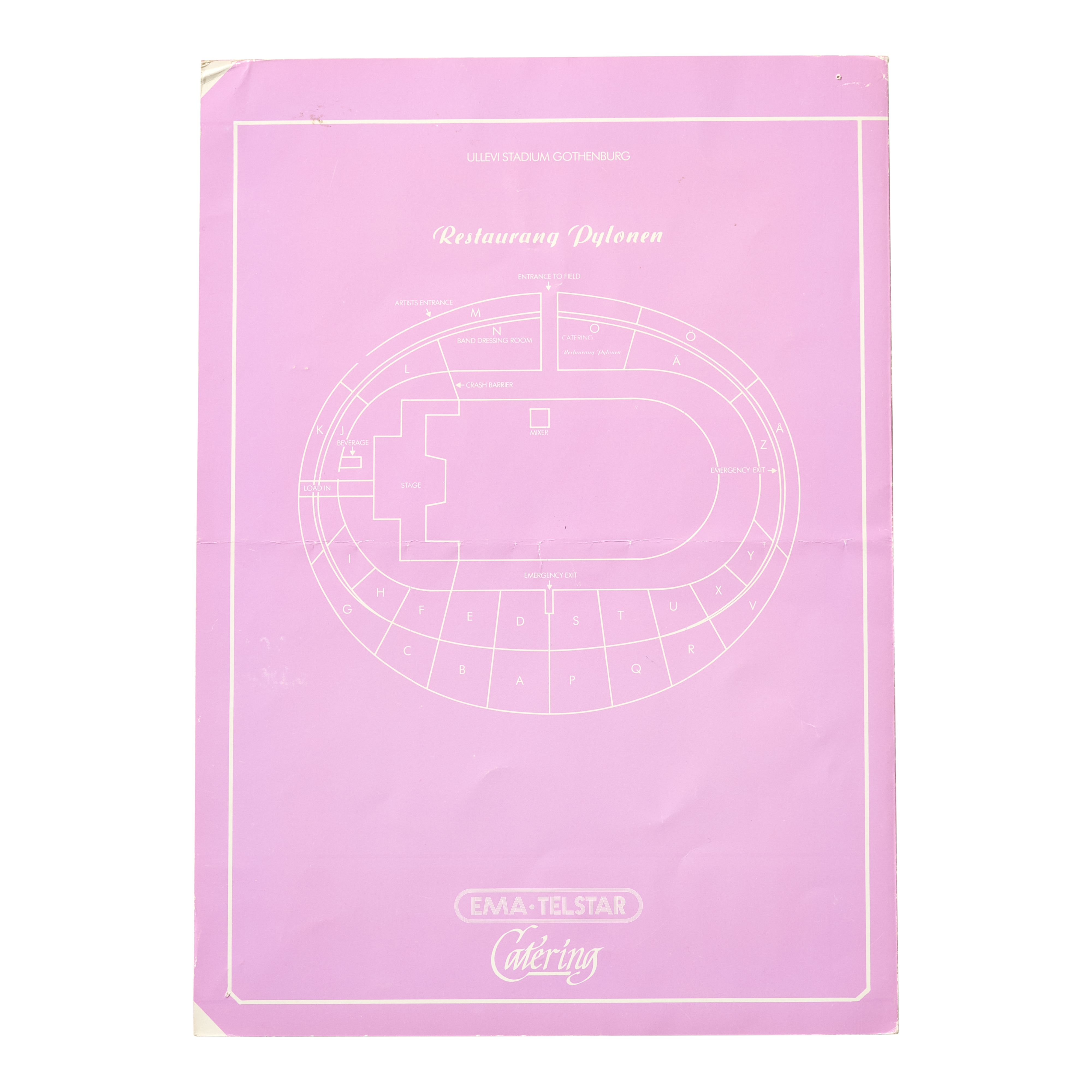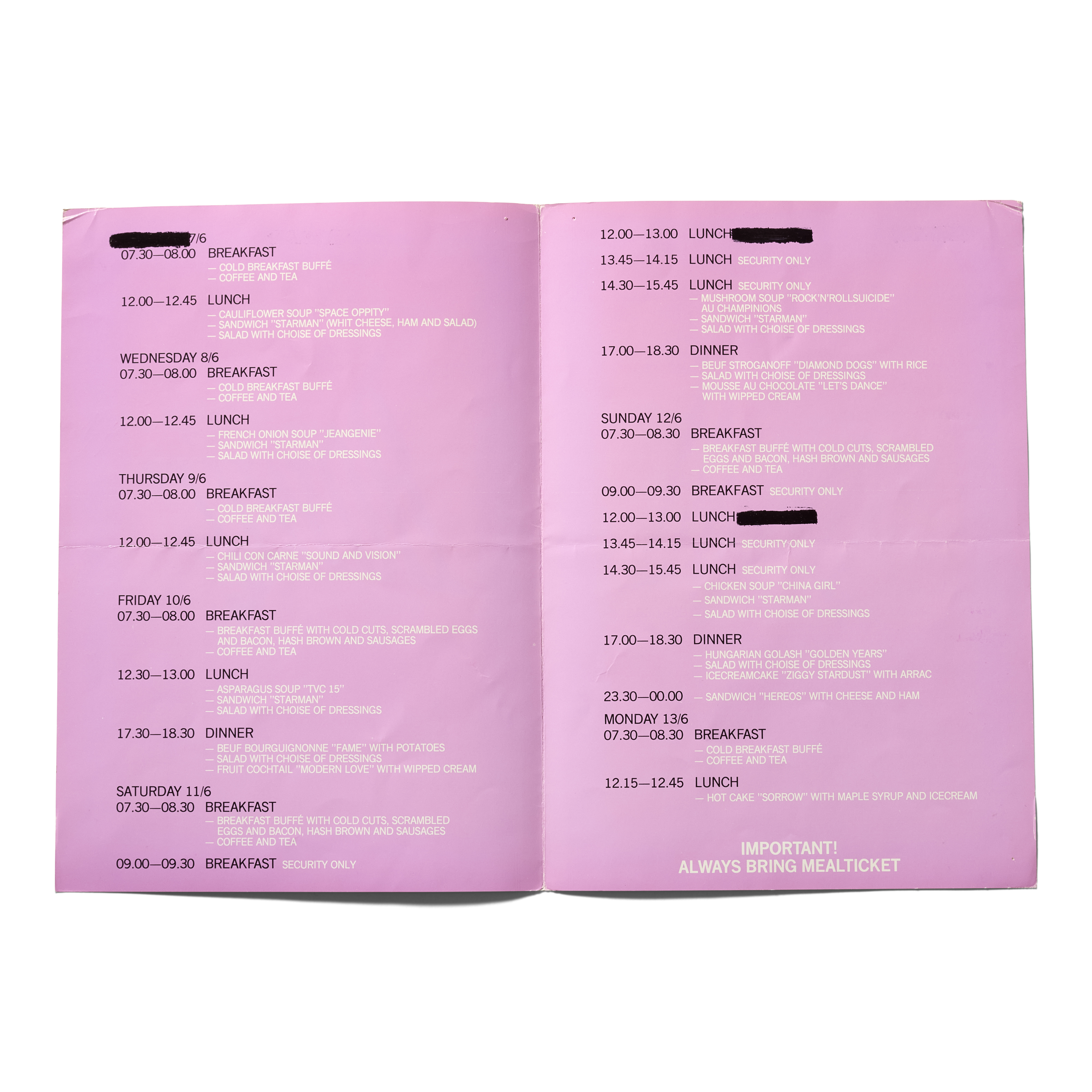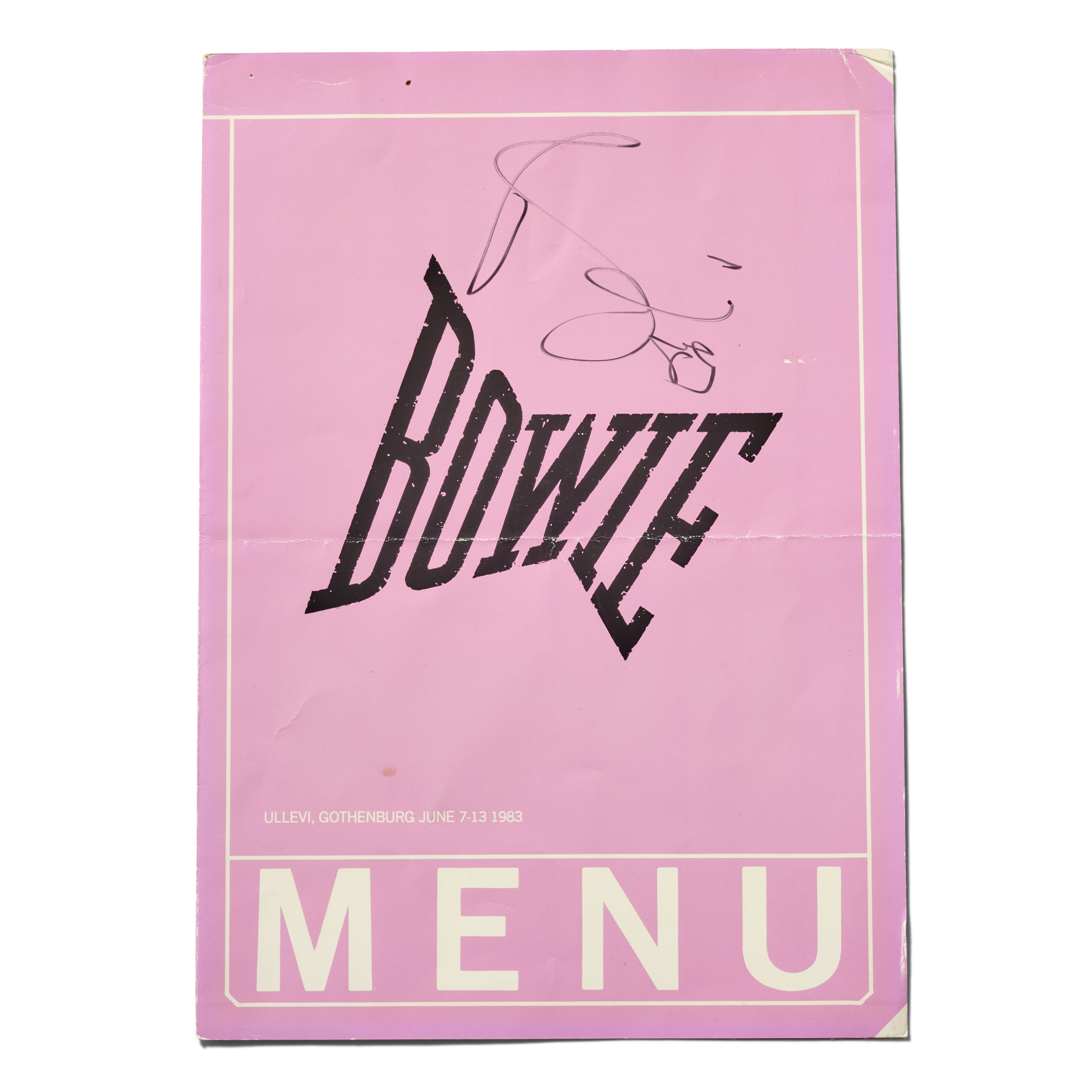 An original catering menu from David Bowie’s 1983 Serious Moonlight tour, covering performances in Gothenburg, Sweden, from June 7–13, 1983, boldly signed in black marker by Bowie himself. The Serious Moonlight tour was launched in support of Bowie’s Let’s Dance album, which marked one of the most commercially successful phases of his career and produced hit singles including “Let’s Dance,” “China Girl,” and “Modern Love.”