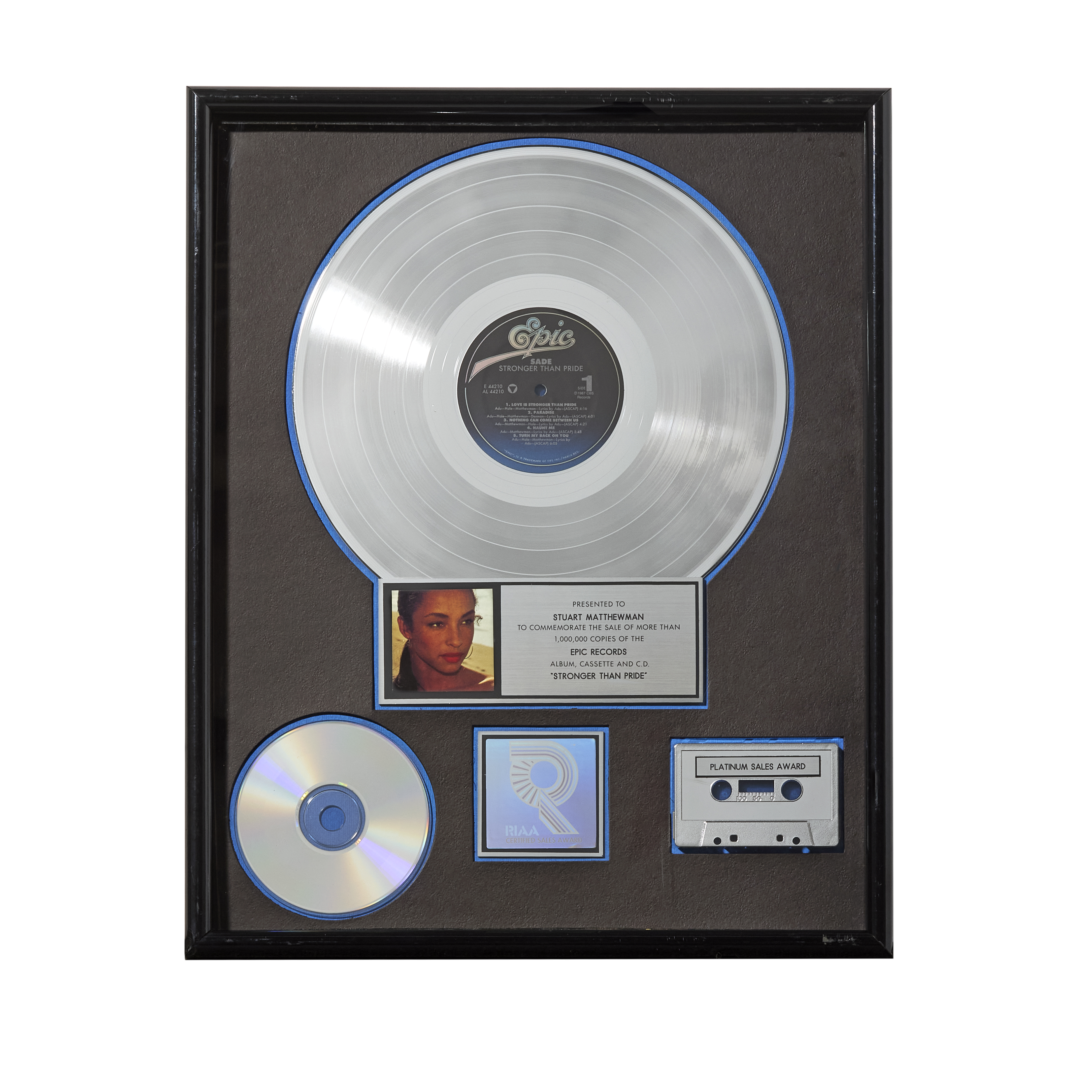 This Multi-Platinum plaque commemorates the sale of more than 1,000,000 copies of Sade’s 1988 third studio album, Stronger Than Pride, and includes the album, cassette and CD formats. The plaque was presented to Stuart Matthewman, songwriter, guitarist, saxophonist, and founding member of Sade. Stronger Than Pride further established the band’s distinctive blend of smooth jazz, soul, and R&B, solidifying their place as one of the most influential acts of the era.