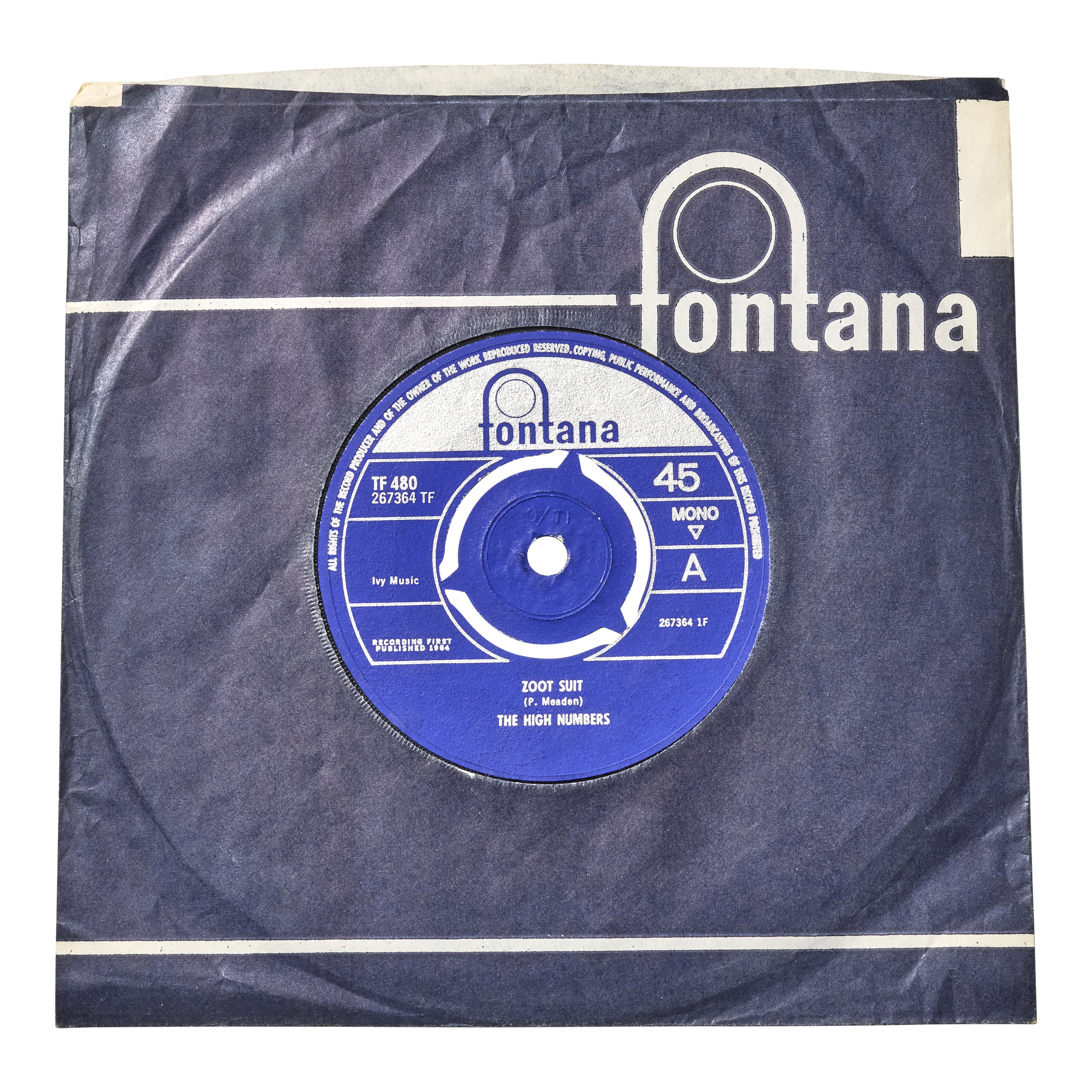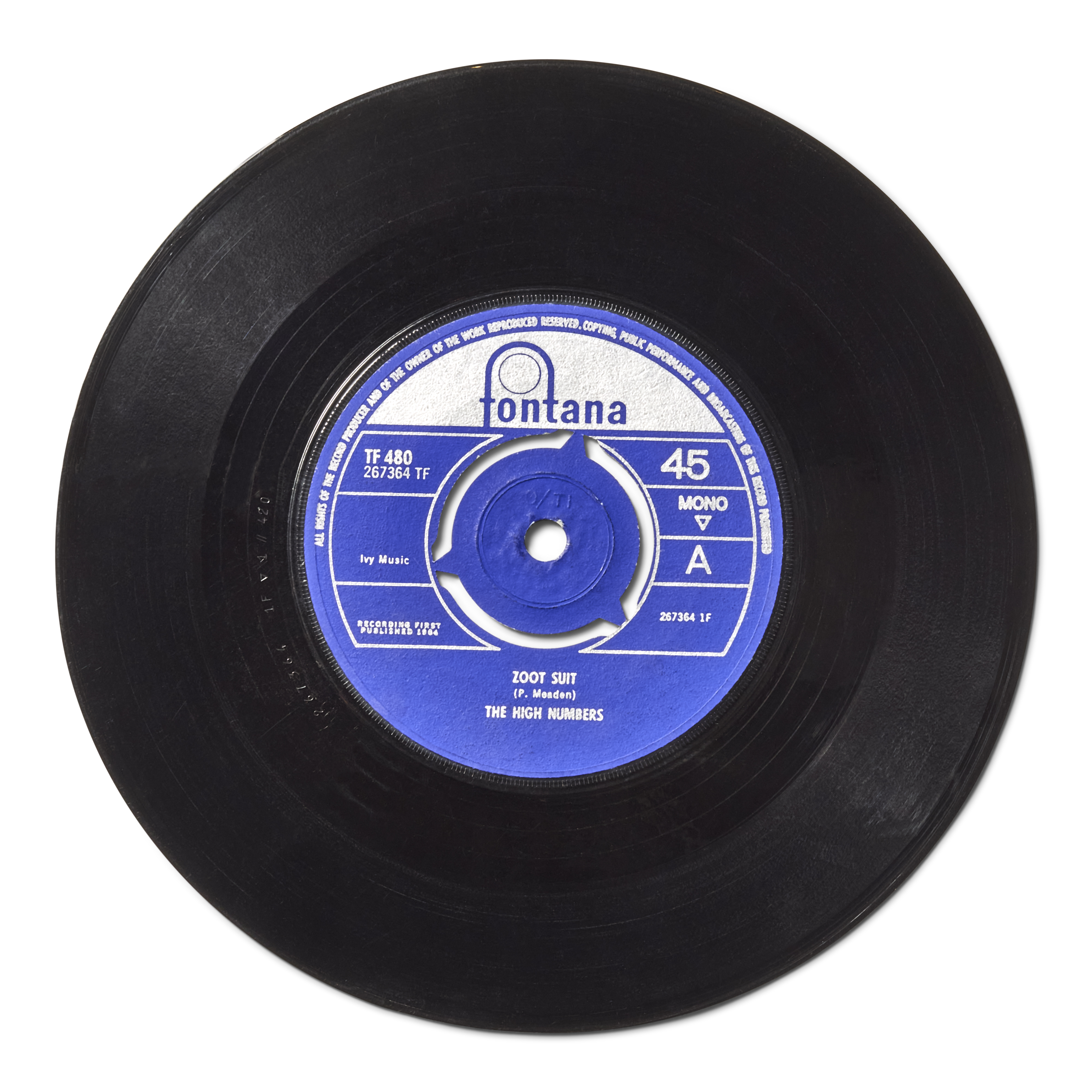 One of the rarest and most important records in rock history, this 45 represents the very first single by The High Numbers. Released in 1964 on Fontana Records for a Mod audience, the single "Zoot Suit / I'm The Face" initially flopped, prompting the band to permanently change their name to the now renowned moniker, The Who.