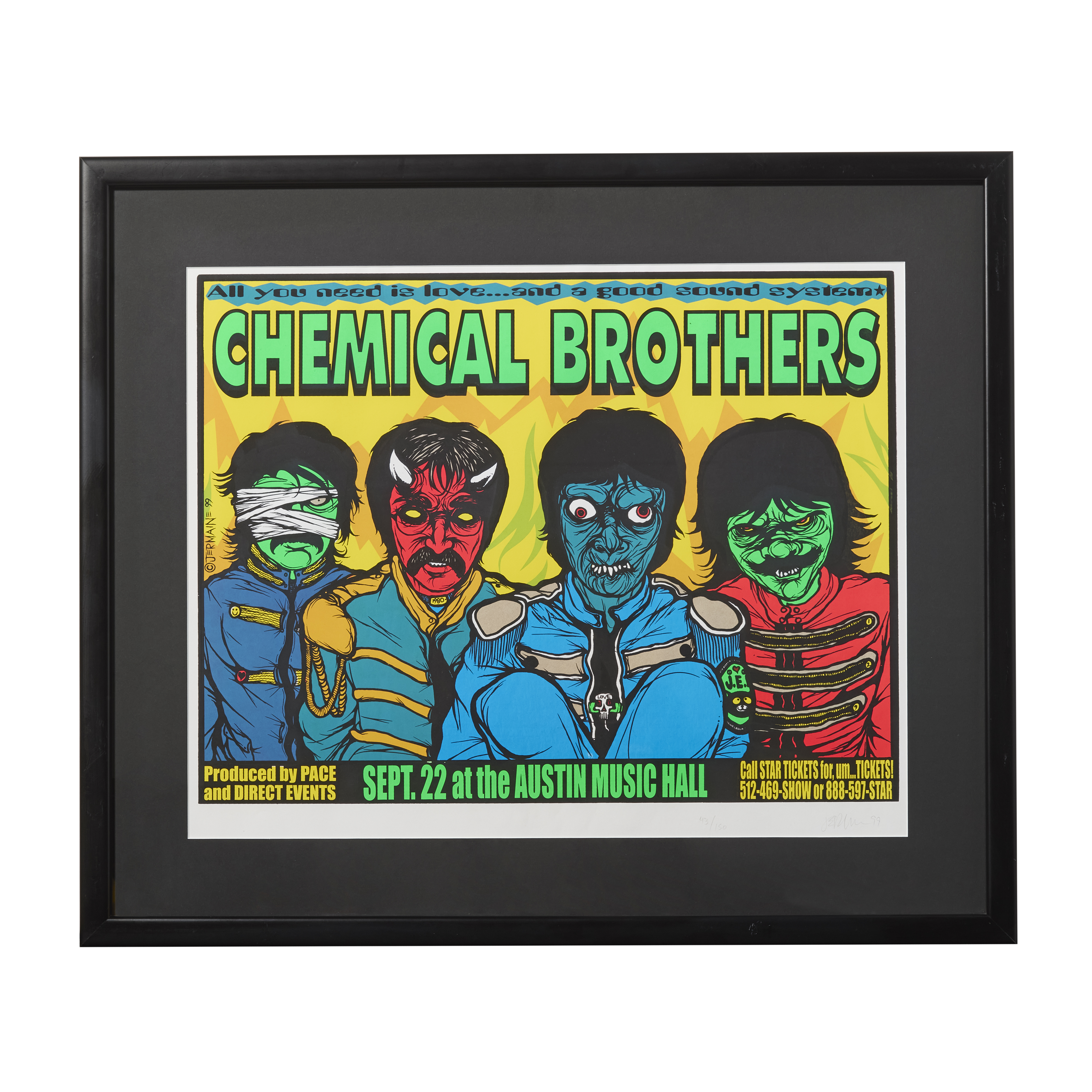This Beatles Sgt. Pepper’s-inspired concert poster was created by artist Jermaine Rogers for the Chemical Brothers’ performance on September 22, 1999, at the Austin Music Hall.