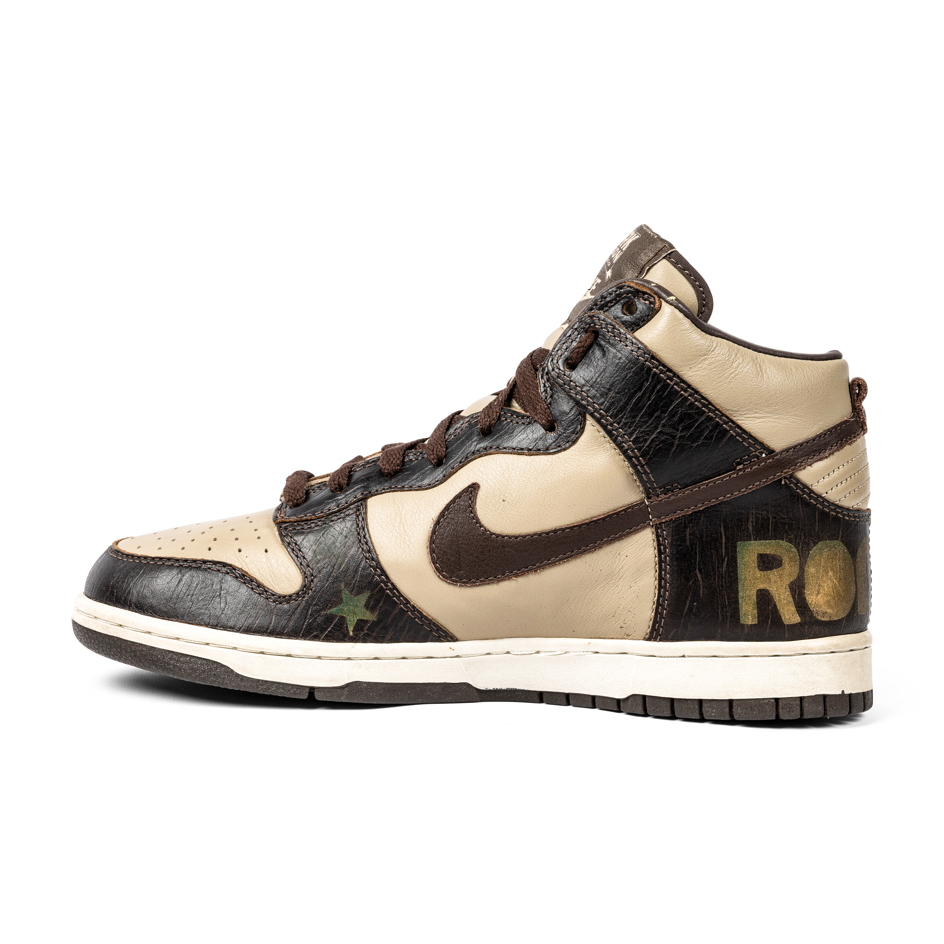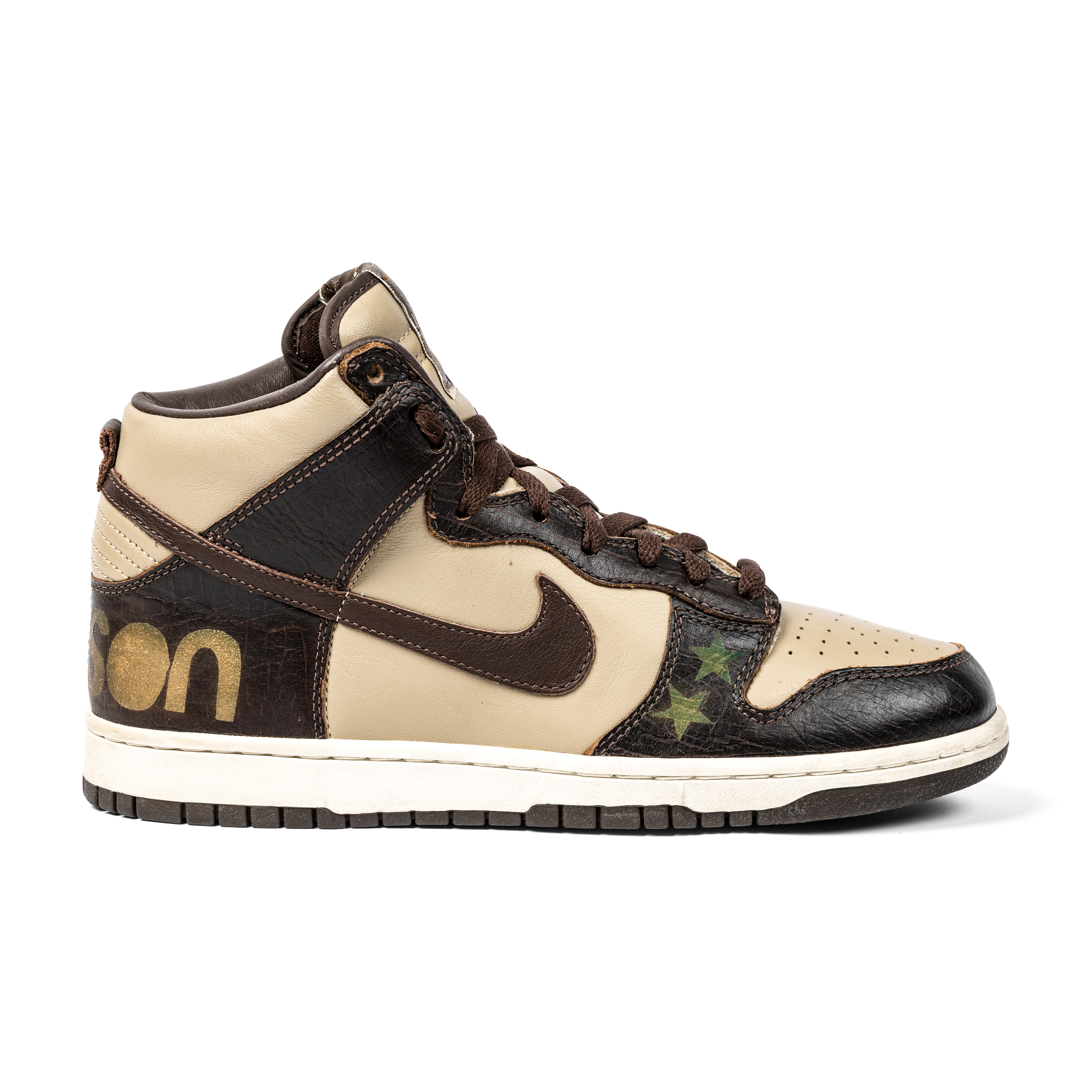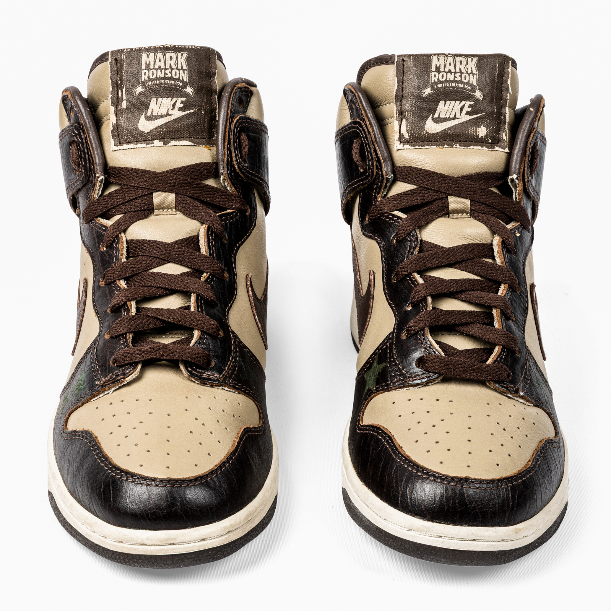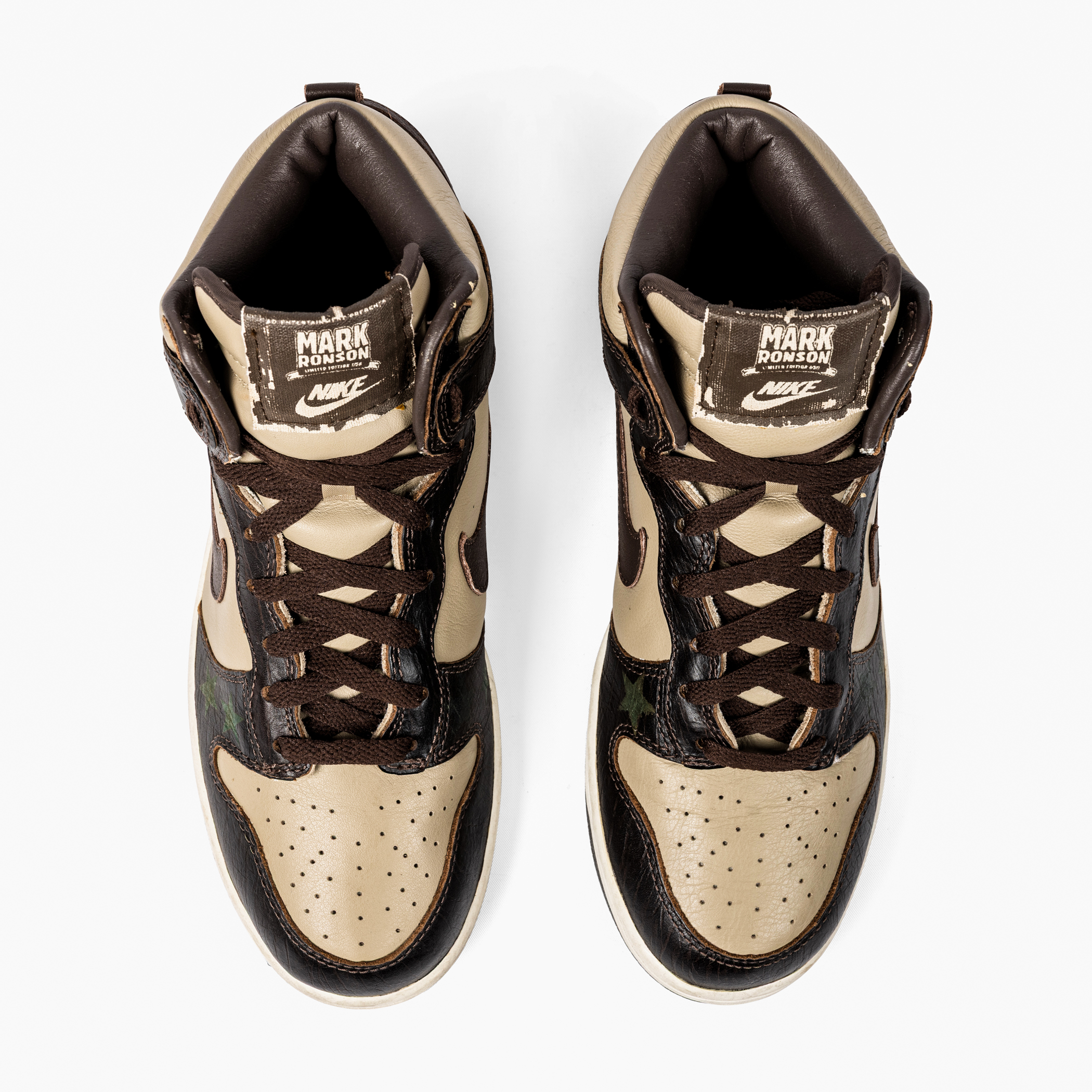 These Nike Dunk Highs represent an ultra-rare collaboration between Nike, Mark Ronson, and Methamphibian, limited to only 50 pairs worldwide. Originally released as brown 'grunge' Dunk Highs in 2003, this batch was hand-customized by Methamphibian, giving the shoes a distressed aesthetic and distinctive visual identity.