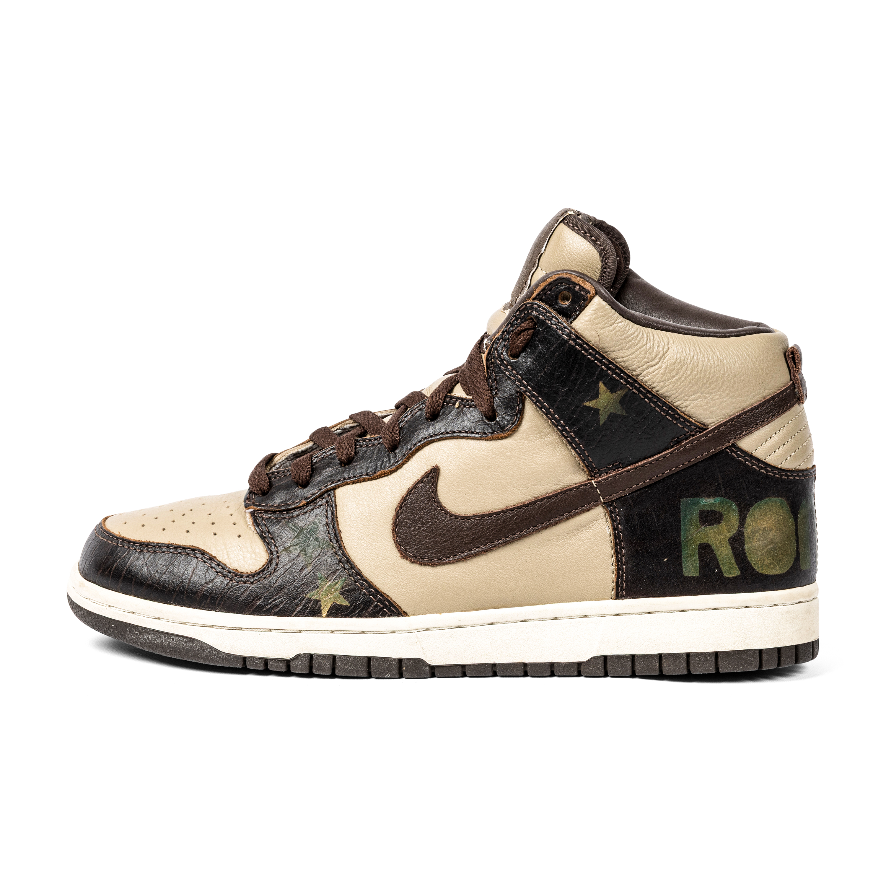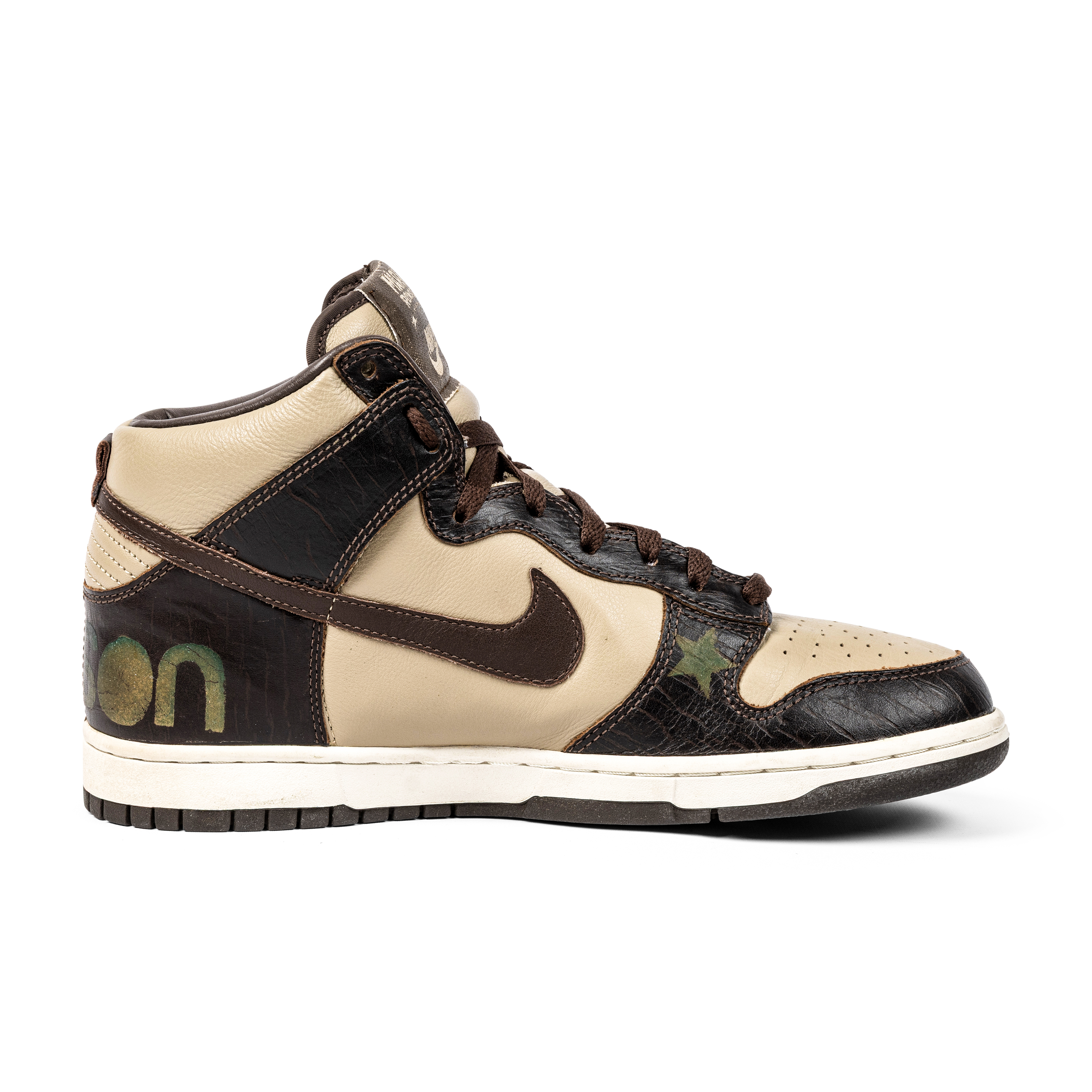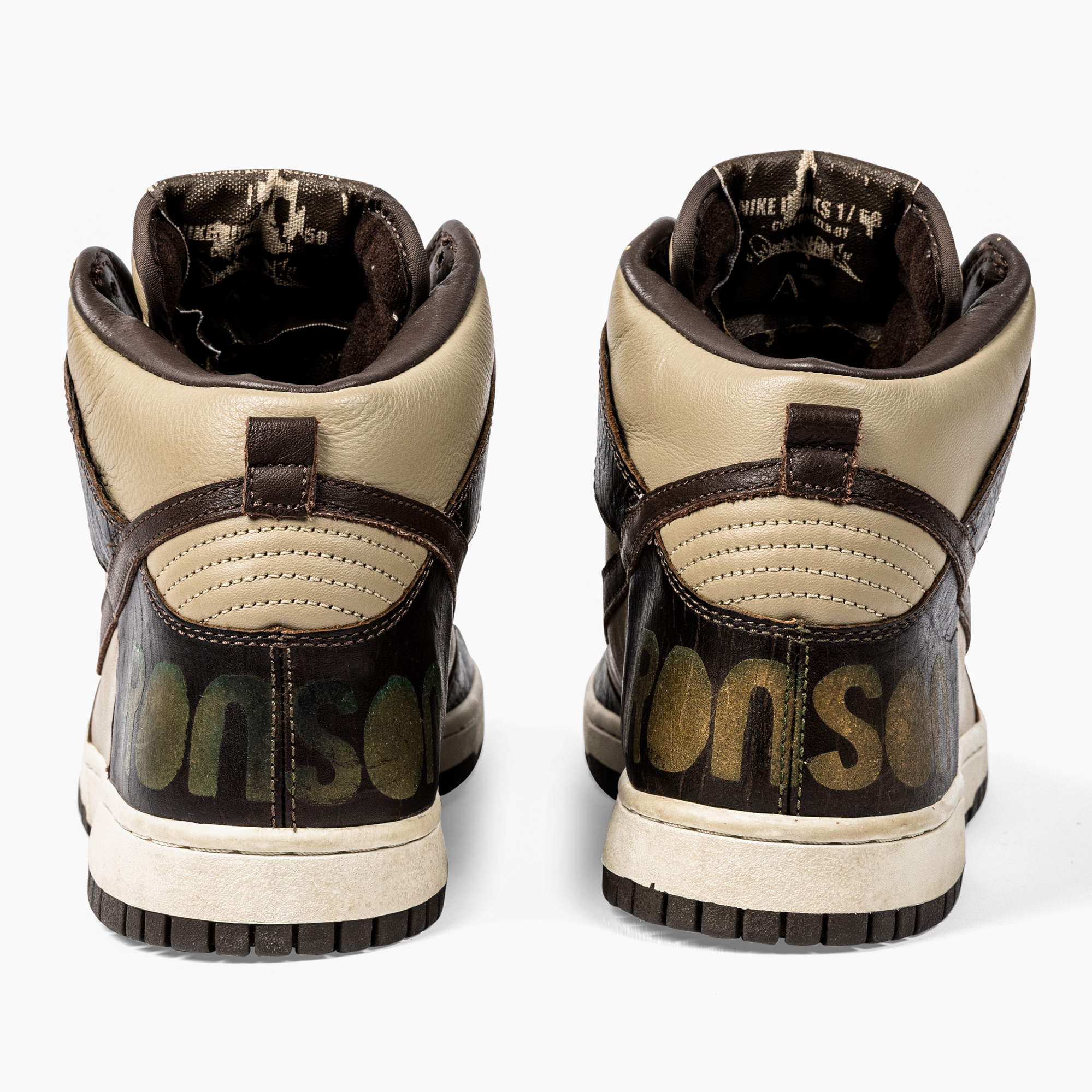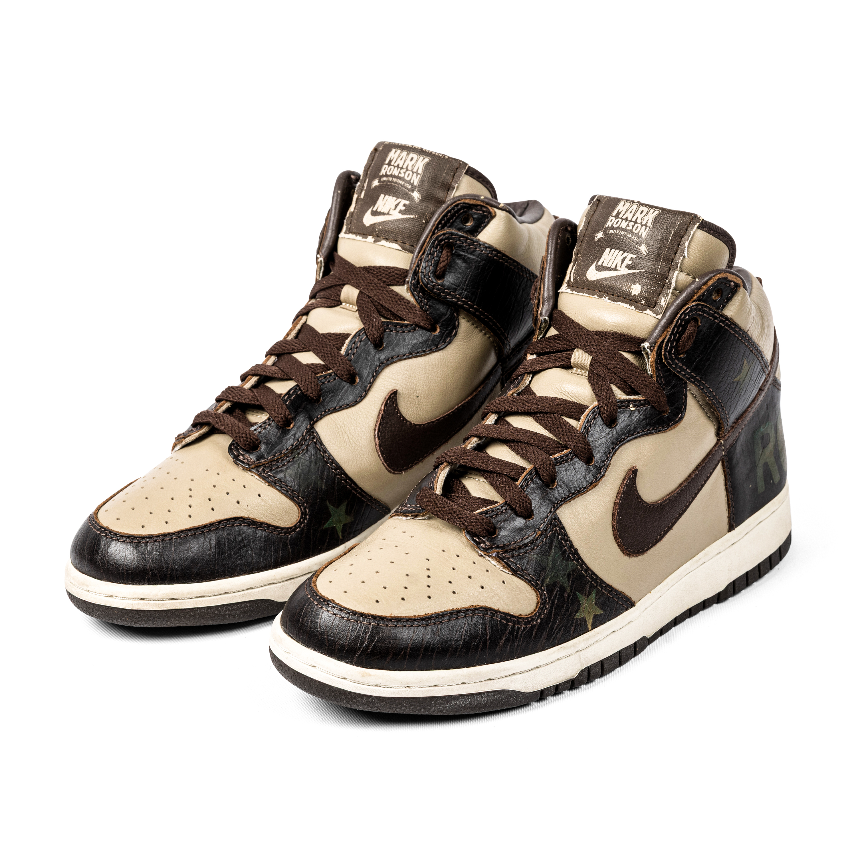 These Nike Dunk Highs represent an ultra-rare collaboration between Nike, Mark Ronson, and Methamphibian, limited to only 50 pairs worldwide. Originally released as brown 'grunge' Dunk Highs in 2003, this batch was hand-customized by Methamphibian, giving the shoes a distressed aesthetic and distinctive visual identity.