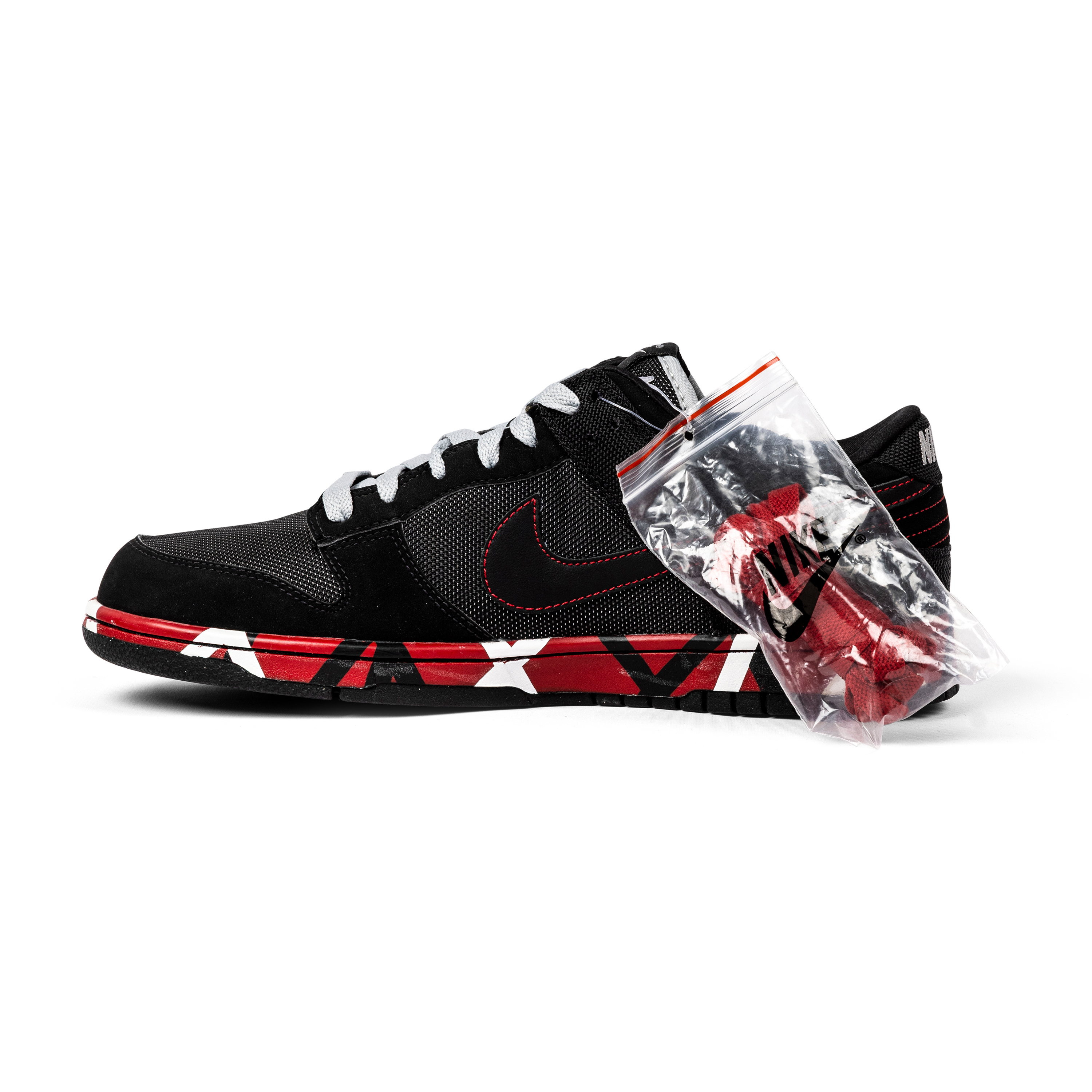 Rendered primarily in black, the Dunks feature midsoles and insoles that mirror the distinctive striped pattern of Eddie's iconic 'Frankenstein' guitar, a subtle but unmistakable design reference. The pair is finished with grey laces, and include an additional set of red laces, remaining brand new in its original box.