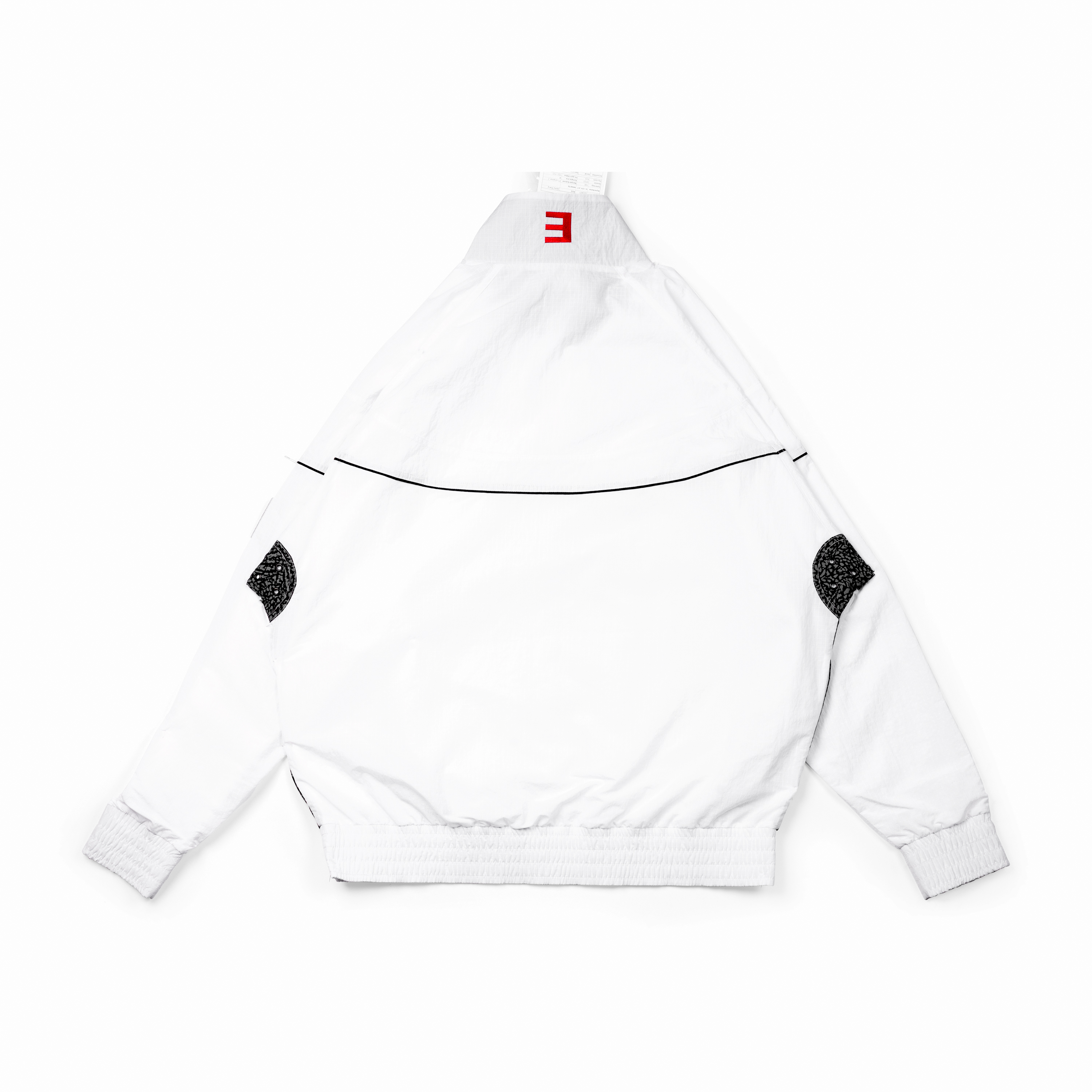 The jacket’s colorway and graphics mirror the Eminem Air Jordan 3s he famously wore during the 2022 Super Bowl Halftime Show, further tying it to a landmark moment in modern music and sports culture. It remains in brand-new condition, complete with the original sample tag still attached. Eminem’s collaborations with Nike—including the sought-after Carhartt 4s and the Encore series—are among the most coveted in sneaker history, making this jacket an especially significant piece within that legacy.