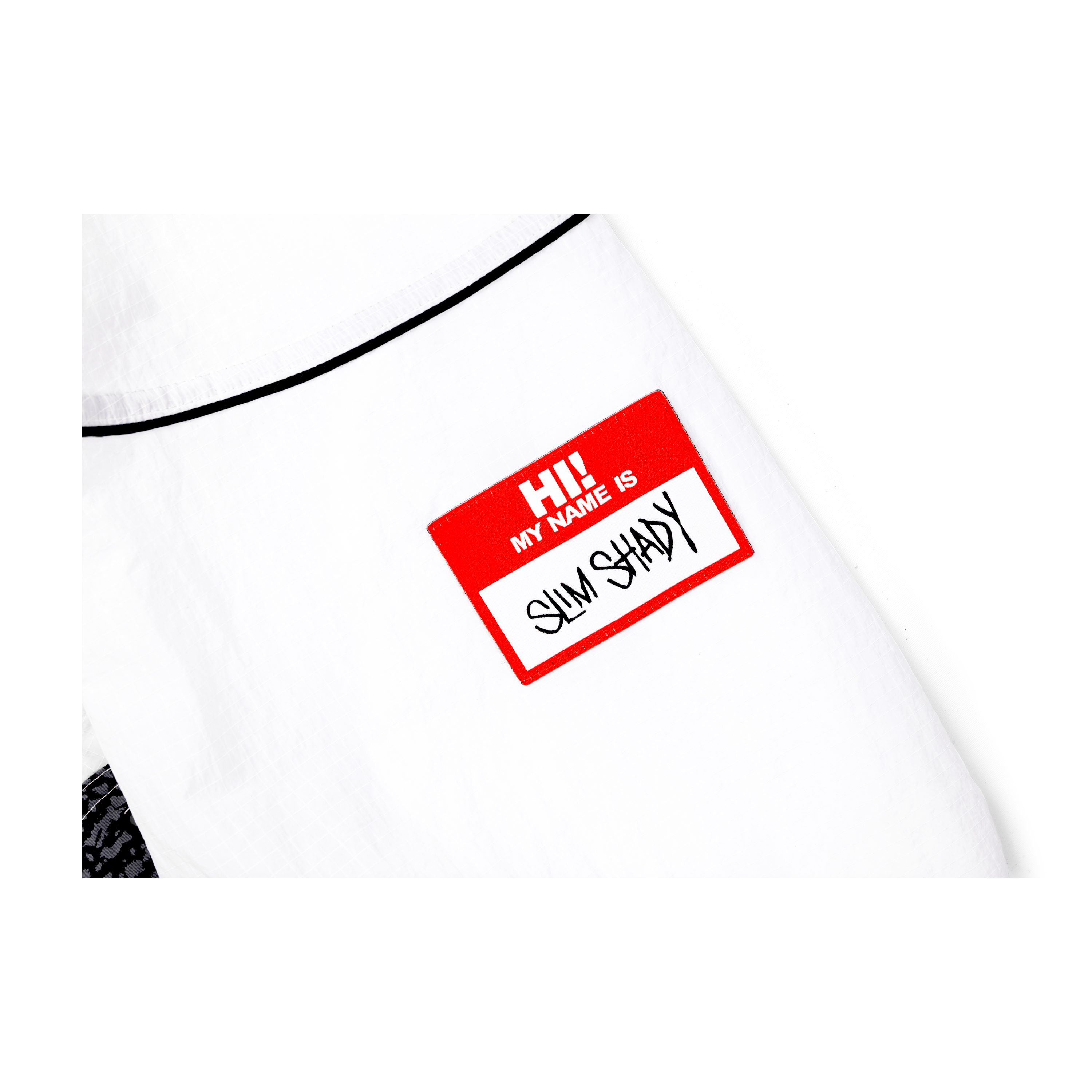 This unreleased Nike Air Jordan sample jacket was created exclusively for Eminem, featuring a bold red 'E' embroidered on the collar and a 'HI! MY NAME IS SLIM SHADY' name tag printed along the left sleeve. Never released to the public, it represents a rare intersection of hip-hop history and sneaker culture, produced as a one-off piece rather than a commercial release.