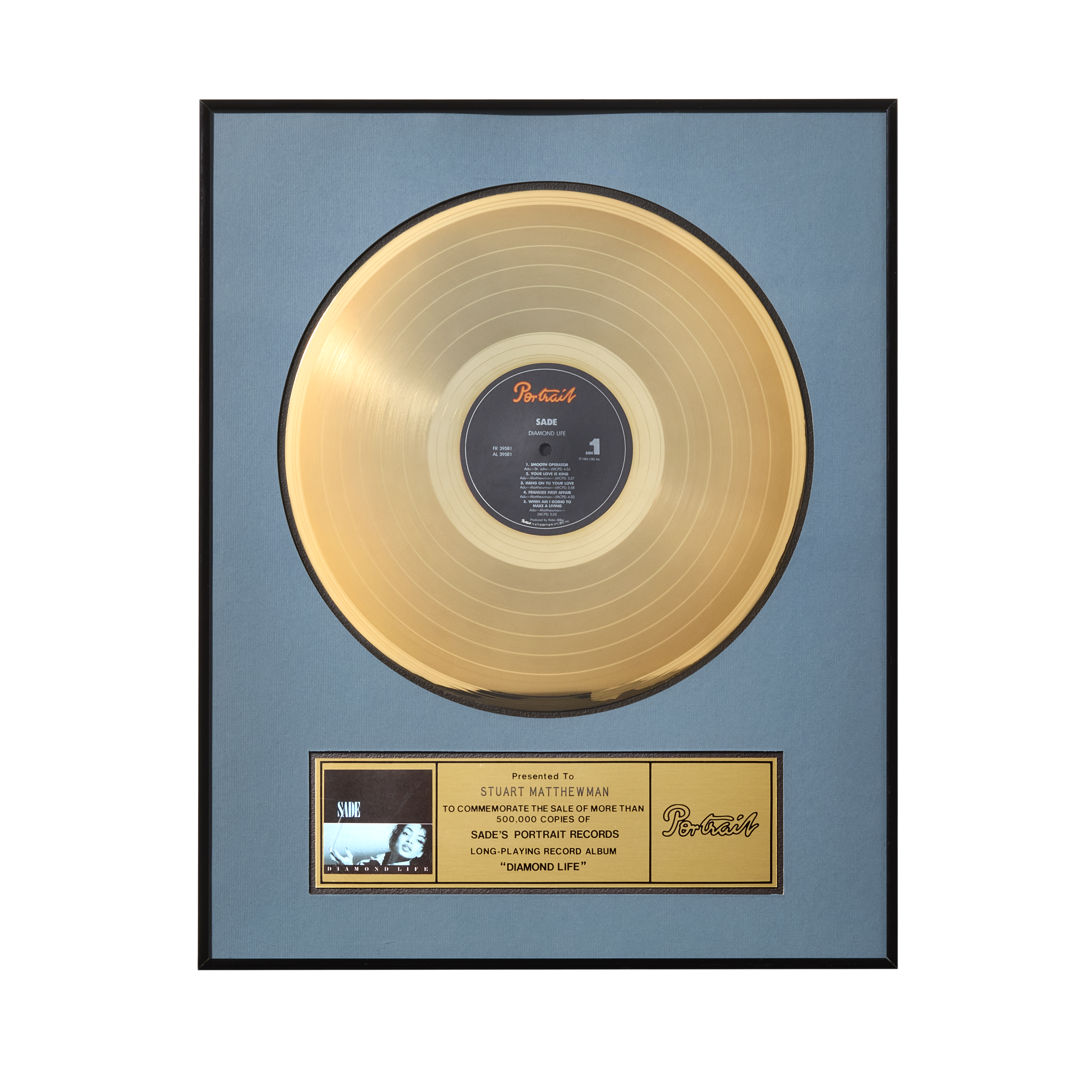 This Gold plaque commemorates the sale of more than 500,000 copies of Sade’s 1984 debut studio album, Diamond Life, and was presented to Stuart Matthewman, songwriter, guitarist, saxophonist, and founding member of the band. Diamond Life launched Sade’s career, introducing the world to their distinctive blend of smooth jazz, soul, and R&B, and established the band as a defining voice in contemporary music.