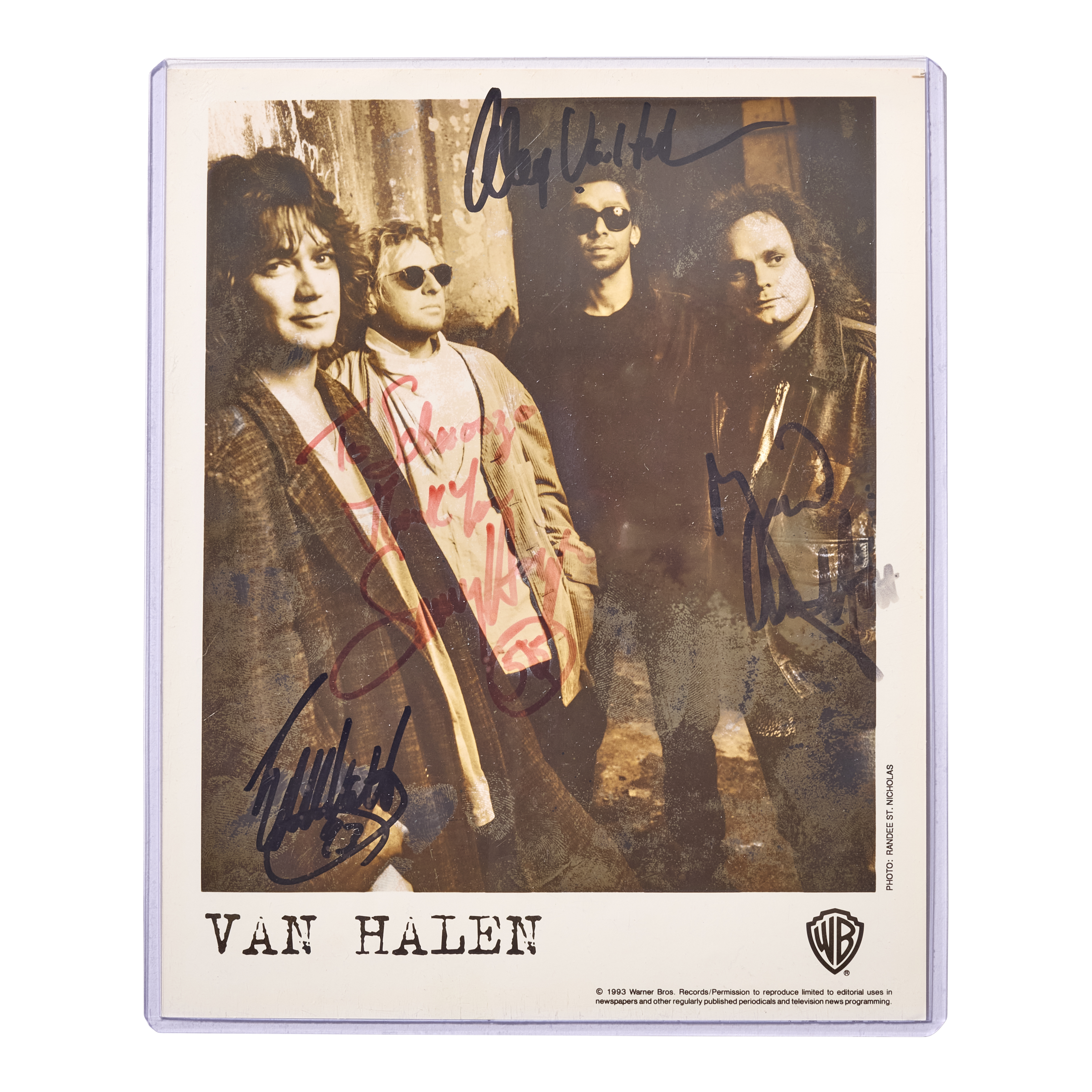 A 1993 Warner Brothers publicity photograph of Van Halen, boldly signed by all four members of the band—Eddie Van Halen, Sammy Hagar, Alex Van Halen, and Michael Anthony—in black and red marker.