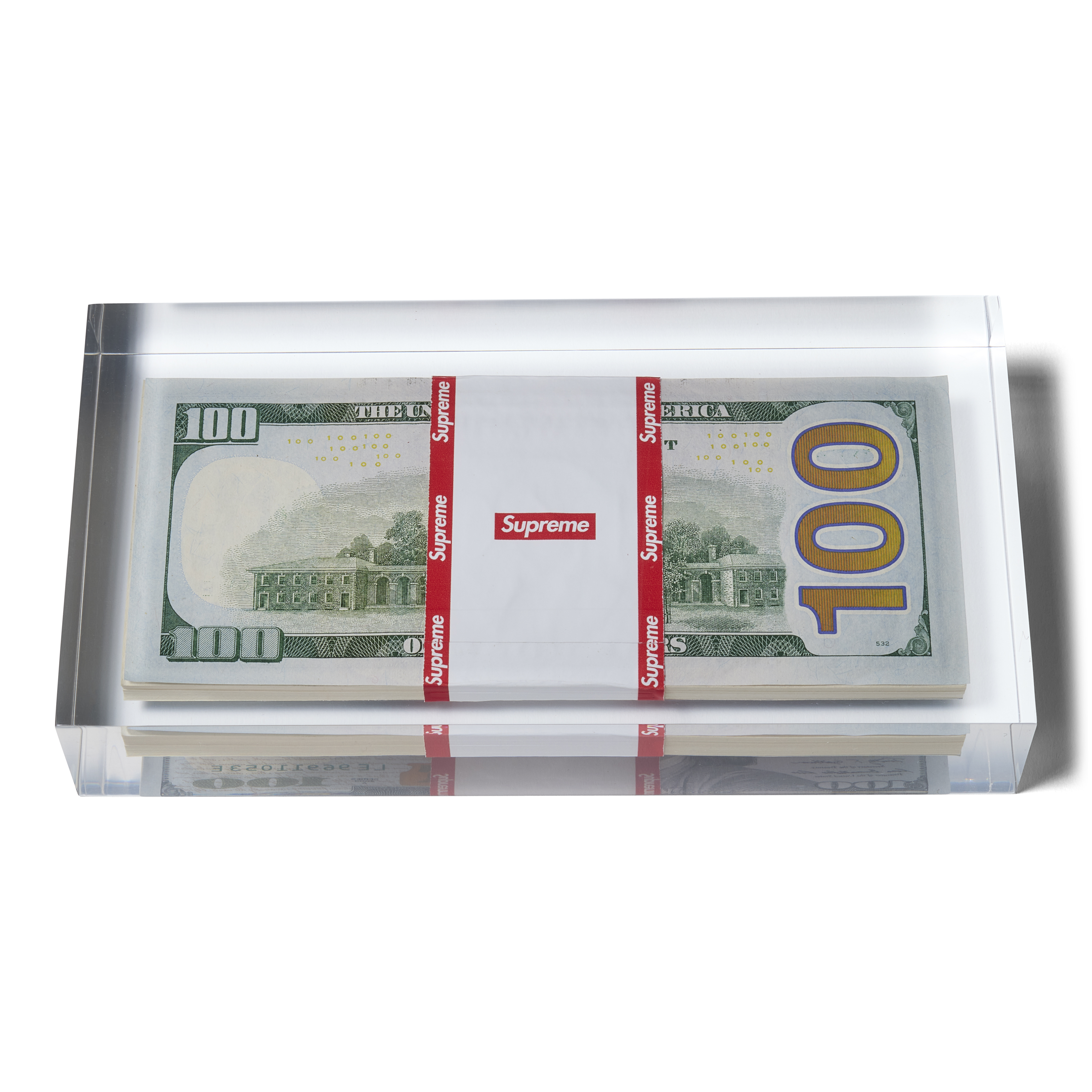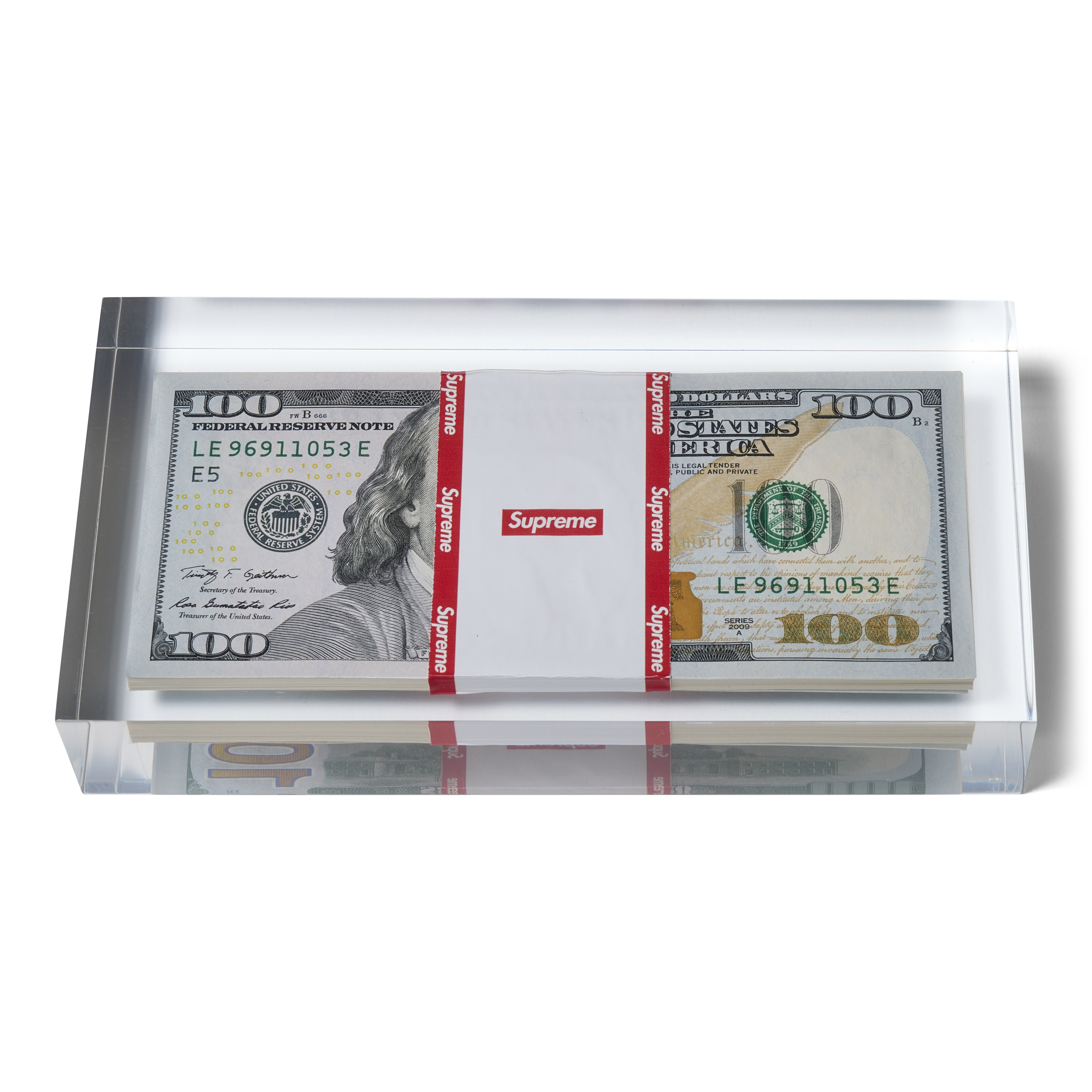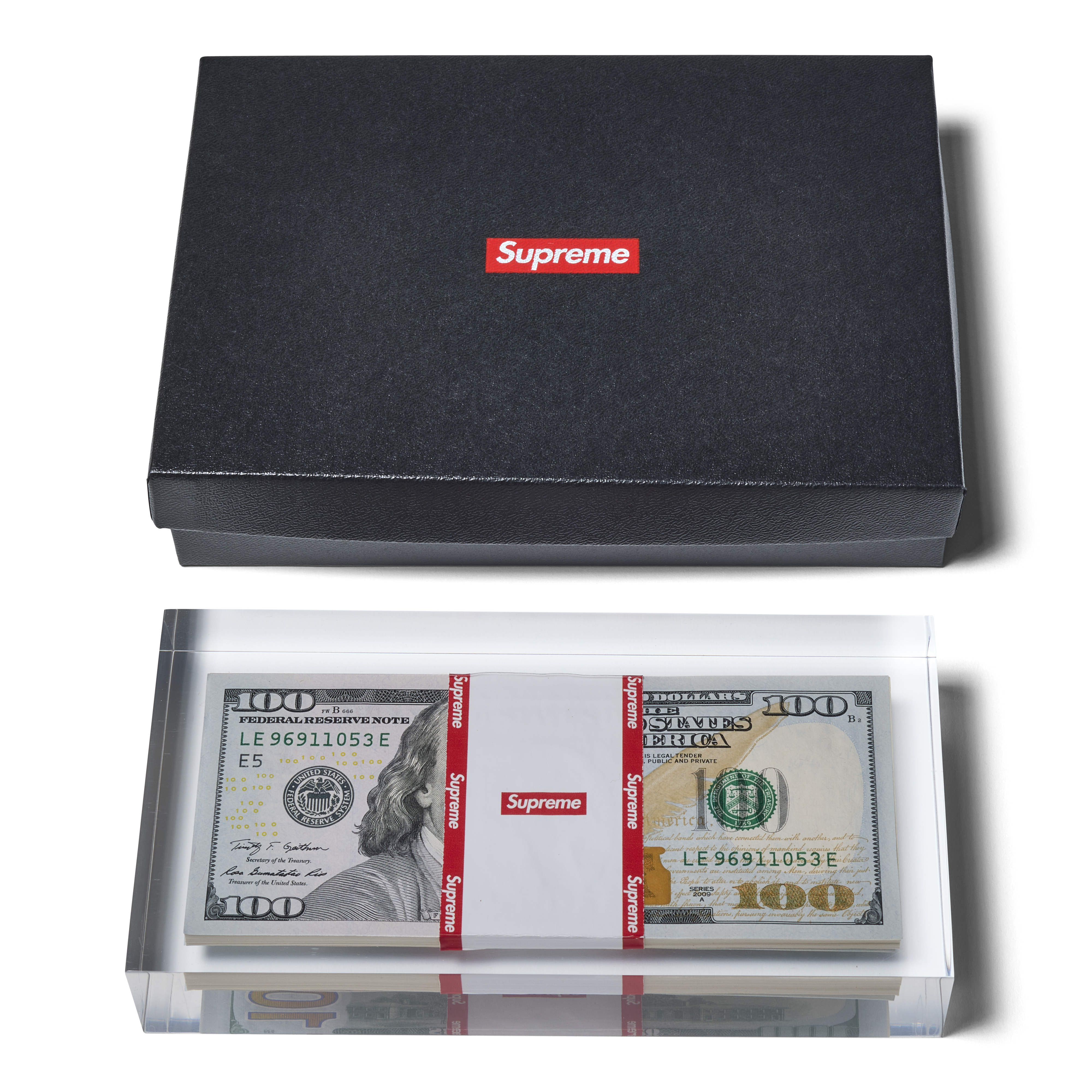 A rare and provocative piece from Supreme’s FW 2017 collection, this cash paperweight was never released to the public, making it an exceptionally scarce collectible. The paperweight encases U.S. banknotes in clear lucite, exemplifying Supreme’s irreverent approach to design and its ongoing interplay between luxury, streetwear, and cultural commentary.