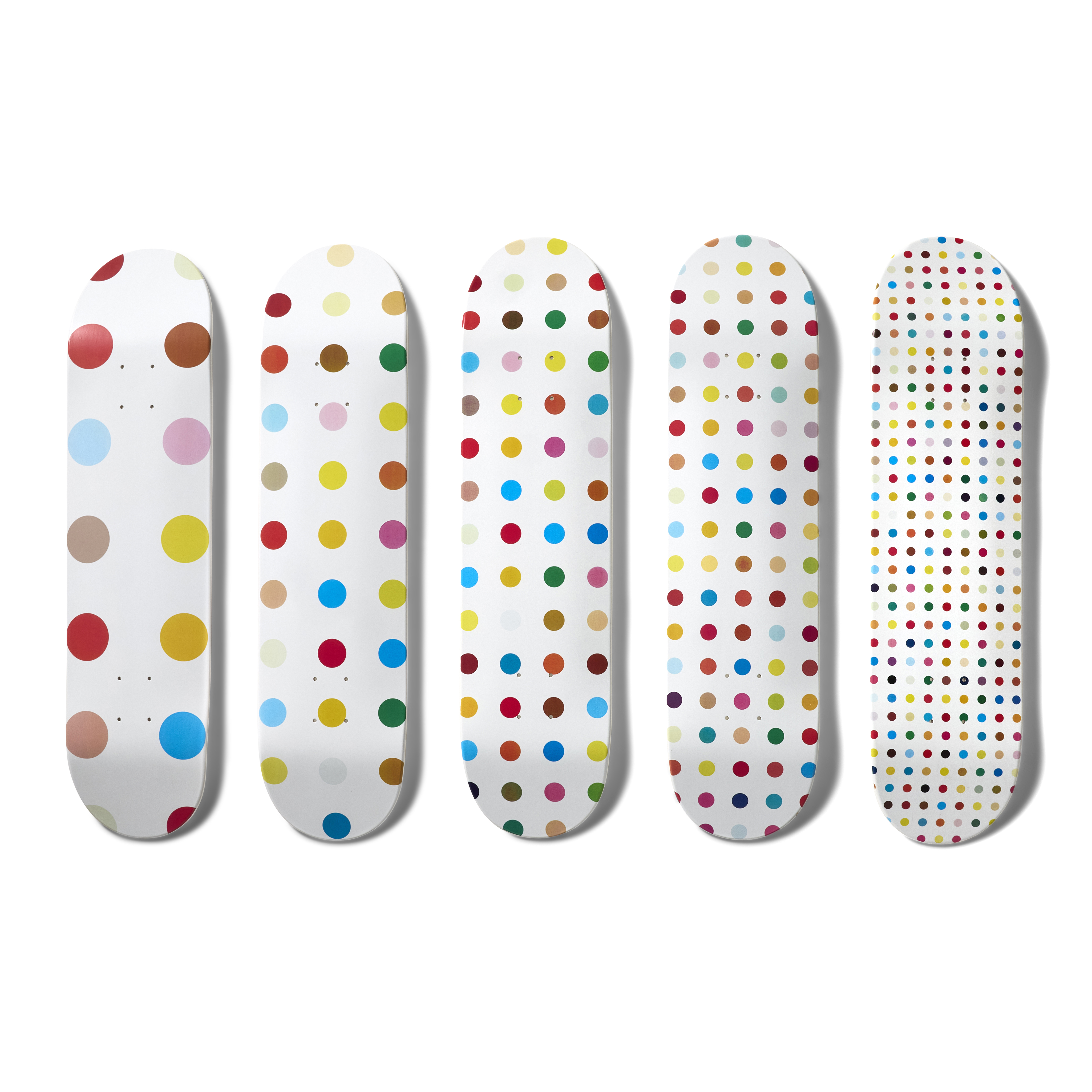 A standout collaboration at the crossroads of contemporary art and street culture, this complete set of five Spots skateboard decks was released by Supreme in 2009 in partnership with internationally acclaimed artist Damien Hirst. Each deck showcases Hirst’s unmistakable Spot series — defined by meticulously arranged, multicolored polka dots that have become a signature motif within his practice and a visual shorthand for his conceptual approach to color, repetition, and systems of order.