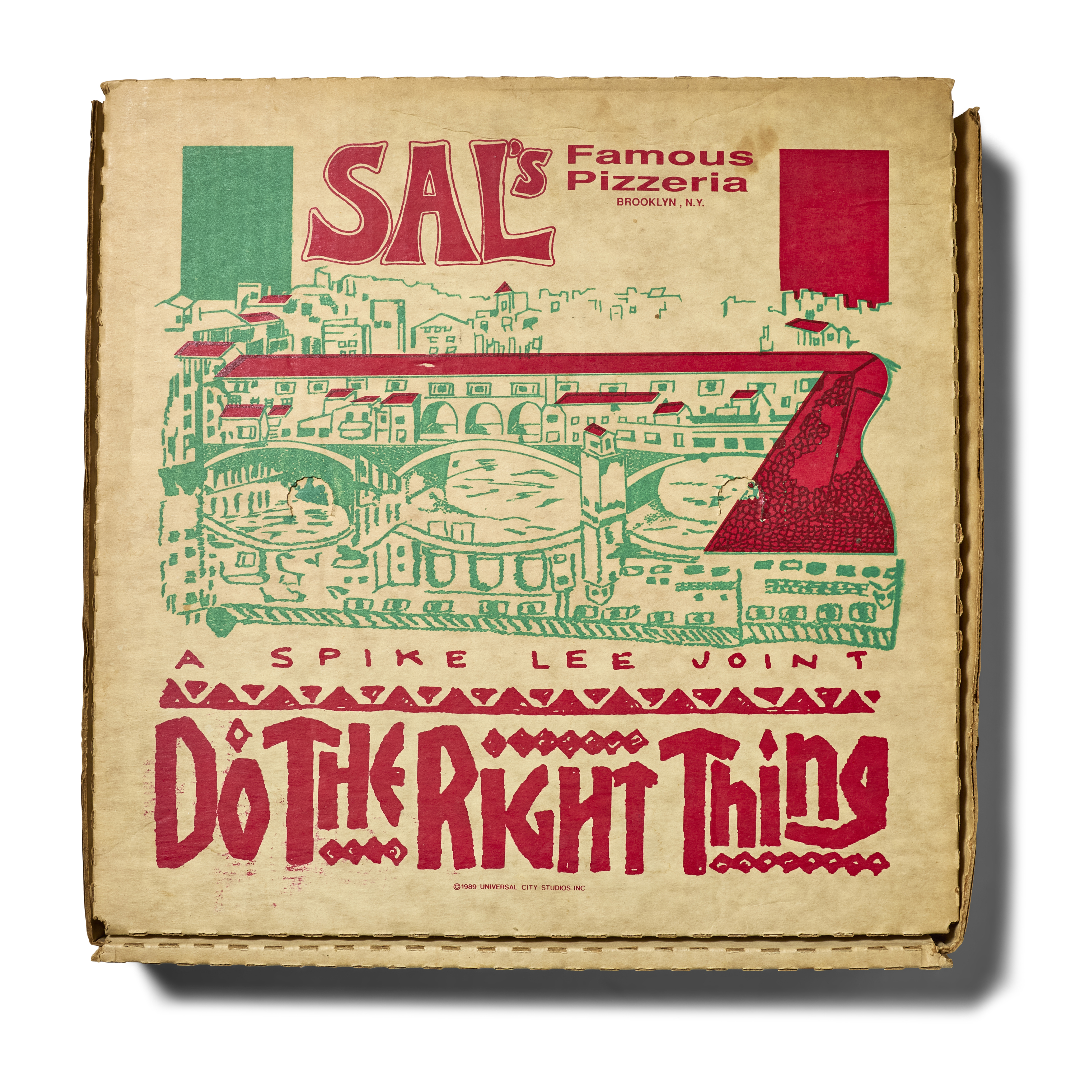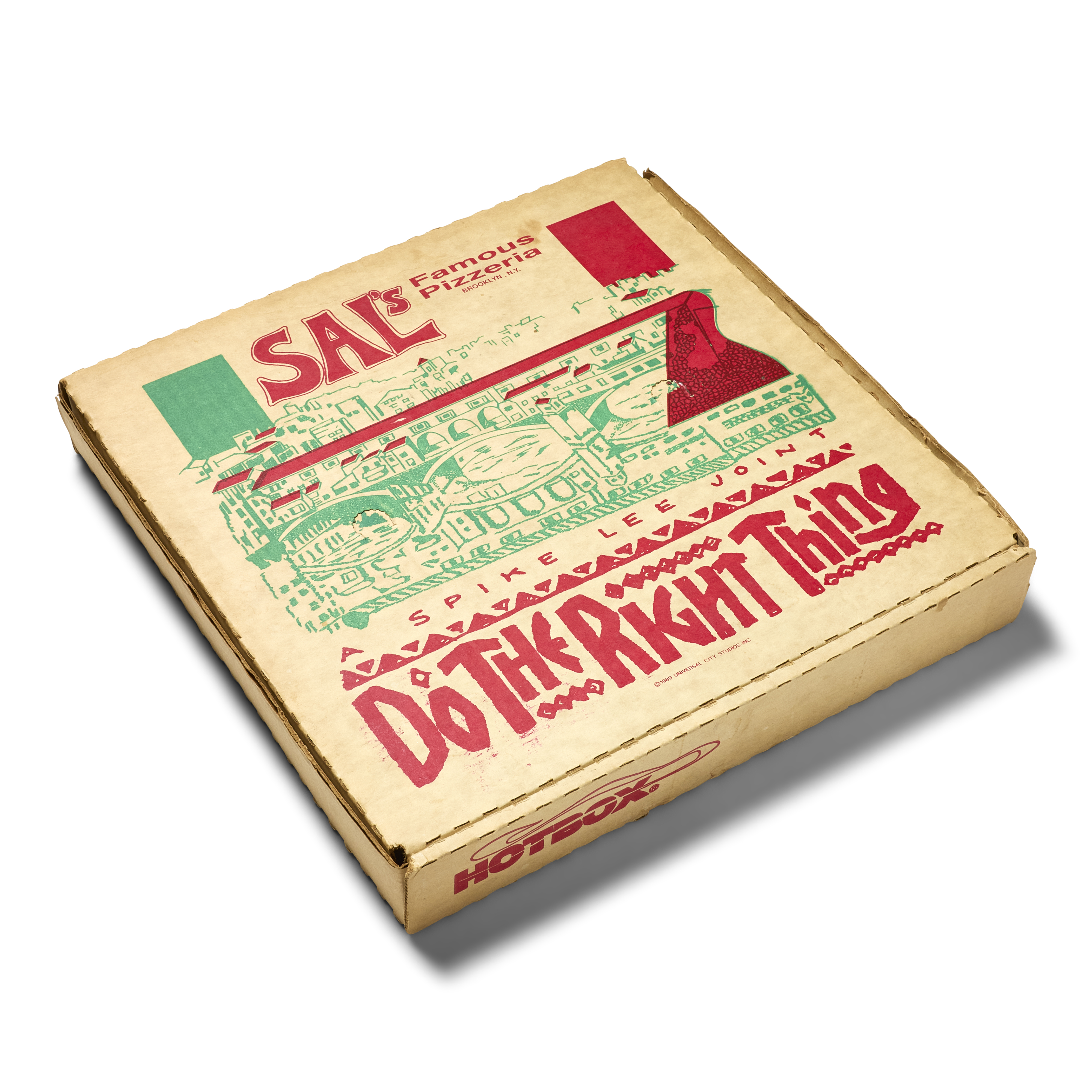 A rare piece of cinematic history, this is an original promotional pizza box from Spike Lee’s landmark 1989 film 'Do the Right Thing.' Sal’s Pizza serves as the film’s central setting, and this promotional item was part of the marketing campaign that brought the story’s Brooklyn neighborhood to life.
