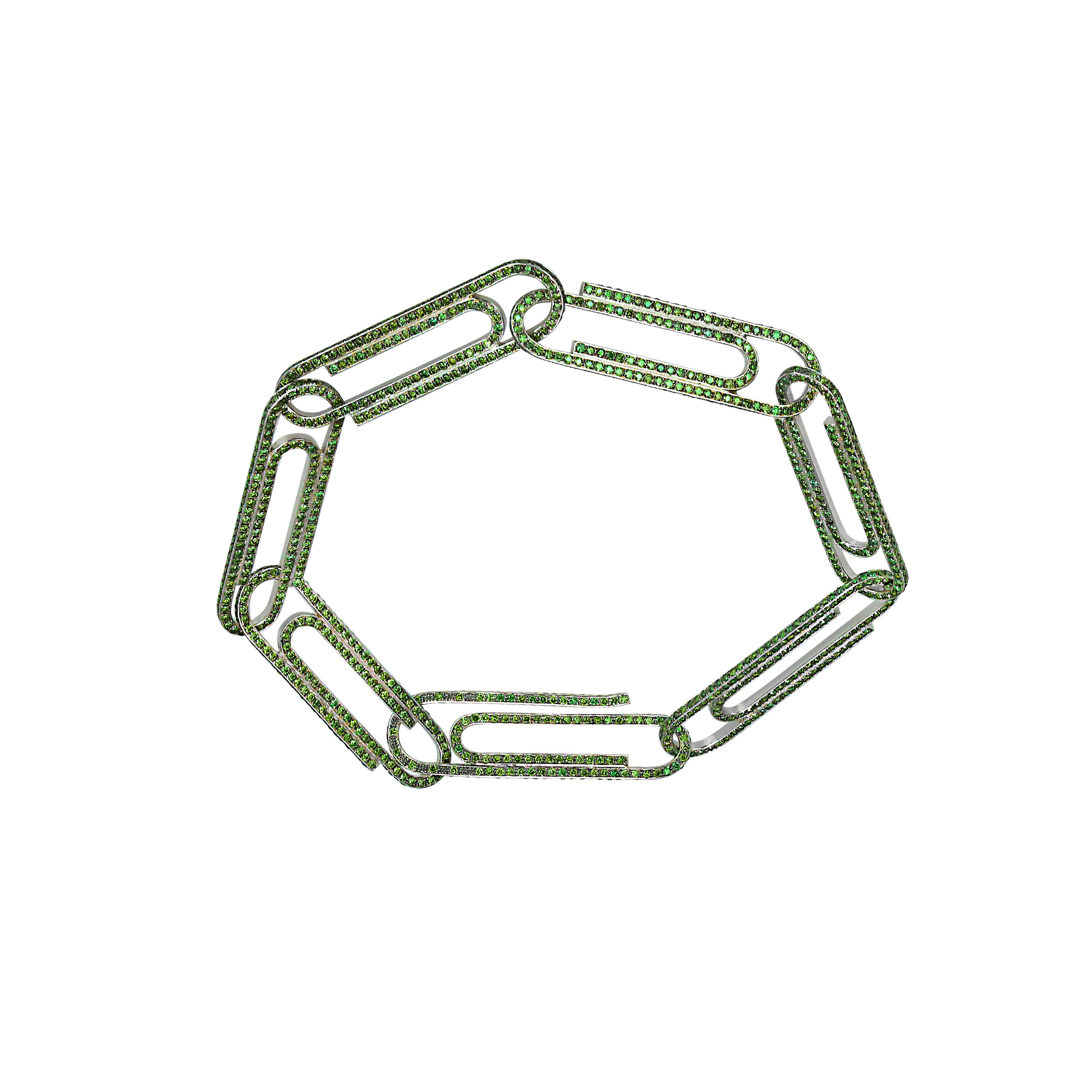 After the auction closes, the collector will collaborate with Jacob & Co. to determine their choice of metal and pave stones. The final bracelet will be built to order, crafted to the same standard of precision, pavé work, and artistry seen in the original Office Supplies paper clip bracelet designs.