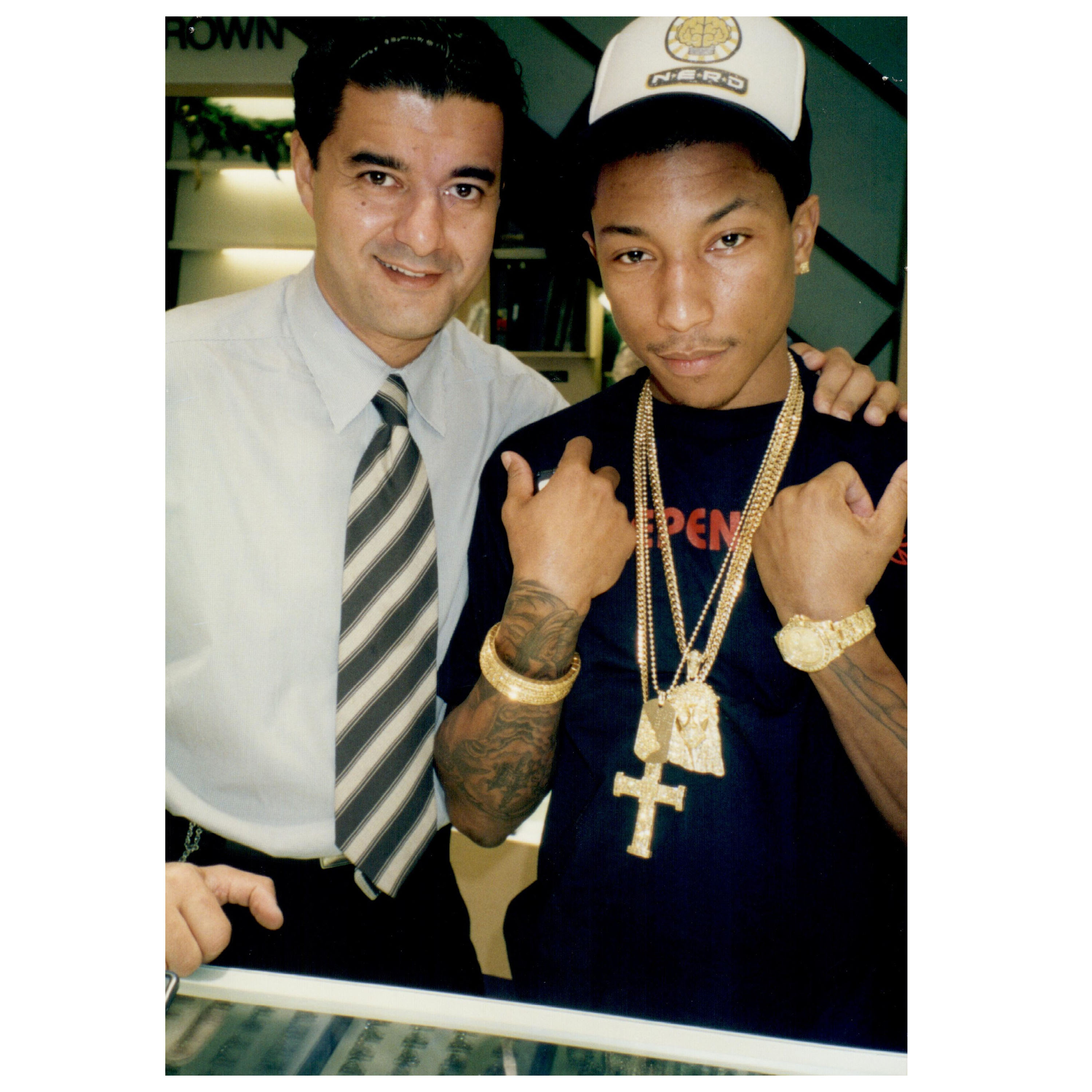 This 14K yellow gold Jesus head pendant, owned by Pharrell, reflects that lineage, while showcasing Jacob's elevated execution. Pavé-set with 3.72 carats of round brilliant-cut diamonds — totaling 220 stones in VS clarity — the piece marries tradition with refinement, its sculpted form illuminated across every contour. Suspended from a 24-inch, 4mm gold chain, the pendant weighs 48.6 grams, giving it the substantial presence characteristic of the early custom pieces that helped define hip-hop’s aesthetic.