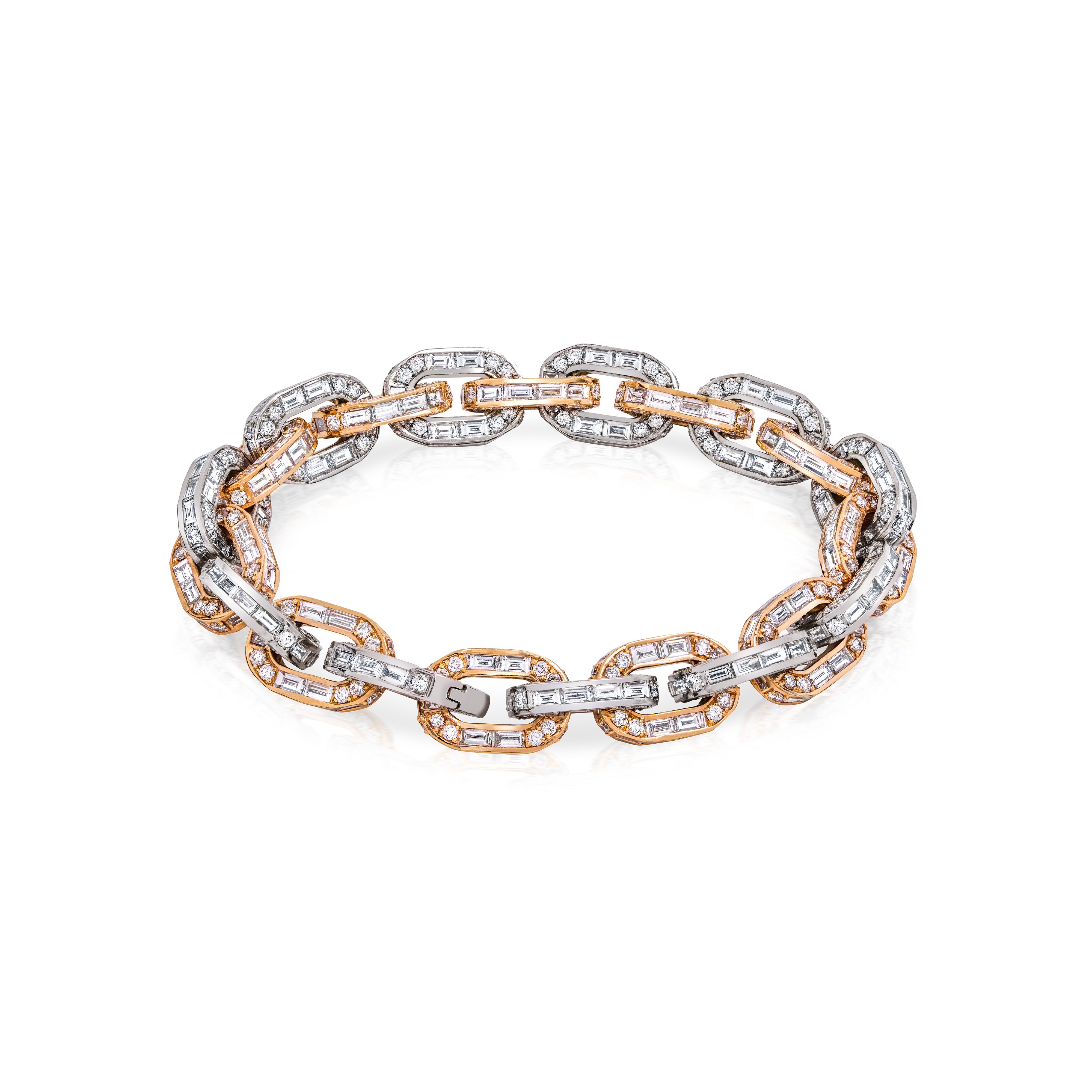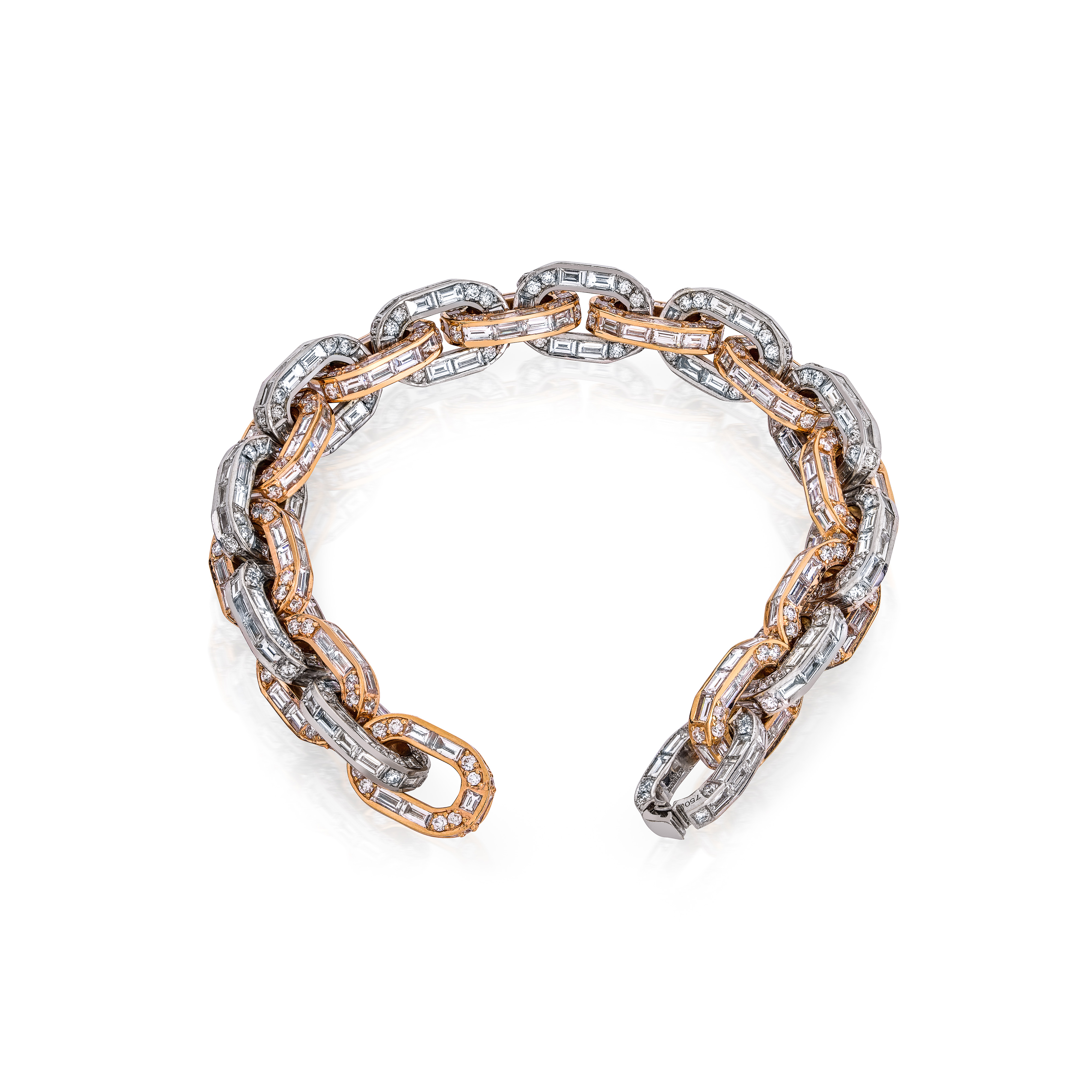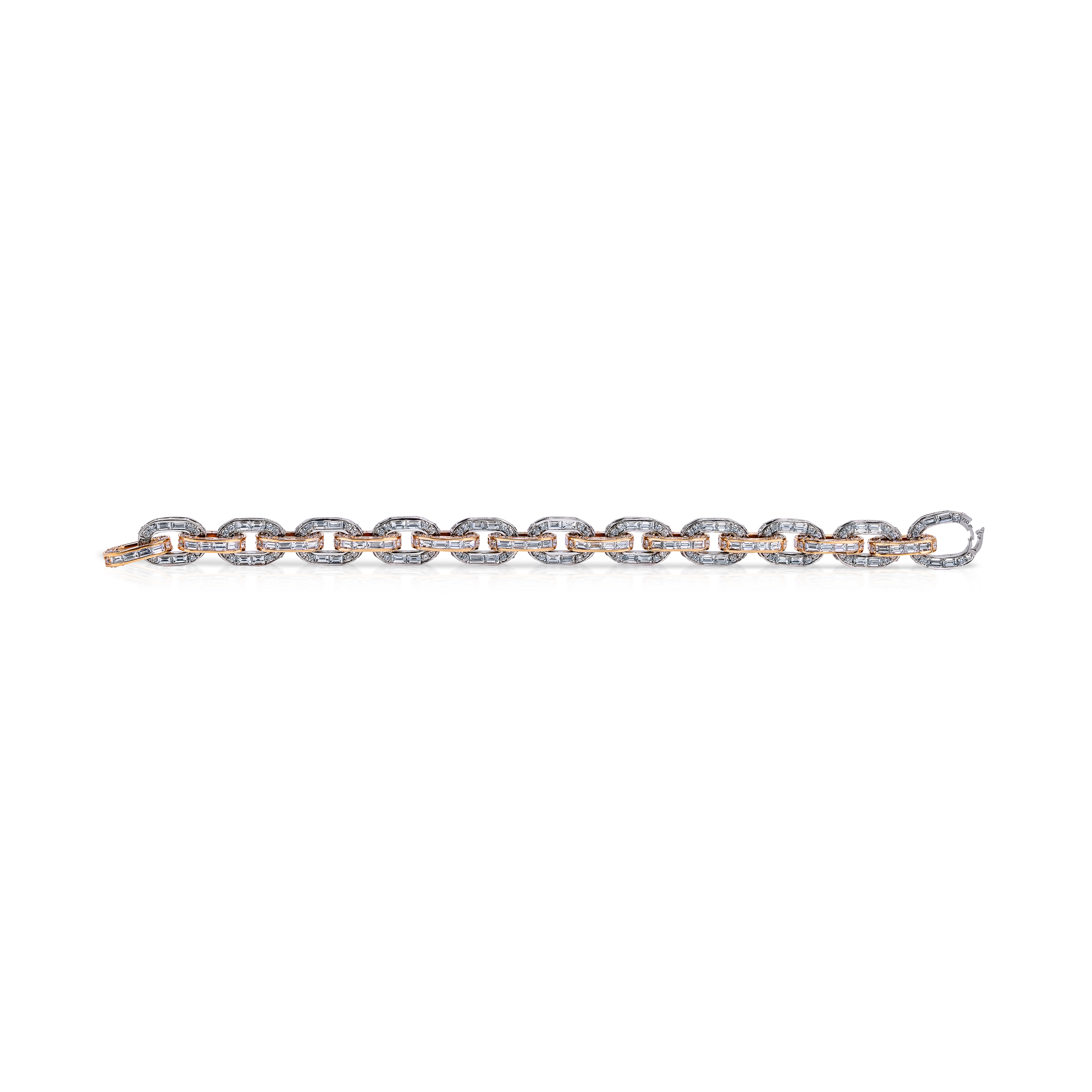 Crafted in 18K rose and white gold and weighing 44.9 grams, the bracelet is meticulously set with 27.87 carats of baguette-cut diamonds (477 stones) and 7.15 carats of round brilliant diamonds (438 stones). The interplay of cuts creates a dynamic rhythm of light — the baguettes forming sleek, architectural lines, while the round diamonds add subtle radiance and movement. The alternating gold tones enhance that dimensionality, giving the bracelet a modern, sculptural profile.