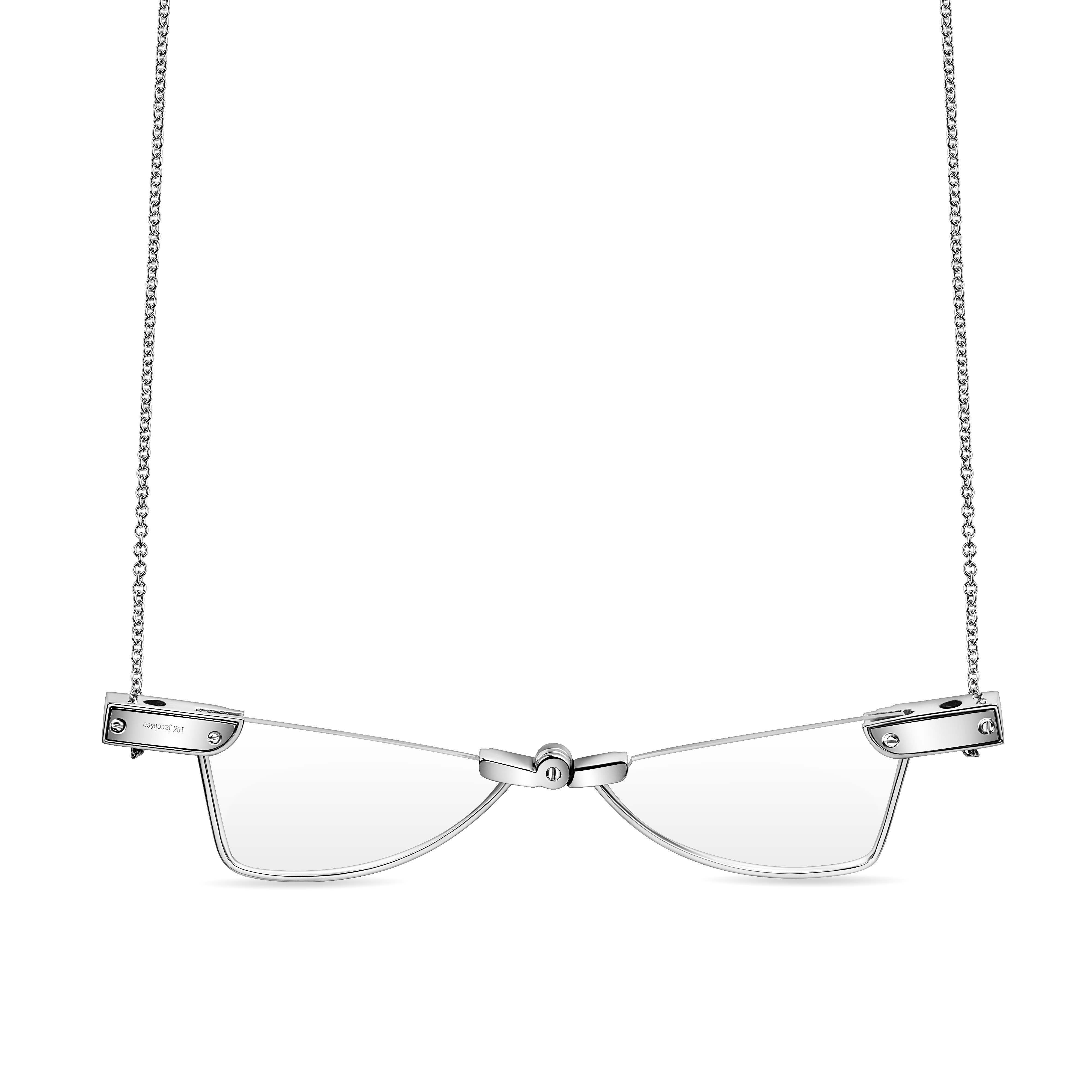 Crafted in 18K white gold and pavé-set with 1.16 carats of white diamonds (111 stones), the piece is designed to be worn as a necklace yet remains entirely functional as eyewear. Suspended from a 26-inch gold chain, the pendant balances whimsy and craftsmanship, turning a familiar object into an unexpected piece of jewelry with presence and shine. Weighing 29.7 grams, it has the substantial, beautifully engineered feel characteristic of Pharrell and Jacob’s most inventive collaborations.