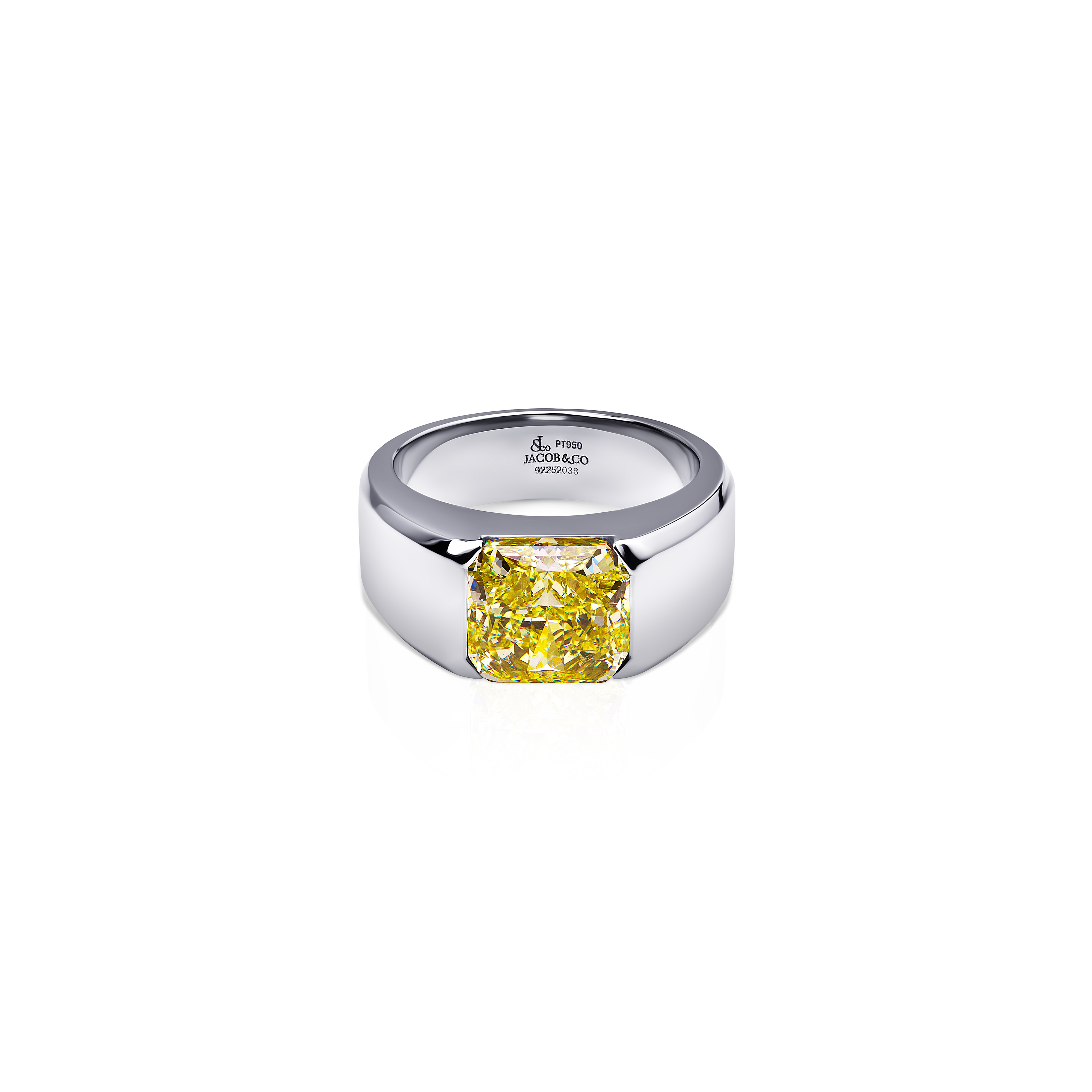 This men’s band, set with a GIA-certified 5.66-carat Fancy Intense Yellow radiant-cut diamond of VVS2 clarity, embodies that same luminous power. The diamond — a single, monumental stone — is exceptional in saturation and purity, its radiant cut amplifying depth and fire. Fancy Intense yellow diamonds of this size and quality are profoundly rare, and this particular stone stands as a beacon of the warmth and positivity Pharrell associates with the color.