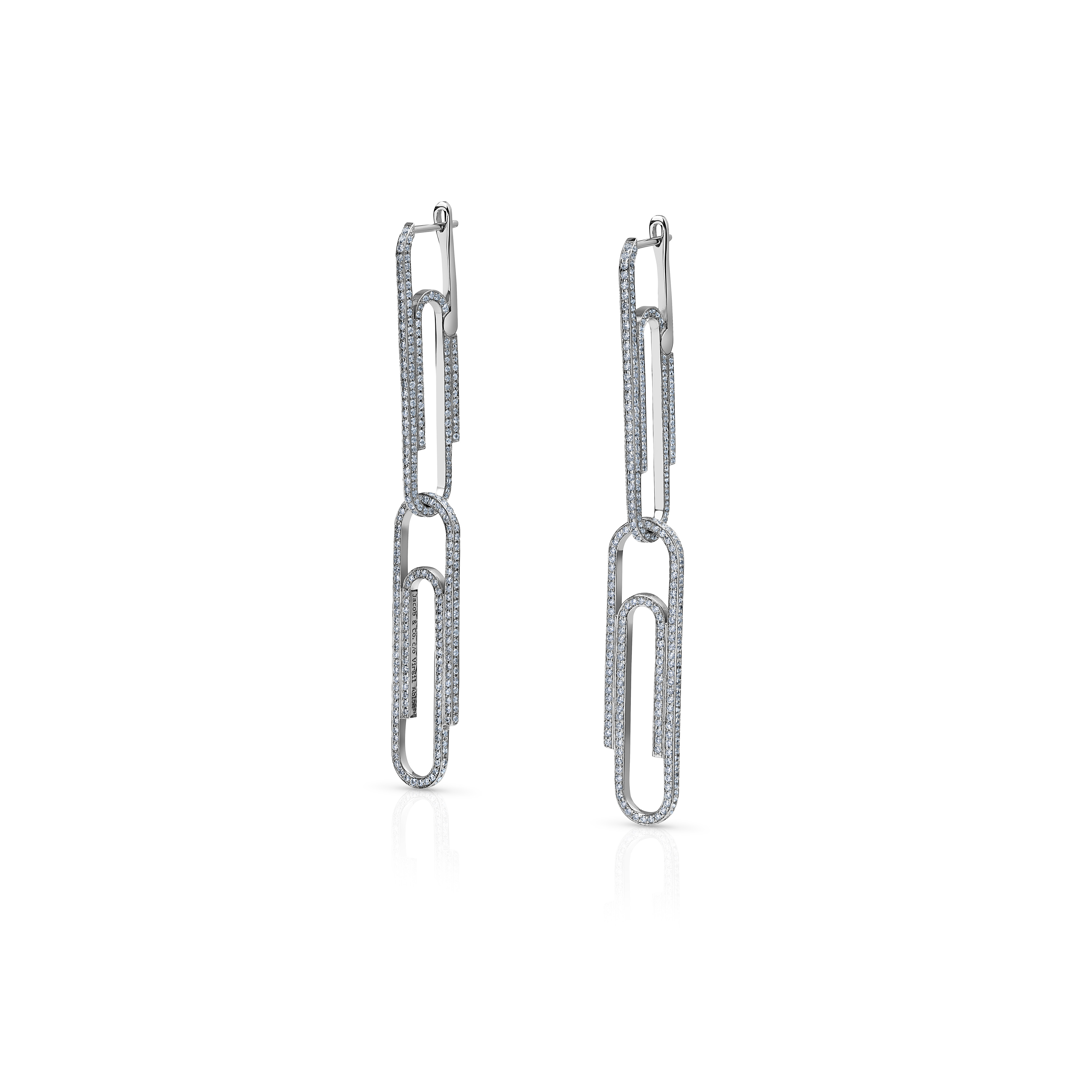 Crafted in white gold (a combination of 14K and 18K) and pavé-set with 2.84 carats of round brilliant-cut diamonds (1,026 stones, F–G color, VS clarity), these earrings transform the familiar silhouette of linked paper clips into refined emblems of contemporary design and artisanal excellence. Weighing 8.2 grams, their scale and shimmering pavé surfaces reflect Jacob & Co.’s technical mastery, while the conceptual audacity — turning something as simple as a paper clip into high jewelry — embodies Virgil’s creative philosophy.