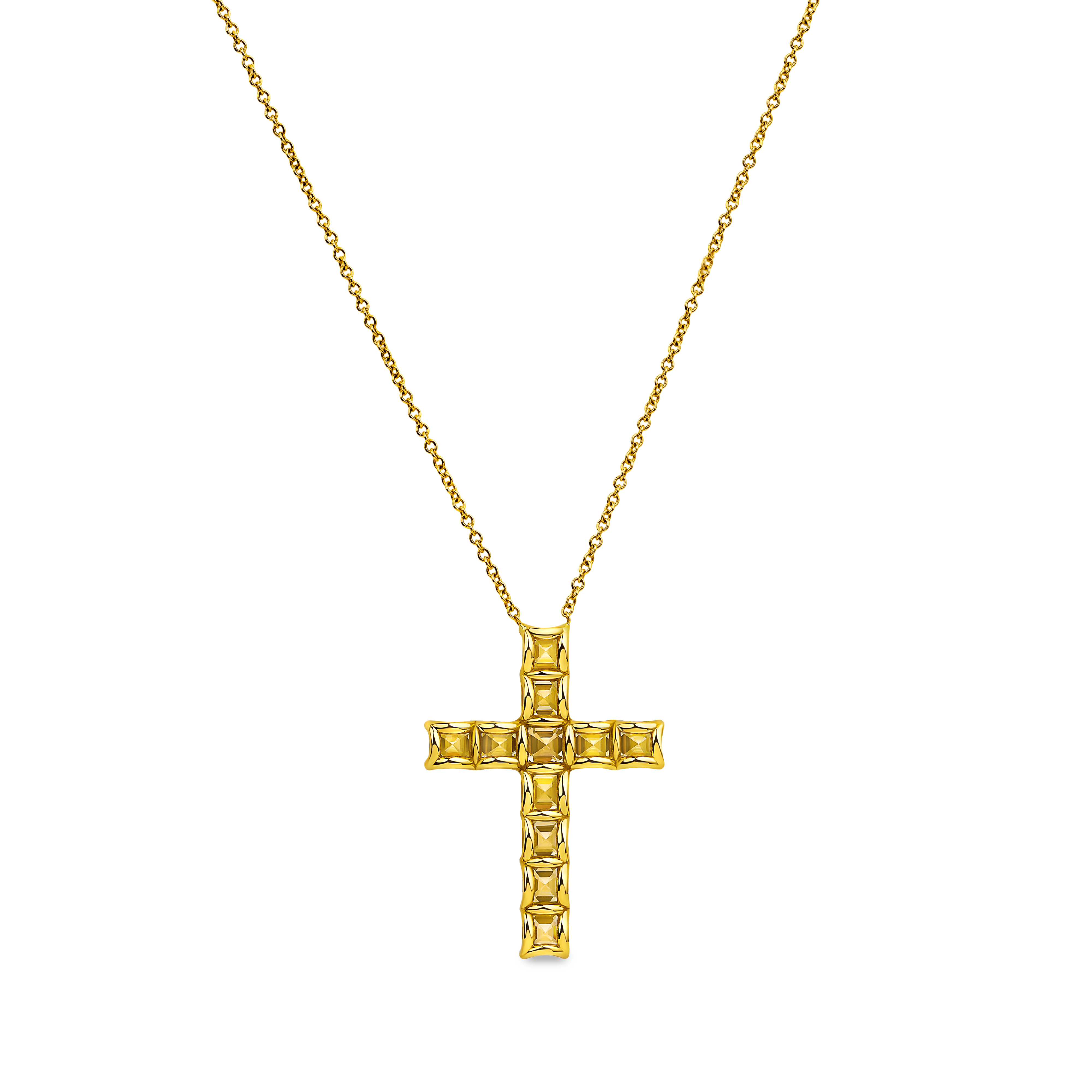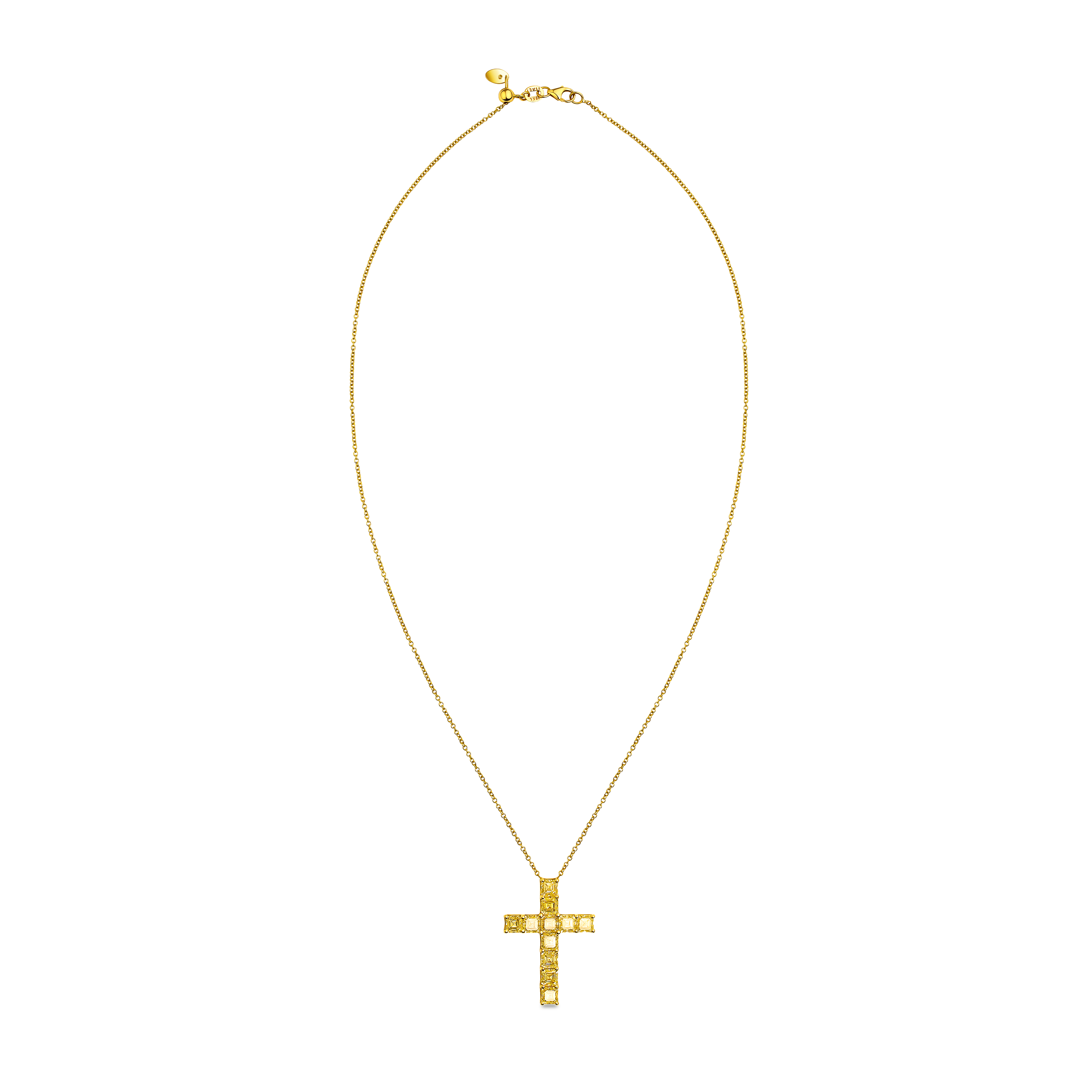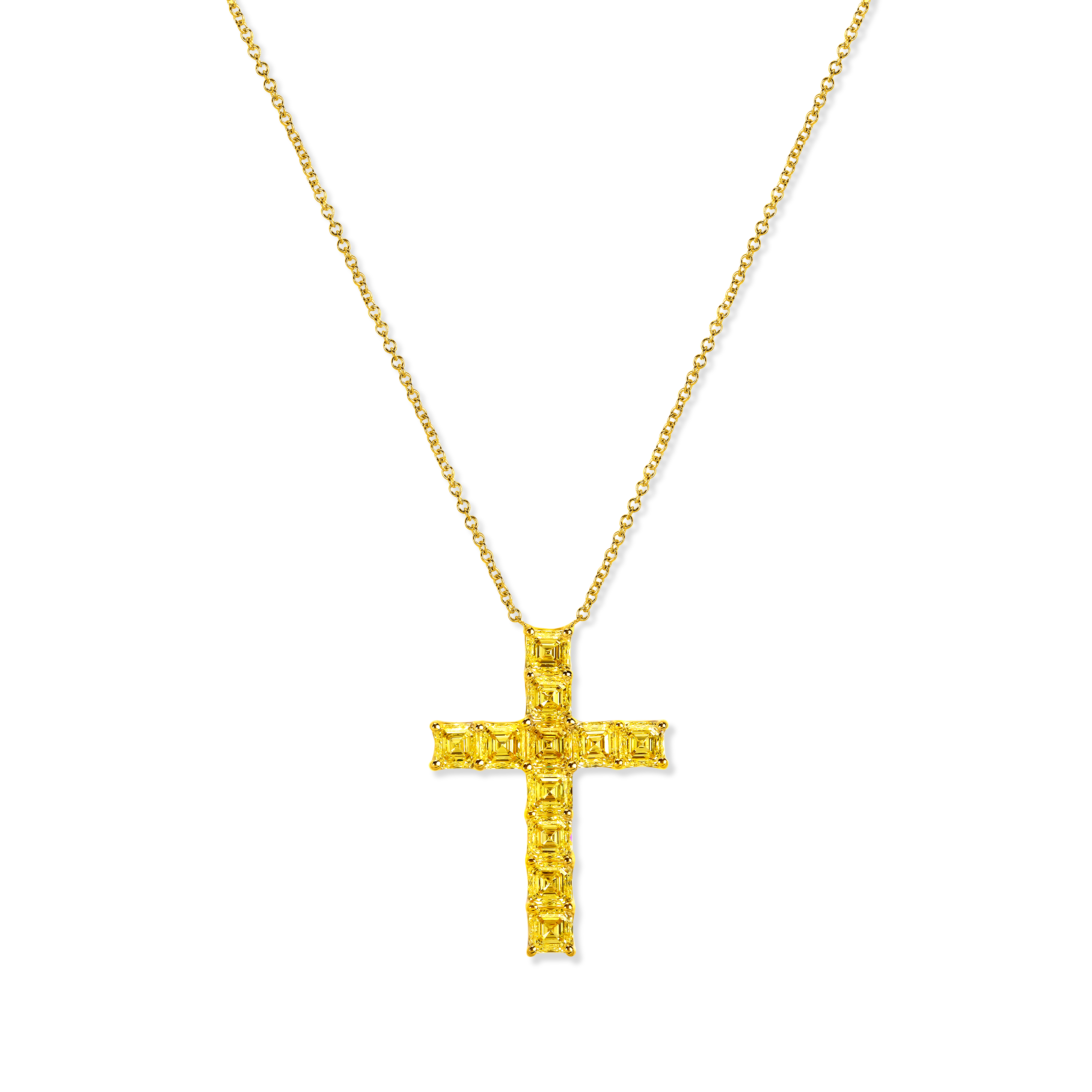 Crafted in 18K yellow gold, the pendant is set with 6.25 carats of Fancy Intense Yellow square emerald-cut diamonds — 11 stones chosen for their vivid saturation and clarity. The rich geometry of the emerald cuts amplifies the natural luminosity of the stones, suspended from an 18-inch yellow gold link chain fitted with an adjustable mechanism for versatile styling. The necklace weighs 5.6 grams.