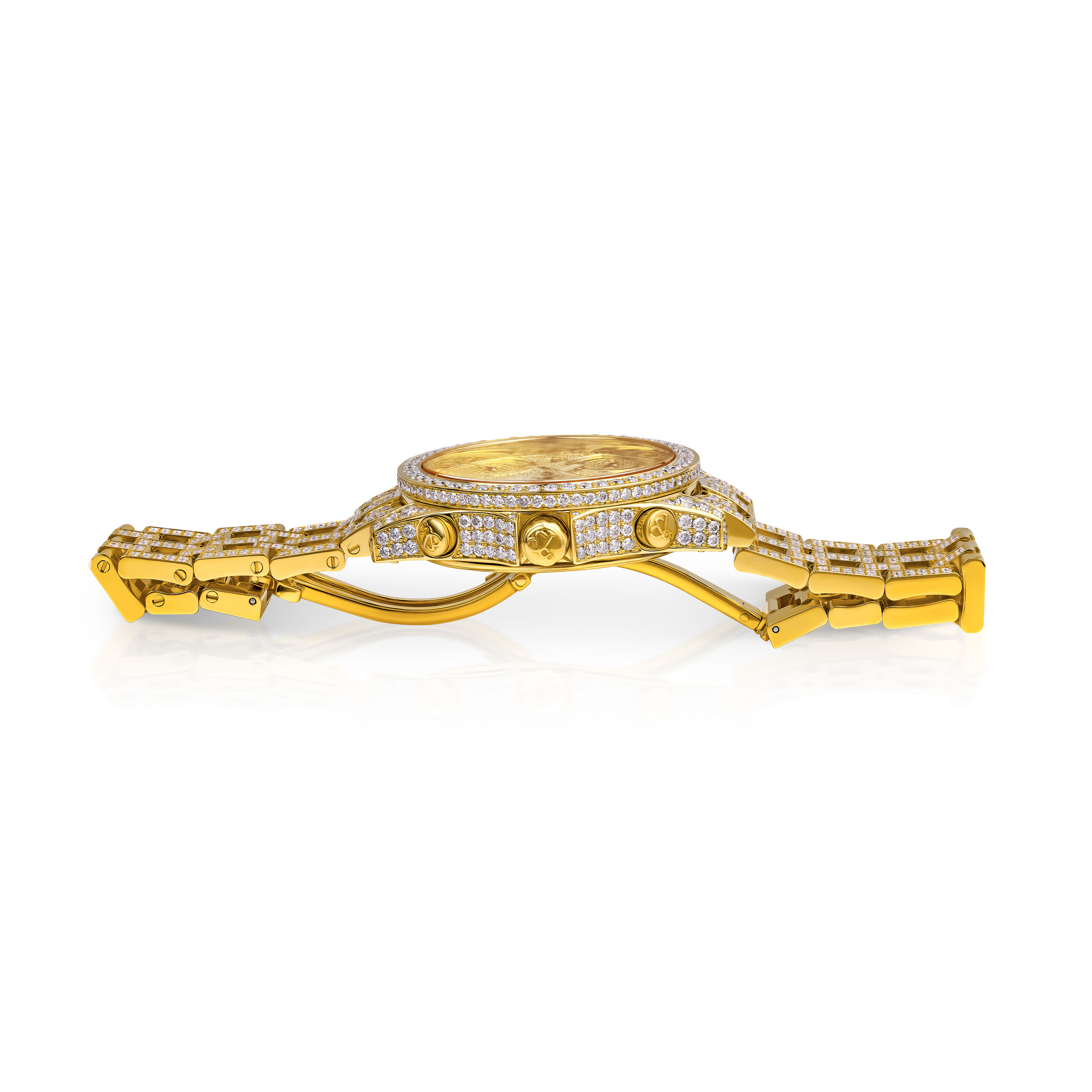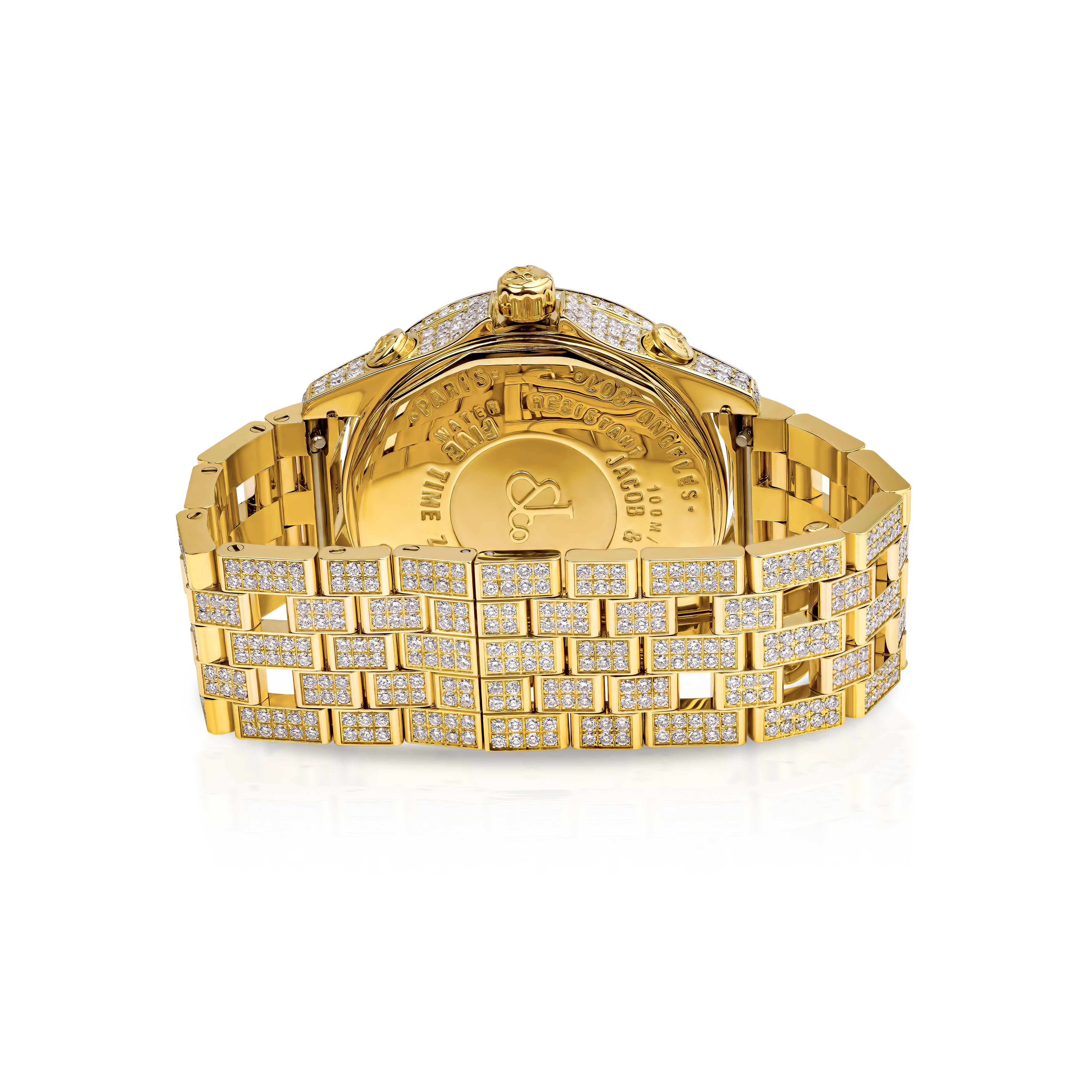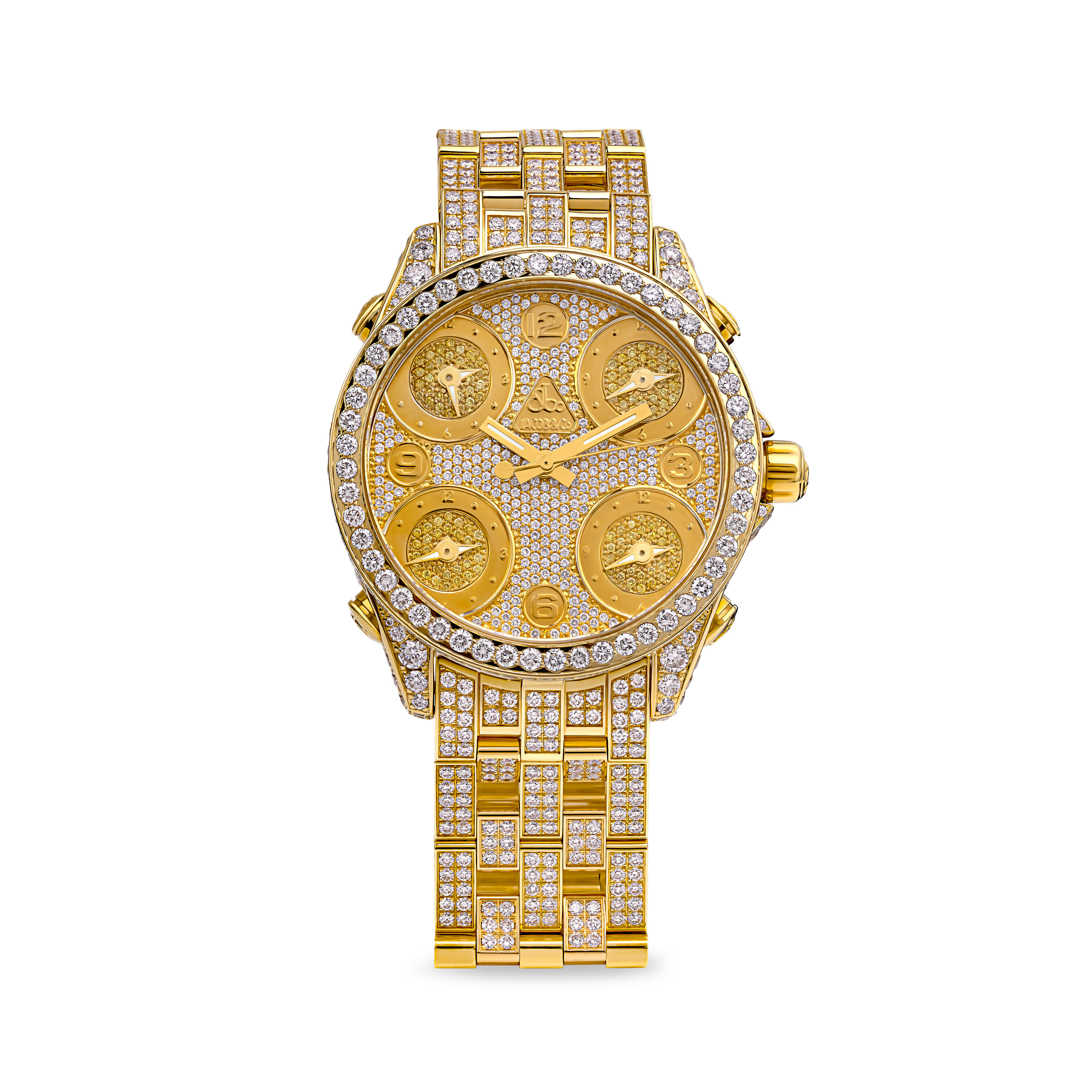 This 2009 example, crafted in 18K yellow gold, showcases the exuberant, globe-spanning design that defined the model’s rise. The dial features circular multi–time-zone indicators set with 1.55 carats of yellow diamonds, positioned against a field of pavé-set white diamonds. The case is adorned with 2.84 carats of diamonds, while the bezel is set with an additional 3.27 carats, creating a radiant play of color and brilliance throughout the watch. The piece is fitted with a yellow gold JCO-logo deployment buckle, and houses a Swiss quartz movement for reliable precision.